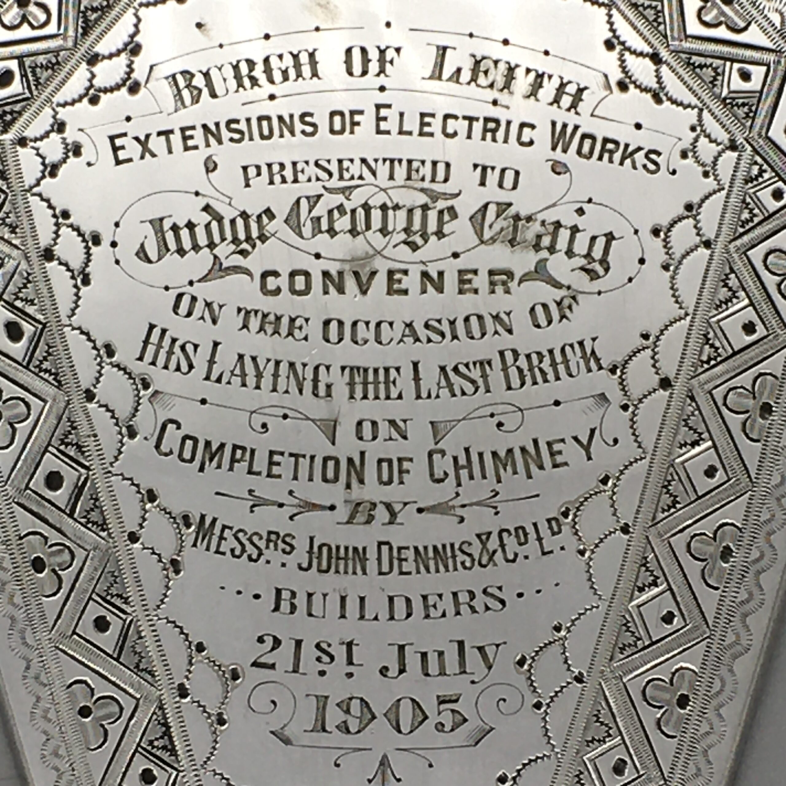 The wording reads: ‘BURGH OF LEITH’ ‘Extensions of Electric Works’ ‘Presented to Judge George Craig convener on the occasion of HIS LAYING THE LAST BRICK on COMPLETION OF CHIMNEY by Messrs John Dennis & Co.LD. Builders 21ST July 1905’