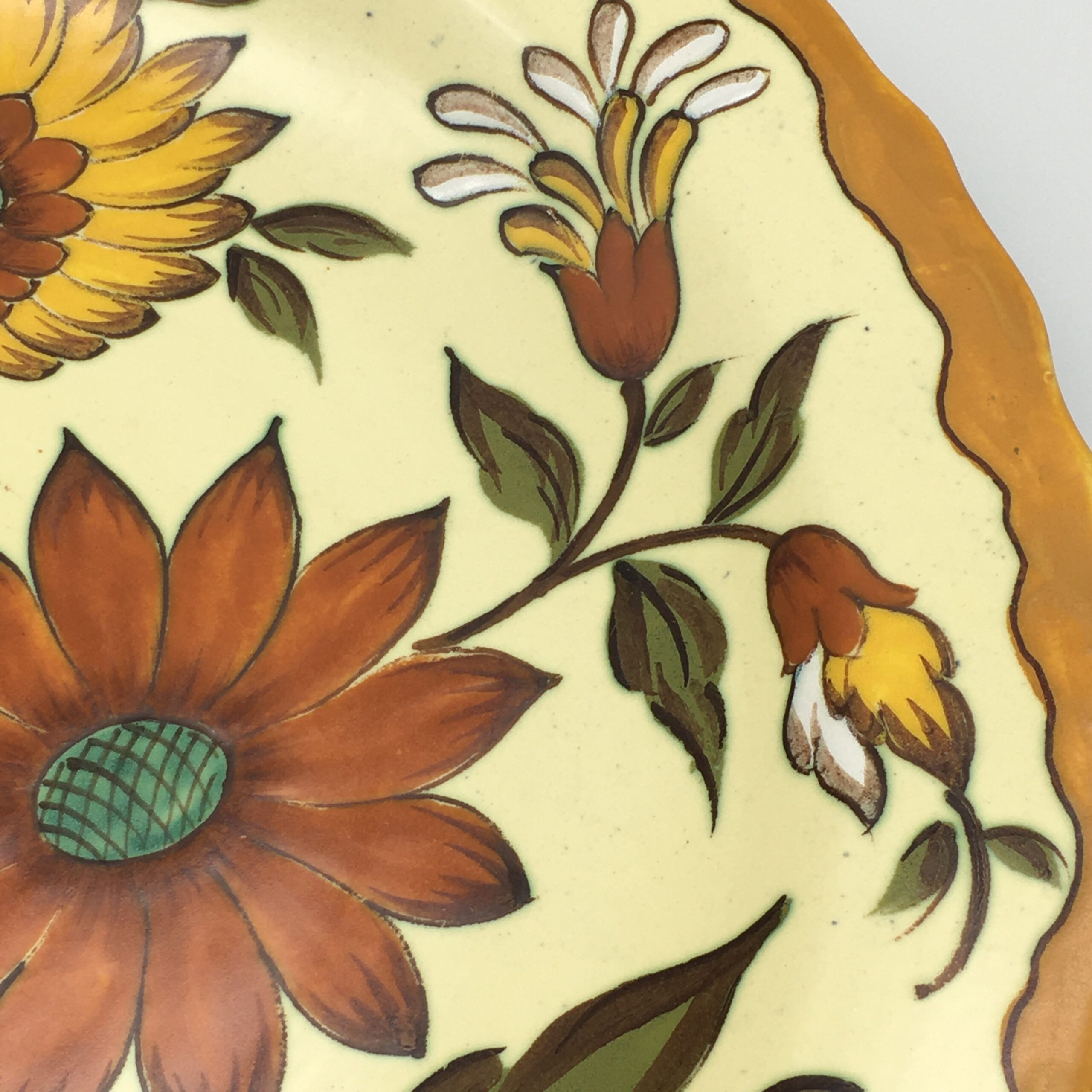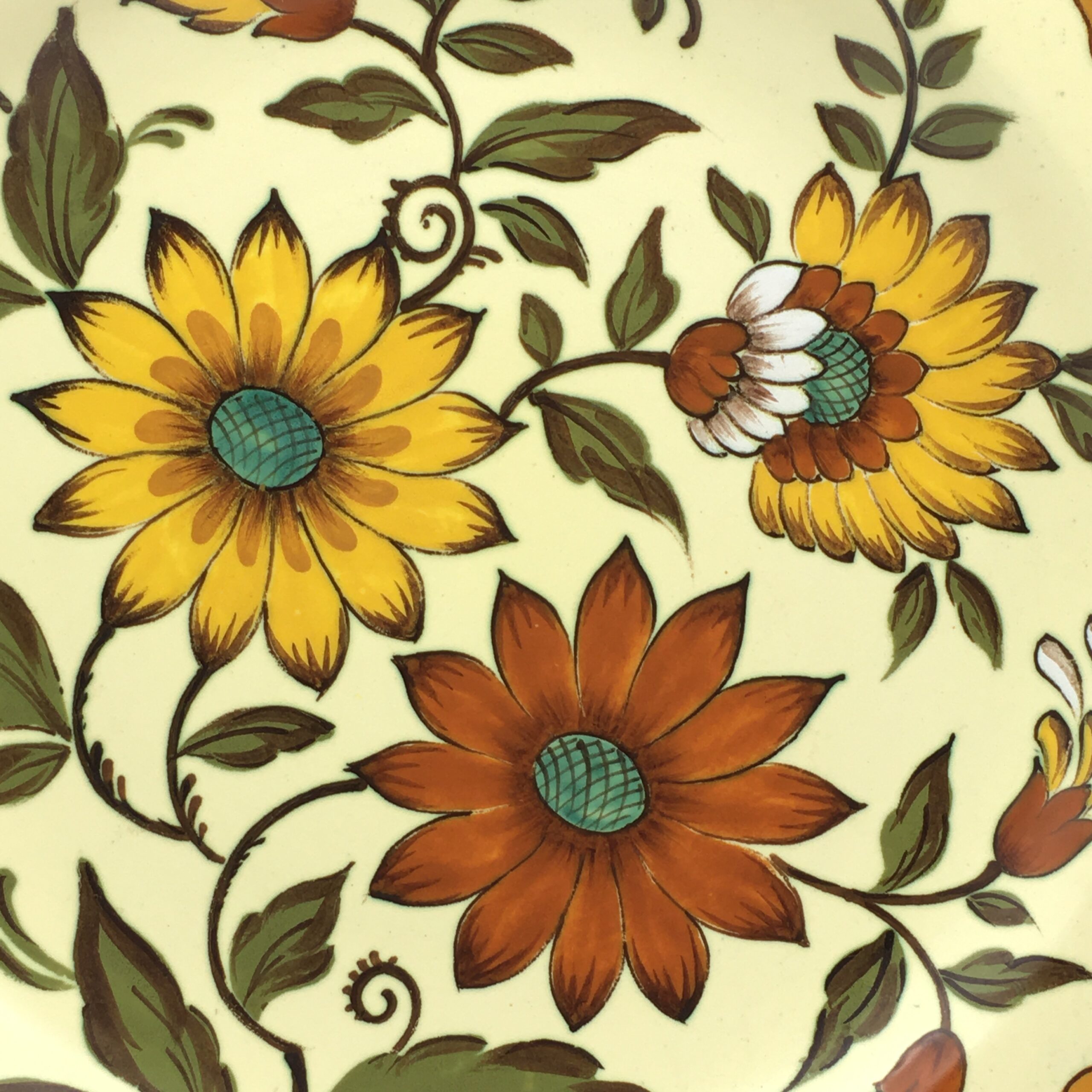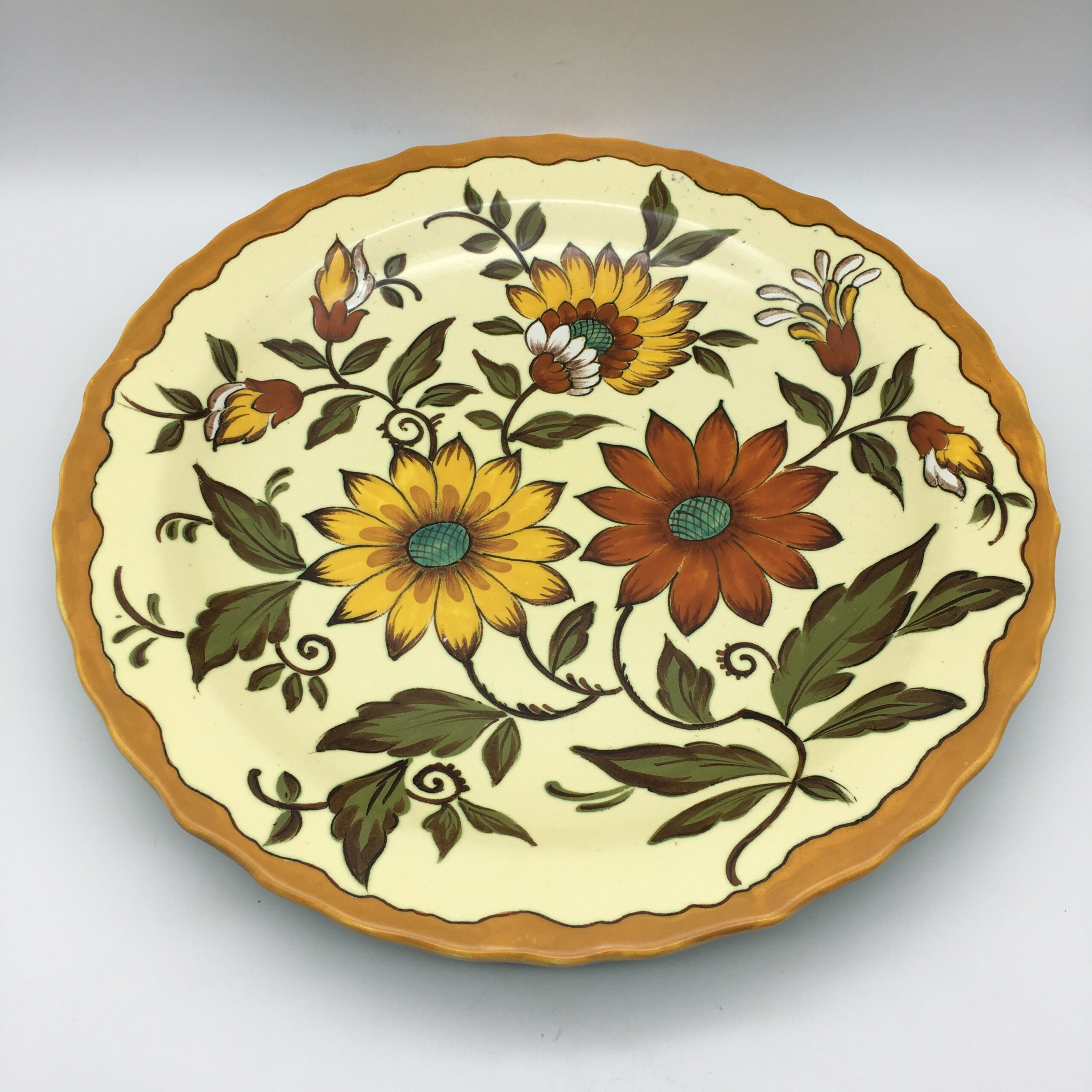 This large, very attractive ‘Royal Gouda’ charger or wall plate from the 1940/50’s, has been beautifully hand painted in autumn colours, against a cream background. It features a colourful and appealing floral design known as the ‘Fando’ pattern. The factory marks are painted and signed on the back ‘5110/40, FANDO, ROYAL ZUID HOLLAND, GOUDA’. The large wall plate is in excellent condition and features two small factory-made holes on the back to assist when hanging. It has a diameter of 40cm, and weighs 1905g.