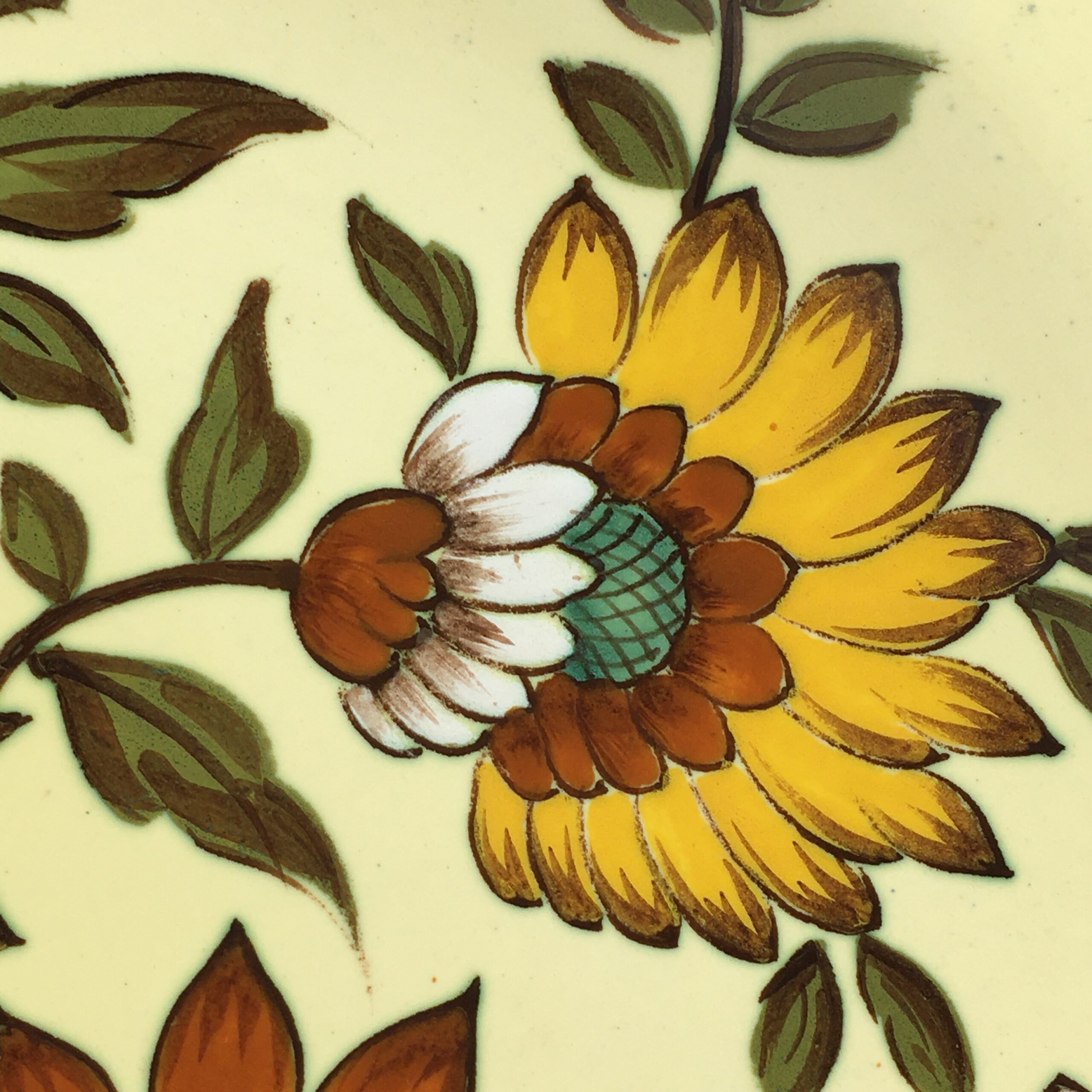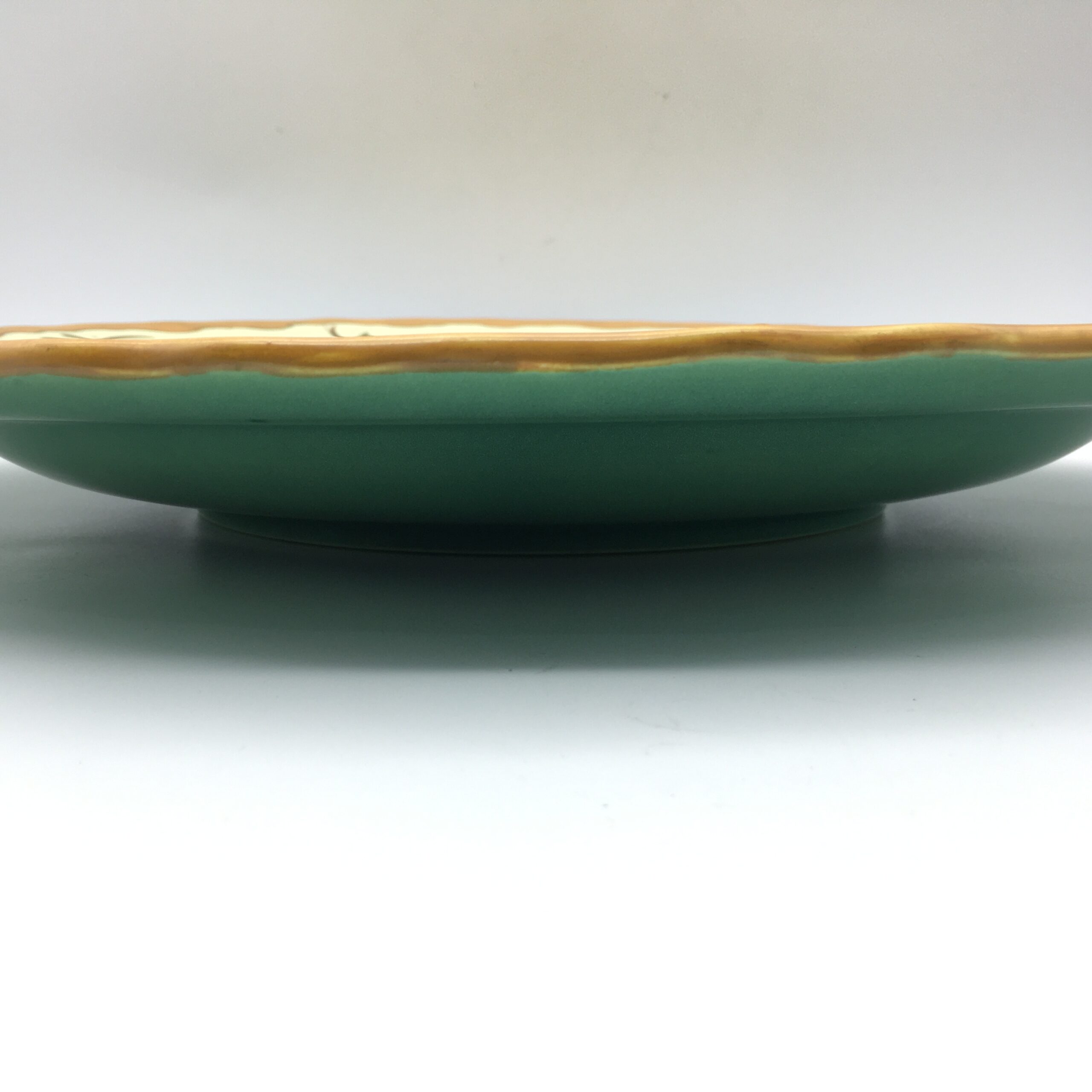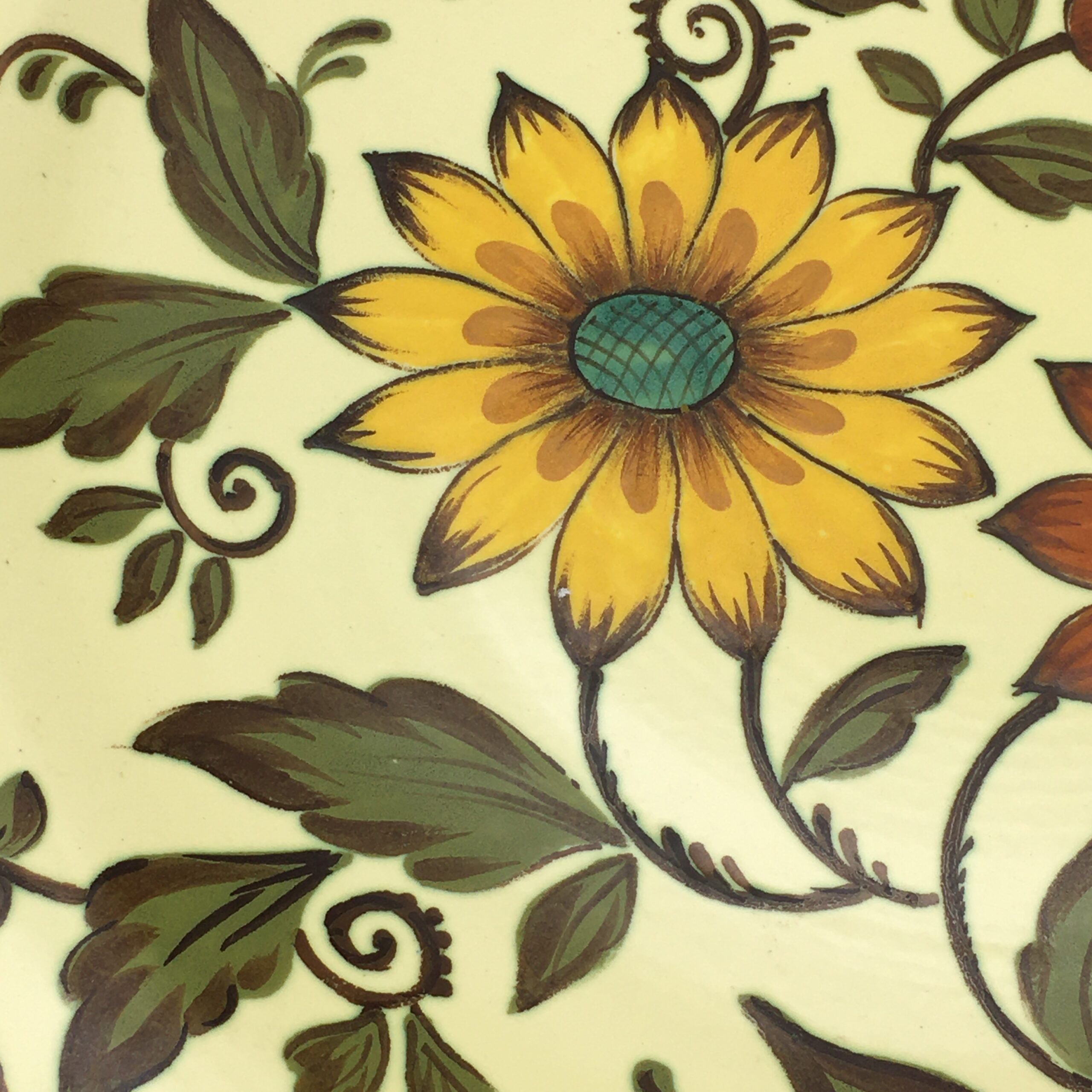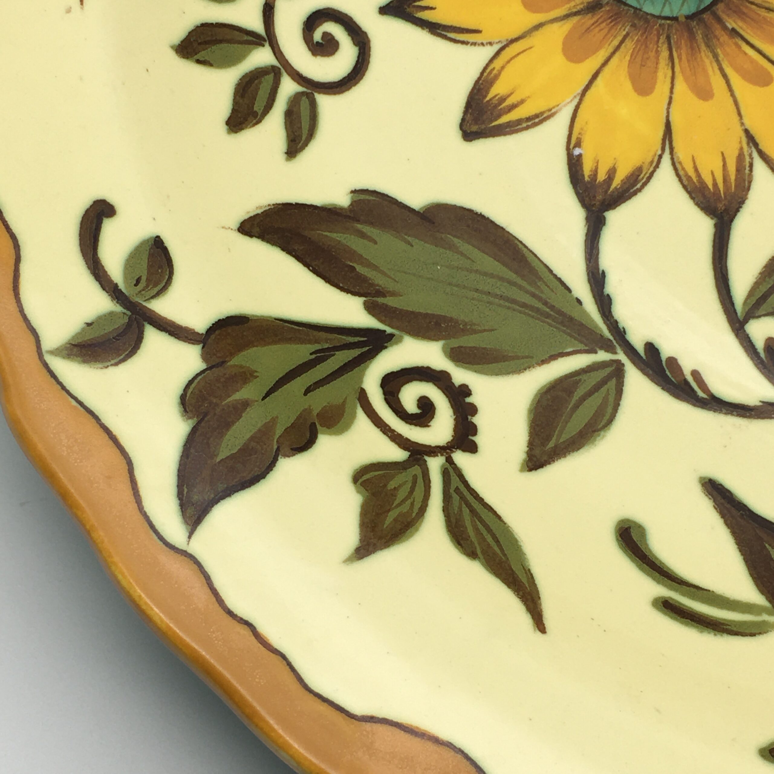 This large, very attractive ‘Royal Gouda’ charger or wall plate from the 1940/50’s, has been beautifully hand painted in autumn colours, against a cream background. It features a colourful and appealing floral design known as the ‘Fando’ pattern. The factory marks are painted and signed on the back ‘5110/40, FANDO, ROYAL ZUID HOLLAND, GOUDA’. The large wall plate is in excellent condition and features two small factory-made holes on the back to assist when hanging. It has a diameter of 40cm, and weighs 1905g.