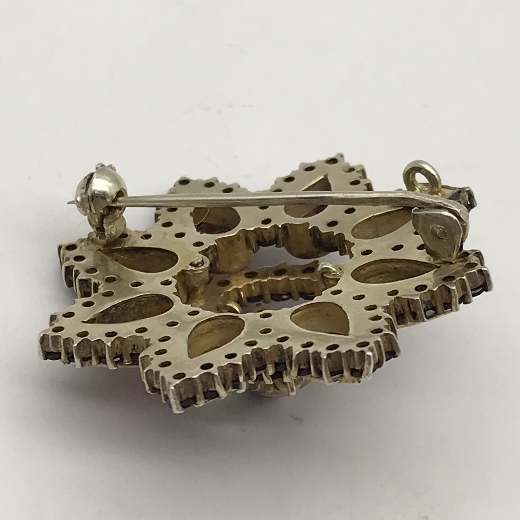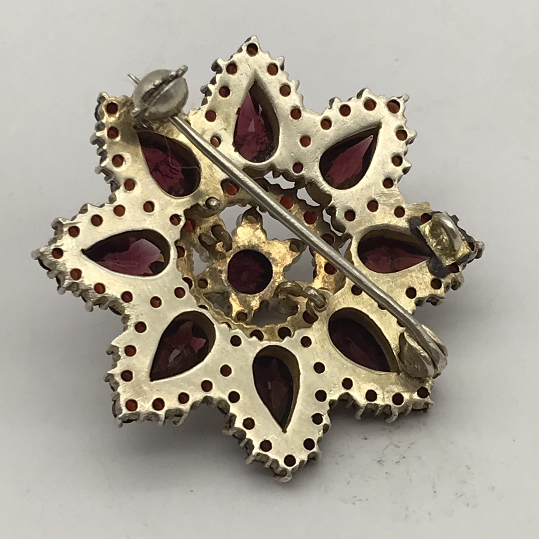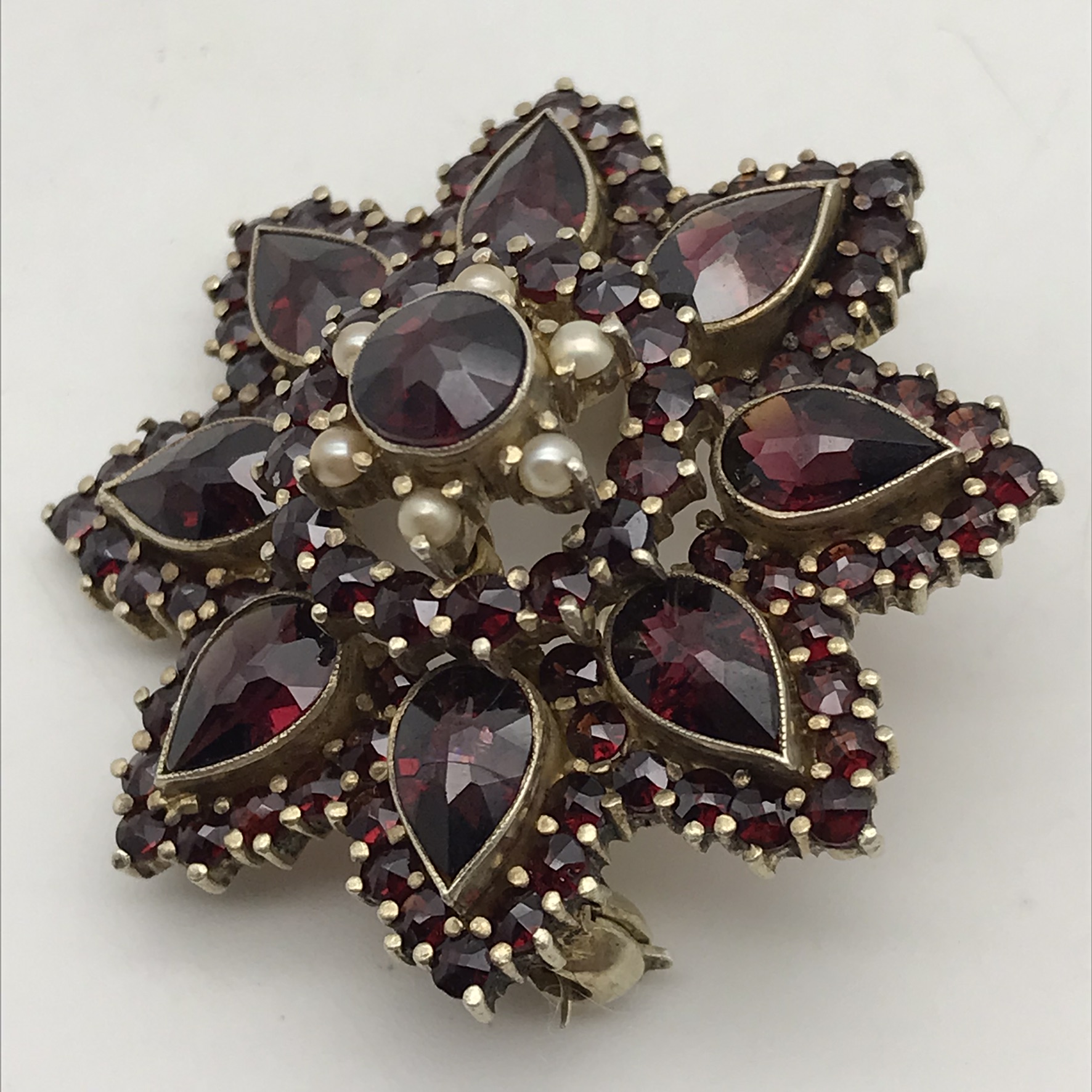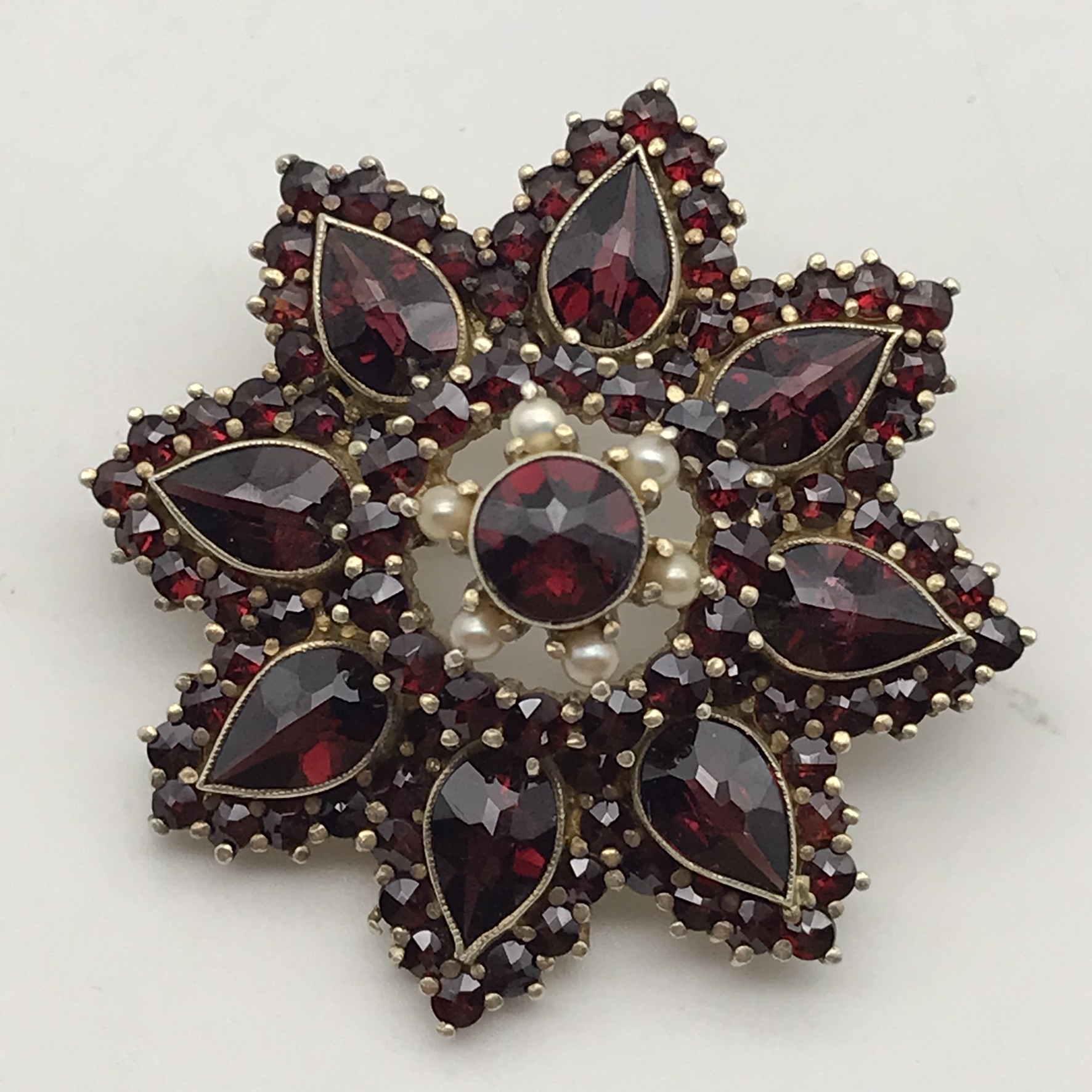 This fabulous, antique, garnet cluster flower brooch is made-up of three layers of beautifully cut and set, high quality, deep red Bohemian garnets, all in sterling silver and lightly gilded. The brooch is in the form of a flower with eight points and is exceptionally well-made, and when looked at from the side, has a slight convex shape and appears to have five levels, giving it a three-dimensional feel. The brooch features one round garnet (5,5mm) in the centre, with eight ‘pear’ shaped garnets (7mm x 4,5mm each), surrounded by eighty-eight small rose-cut garnets (2mm each) and six seed pearls around the centre stone. It is in excellent condition with a secure roll-over clasp, has a diameter of 36mm and weighs 10,4g.