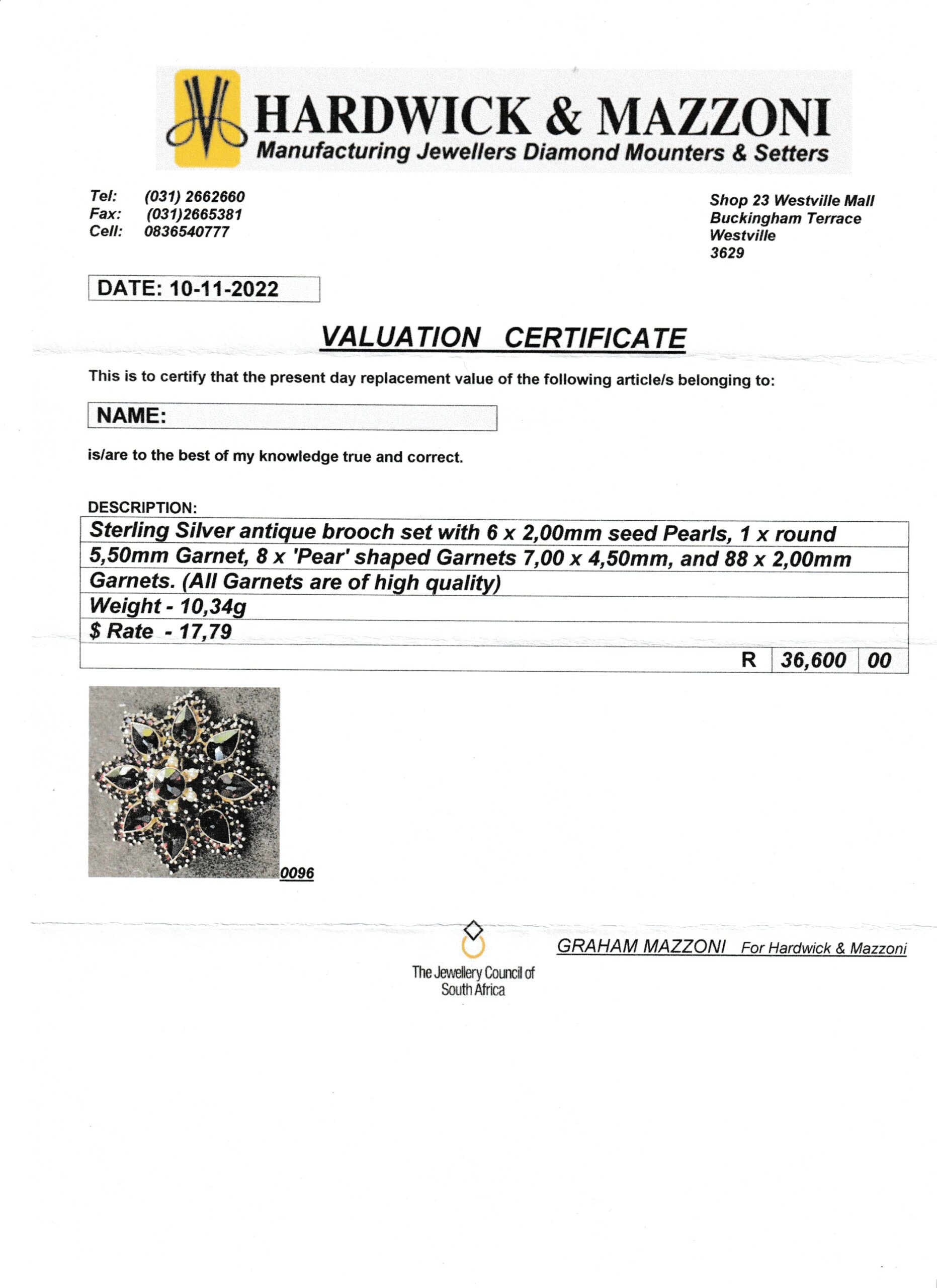 This fabulous piece comes with a detailed valuation, with a replacement value of R36 600.00, a copy of which is listed below. (The valuation was done by a very reputable independent jeweller, but antiquity and rarity aren’t taken into consideration when valuing the piece).