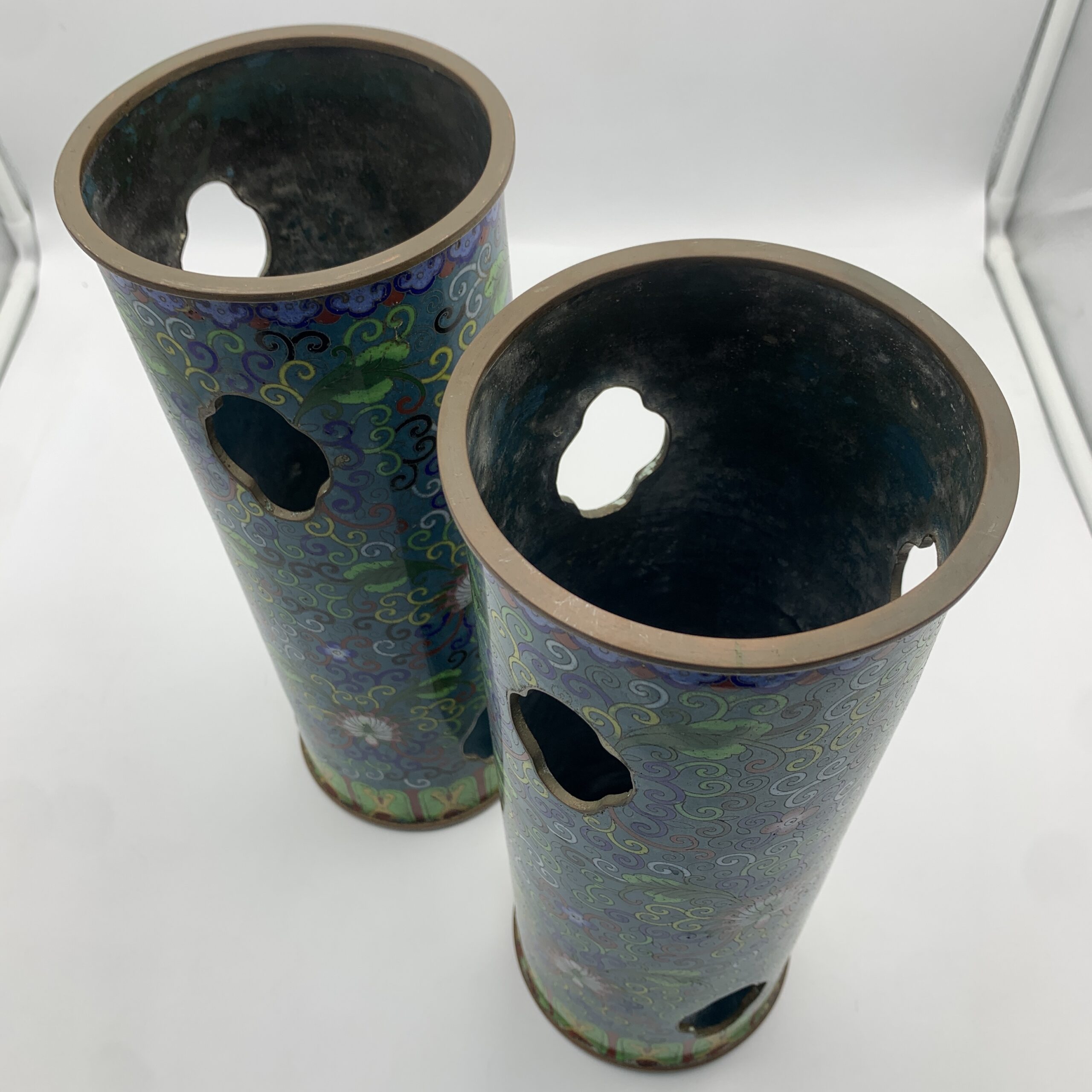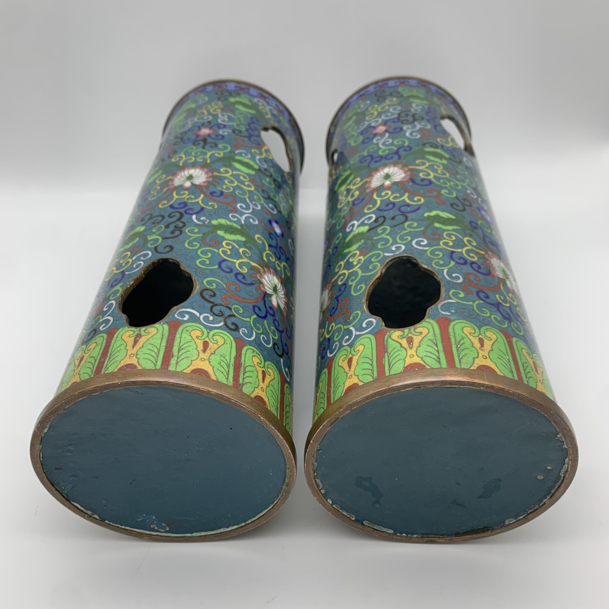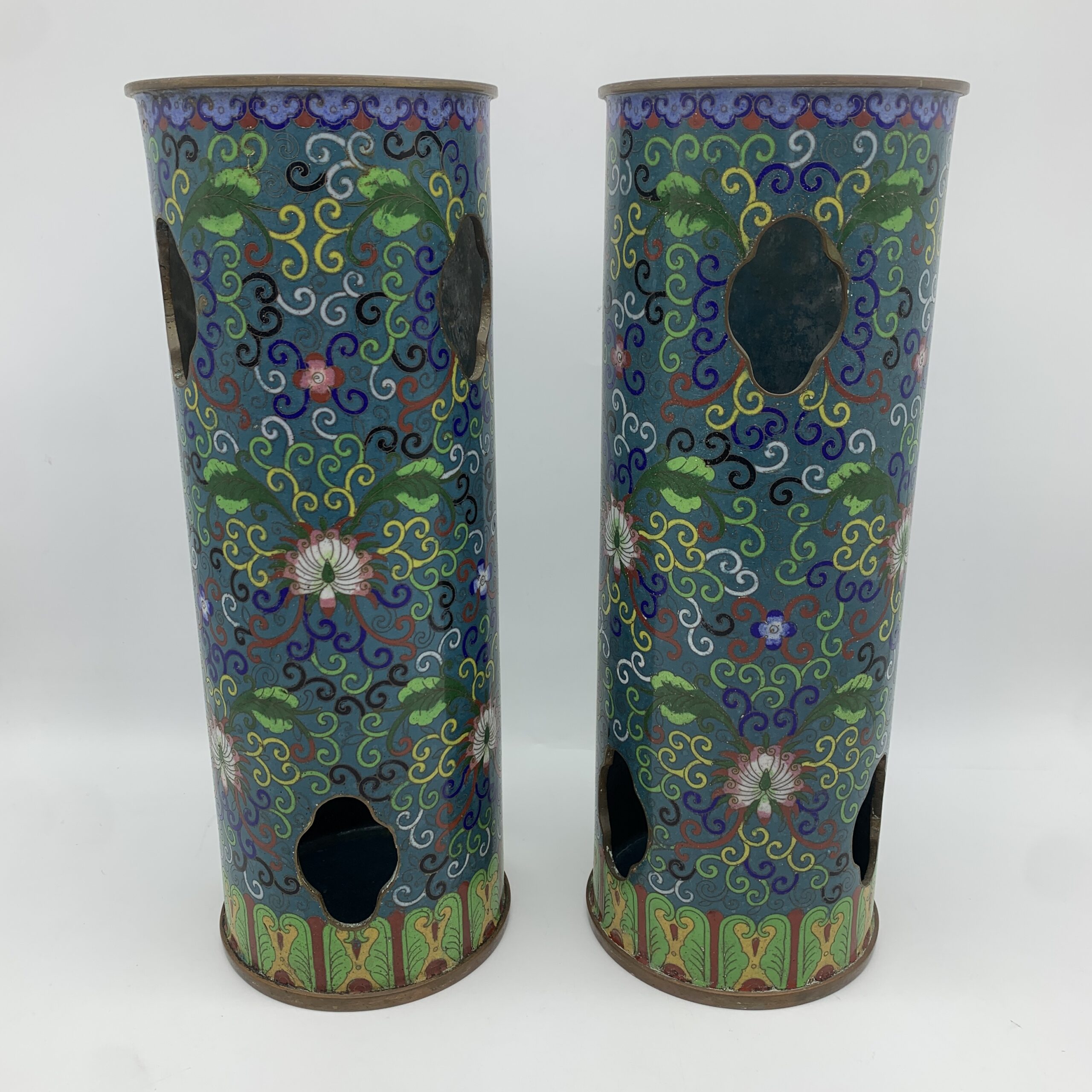 This impressive, large, rare pair of antique Chinese cloisonne hat or wig stands/vases from the mid to late 1800’s, are beautifully decorated with fabulous cloisonne work, featuring a colourful display of swirling vines with lotus flowers and acanthus leaves. The pair are tall, heavy cylindrical shaped stands with quatrefoil cut-outs, to allow fragrant herbs to scent the hats, were used during the Quing dynasty to display their elaborate hats. These stands are rare and seldom seen on the market, especially a matching pair of cloisonne ones. They are both beautifully made and in excellent condition and stand 31cm high with a base and top diameter of 11,5cm and together weigh 2,33kg.