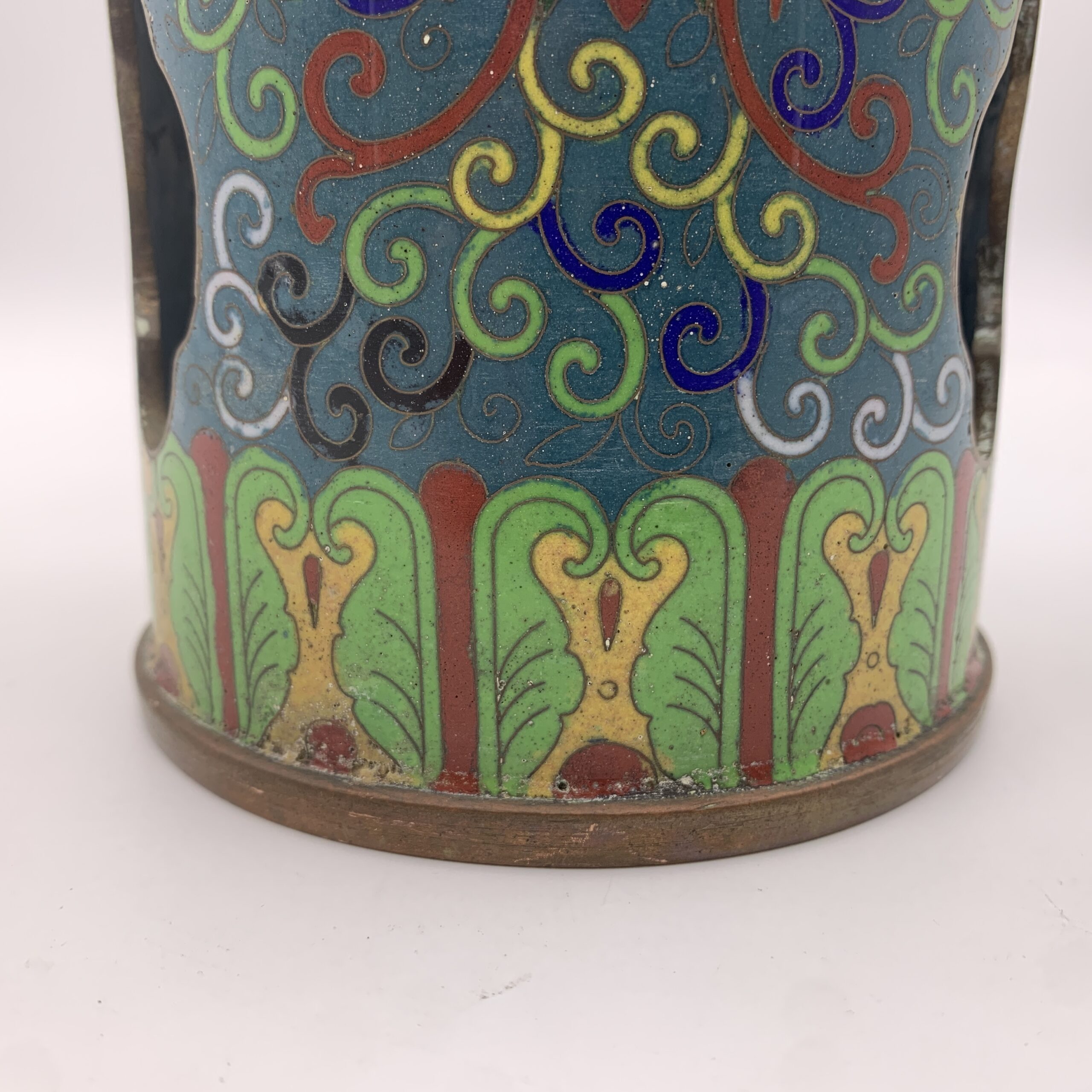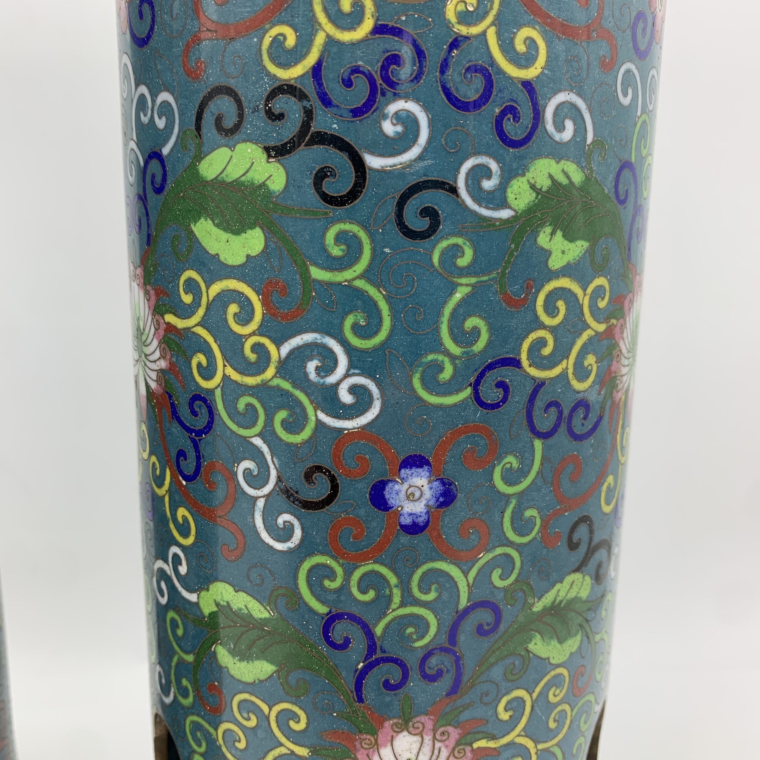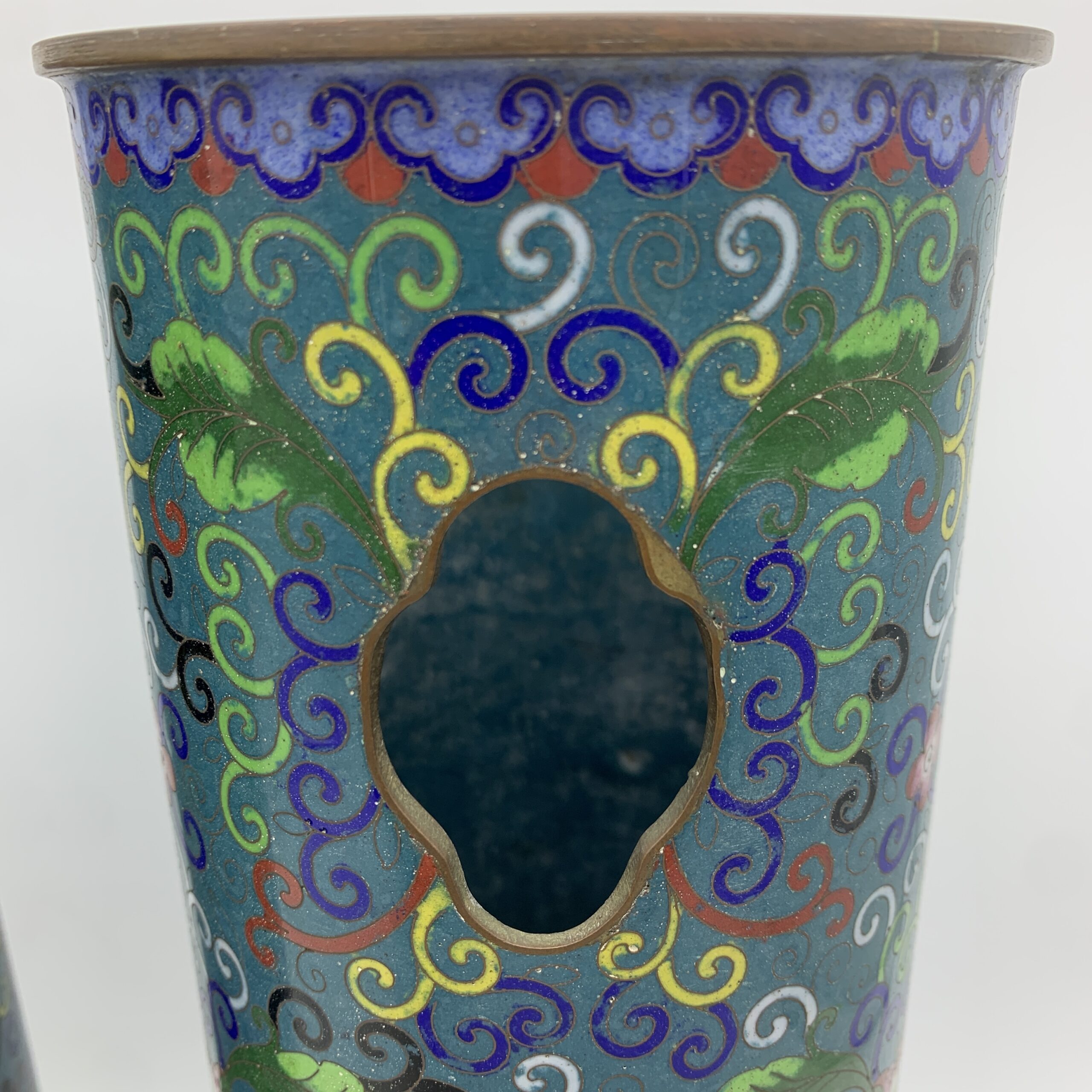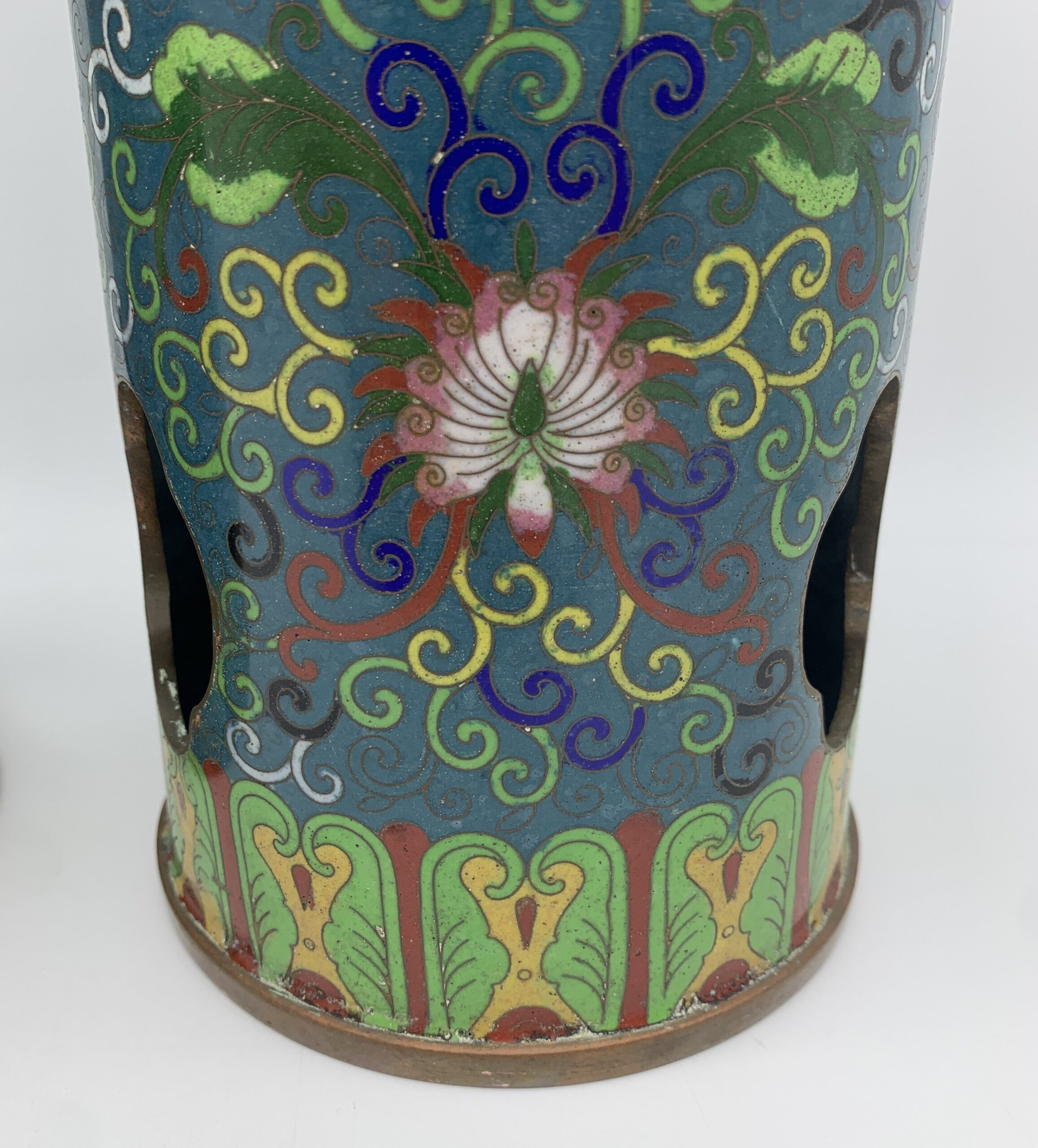This impressive, large, rare pair of antique Chinese cloisonne hat or wig stands/vases from the mid to late 1800’s, are beautifully decorated with fabulous cloisonne work, featuring a colourful display of swirling vines with lotus flowers and acanthus leaves. The pair are tall, heavy cylindrical shaped stands with quatrefoil cut-outs, to allow fragrant herbs to scent the hats, were used during the Quing dynasty to display their elaborate hats. These stands are rare and seldom seen on the market, especially a matching pair of cloisonne ones. They are both beautifully made and in excellent condition and stand 31cm high with a base and top diameter of 11,5cm and together weigh 2,33kg.