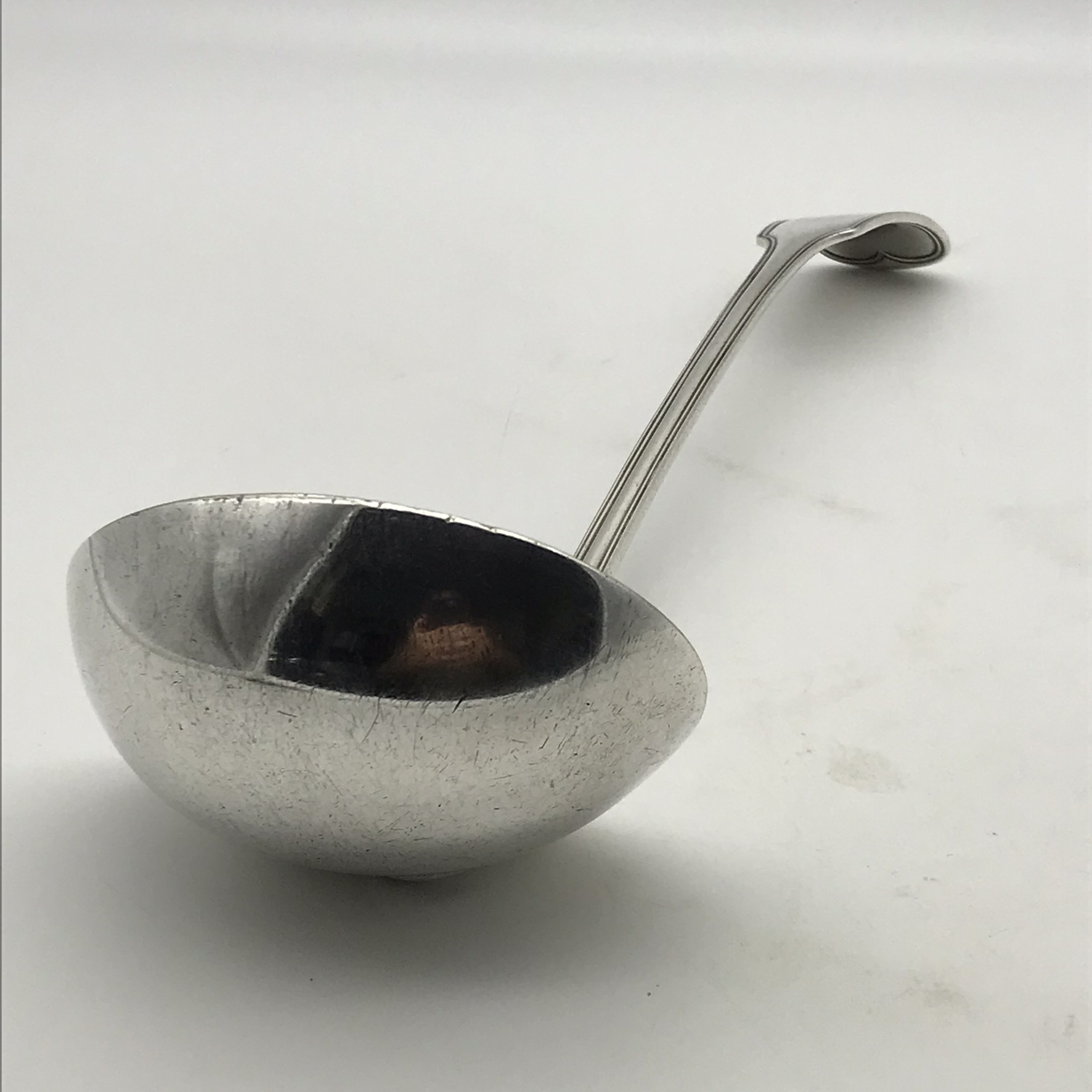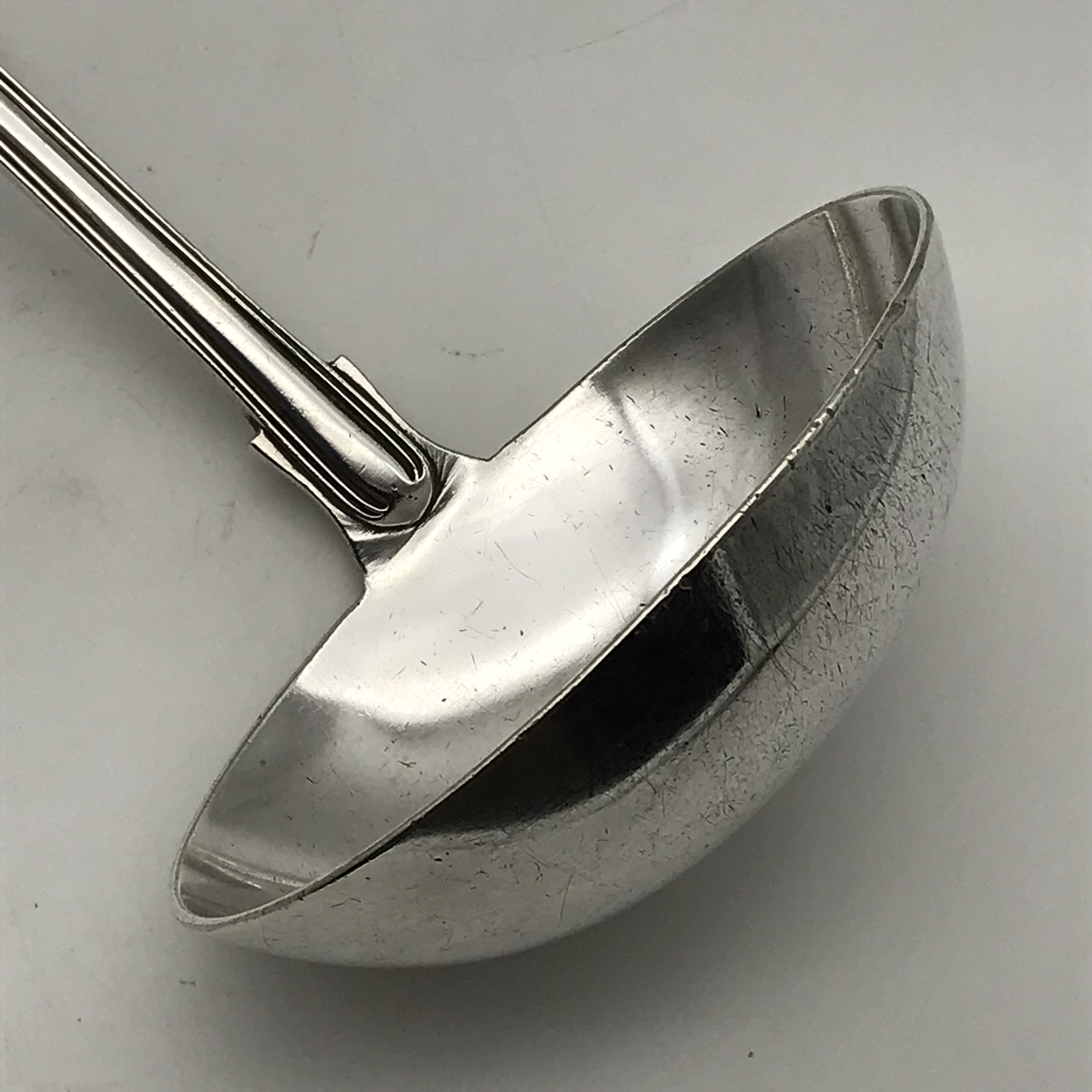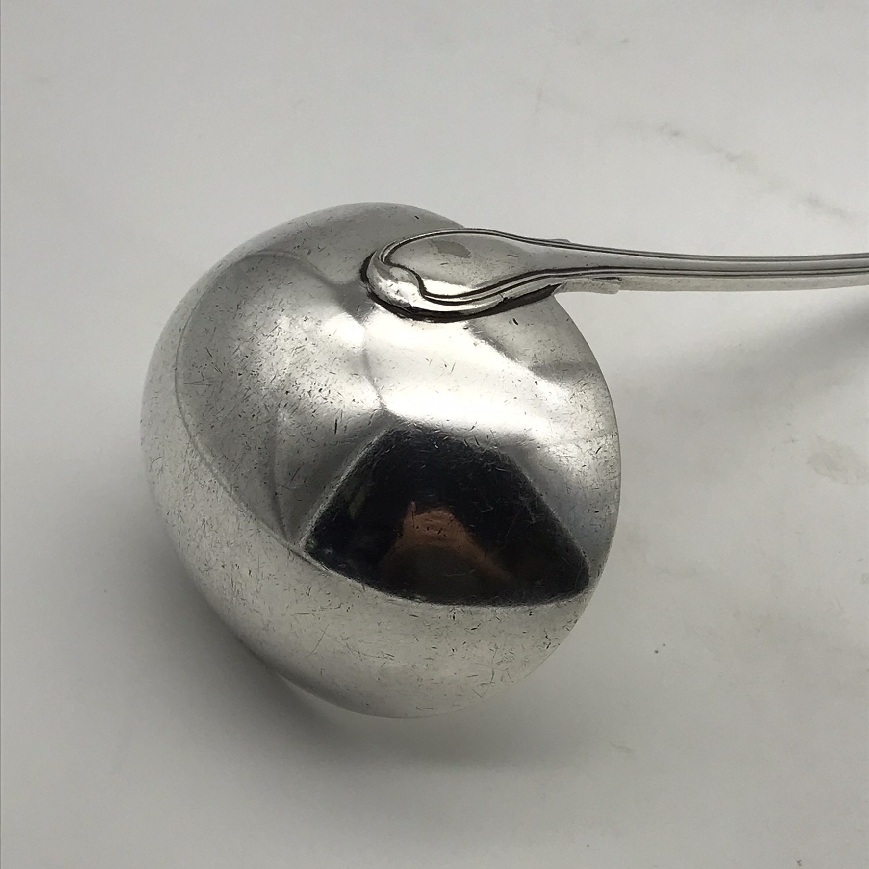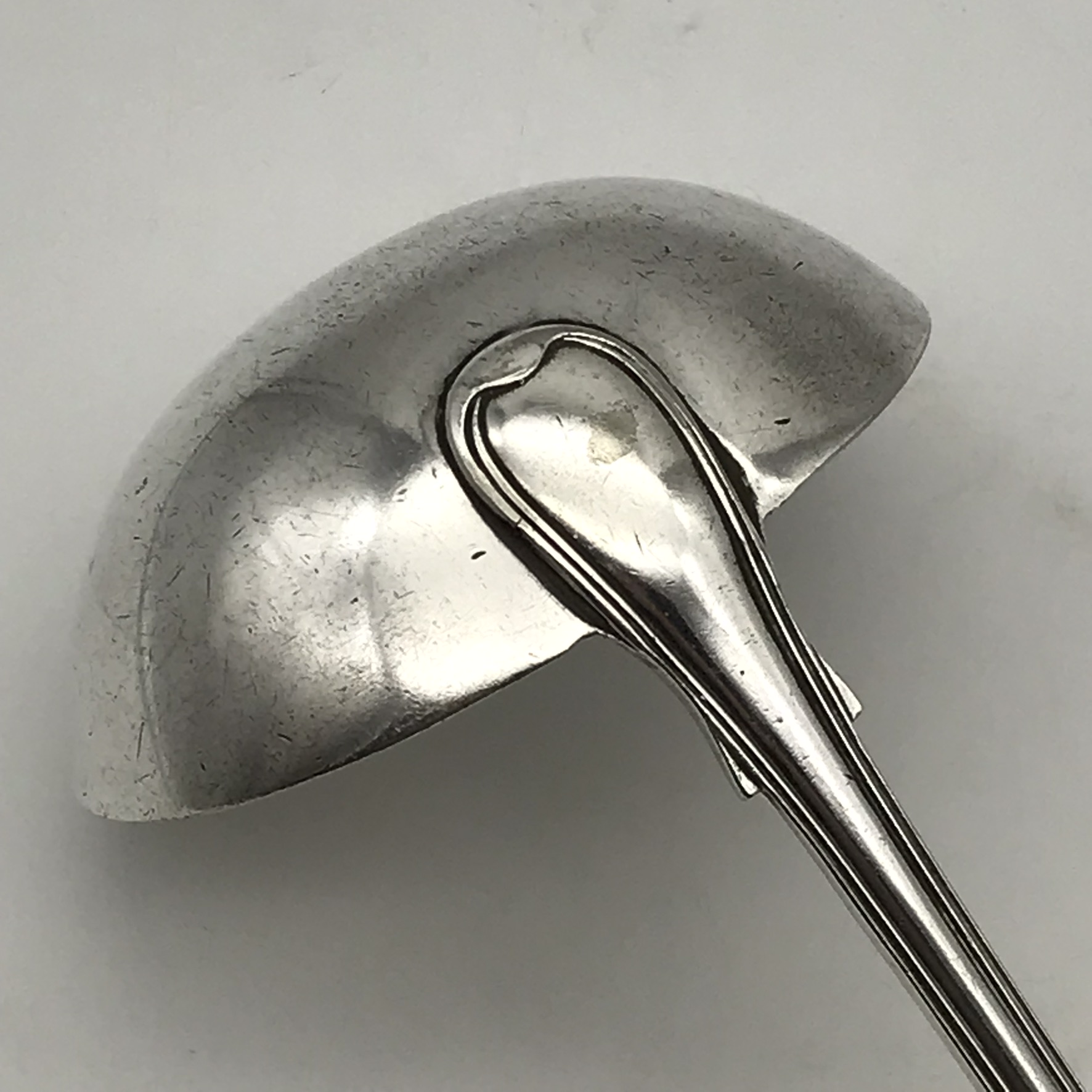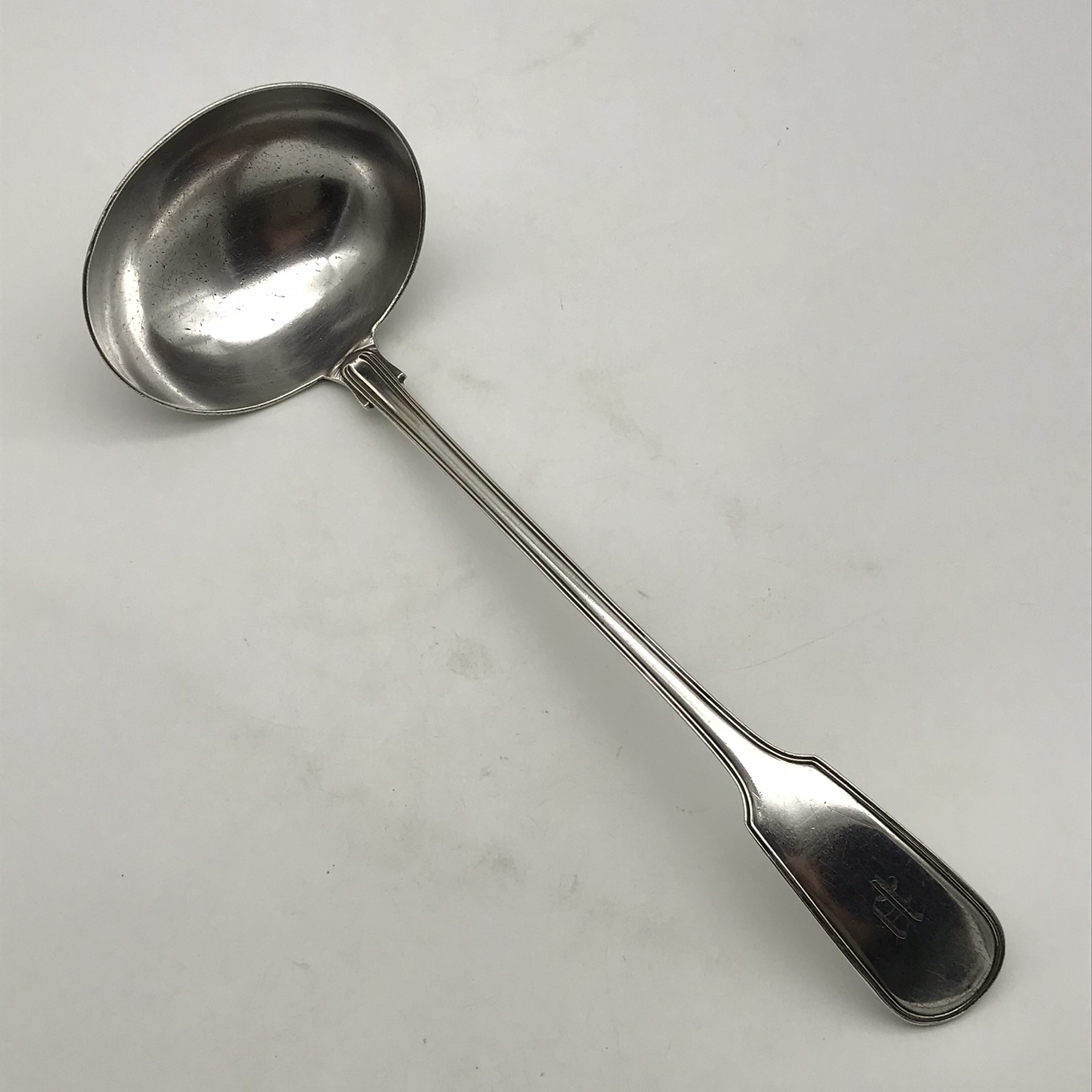 This very good quality, large antique silver-plated soup ladle, in the ‘Fiddle & Thread’, pattern was manufactured in the early 1900’s, in England by makers ‘William Hutton & Sons’ (WH & S). The ladle has the letter ‘P’ on the front and is stamped on the back with the makers trademark ‘WH & S’ and ‘A1’ for the quality of plating. It has a super weight and is in lovely condition. It measures 32cm in length, with a bowl measurement of 10,5cm x 8,5cm and weighs 260g.