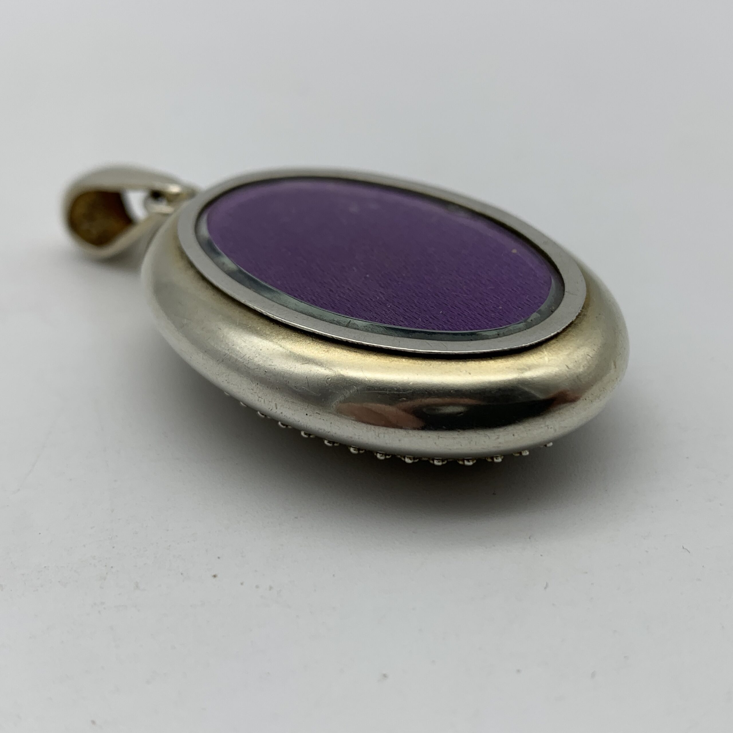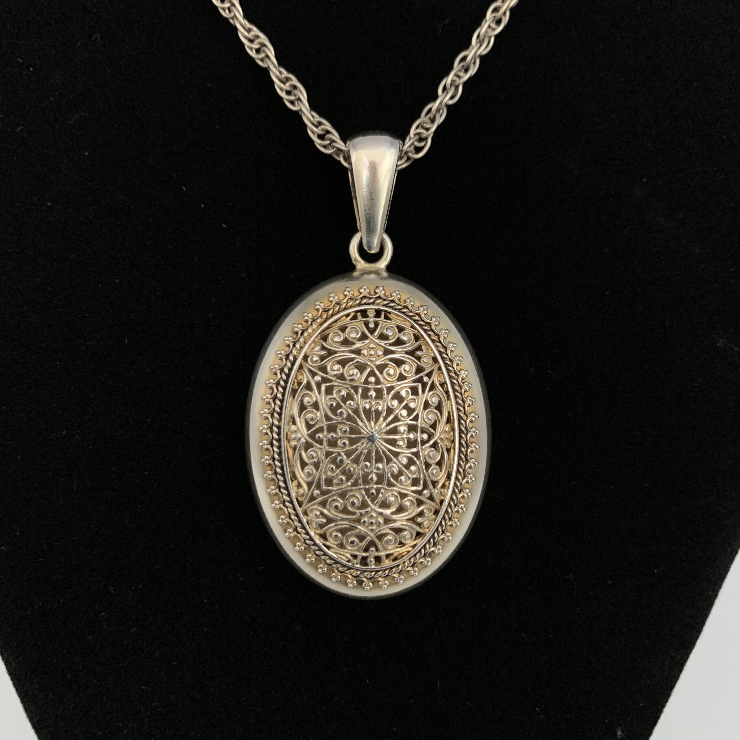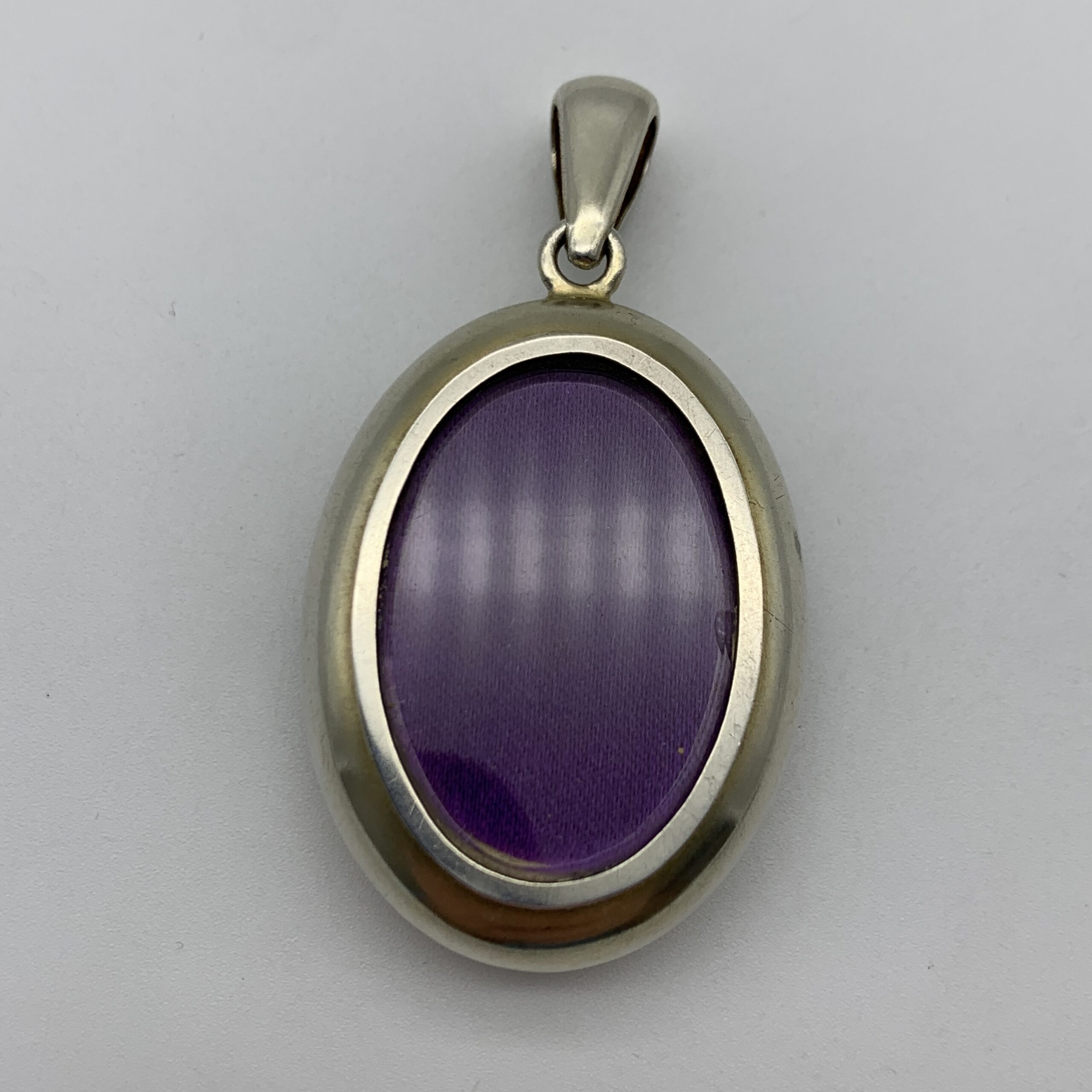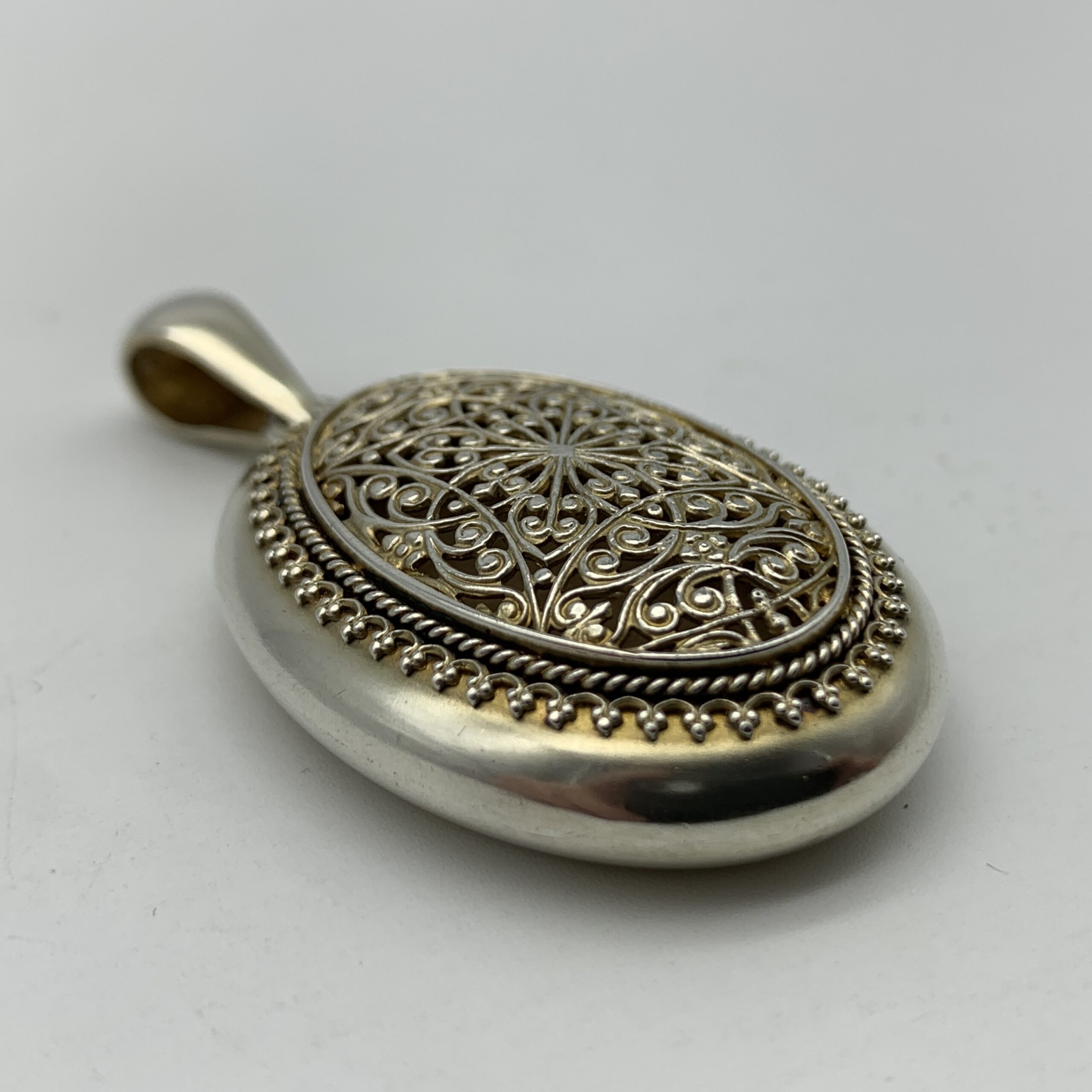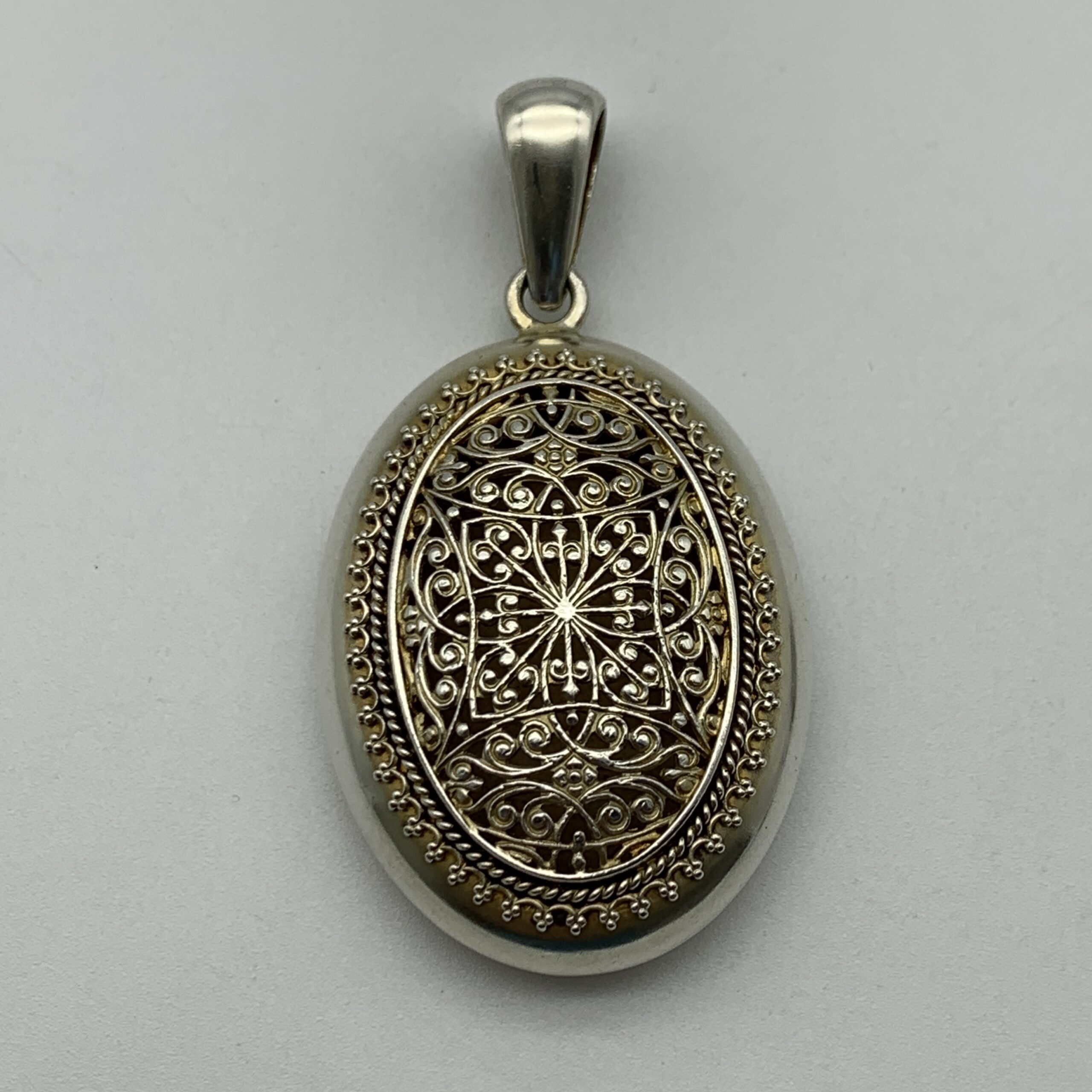 This large, attractive, very good quality, solid silver oval locket is beautifully decorated on the front with an ornately pierced pattern and bordered with a pretty edge. It has a locket compartment on the back, with an oval pull-out and framed glass cover, ideal for a photograph or lock of hair. It probably dates to the 1940/50’s, is not stamped, but confirmed as sterling silver and measures 3cm x 4,5cm (6cm with hanger), with a weight of 13,7g. It’s in great condition with the back cover fitting firmly
