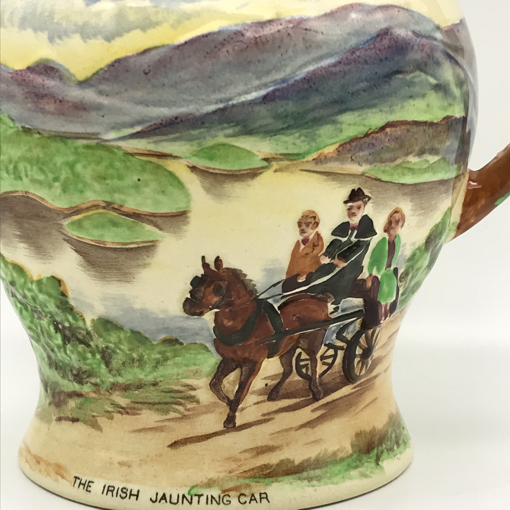 This large, beautiful Crown Devon Musical jug has a lovely shape with a large spout and features, in relief, a pretty, hand-painted Irish country scene (In and around The Killarney National Park) with an Irish jaunting car in front of a small lake with cottages and castle gates around the top. On the other side of the jug are the words to the classic Irish song: ‘KILLARNEY’