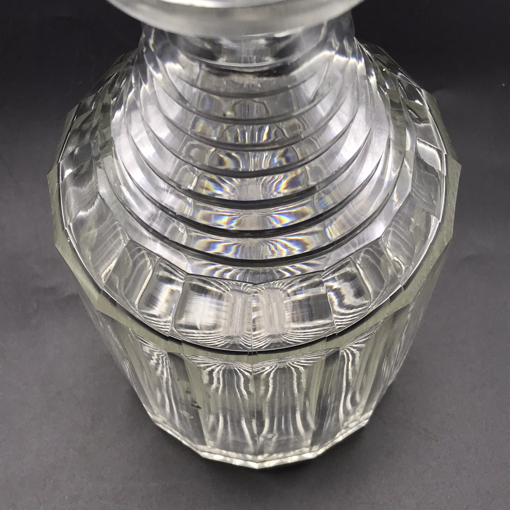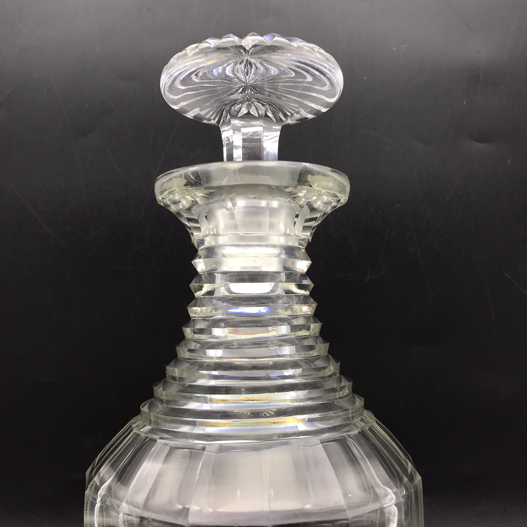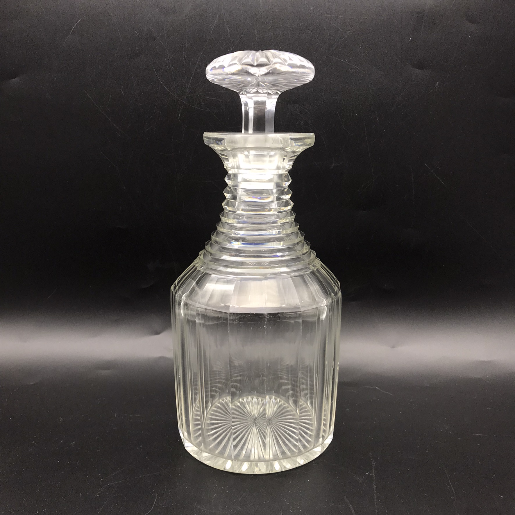 This very early, large, fine quality, cut-crystal decanter from the early 1800’s is mallet shaped with panel-cut sides to the body, facet-cut shoulders, a lovely stepped, multiple ridge-cut neck, and is topped with its original mushroom shaped stopper. These lovely Georgian decanters are seldom seen, and other than two tiny nicks on the body, it’s in excellent condition. It has a good weight, sits on a star-cut base, stands 25cm high (with stopper), has a width of 11cm at its widest and weighs 1,48kg.