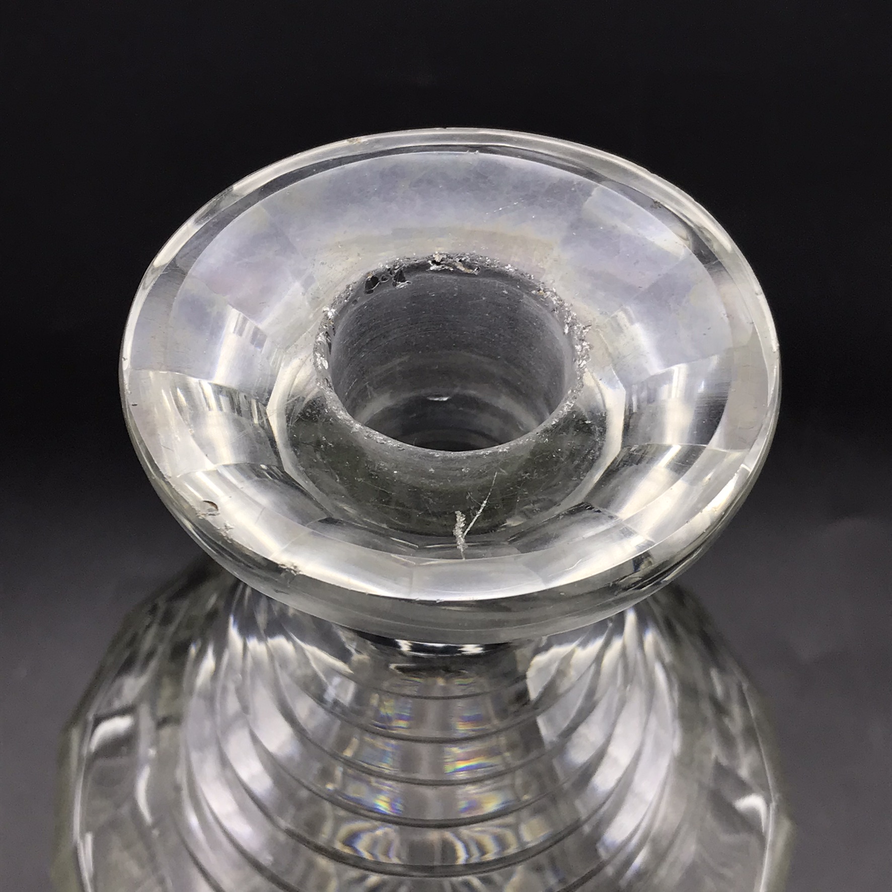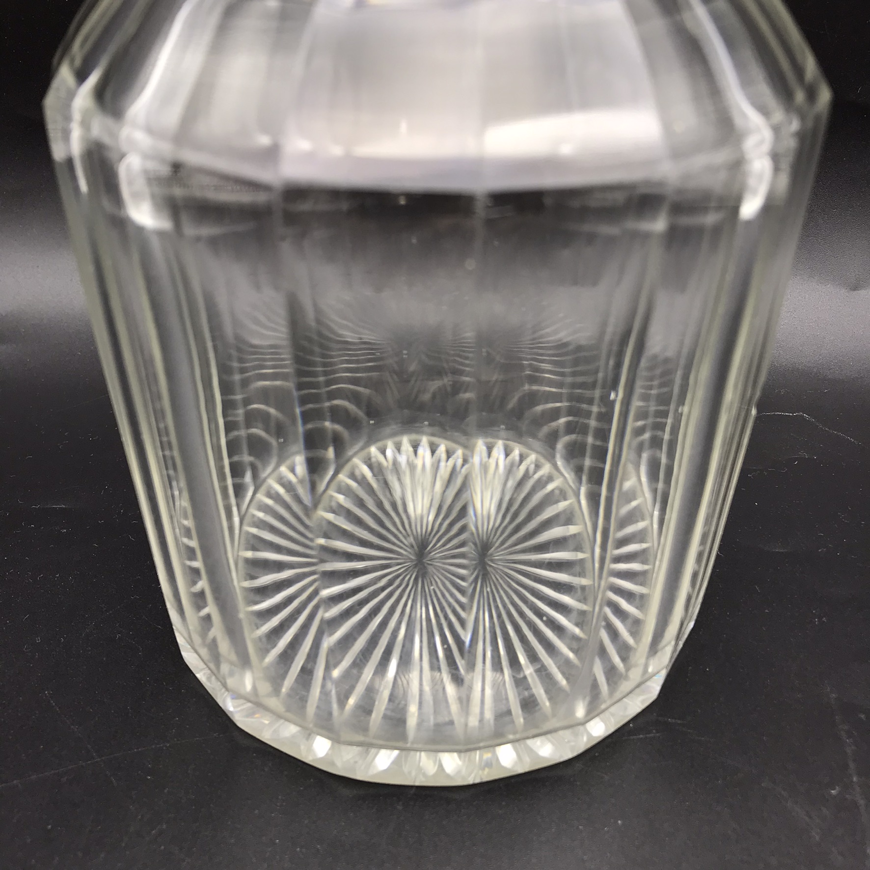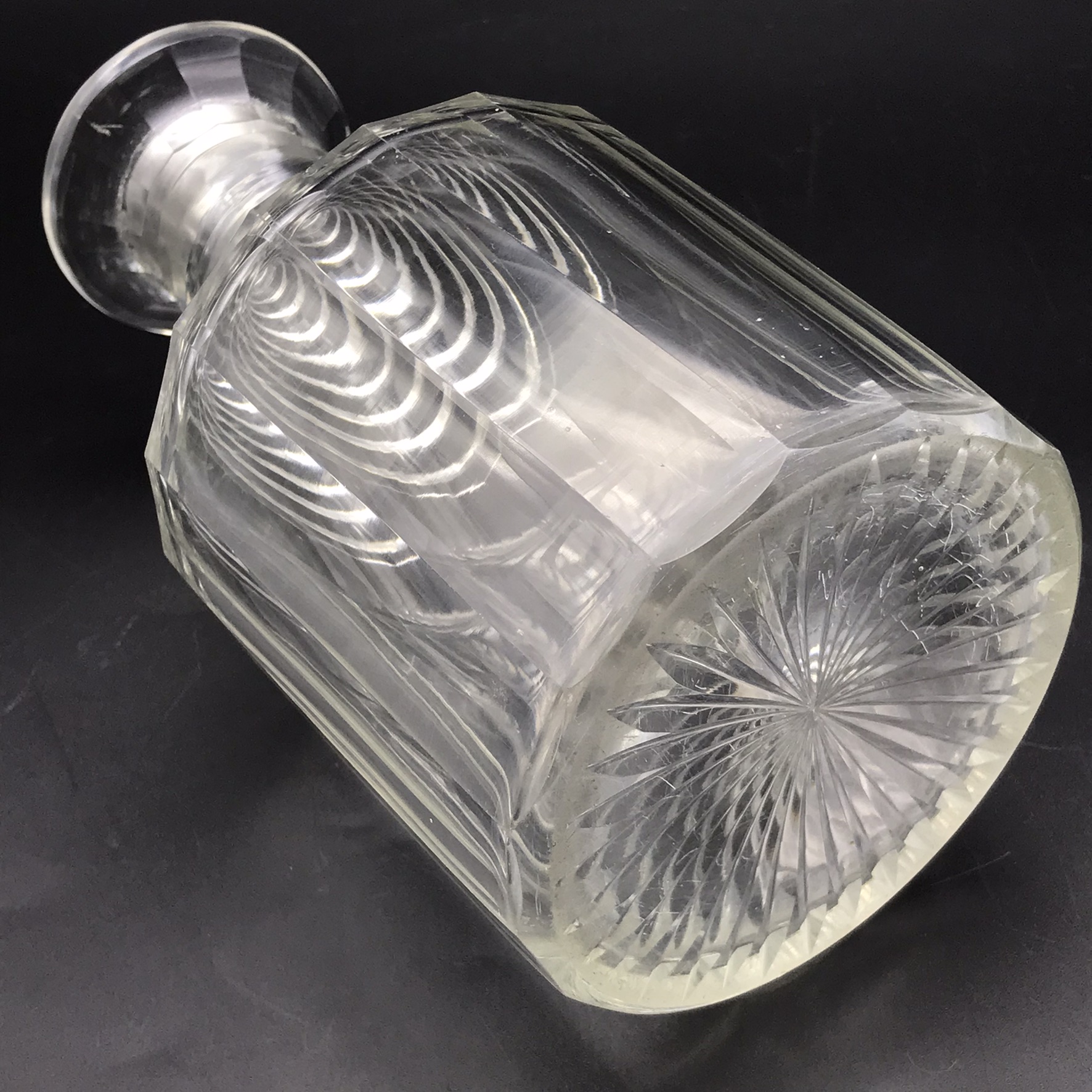 This very early, large, fine quality, cut-crystal decanter from the early 1800’s is mallet shaped with panel-cut sides to the body, facet-cut shoulders, a lovely stepped, multiple ridge-cut neck, and is topped with its original mushroom shaped stopper. These lovely Georgian decanters are seldom seen, and other than two tiny nicks on the body, it’s in excellent condition. It has a good weight, sits on a star-cut base, stands 25cm high (with stopper), has a width of 11cm at its widest and weighs 1,48kg.