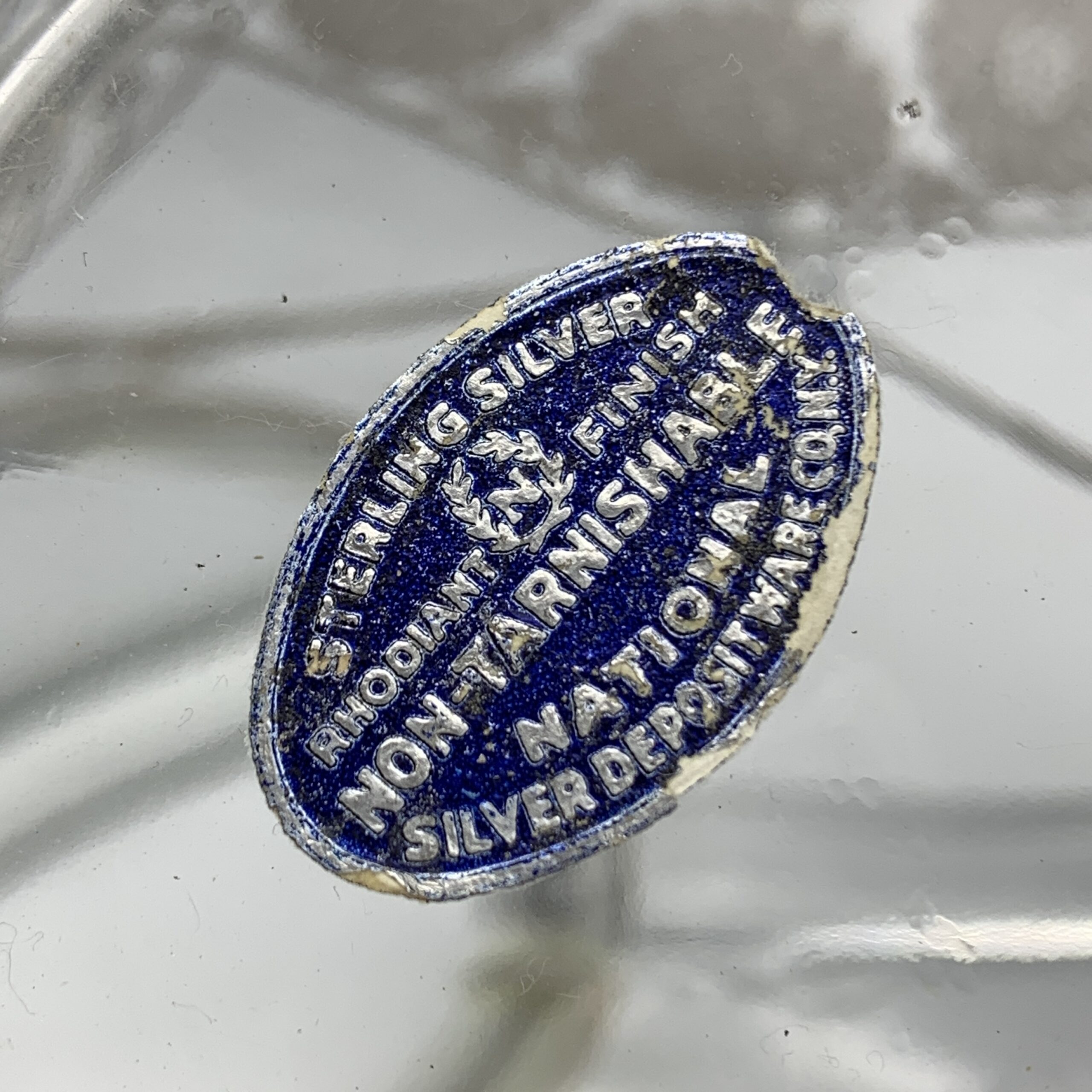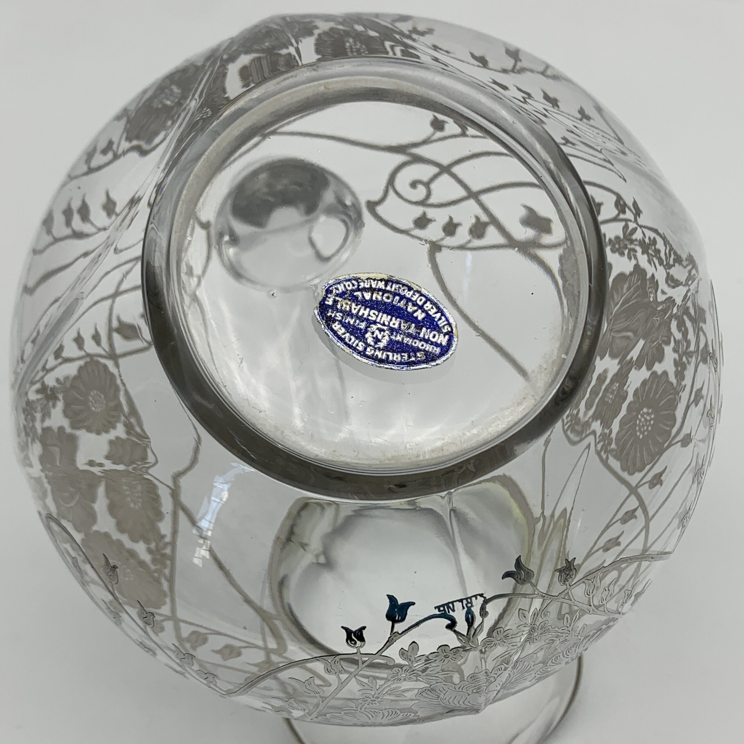 This lovely, large, 1940’s, American glass water jug has an unusual round ball deco shape, seated with a tilt and a spout designed to hold ice back. It is beautifully decorated with a floral, sterling silver overly featuring roses, marigolds and garlands of ‘lily of the valley’ flowers. It was produced by the American company ‘National Silver Deposit Ware’ in New York, who were active between the 1920’s and 1950’s and still has the original blue label on the base. This lovely piece is in excellent condition and is stamped ‘STERLING’ amongst the silver overlay in two places. The jug stands 23,5cm high with a diameter of 17cm at its widest and weighs 1160g.