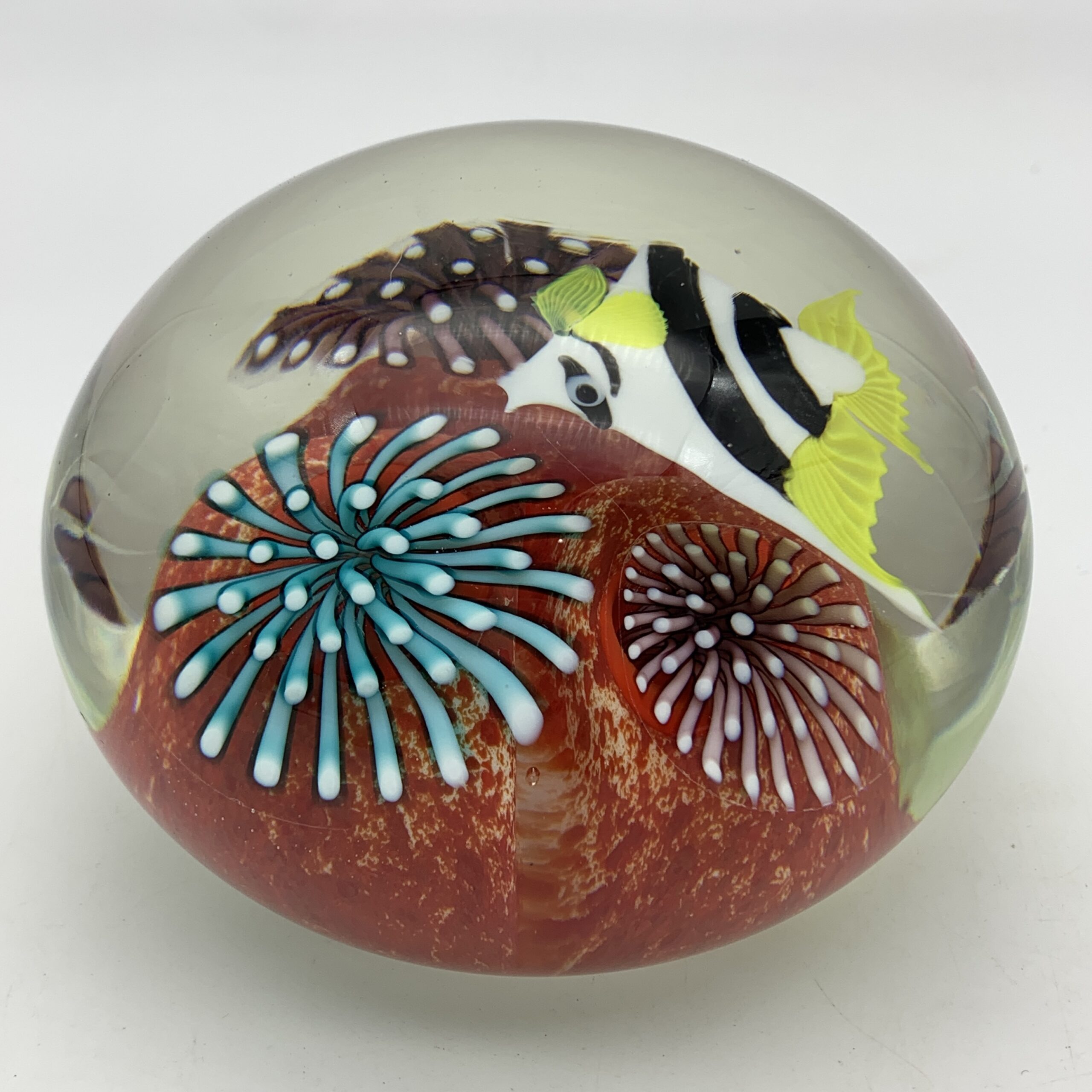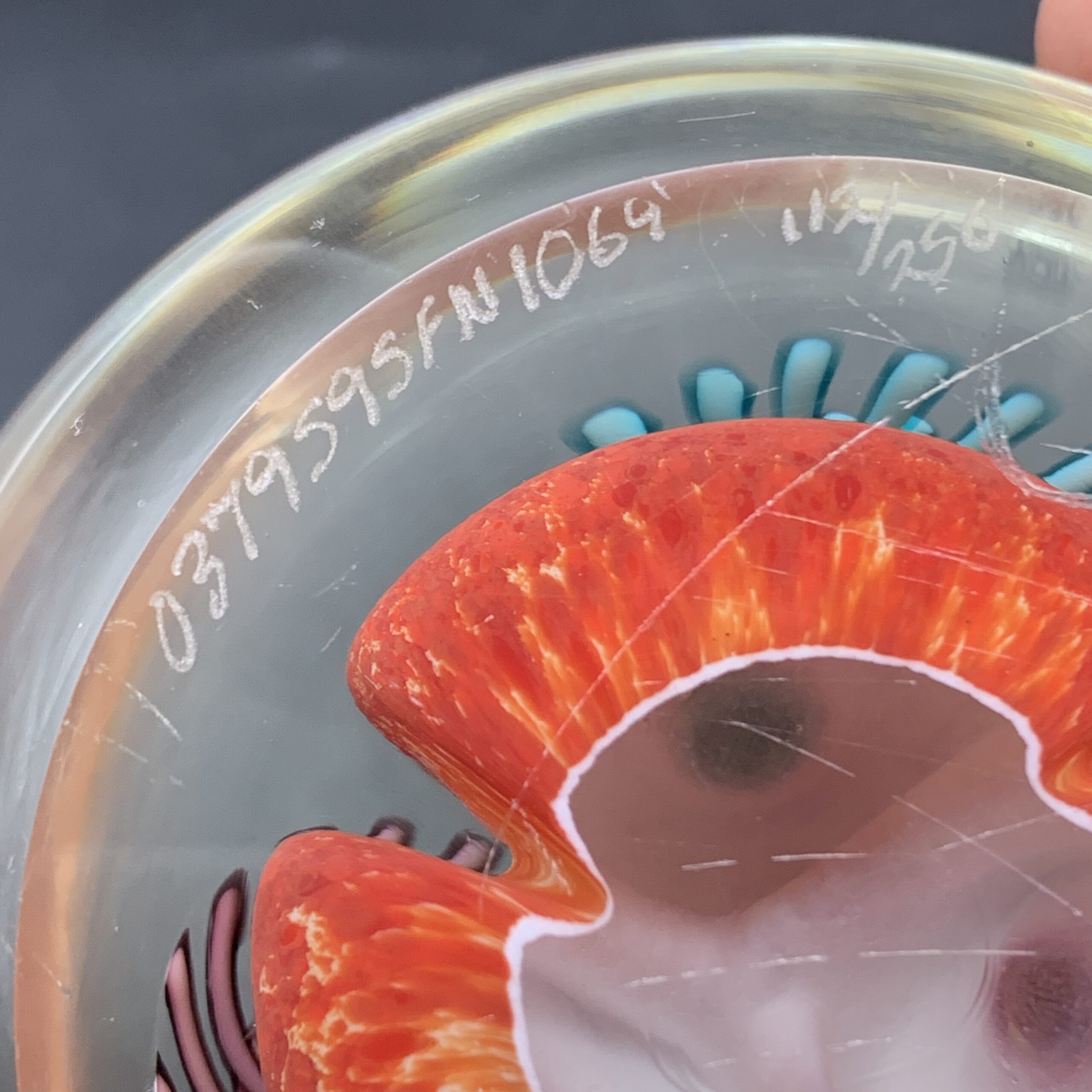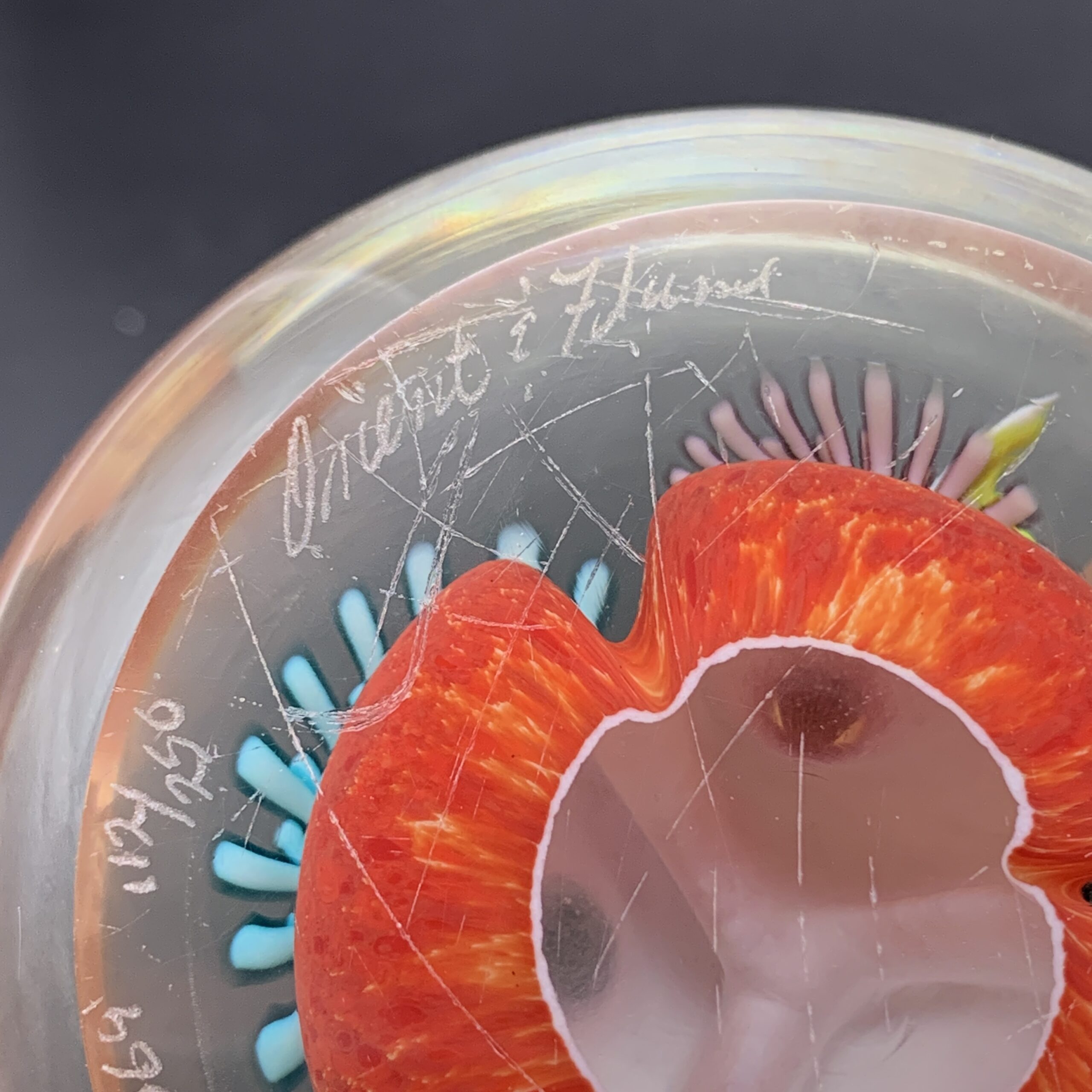 This amazing, super quality, scarce ‘Orient & Flume’ Limited edition (112/250), Aquarium art glass paperweight was hand made by one of their great artists ‘Scott Beyers’, from their studio in California, U.S.A. It features a wonderful, colourful, three-dimensional aquarium with a tropical fish swimming amongst anemone swaying with the current. ‘Scott’ is known for his graceful, free flowing natural designs which you can see from all sides no matter how you turn the piece. ‘Orient & Flume’ is one of the great American glass studios, which was founded in 1972 and have their pieces displayed in several major museums. This lovely paperweight is in excellent condition and hand inscribed and signed on the base ‘Orient & Flume’ ‘Beyers’ ‘112/250’ ‘0379595FN1069’. It stands 7cm high, with a diameter of 9,5cm and weighs 875g.