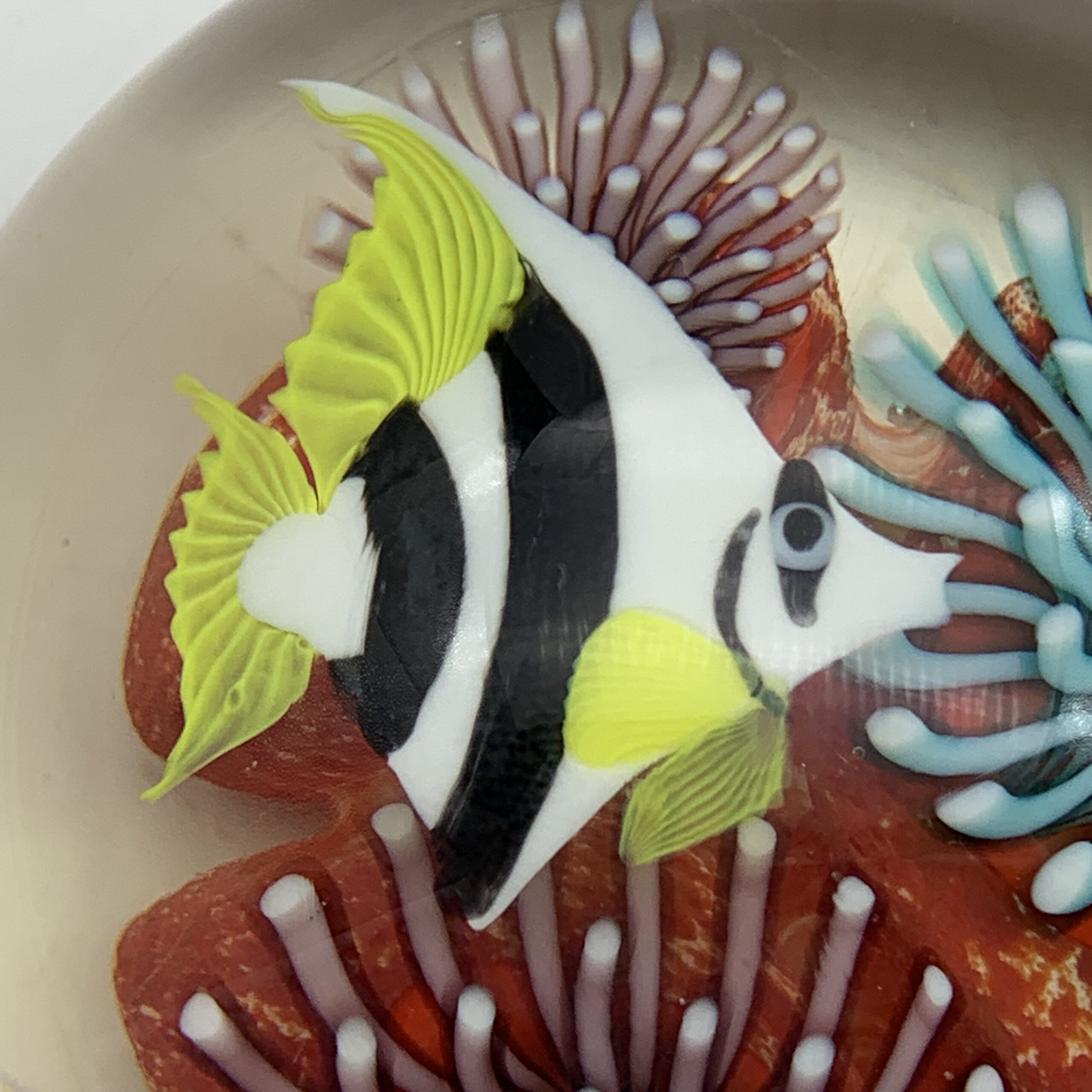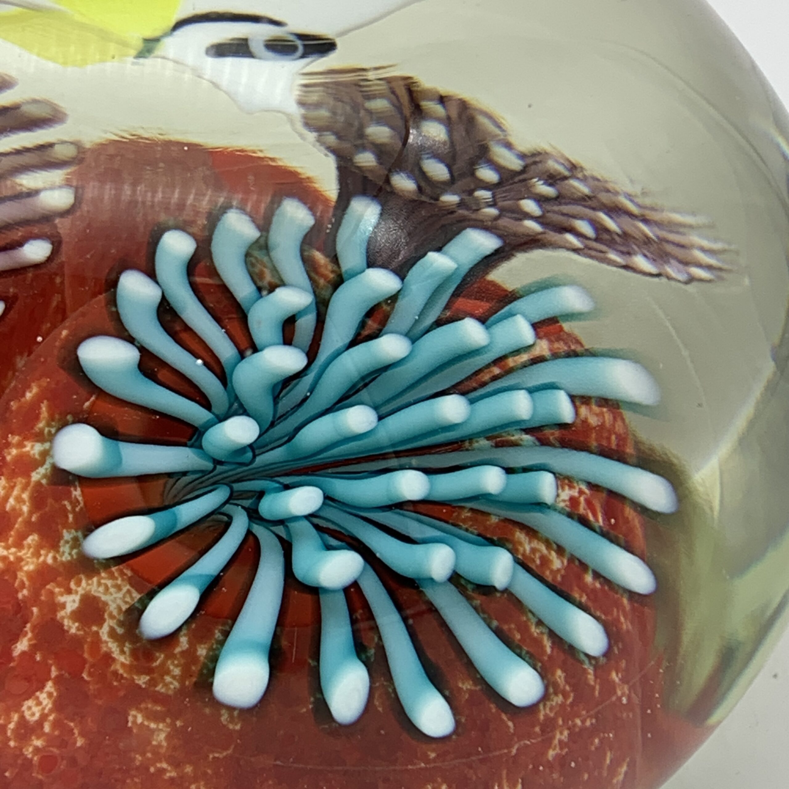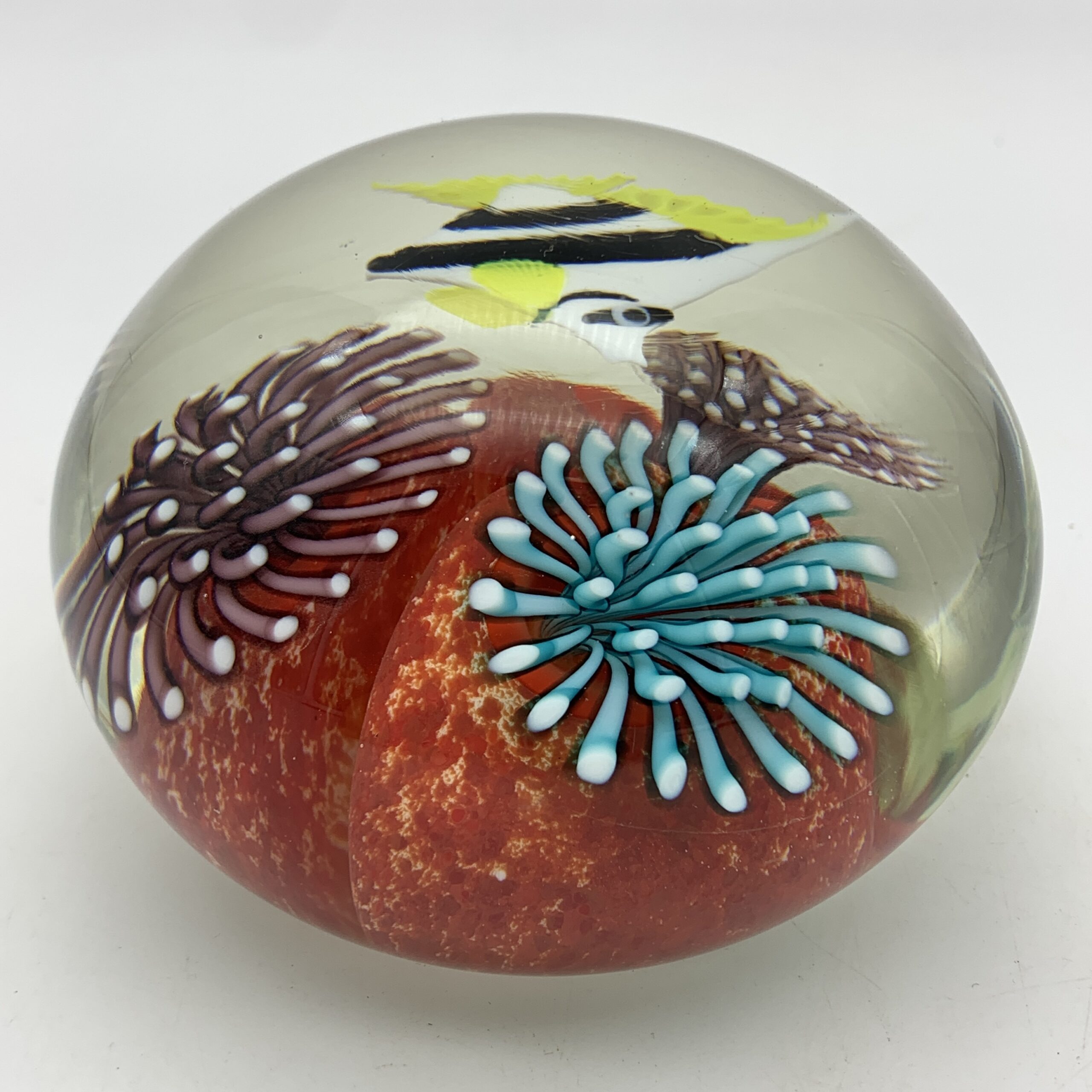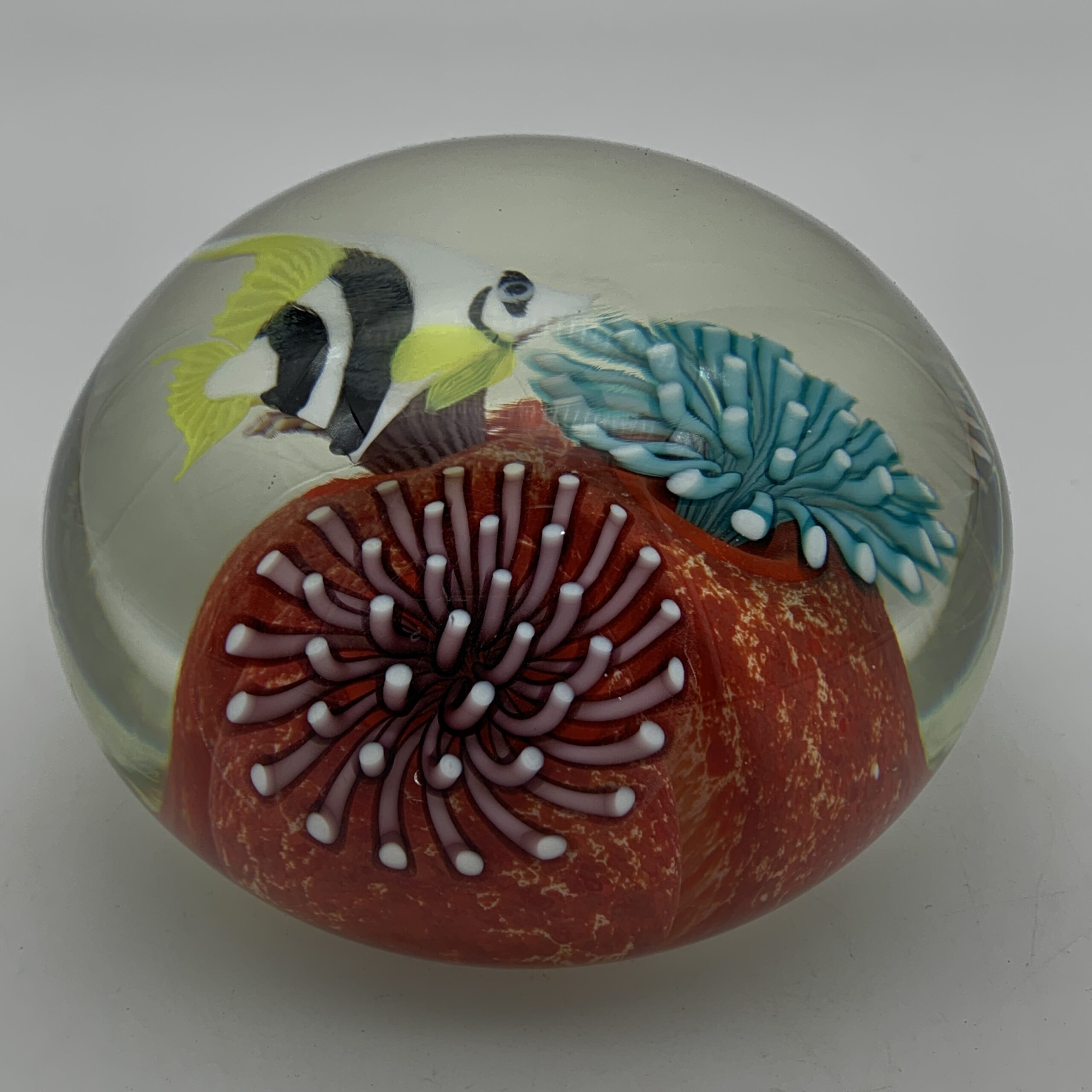 This amazing, super quality, scarce ‘Orient & Flume’ Limited edition (112/250), Aquarium art glass paperweight was hand made by one of their great artists ‘Scott Beyers’, from their studio in California, U.S.A. It features a wonderful, colourful, three-dimensional aquarium with a tropical fish swimming amongst anemone swaying with the current. ‘Scott’ is known for his graceful, free flowing natural designs which you can see from all sides no matter how you turn the piece. ‘Orient & Flume’ is one of the great American glass studios, which was founded in 1972 and have their pieces displayed in several major museums. This lovely paperweight is in excellent condition and hand inscribed and signed on the base ‘Orient & Flume’ ‘Beyers’ ‘112/250’ ‘0379595FN1069’. It stands 7cm high, with a diameter of 9,5cm and weighs 875g.