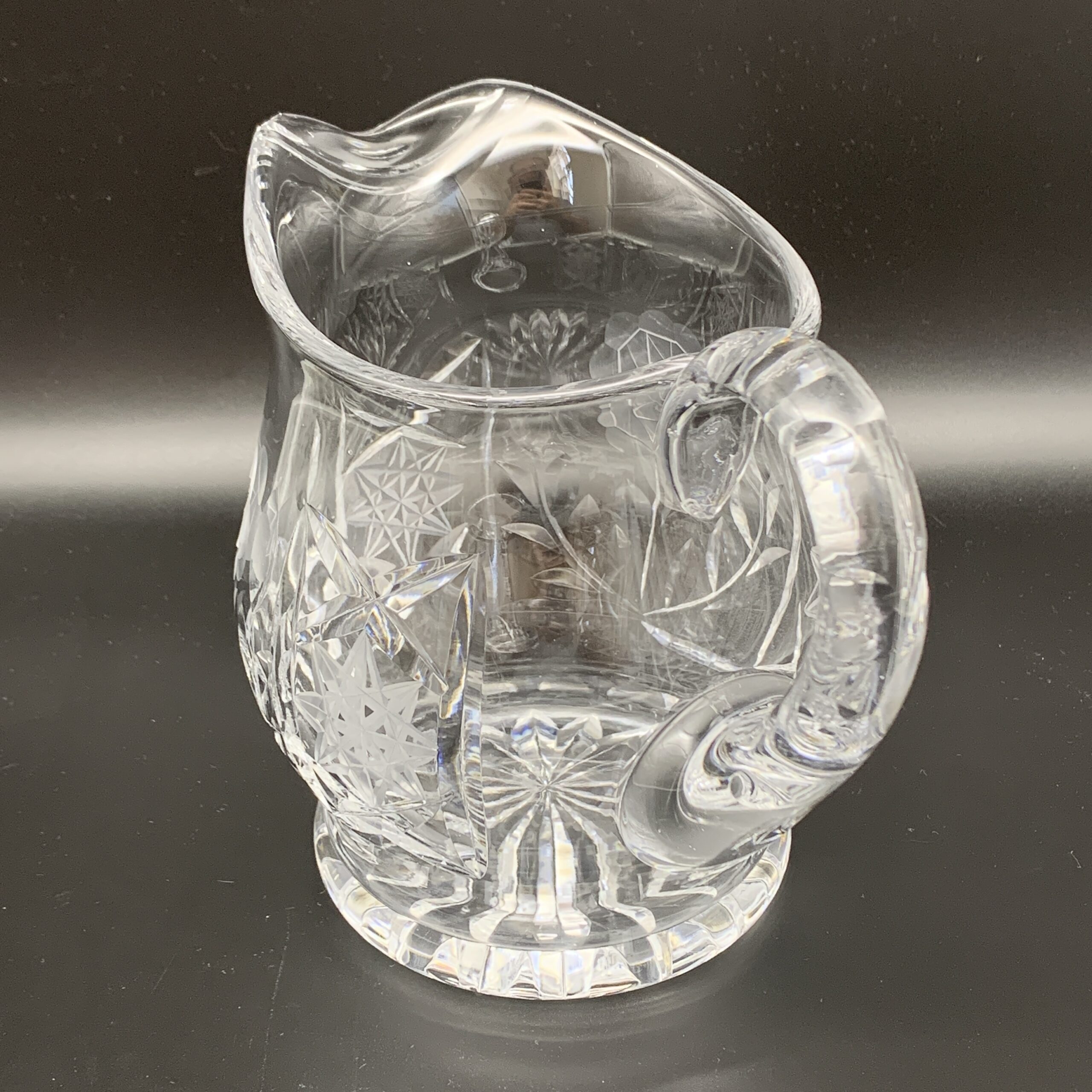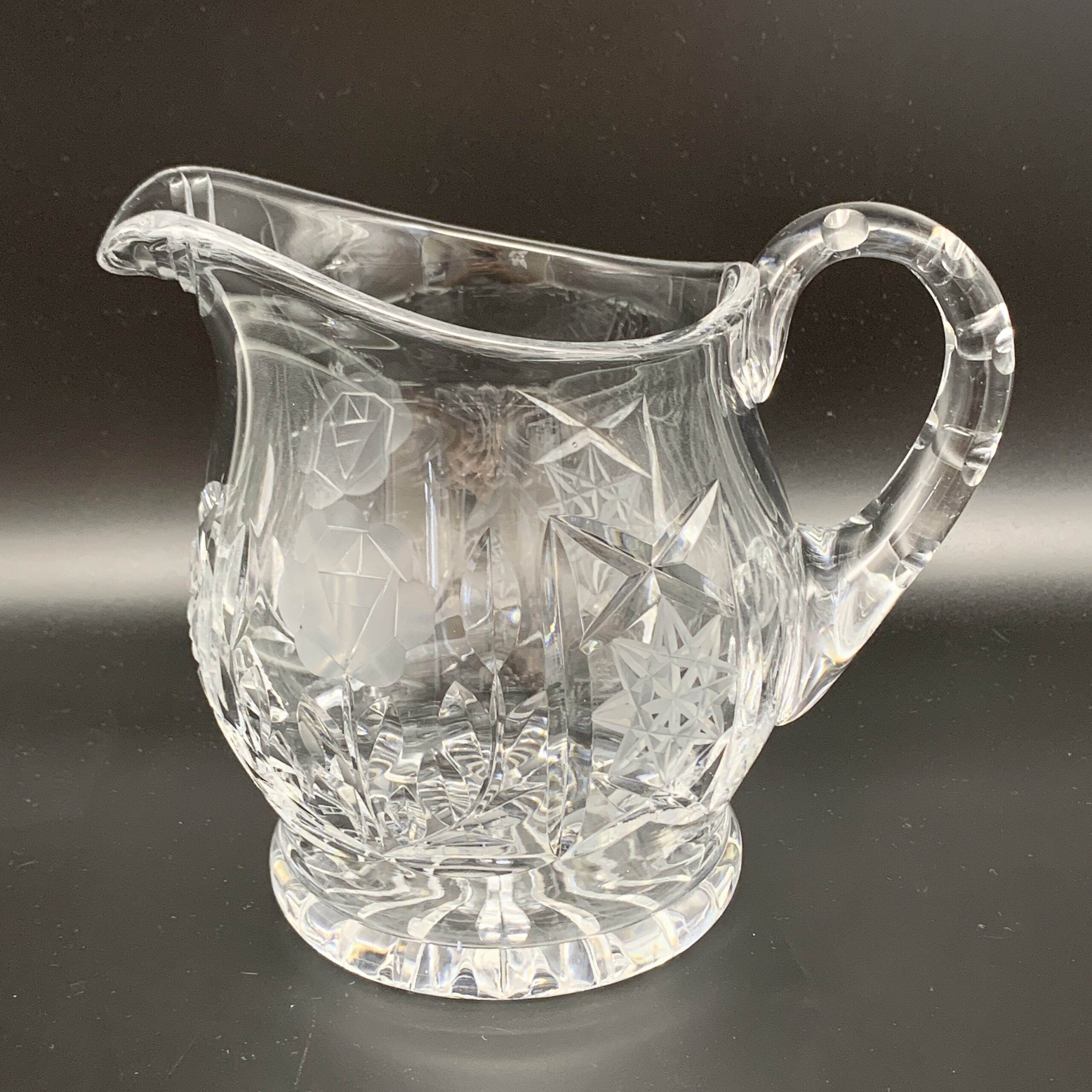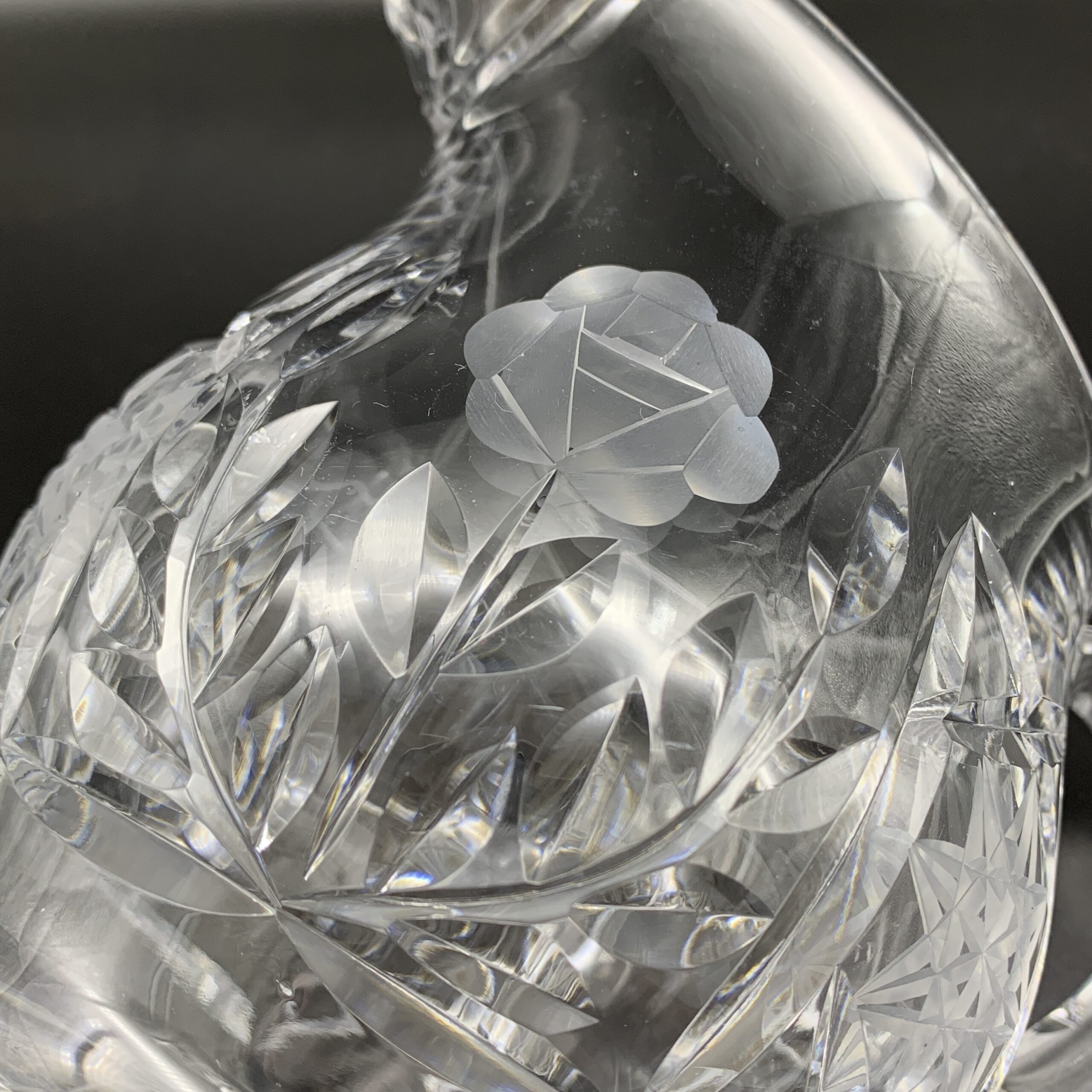 This lovely, large, vintage, hand-cut crystal water jug is in superb condition and crystal clear. It has an attractive bulbous shape, beautifully cut with starbursts along with roses and leaves and rests on a round star-cut base. This fine quality jug stands 16,5cm high, measures 19cm handle to spout, has a base diameter of 11cm and weighs 1,1kg.