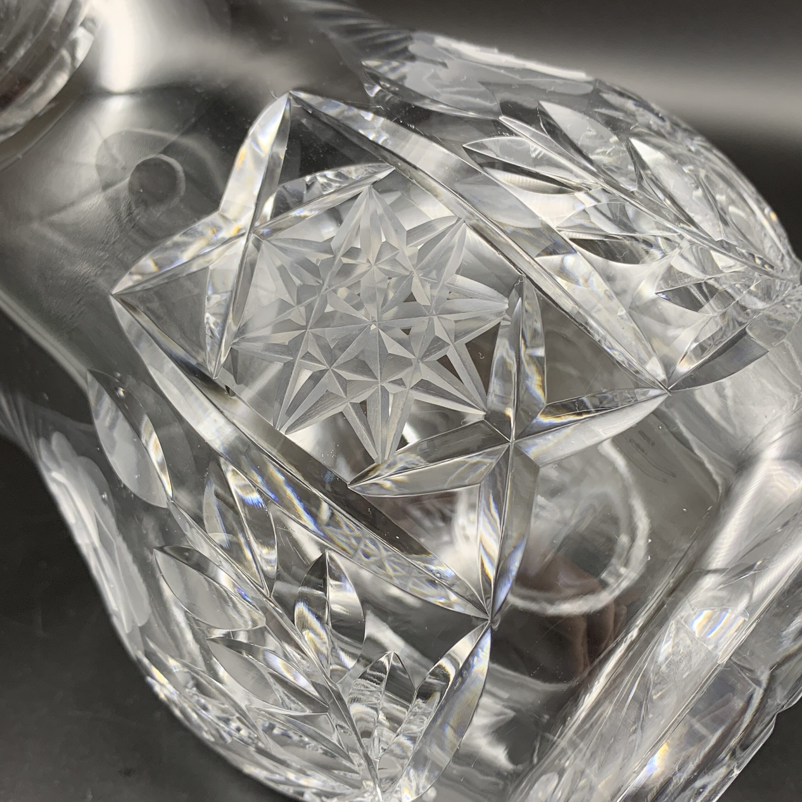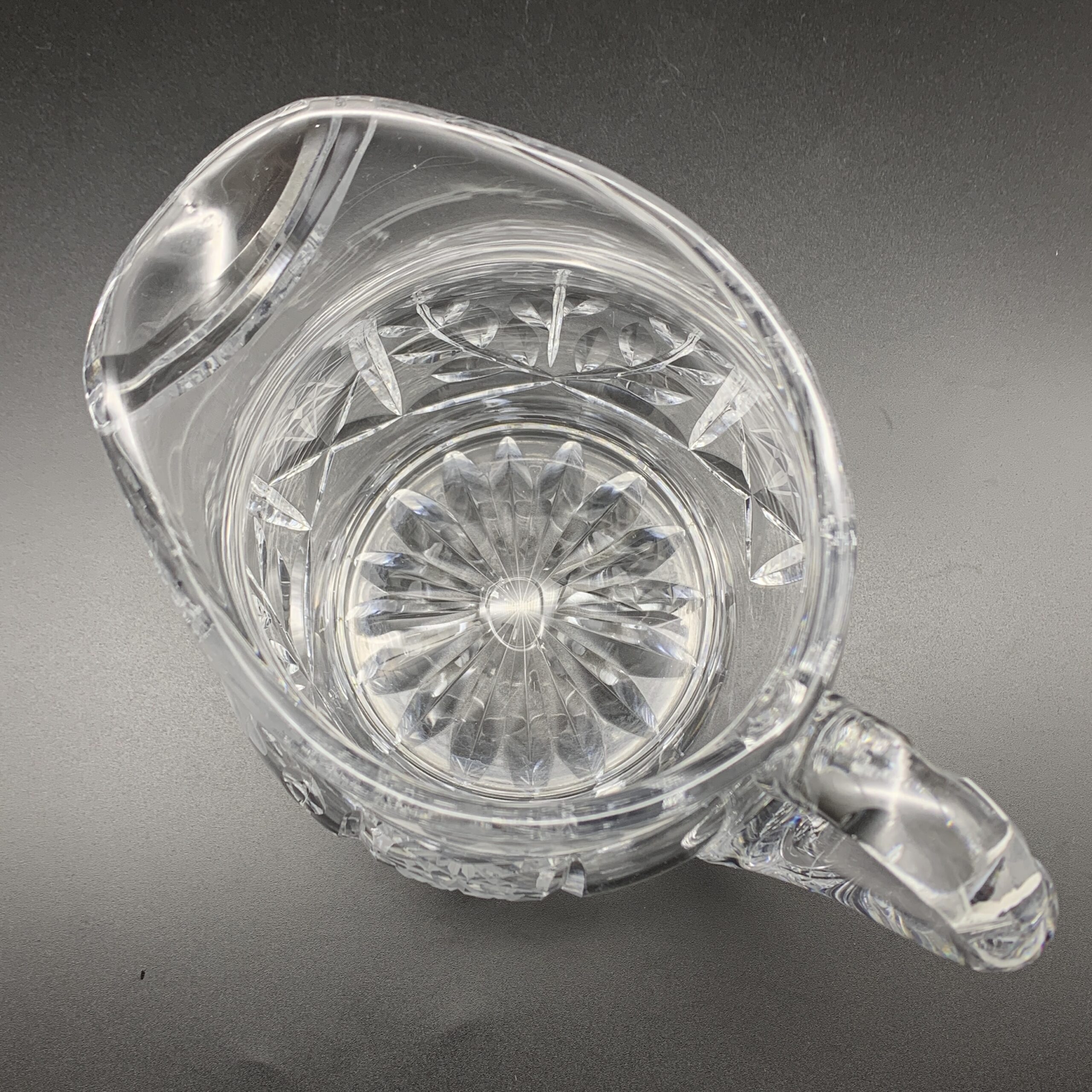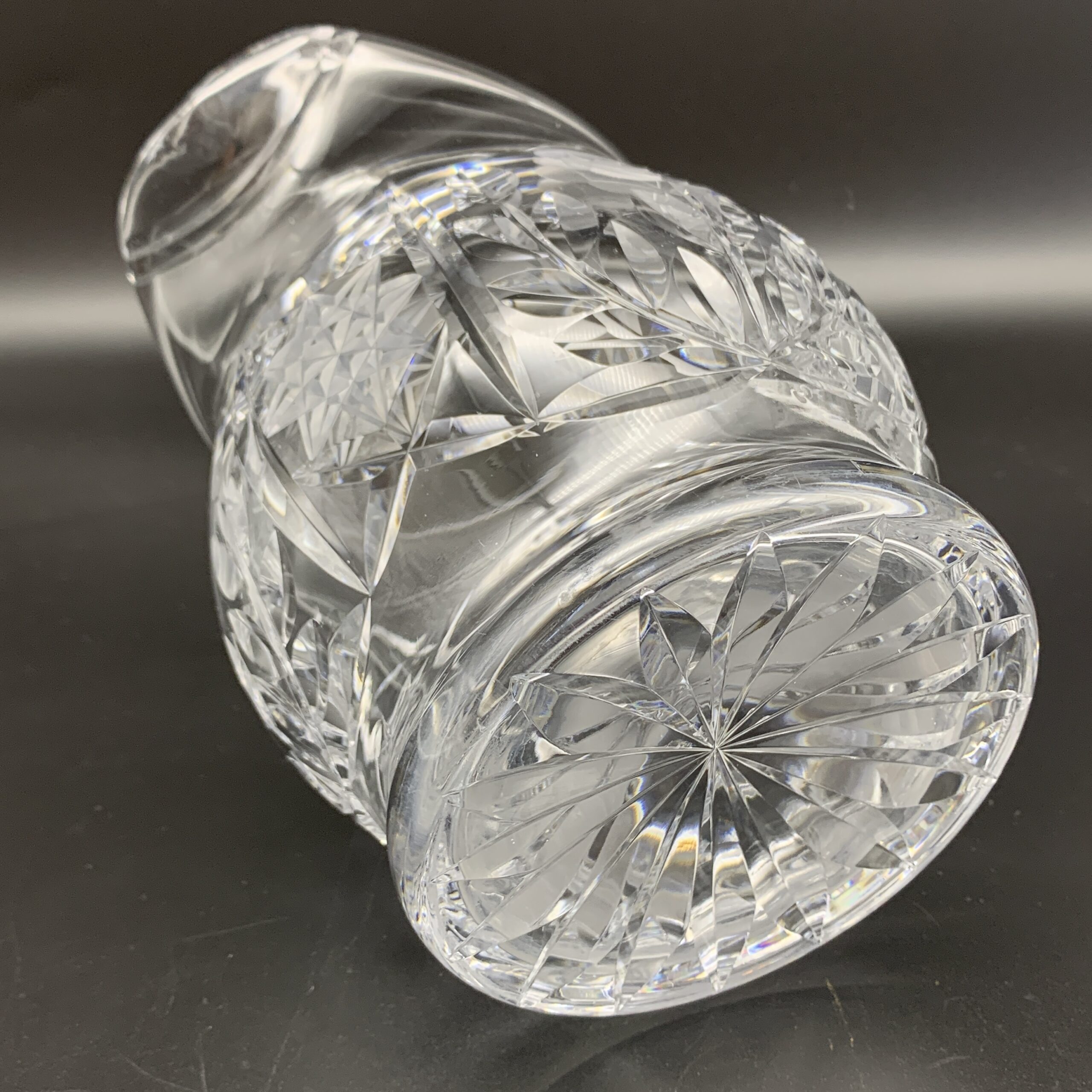 This lovely, large, vintage, hand-cut crystal water jug is in superb condition and crystal clear. It has an attractive bulbous shape, beautifully cut with starbursts along with roses and leaves and rests on a round star-cut base. This fine quality jug stands 16,5cm high, measures 19cm handle to spout, has a base diameter of 11cm and weighs 1,1kg.