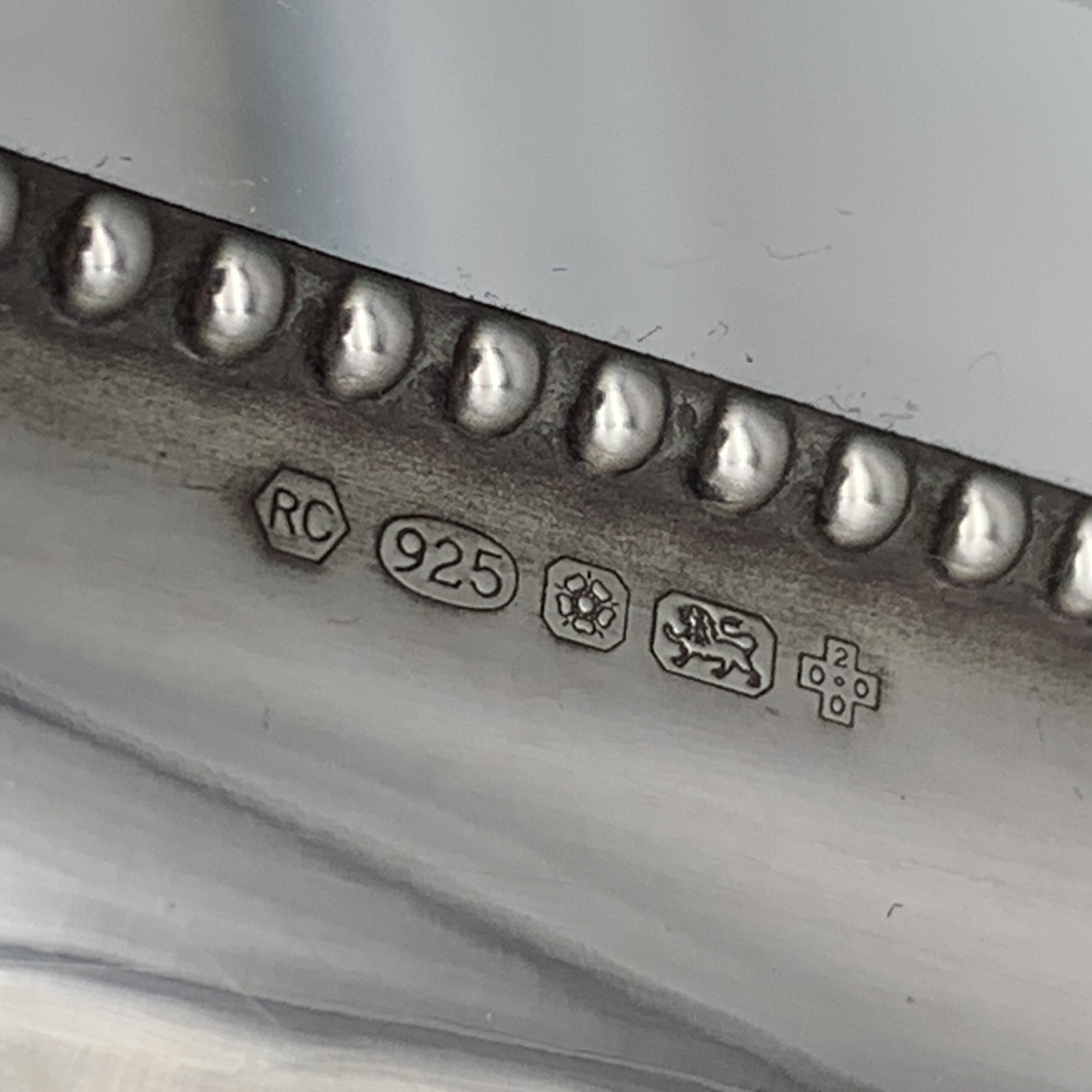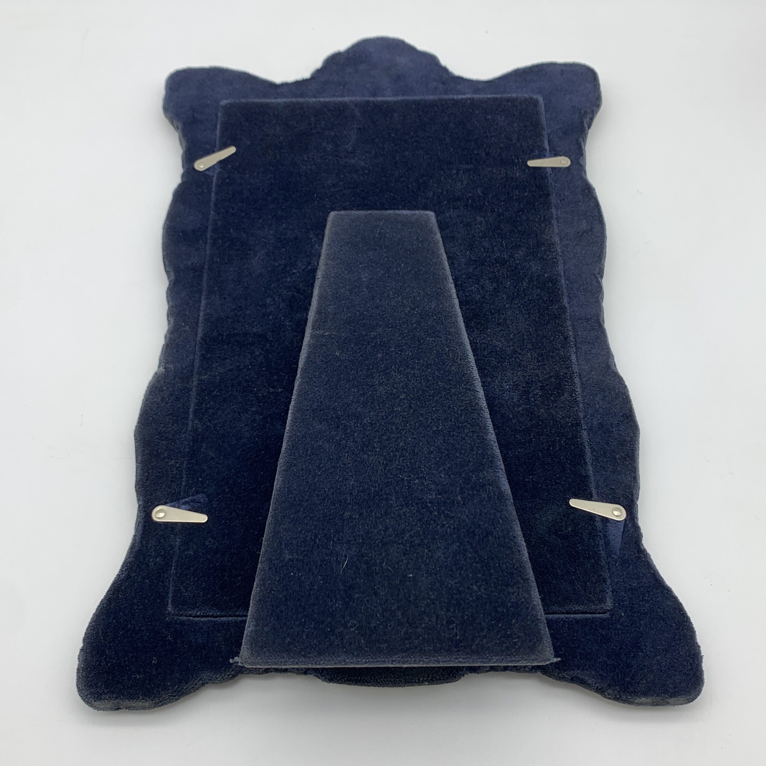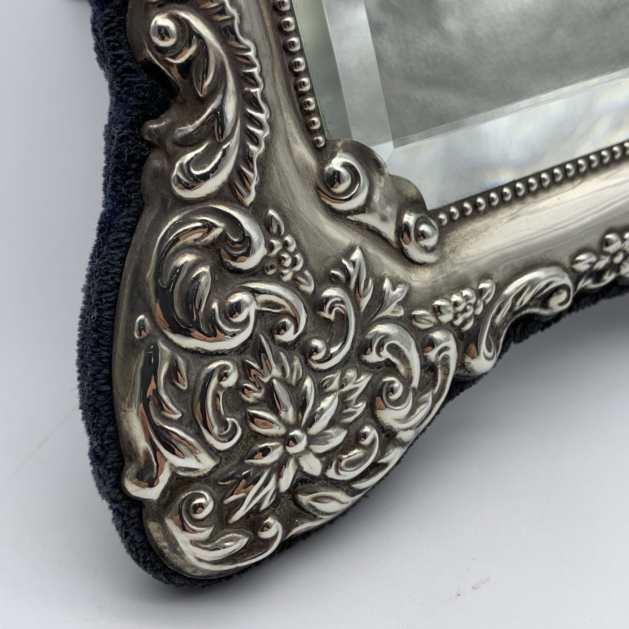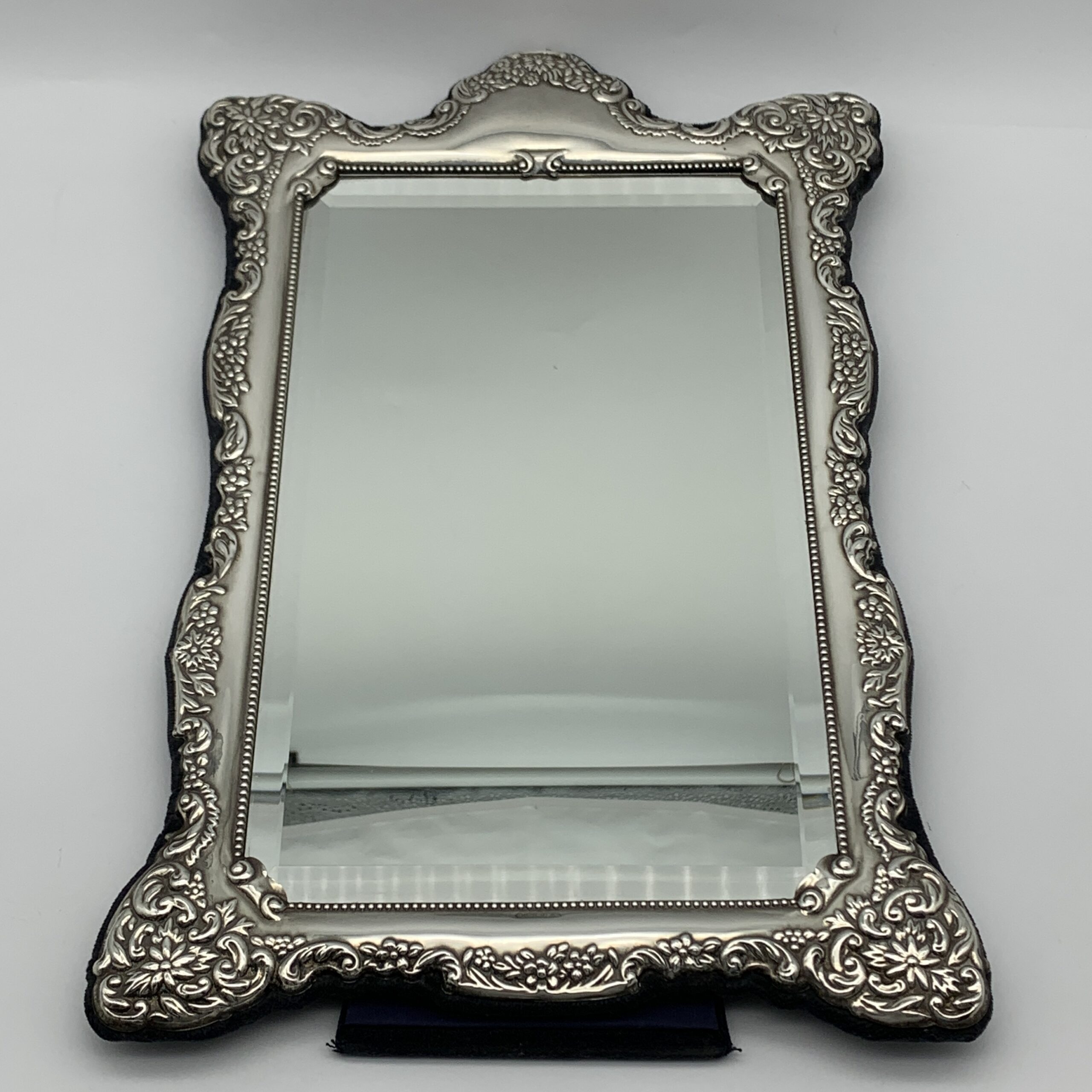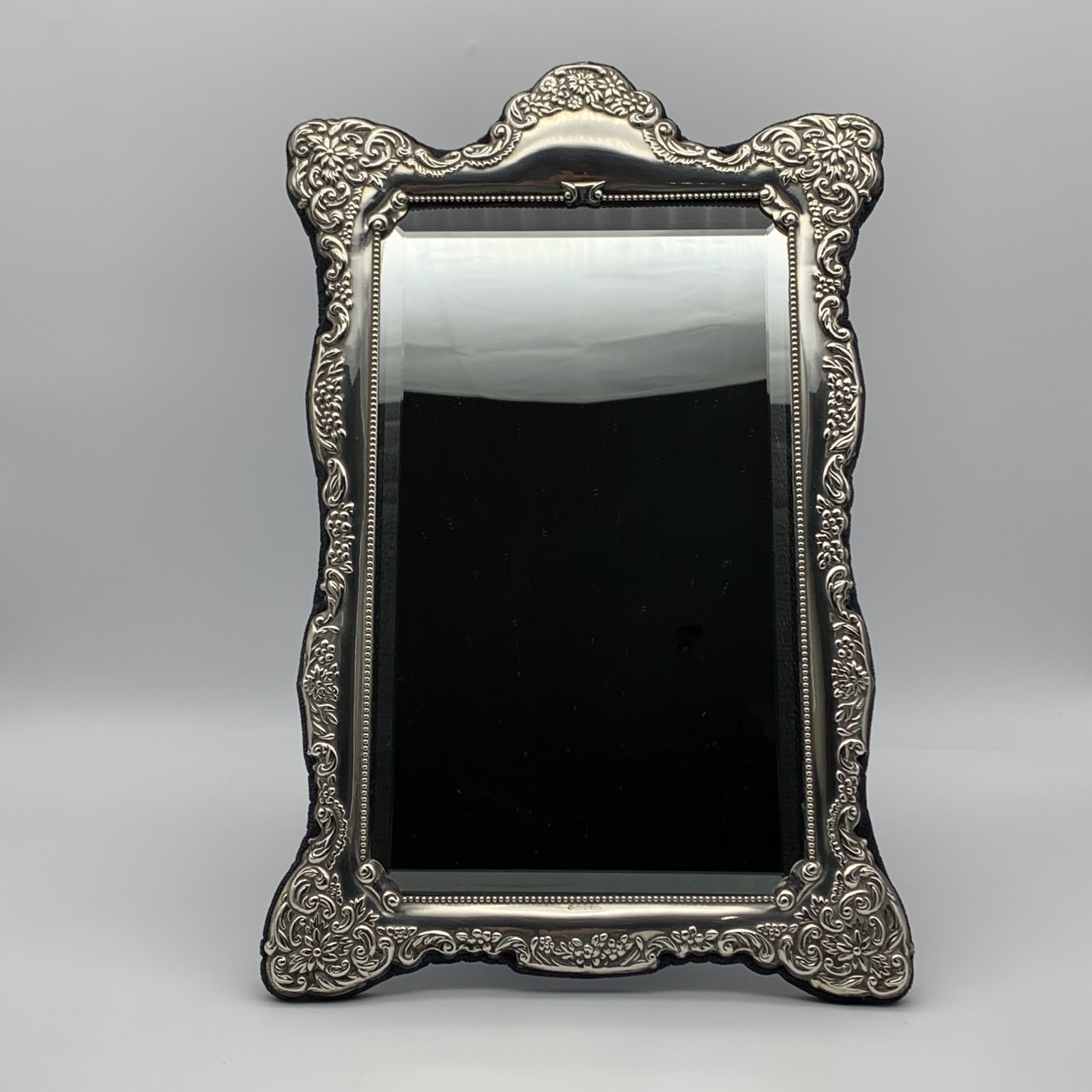This fabulous, fine quality, extra-large, sterling silver table mirror or photo frame, has a lovely shape and is beautifully decorated with embossed flowers and ‘C’ scrolls. It was produced in the year 2000 in Sheffield, England by silversmiths and retailers ‘Carr’s of Sheffield Ltd’ (RC) and can either be used as a mirror or a large photo frame, as it has a lovely, bevelled mirror insert and a piece of clear glass. This wonderful mirror or photo frame is in excellent condition with dark blue velvet, covering the back and easel backed stand. It stands 38cm high, with a width of 24,5cm and weighs 1,24kg. The window from the front can take a large photograph measuring 28cm x 17cm.