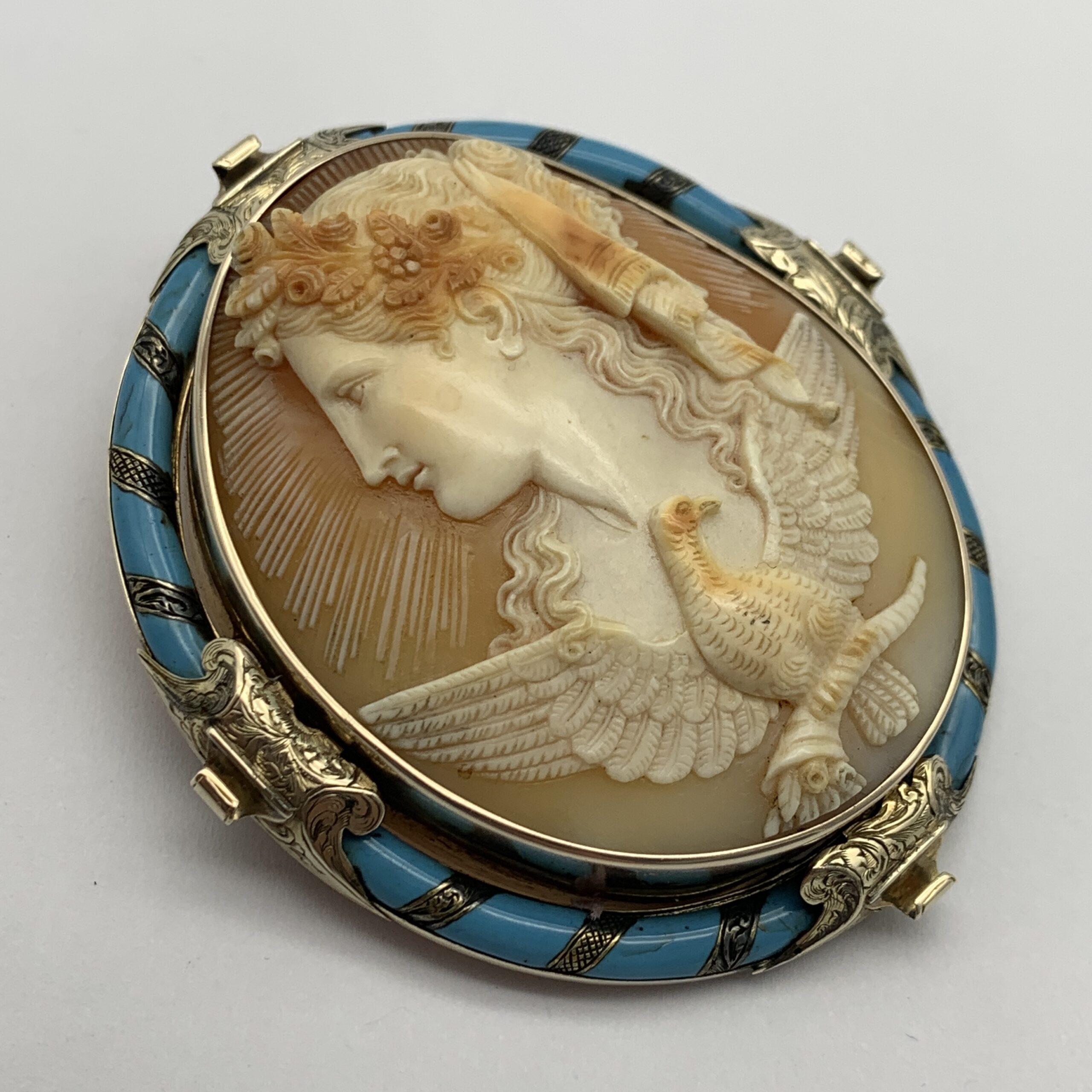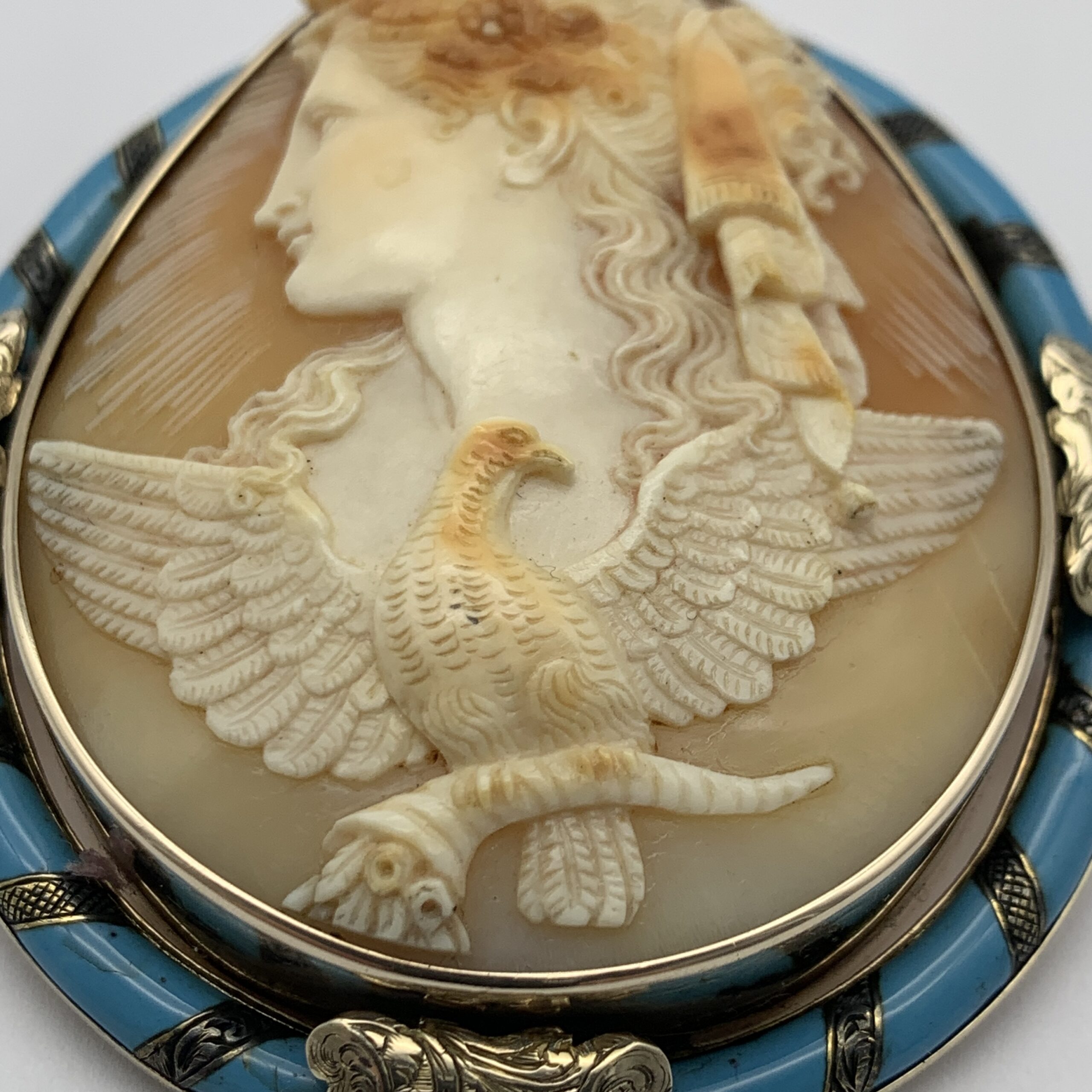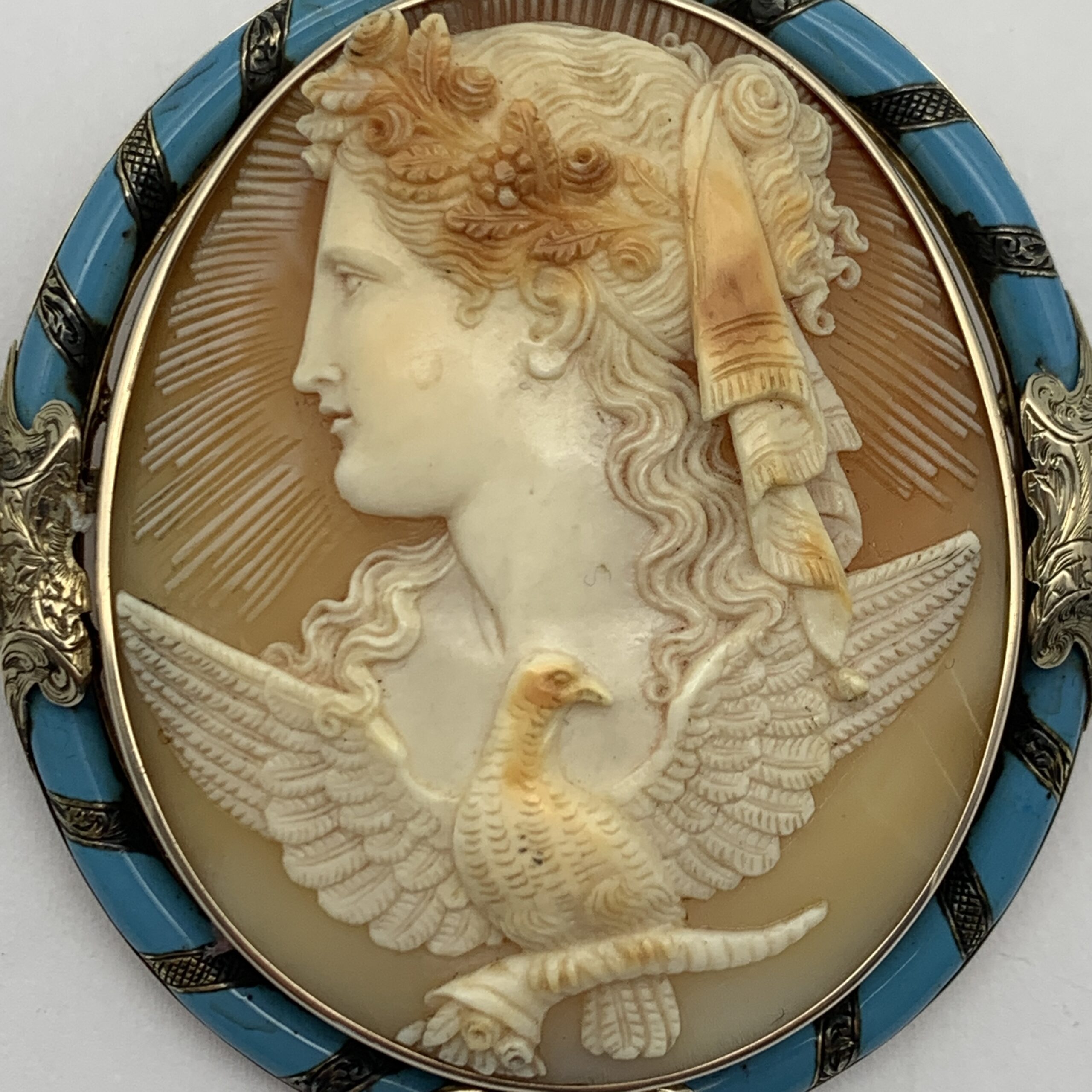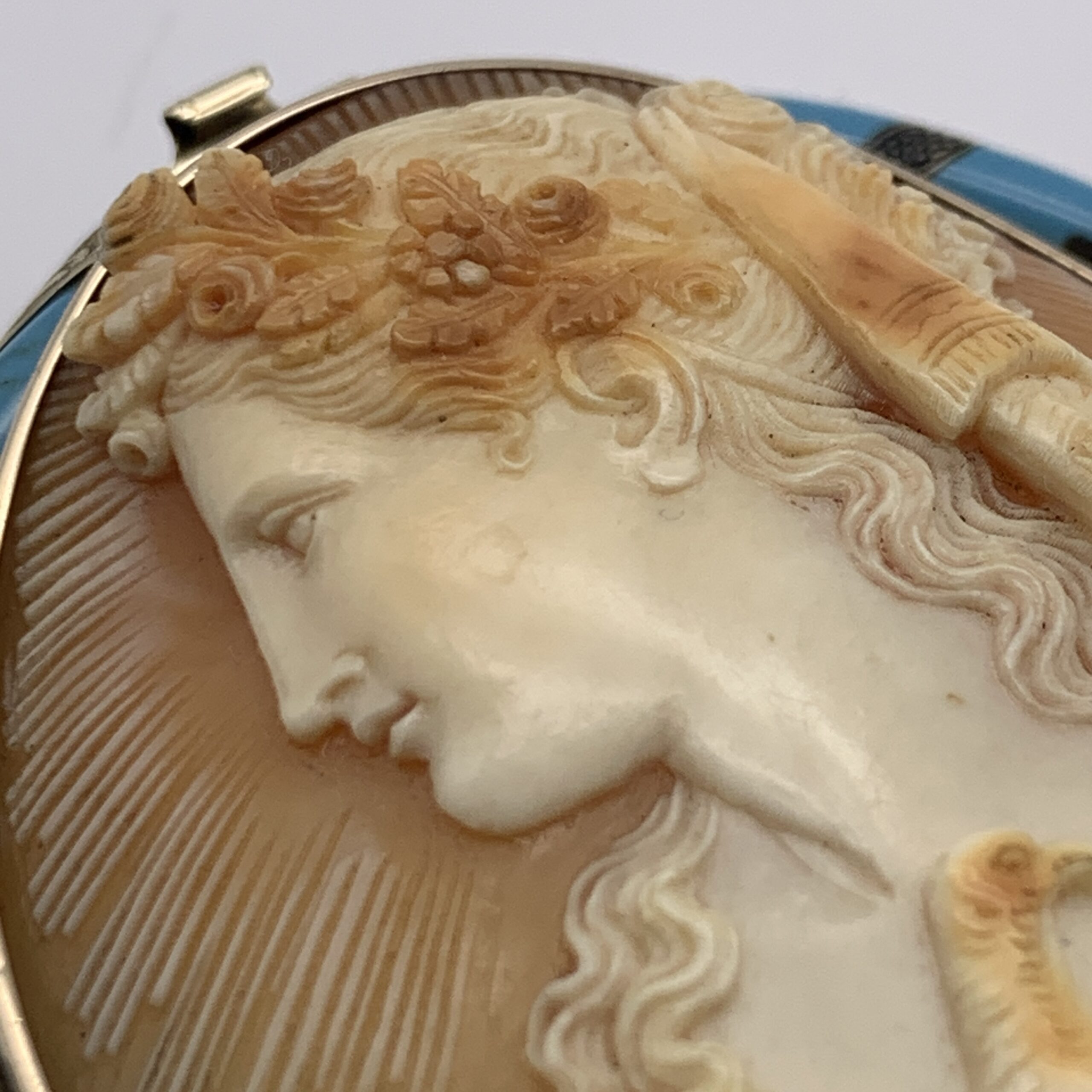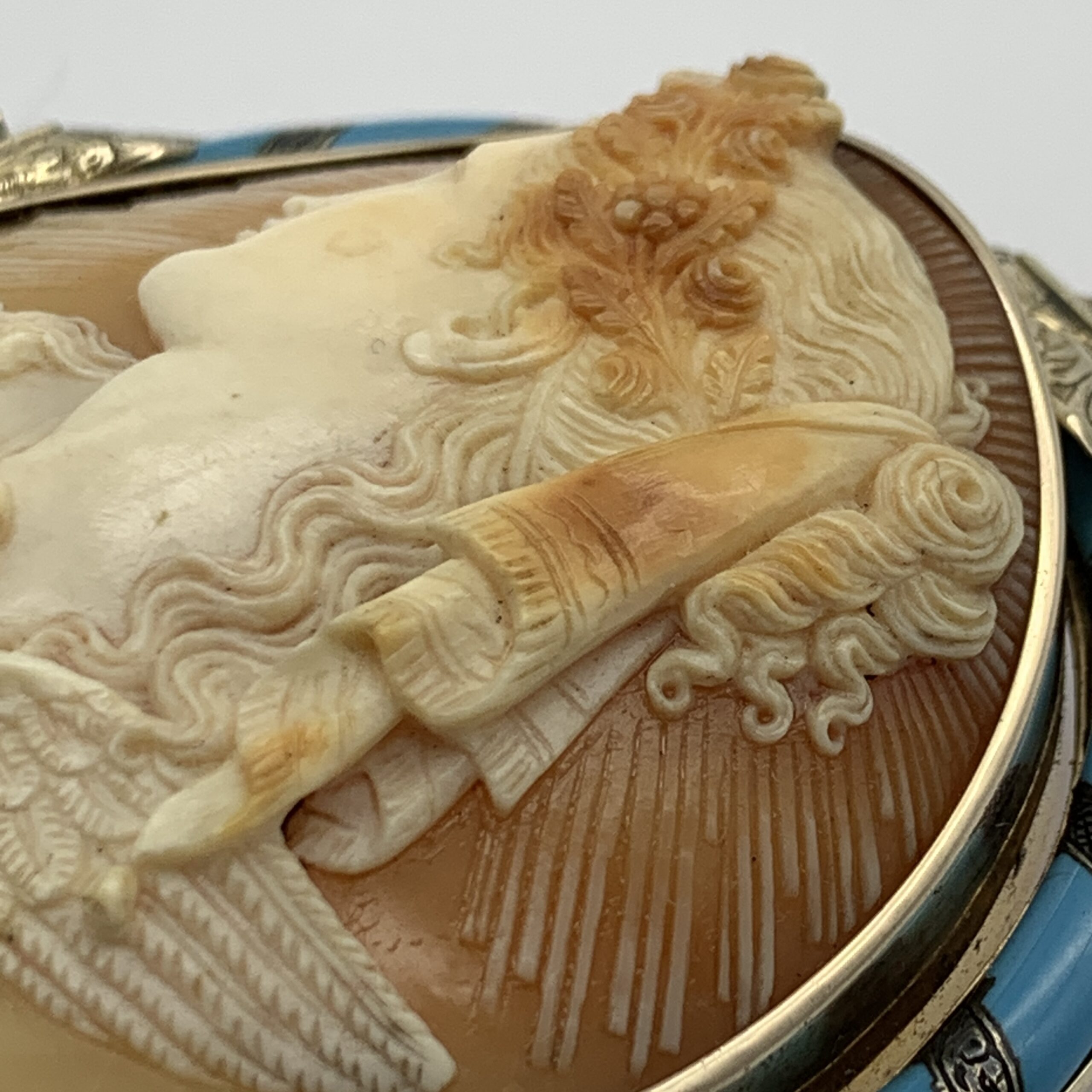 This stunning, large, antique, gold and enamelled cameo brooch, from the mid to late 1800’s is by far, the most impressive cameo brooch I’ve ever seen, and it comes complete with its original hinged case. It features a fabulous, large shell cameo, intricately hand-carved in relief with superb detail, depicting a left facing profile of ‘Eos’, the beautiful Greek ‘Goddess of Dawn’ (Aurora in Roman). Here she is portrayed wearing her rose wreath in her hair with sun rays around her head, symbolizing the beginning of a new day and a dove, holding a cornucopia of fruit with his wings outstretched. The cameo is mounted in a magnificent, 9ct solid gold frame with a blue enamelled, rope like border with four hand-engraved gold scrolls evenly spaced. The brooch was made by ‘Thomas West’, a Victorian goldsmith and jeweller trading between the 1840’s and the 1860’s, from 18 Ludgate Street in London, England and other than a tiny piece of enamel missing from the frame, it’s in great condition with a secure pin and comes with its original leatherette hinged case, stamped on the inside silk, ‘T. WEST Goldsmith, 18 Ludgate Street, near St Pauls’. The brooch measures 7cm x 6,5cm and weighs 37g.