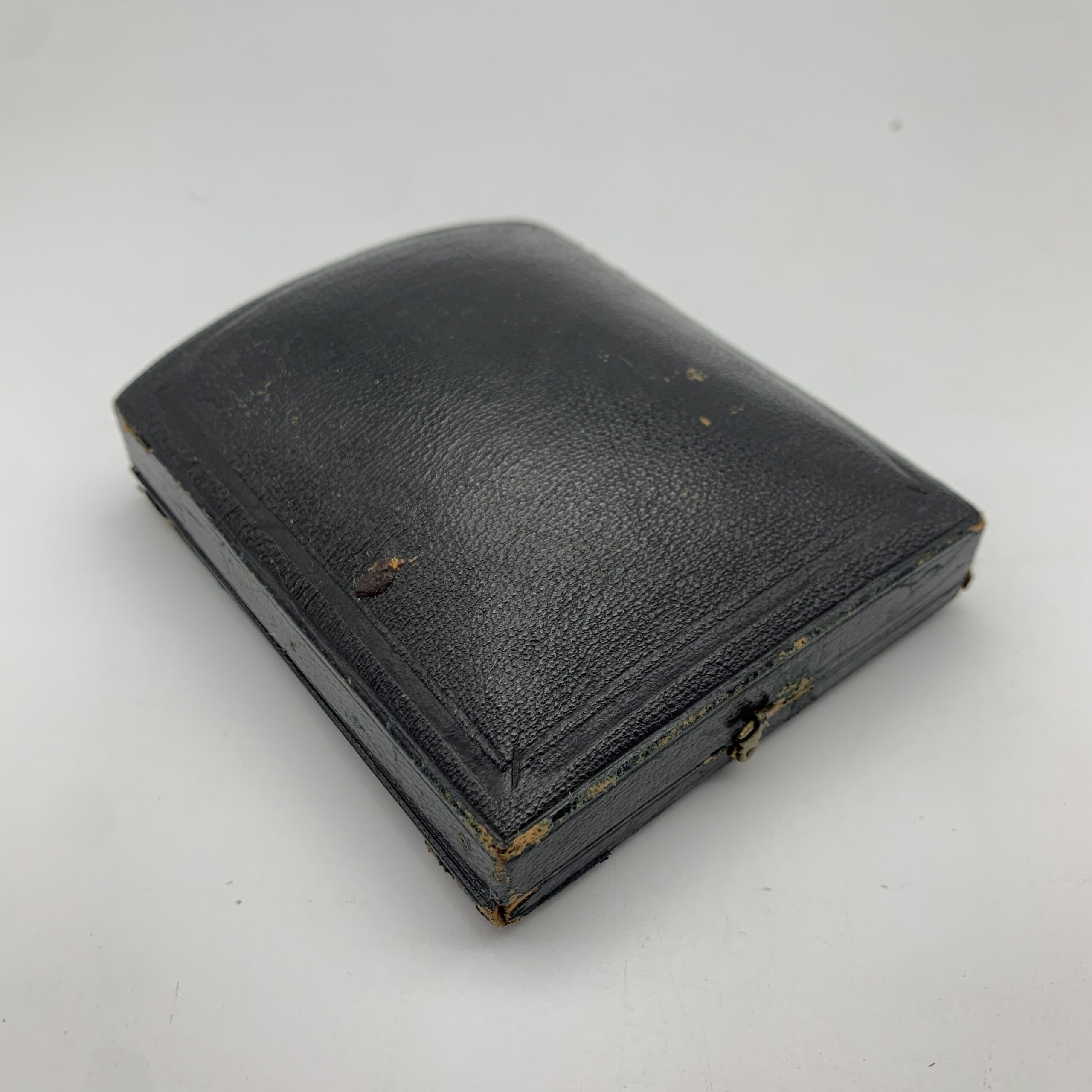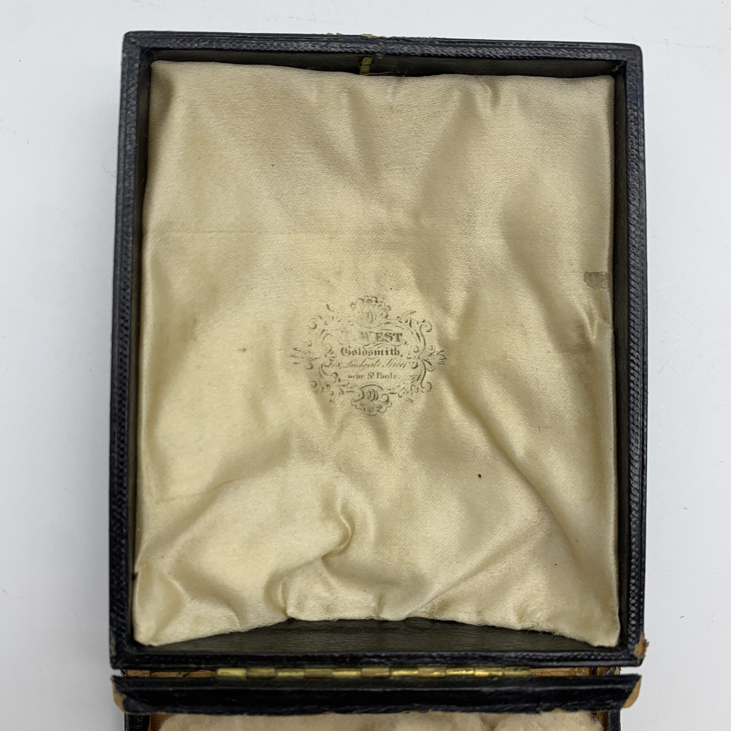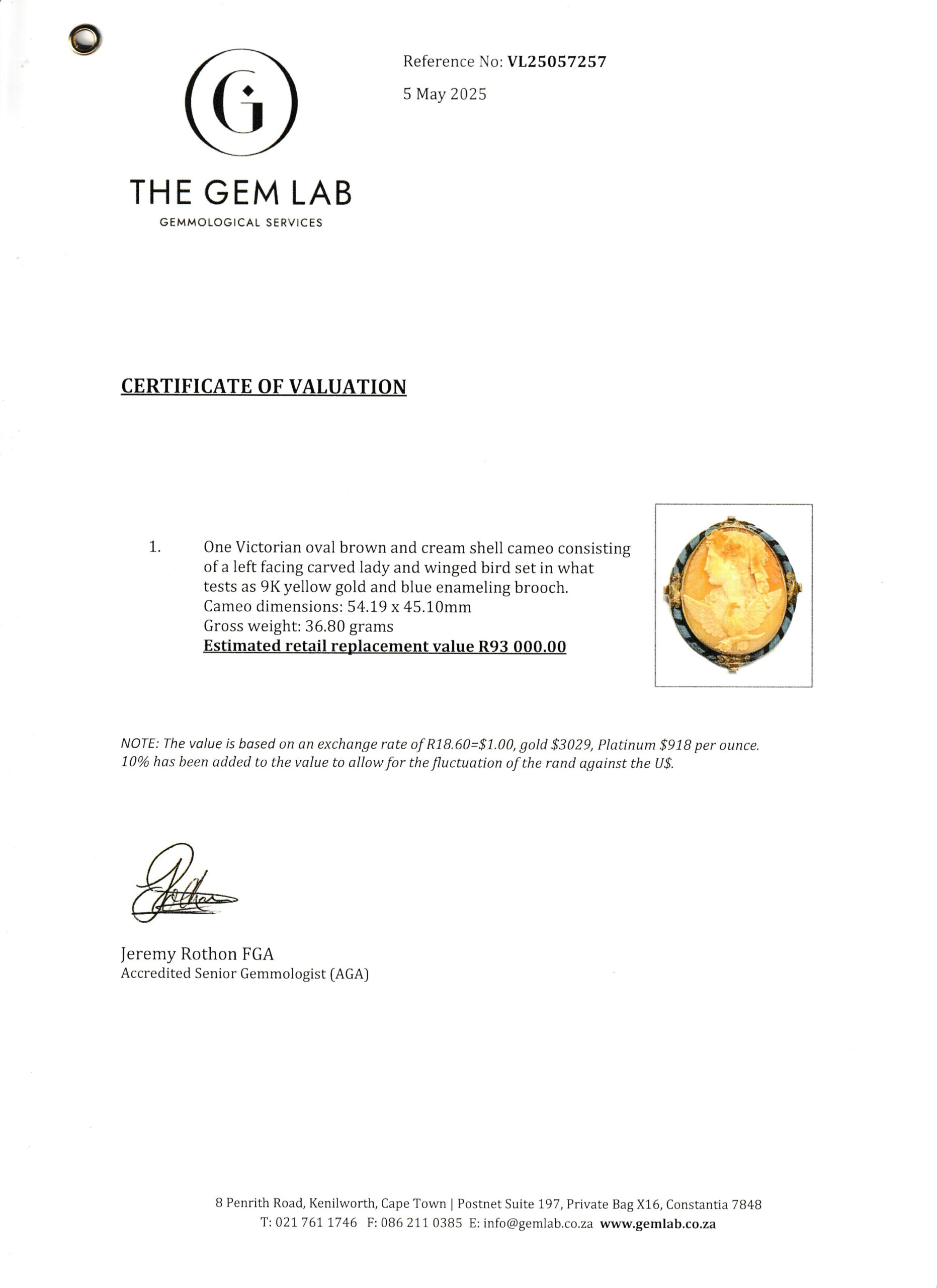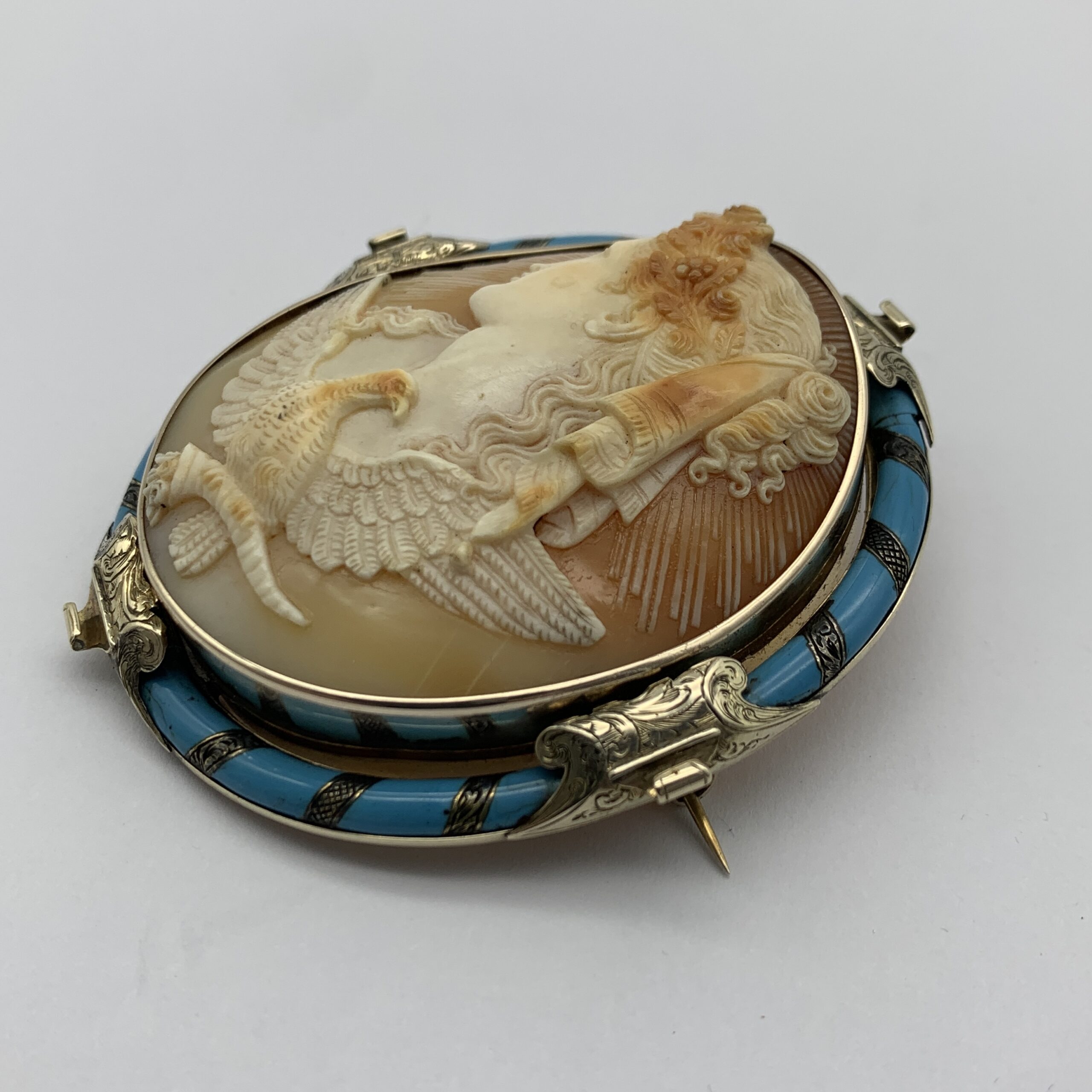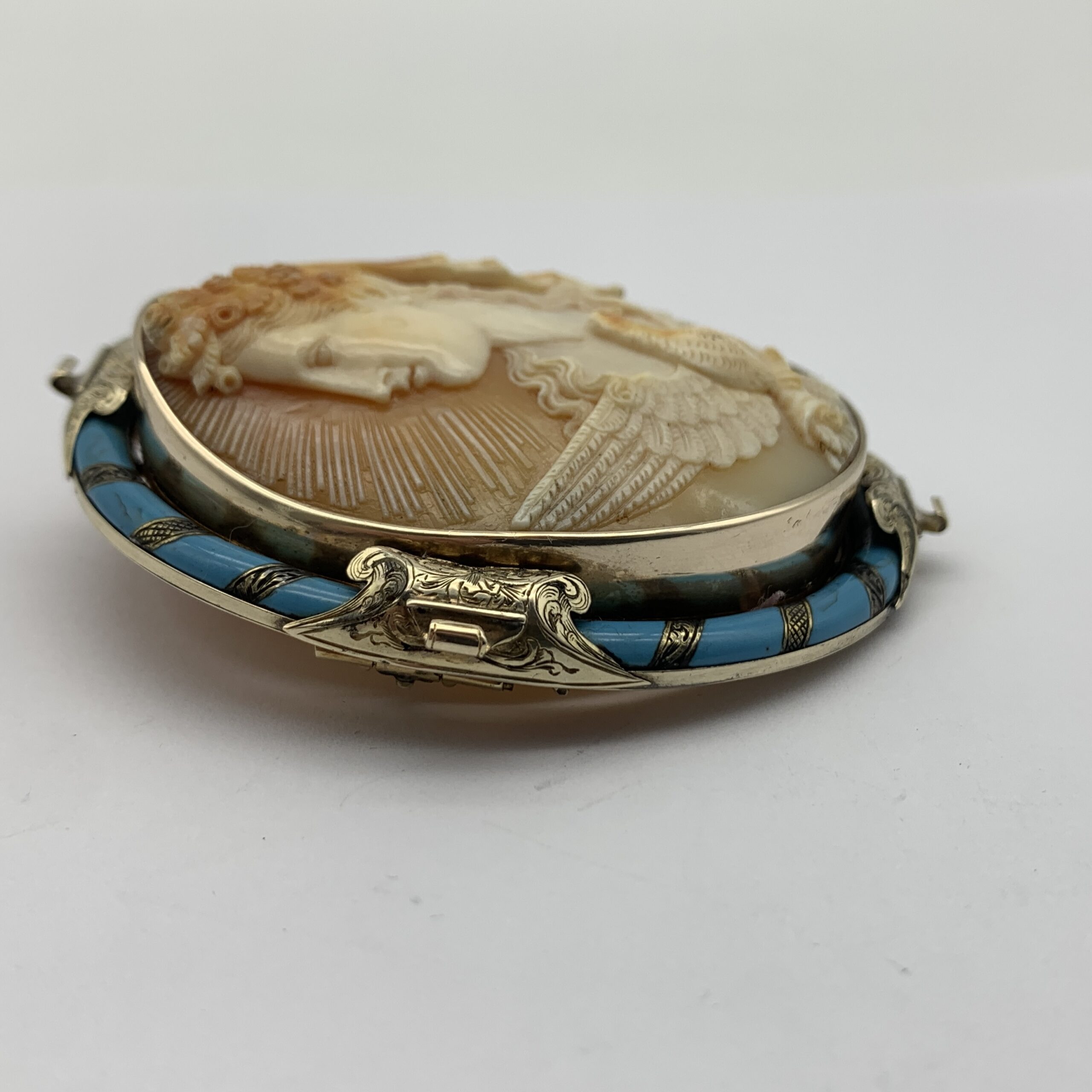 This stunning, large, antique, gold and enamelled cameo brooch, from the mid to late 1800’s is by far, the most impressive cameo brooch I’ve ever seen, and it comes complete with its original hinged case. It features a fabulous, large shell cameo, intricately hand-carved in relief with superb detail, depicting a left facing profile of ‘Eos’, the beautiful Greek ‘Goddess of Dawn’ (Aurora in Roman). Here she is portrayed wearing her rose wreath in her hair with sun rays around her head, symbolizing the beginning of a new day and a dove, holding a cornucopia of fruit with his wings outstretched. The cameo is mounted in a magnificent, 9ct solid gold frame with a blue enamelled, rope like border with four hand-engraved gold scrolls evenly spaced. The brooch was made by ‘Thomas West’, a Victorian goldsmith and jeweller trading between the 1840’s and the 1860’s, from 18 Ludgate Street in London, England and other than a tiny piece of enamel missing from the frame, it’s in great condition with a secure pin and comes with its original leatherette hinged case, stamped on the inside silk, ‘T. WEST Goldsmith, 18 Ludgate Street, near St Pauls’. The brooch measures 7cm x 6,5cm and weighs 37g.