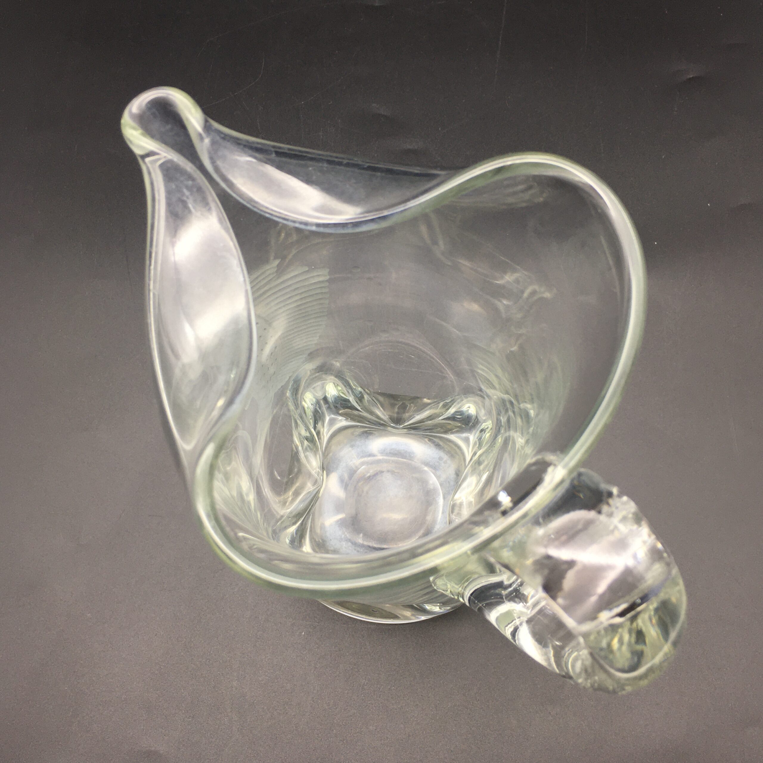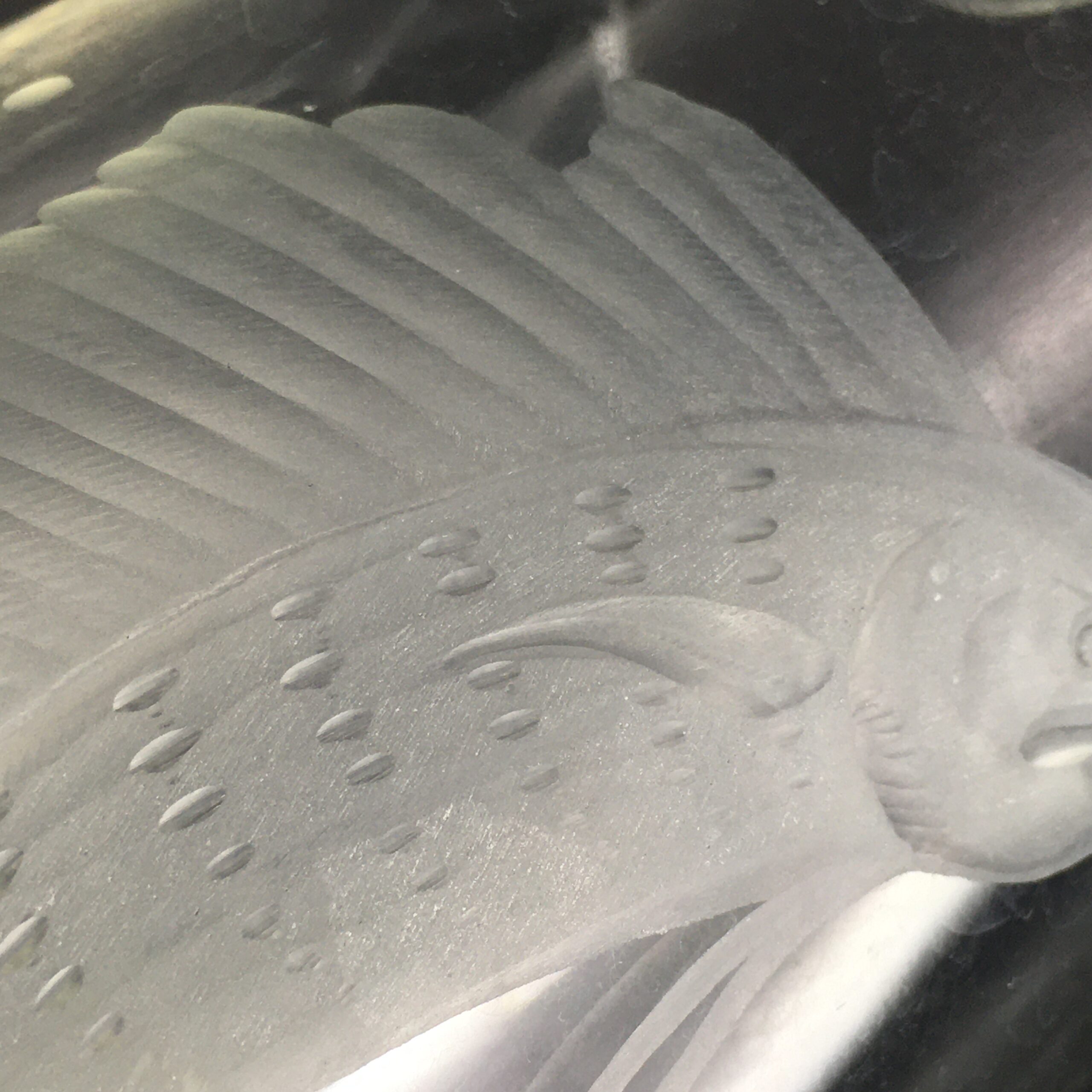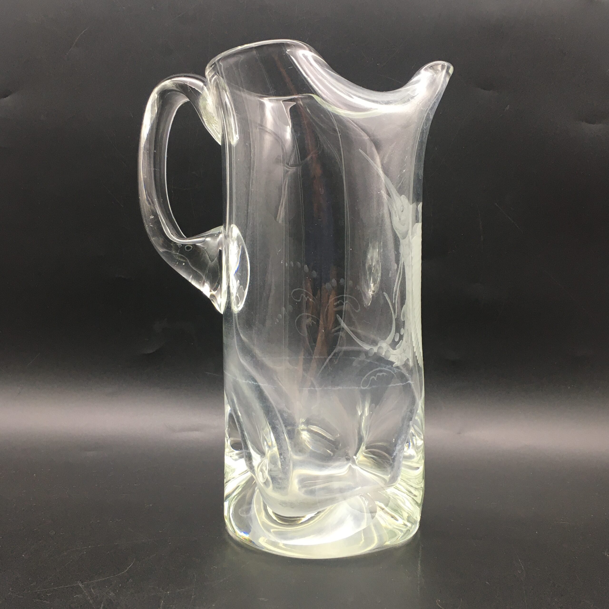 This early, large, crystal water jug from the 1960/70’s, has a large ‘sailfish or Marlin’ beautifully hand engraved on it. I’m not sure where this jug was made, but it was part of a small collection of wildlife and ‘Rowland Ward’ crystal. It has an unusual tall shape with the top folded in to form a spout and catch the ice and deep dimple like features near the base. It appears to have been hand-blown as there’s a polished pontil mark on the base. The jug stands 23,5cm high, with a base diameter of 10cm, a spout to handle measurement of 16cm and it weighs 1,33kg. Other than a slight milkiness towards the base, it’s in excellent condition.