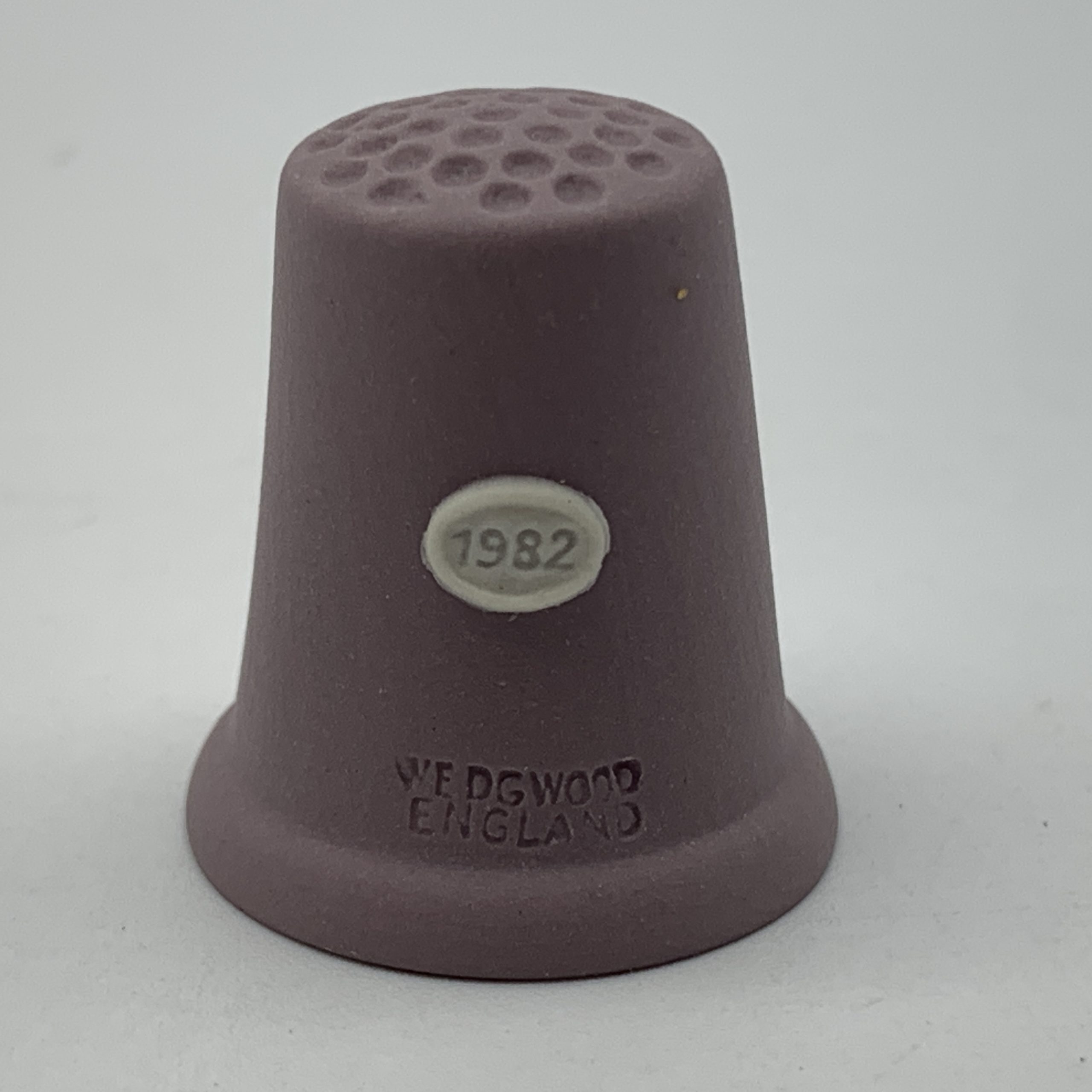 This early, lilac (scarce colour) Wedgwood jasperware thimble is in excellent condition and features a Robin resting on a branch of Holy on the front, with the date ‘1982’ on the back, all in white relief and is impressed ‘WEDGWOOD, ENGLAND’ underneath.