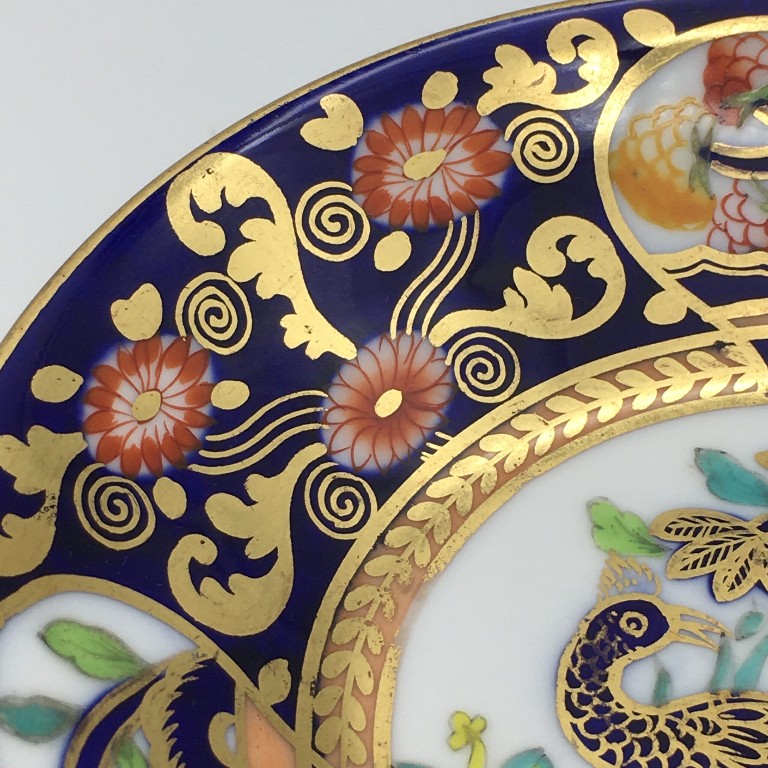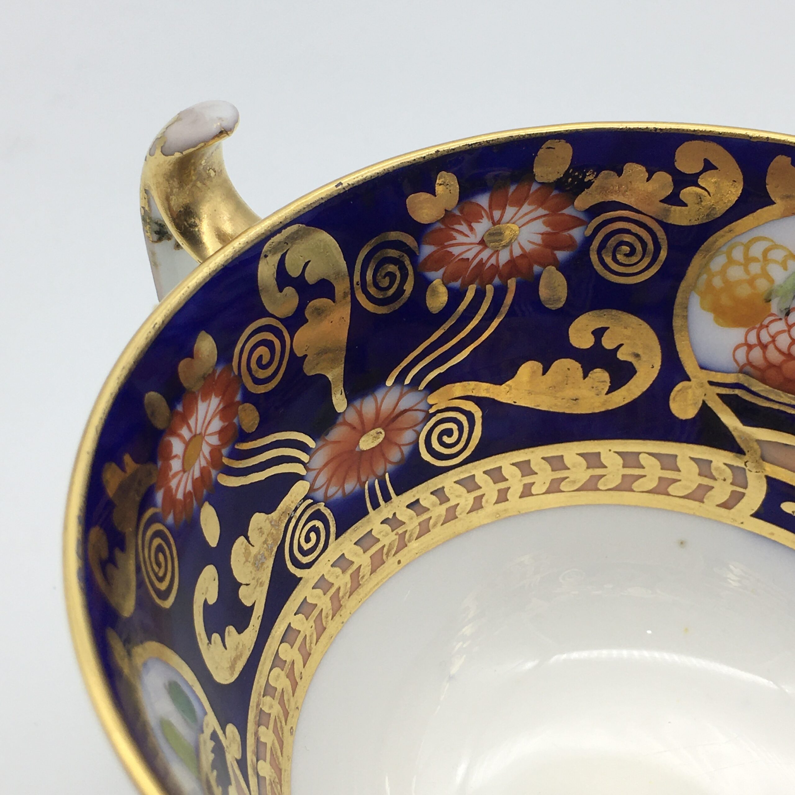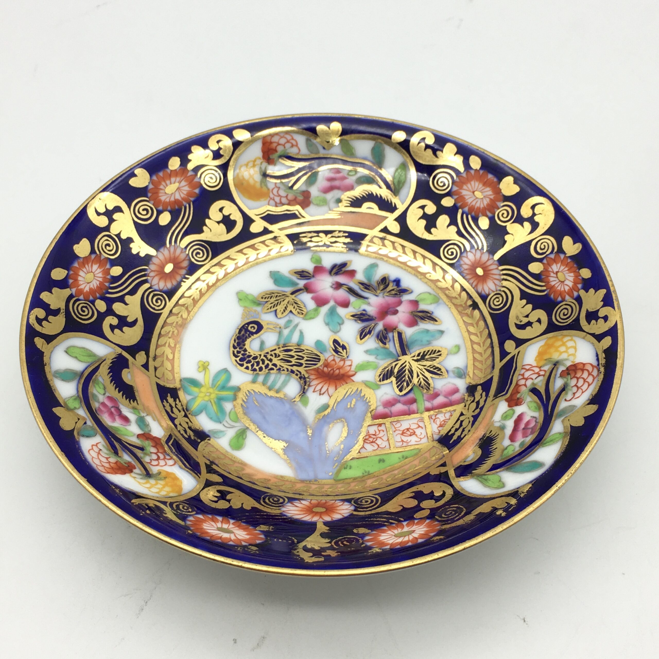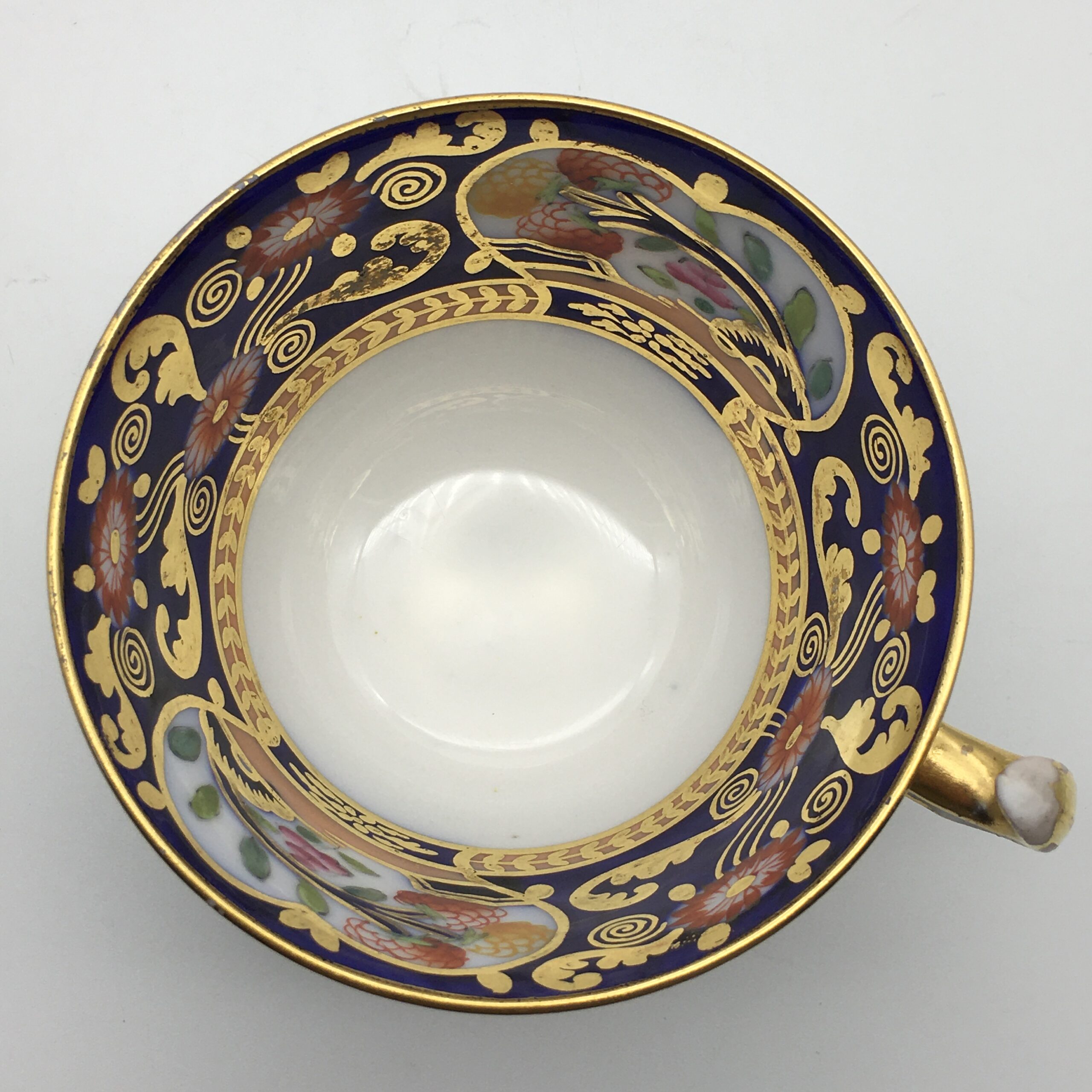 This lovely, very early, Copeland Spode china teacup and saucer, from the late 1800’s, is beautifully hand-painted, featuring birds and flowers against a cobalt blue background, with lots of gold decoration to both pieces. The teacup has the early Copeland china ‘seal mark’ that was used in 1893, and the saucer has an early impressed mark ‘F’ over ‘84’, dating this to ‘February 1884’. Other than some minor wear in places, to the gilding, this duo is in great condition. The cup stands 5,8cm high, with the saucer having a diameter of 14,4cm.