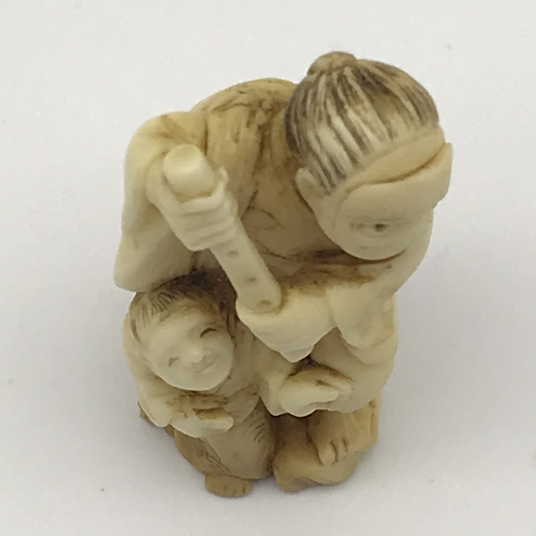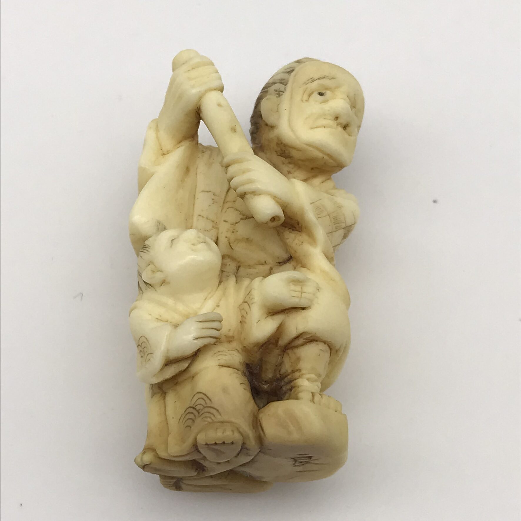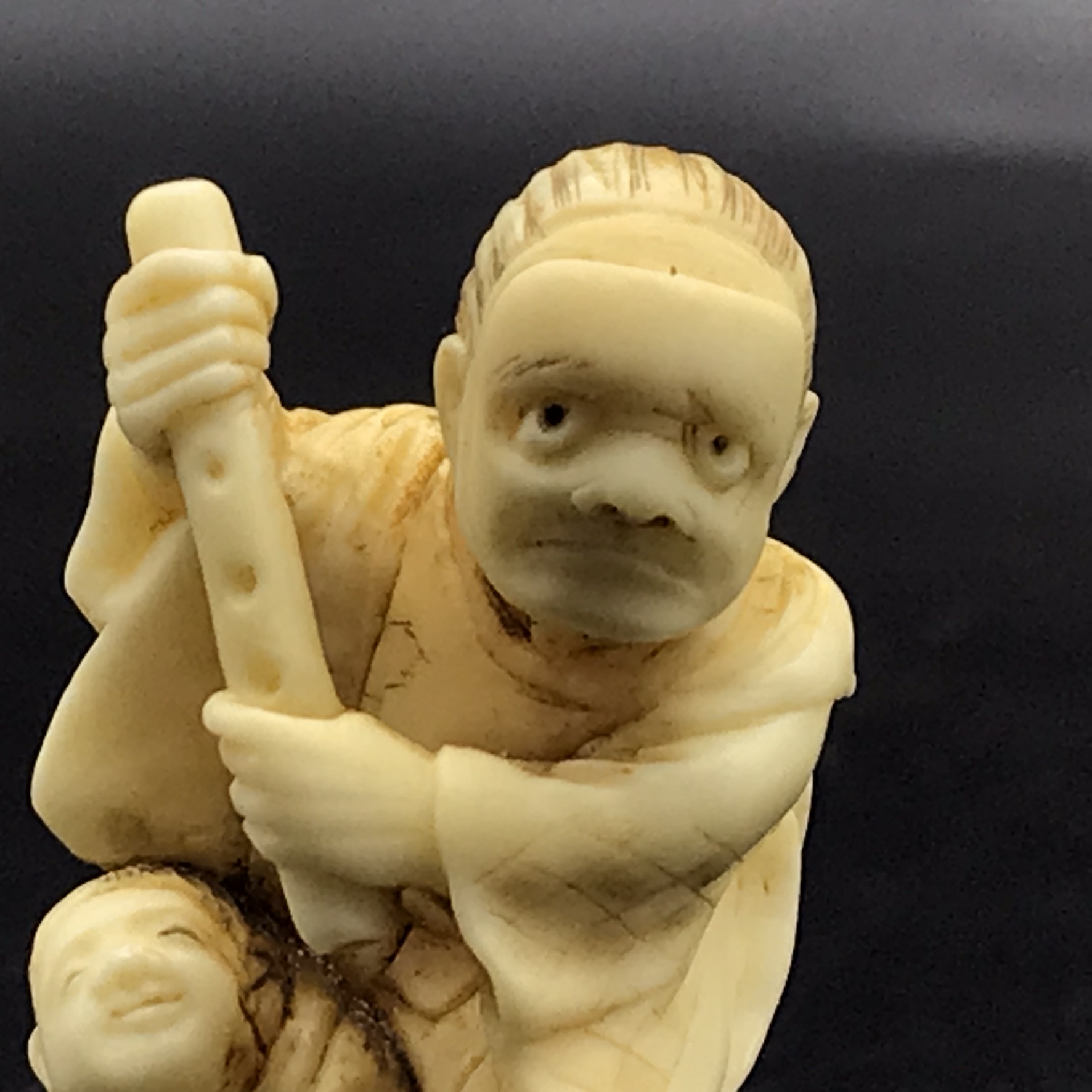 This wonderful, scarce, antique, Japanese ‘Netsuke’ features a lady wearing a mask and holding what appears to be a flute, with a child standing between her legs. I’m not sure what the material is, but it’s been beautifully hand carved with amazing detail, and is signed on the base. This lovely piece is in excellent condition and measures 43mm x 23mm.