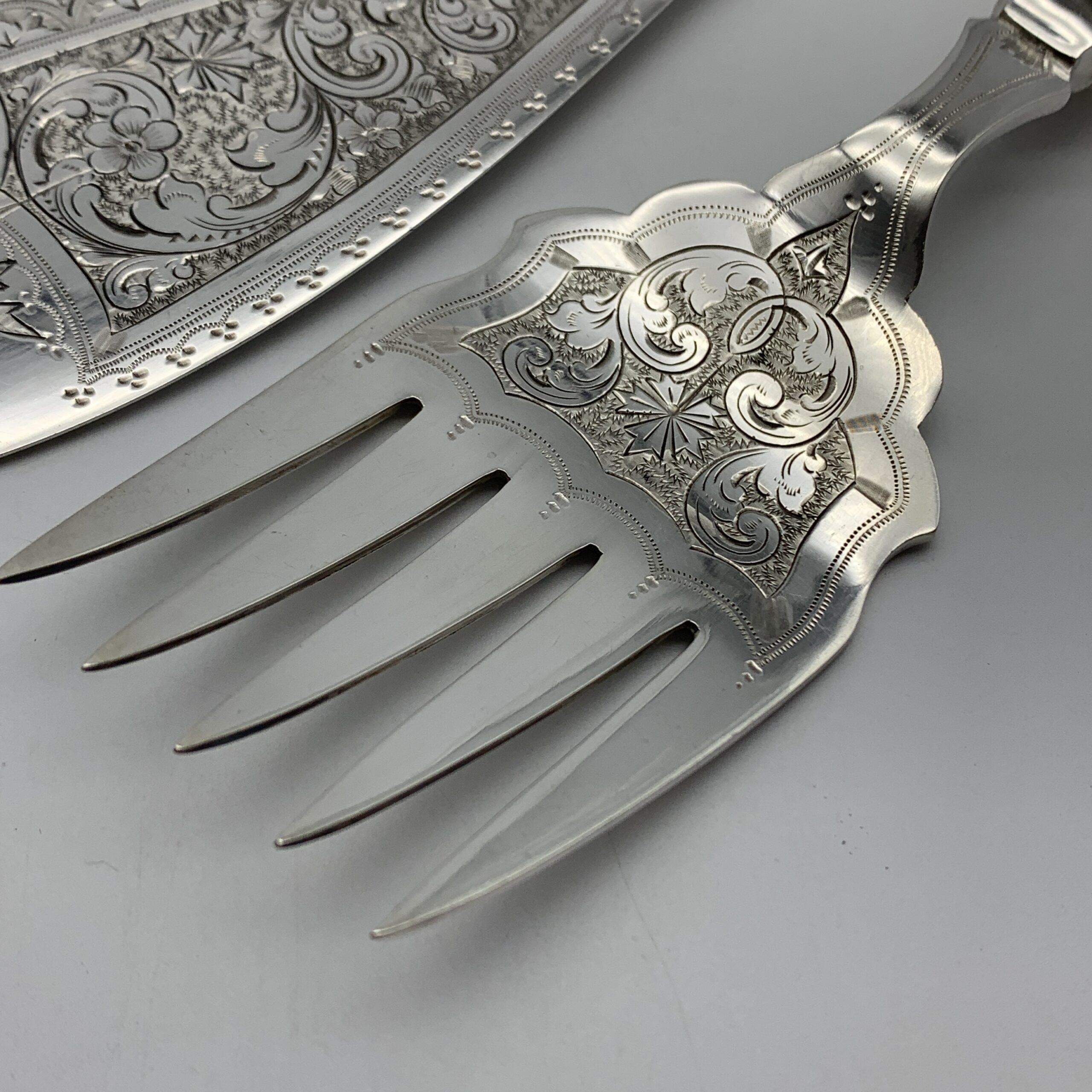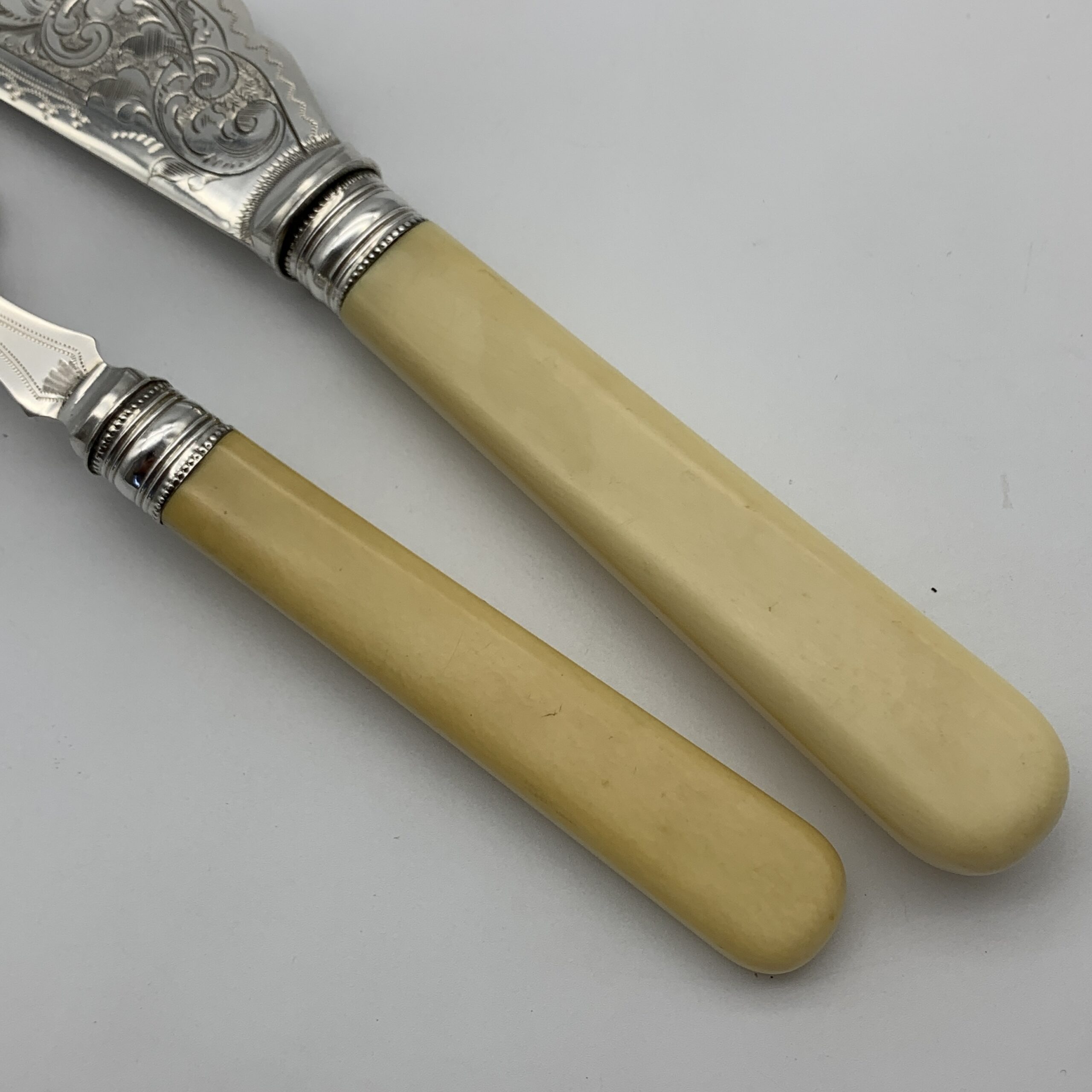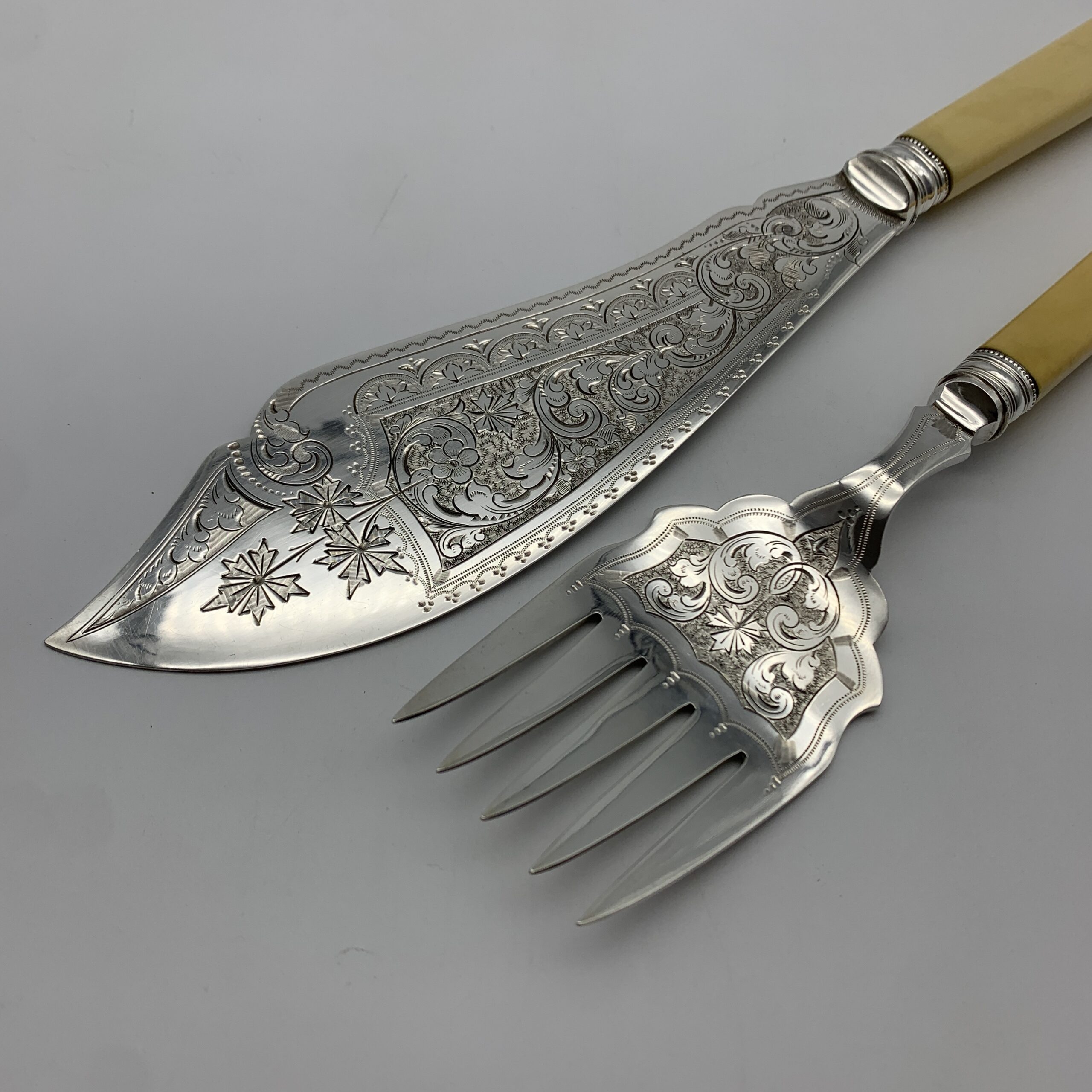This lovely pair of antique, silver-plated fish servers, with ‘bone’ handles, are beautifully engraved on both pieces with fine floral scroll work. Each piece has silver plated hallmarks with the factory stamp ‘W.A.H X S’ for the makers, possibly ‘W.A. Humphries Ltd’ (Walter Albert) from Birmingham, England. This lovely quality, fish serving knife and fork are in wonderful condition and appear to have never been used. The knife measures 32cm in length, the fork 23cm and together they way 290g.
