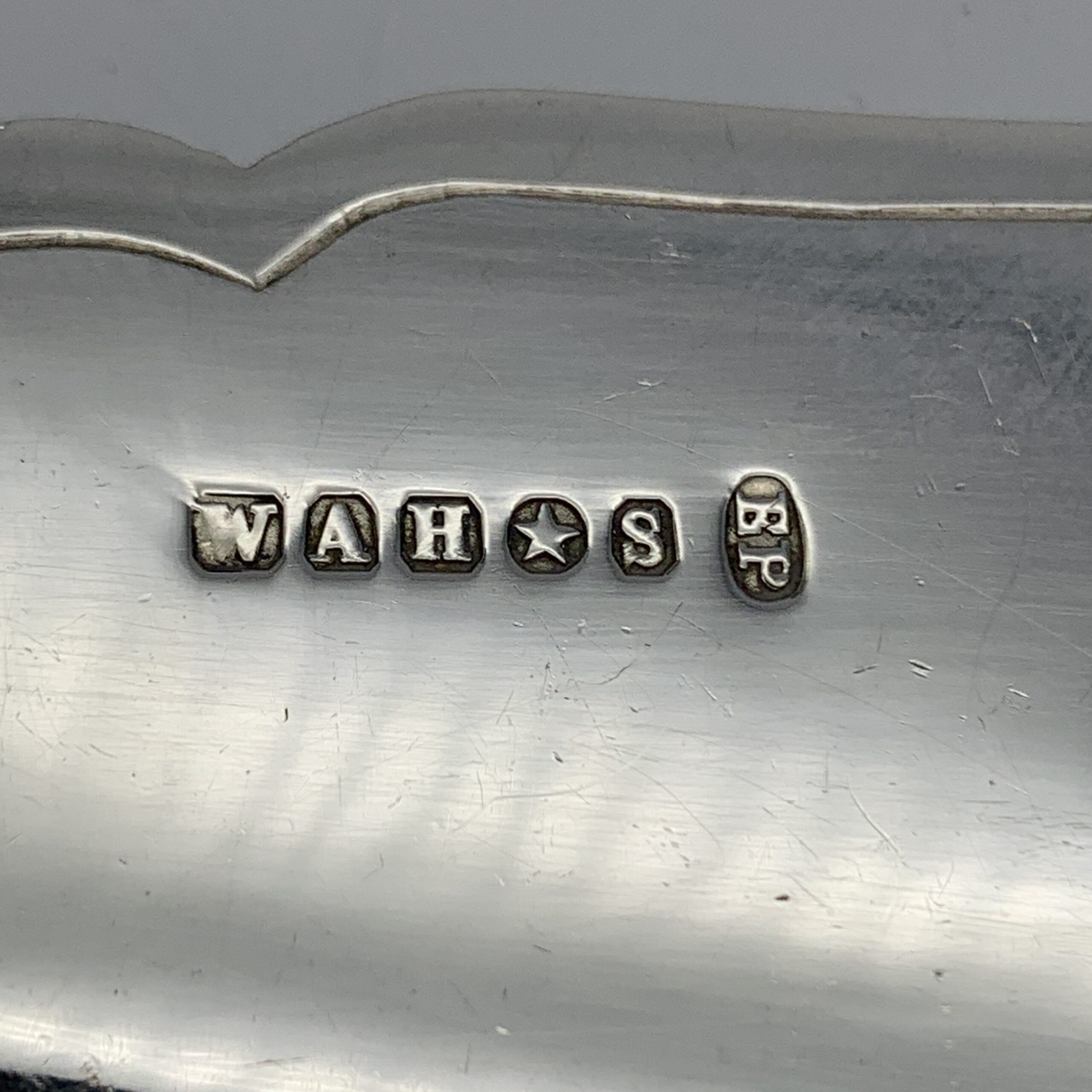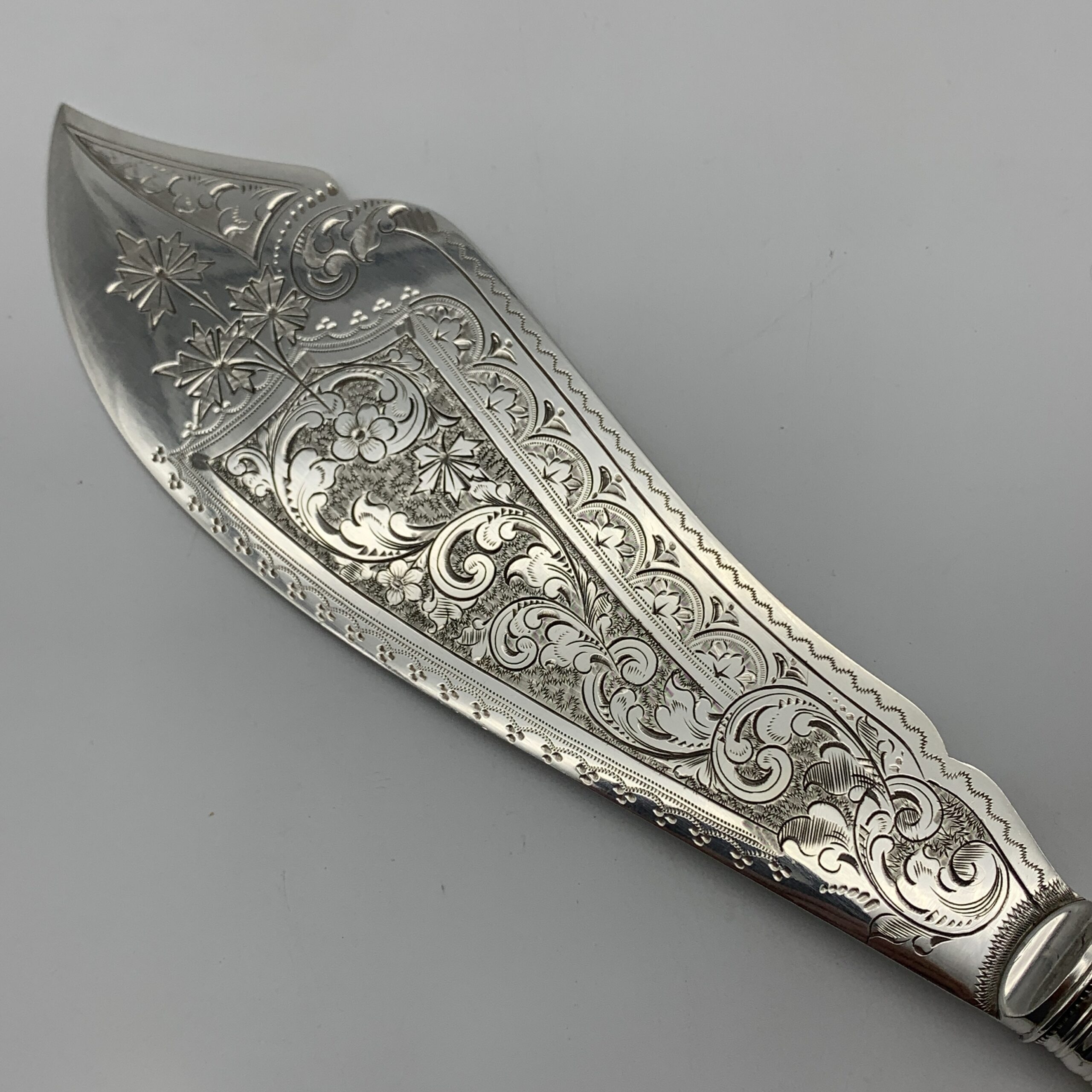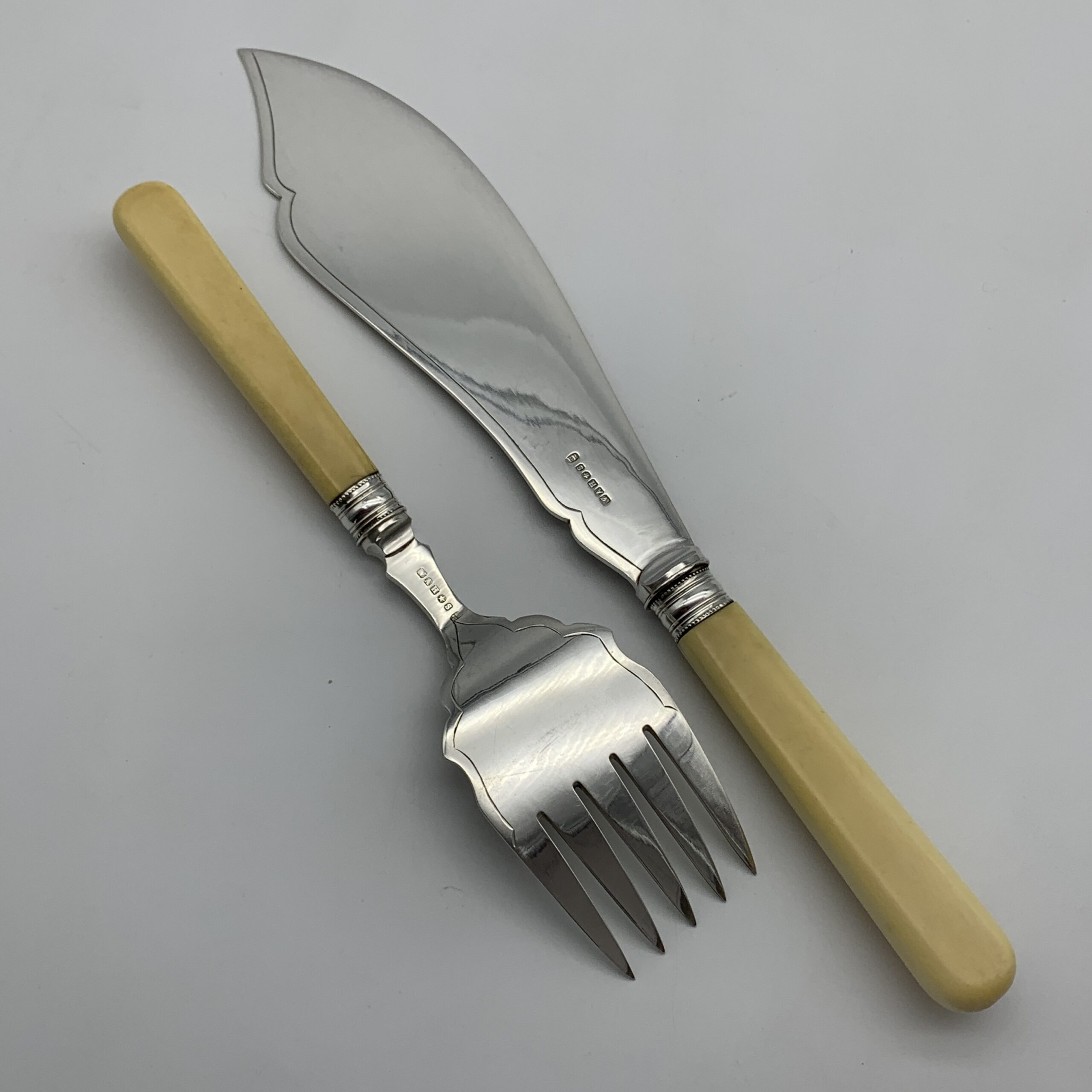 This lovely pair of antique, silver-plated fish servers, with ‘bone’ handles, are beautifully engraved on both pieces with fine floral scroll work. Each piece has silver plated hallmarks with the factory stamp ‘W.A.H X S’ for the makers, possibly ‘W.A. Humphries Ltd’ (Walter Albert) from Birmingham, England. This lovely quality, fish serving knife and fork are in wonderful condition and appear to have never been used. The knife measures 32cm in length, the fork 23cm and together they way 290g.