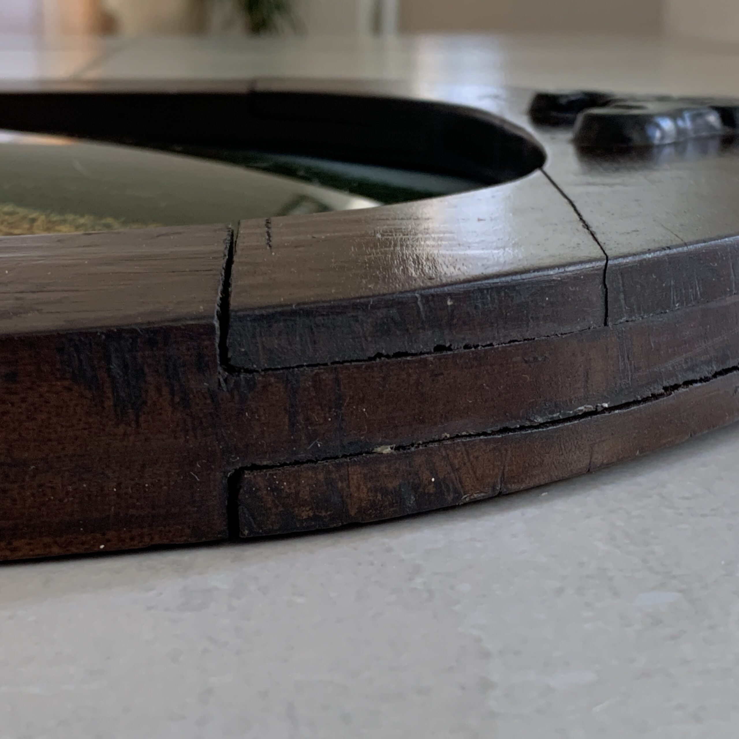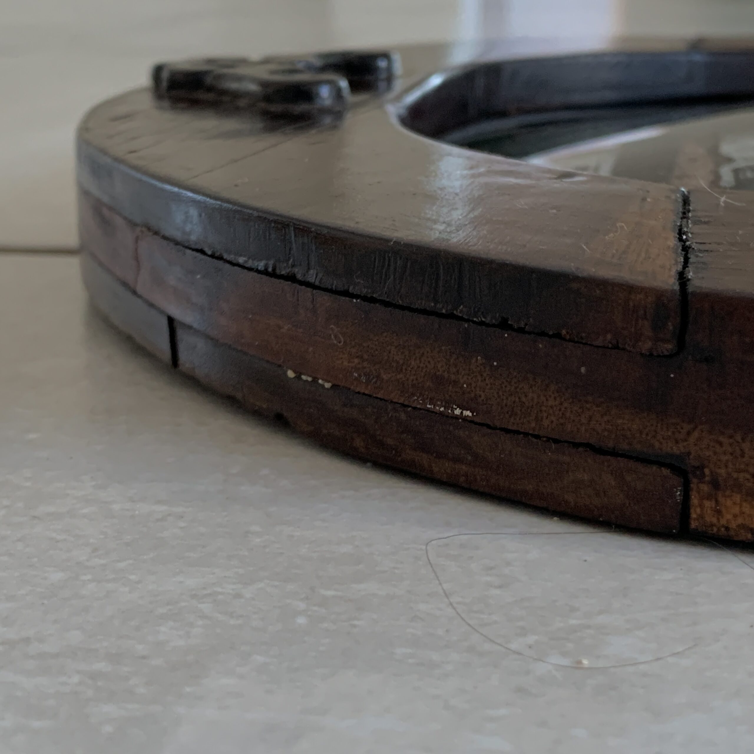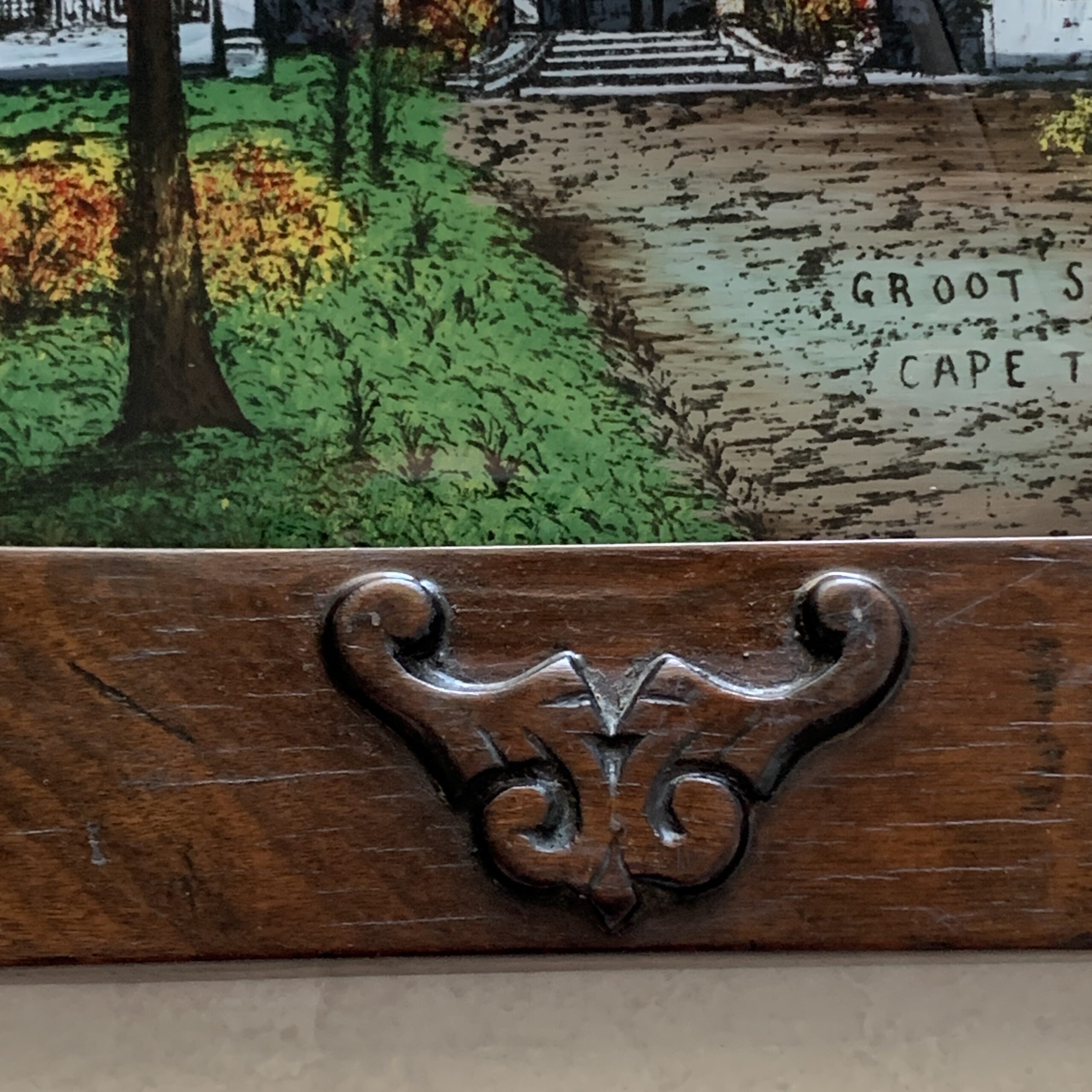 This wonderful, South African, antique reverse painting on convex glass of ‘Groote Schuur' is mounted in a solid, dark wooden oval frame with lovey hand carved detail. It’s a beautifully painted picture of the entrance to ‘Groote Schuur’ with the gardens, featuring lovely detail and colour. ‘Groote Schuur’ (Dutch for ‘big shed’) was the Cape Town estate originally owned by the ‘Dutch East India Company’ in 1657 and was bought in 1893 by Cecil Rhodes. From 1910 to 1984, it was the official Cape residence of the Prime Ministers of South Africa and is now a museum which is open to the public. This lovely painting and frame is in great condition and measures 61cm x 40cm and weighs 3,2kg.