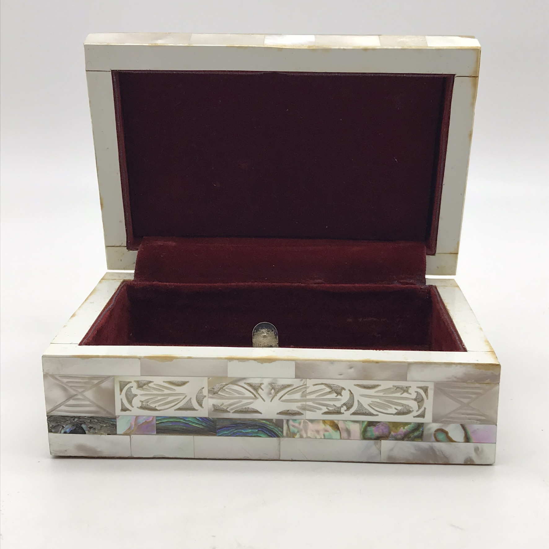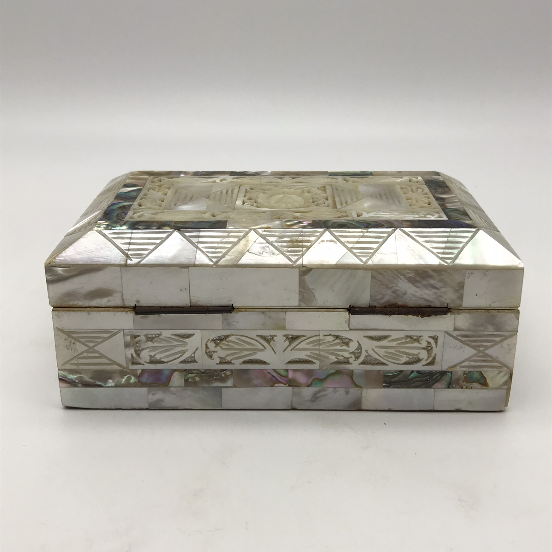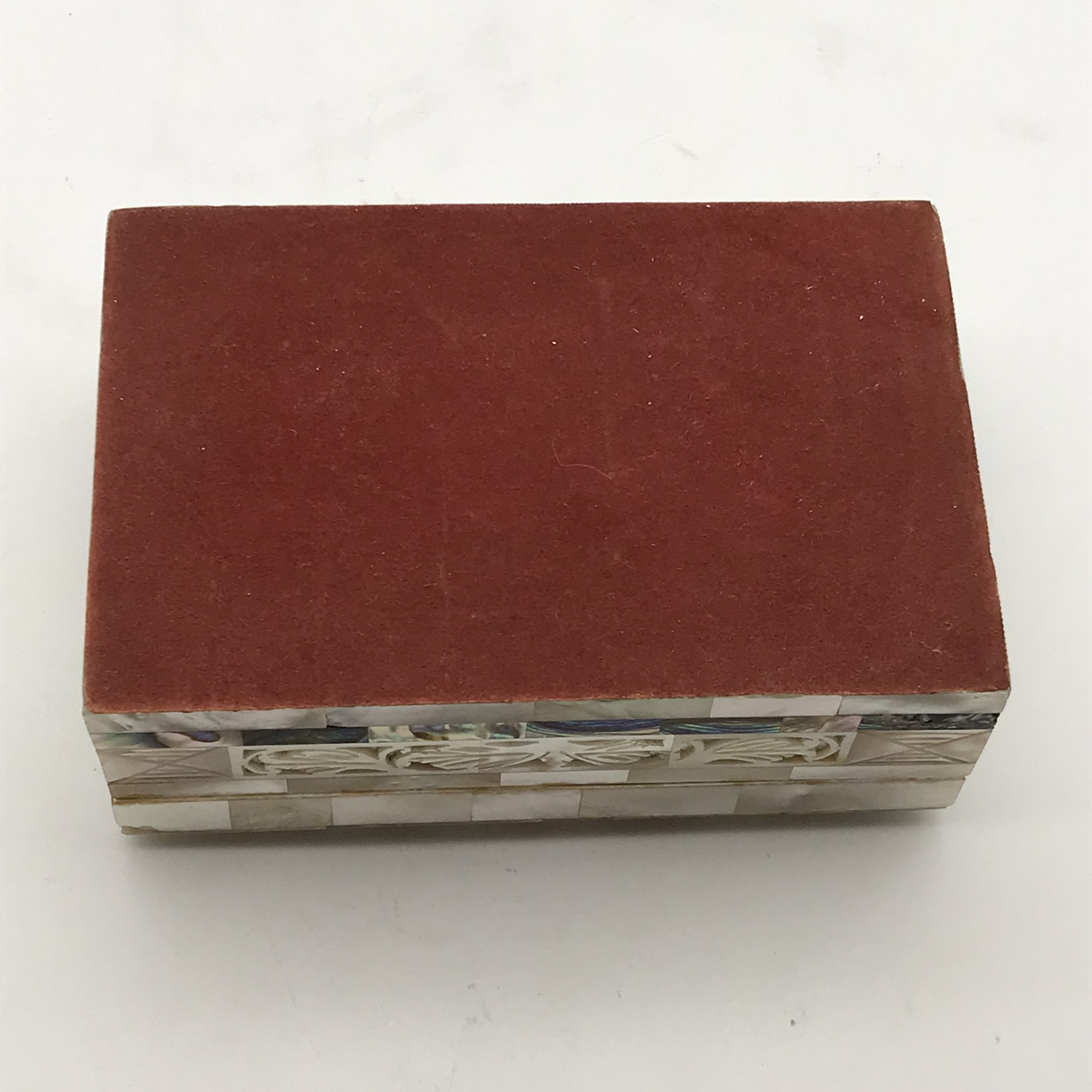 This superb, early, small, very well-made jewellery box is entirely decorated with ‘mother of pearl’ pieces, some of which have beautiful cut-out or pierced patterns. It is rectangular in shape with a domed hinged lid, which clips shut, and its interior is lined with a red felt. This lovely box is in excellent condition and would be ideal for jewellery or trinkets on a dressing table. It measures 12,3cm x 8cm, stands 5cm high and weighs 207g.