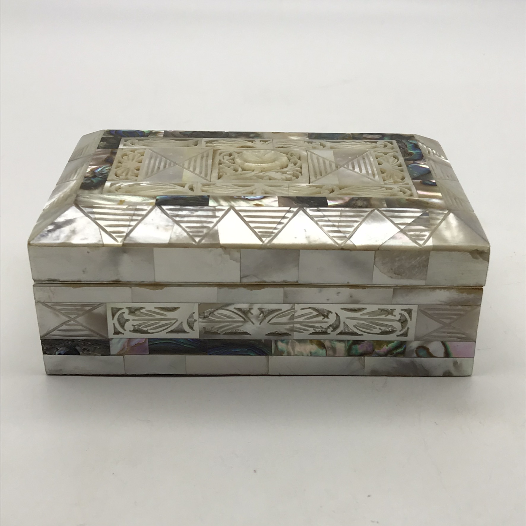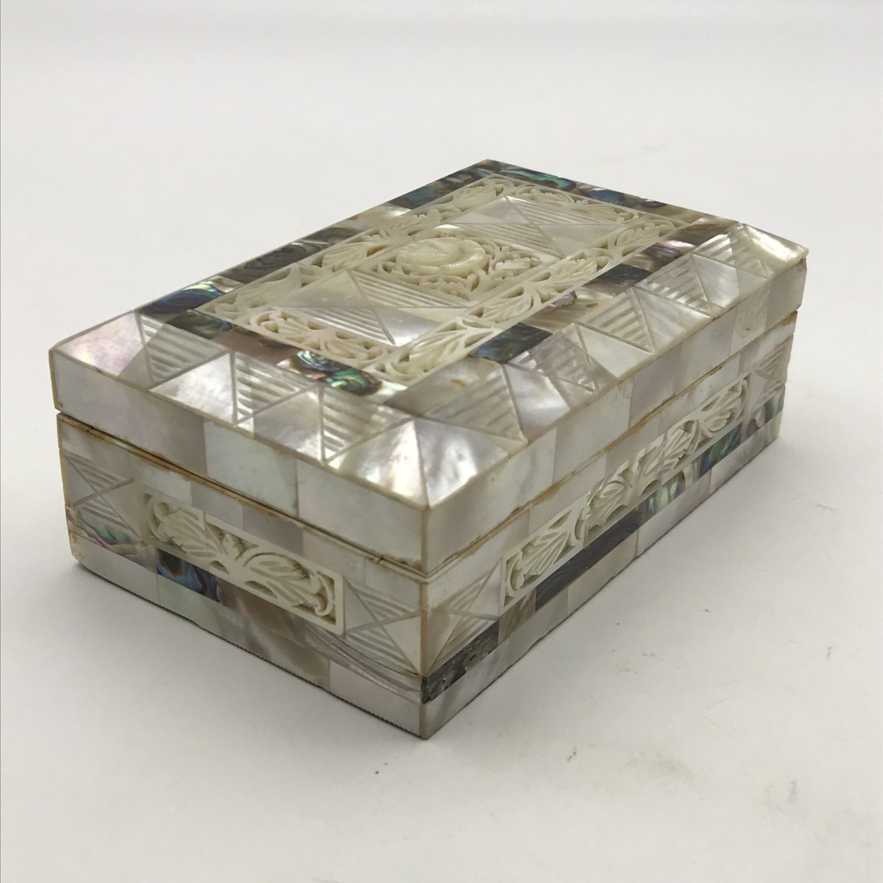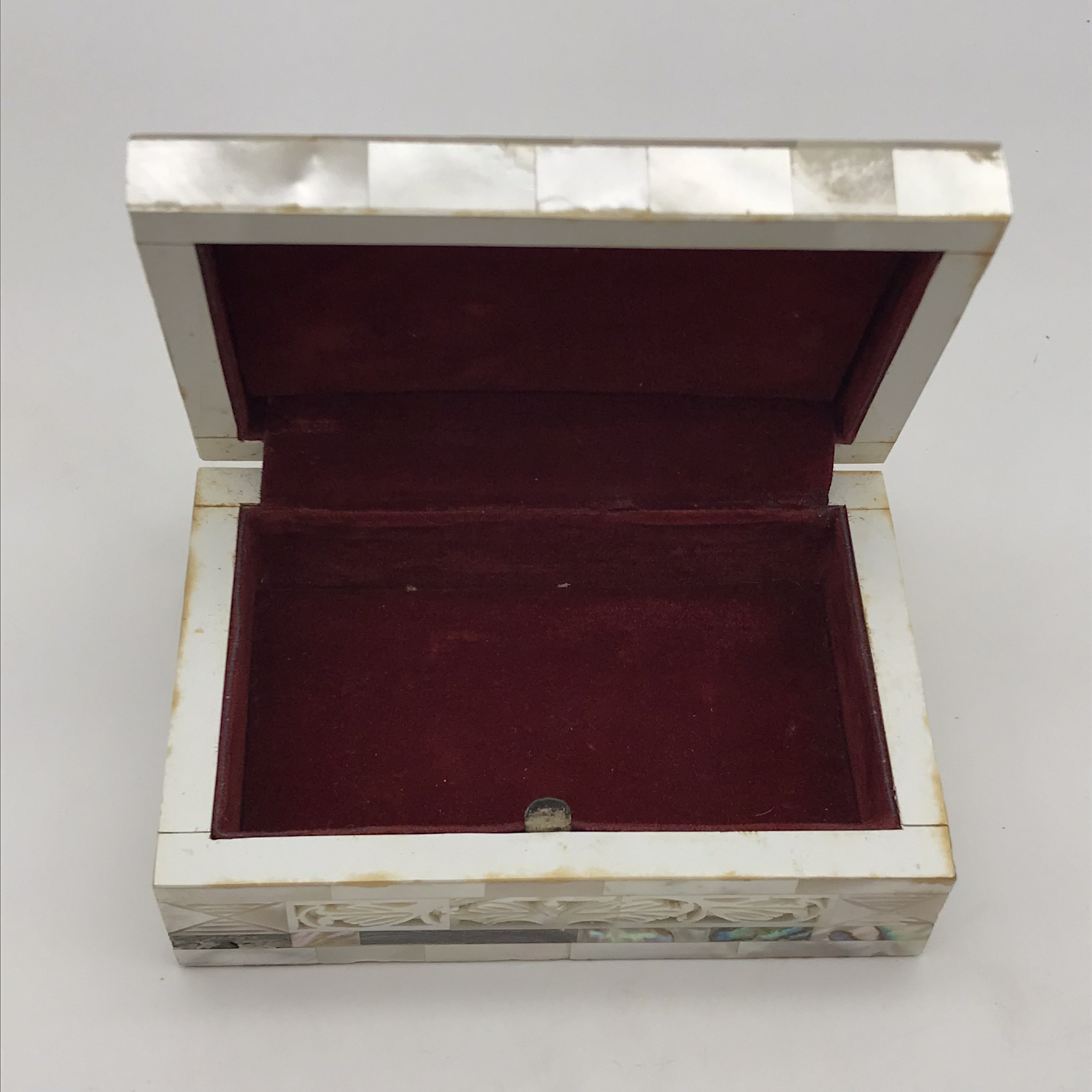 This superb, early, small, very well-made jewellery box is entirely decorated with ‘mother of pearl’ pieces, some of which have beautiful cut-out or pierced patterns. It is rectangular in shape with a domed hinged lid, which clips shut, and its interior is lined with a red felt. This lovely box is in excellent condition and would be ideal for jewellery or trinkets on a dressing table. It measures 12,3cm x 8cm, stands 5cm high and weighs 207g.