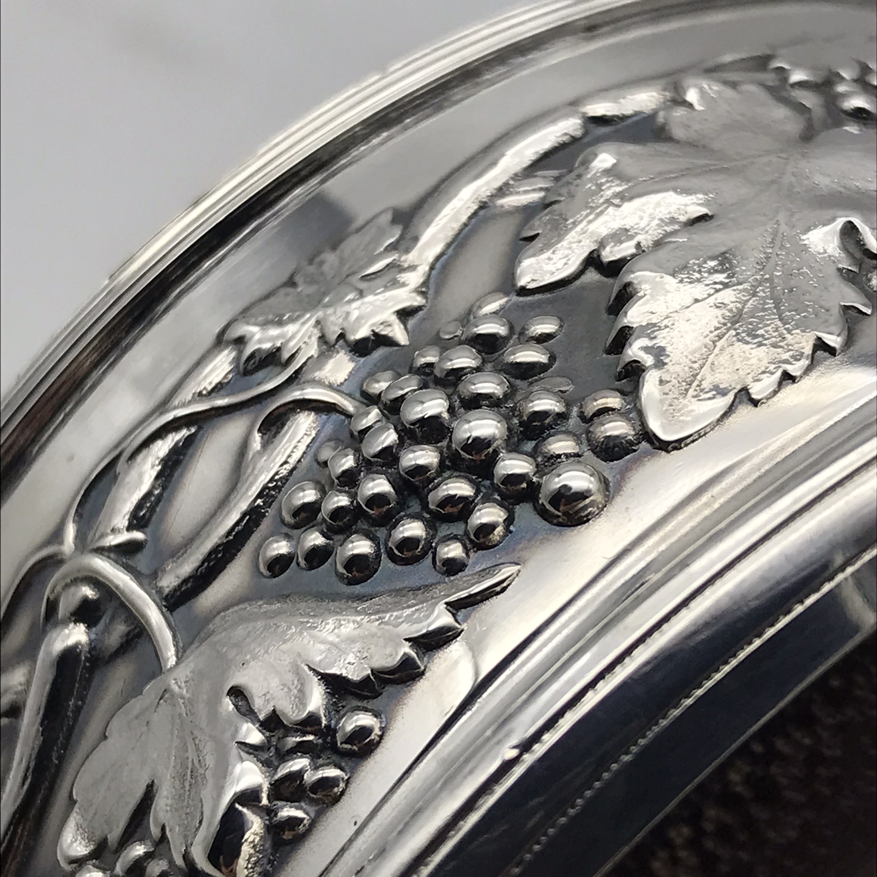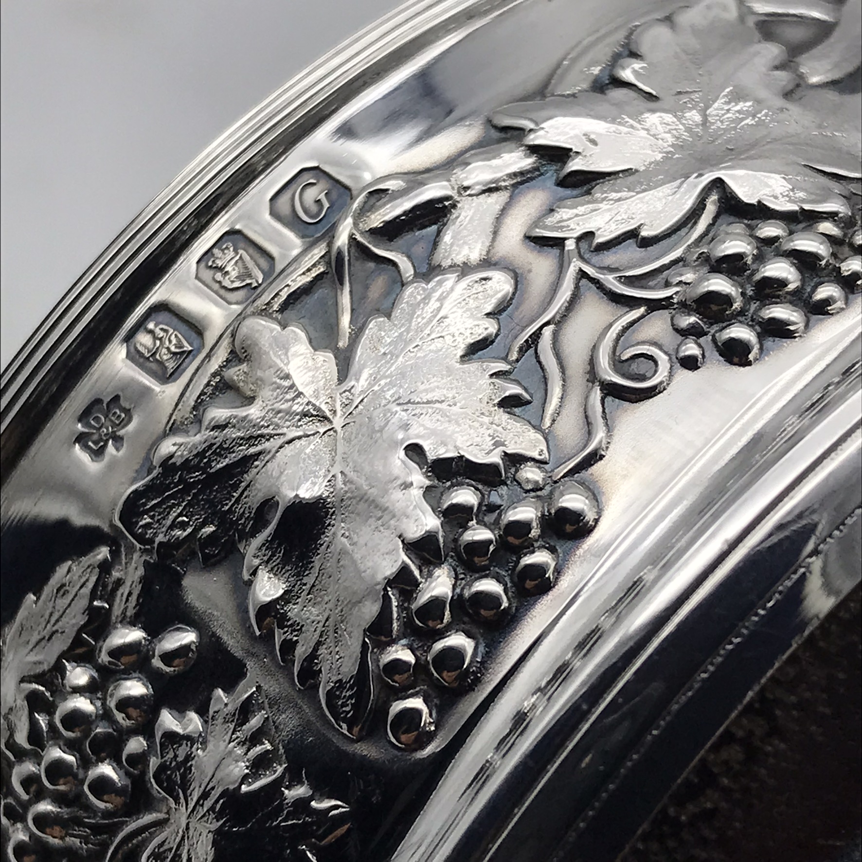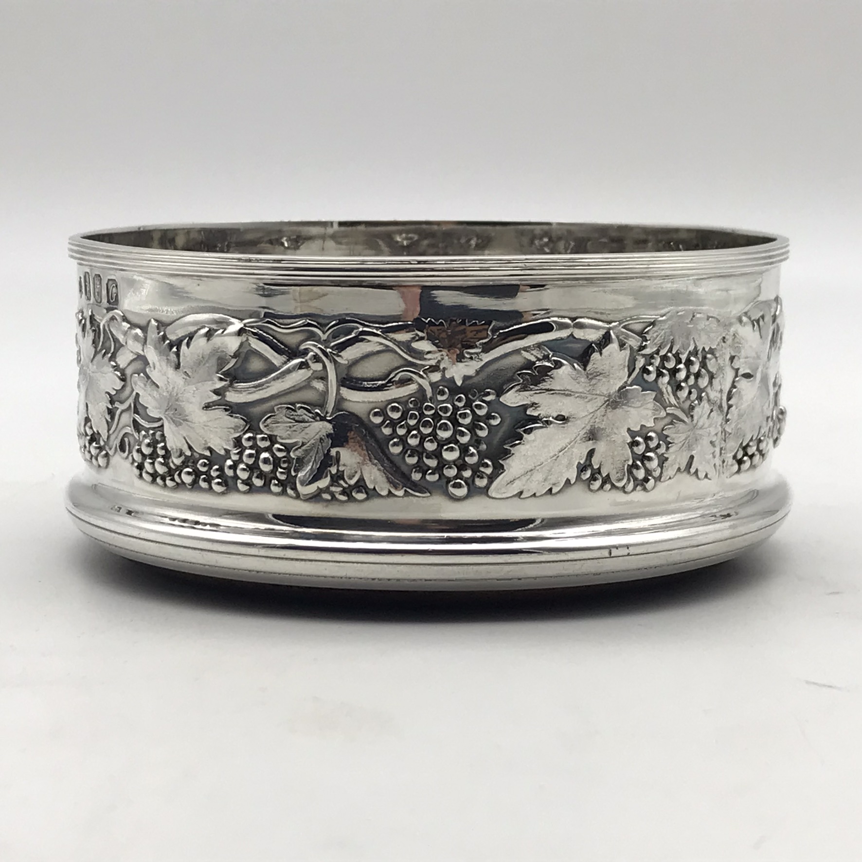 This wonderful, fine quality, Irish sterling silver wine coaster is in excellent condition with a lovely weight. It has straight sides with a beautifully embossed grape and vine design all the way round, and a turned wooden base with a central silver button. It was made in Dublin, in 1992 and has nice clear hallmarks on the side as well as on the central button, including a maker’s stamp with the initials ‘D L&B’ in a ‘three leaf clover’. This lovely coaster has a base diameter of 10cm, stands 4,5cm high and weighs 133,3g.