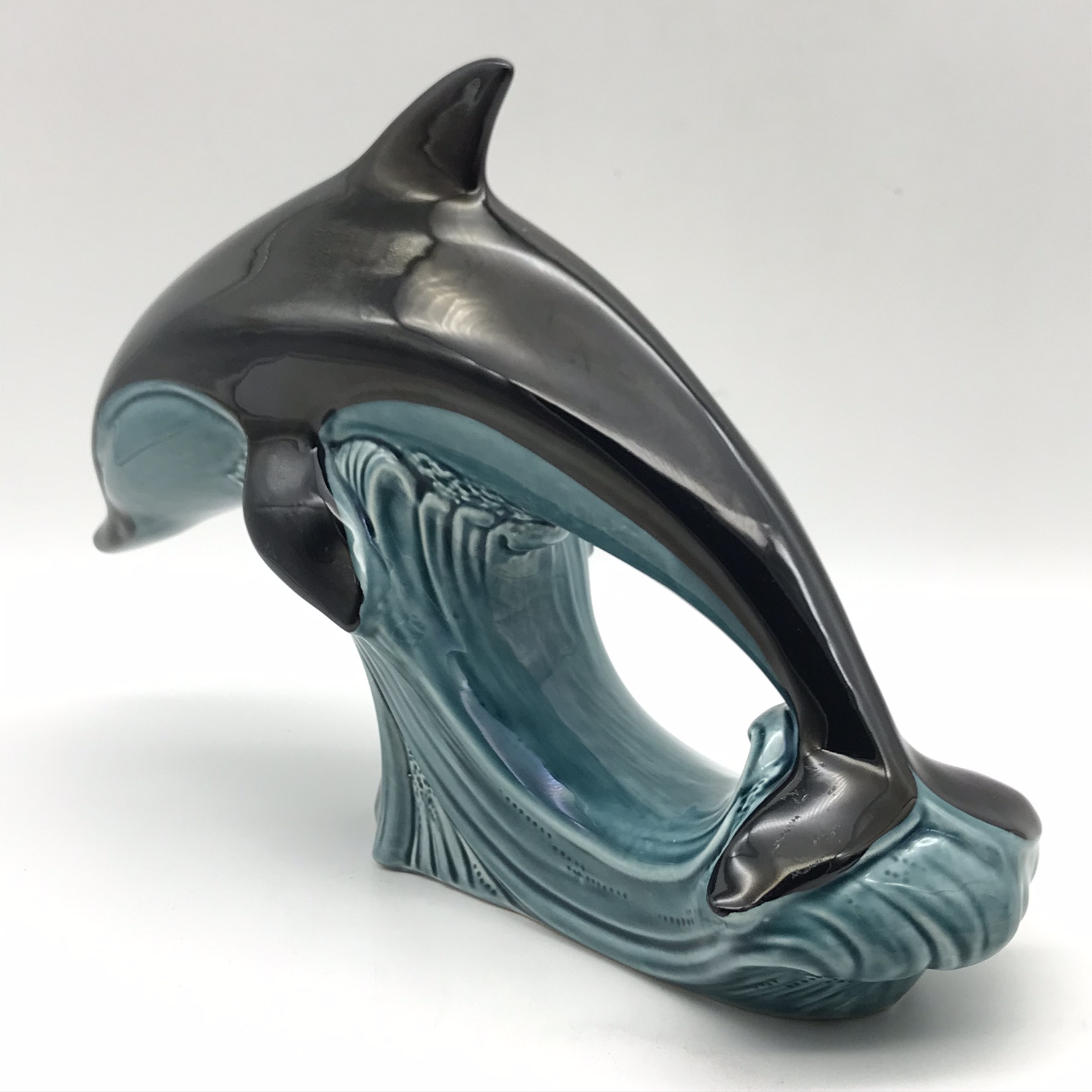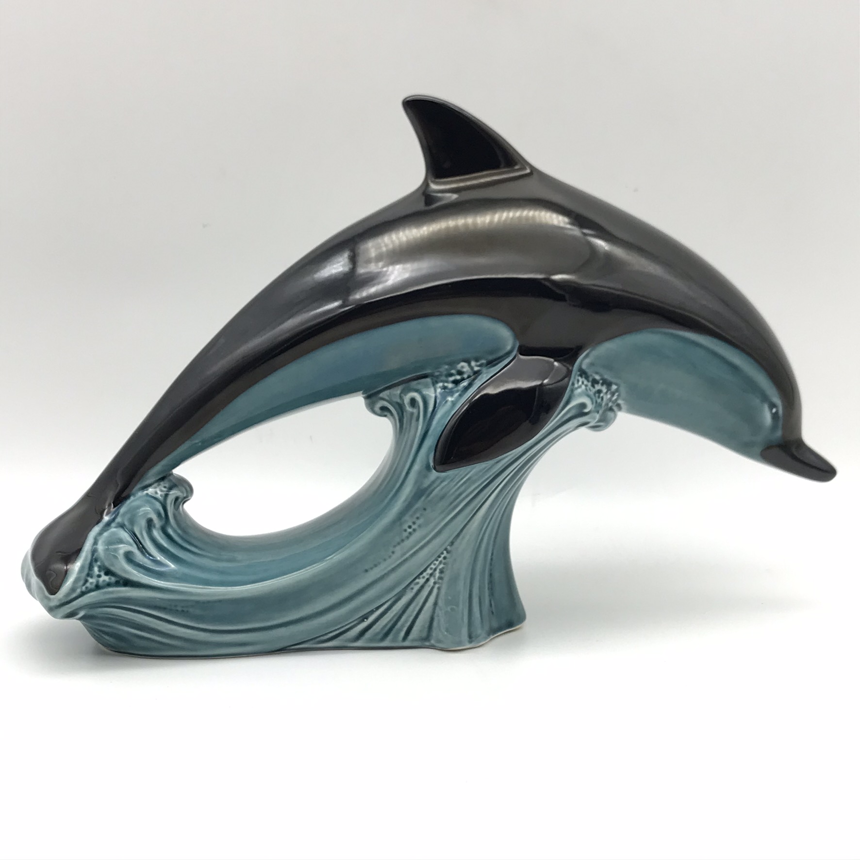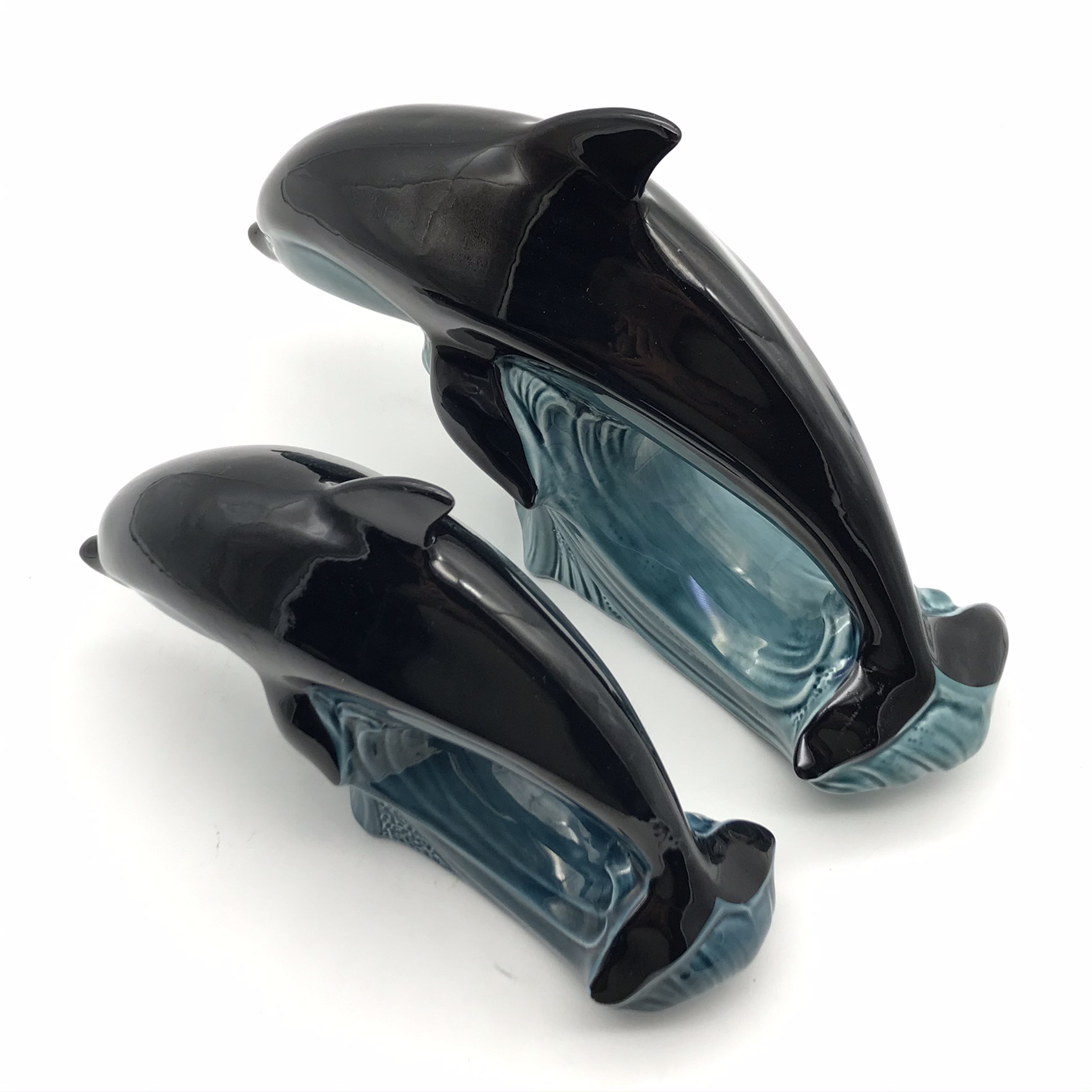 This lovely, early pair of glazed ceramic ‘leaping dolphins’, one bigger than the other, were made in the 1970’s by the ‘Poole Pottery’ factory in England. They depict a large and small dolphin on the crest of a wave, in blue and black colours with a lovely glaze, and both carry the ‘POOLE ENGLAND’ backstamps on their bases. Both figures are in excellent condition, with the large one measuring 27cm x 8cm and standing 18,5cm high, and the smaller one measuring 21cm x 6,5cm and standing 14,5cm high, and together weighing 840g.