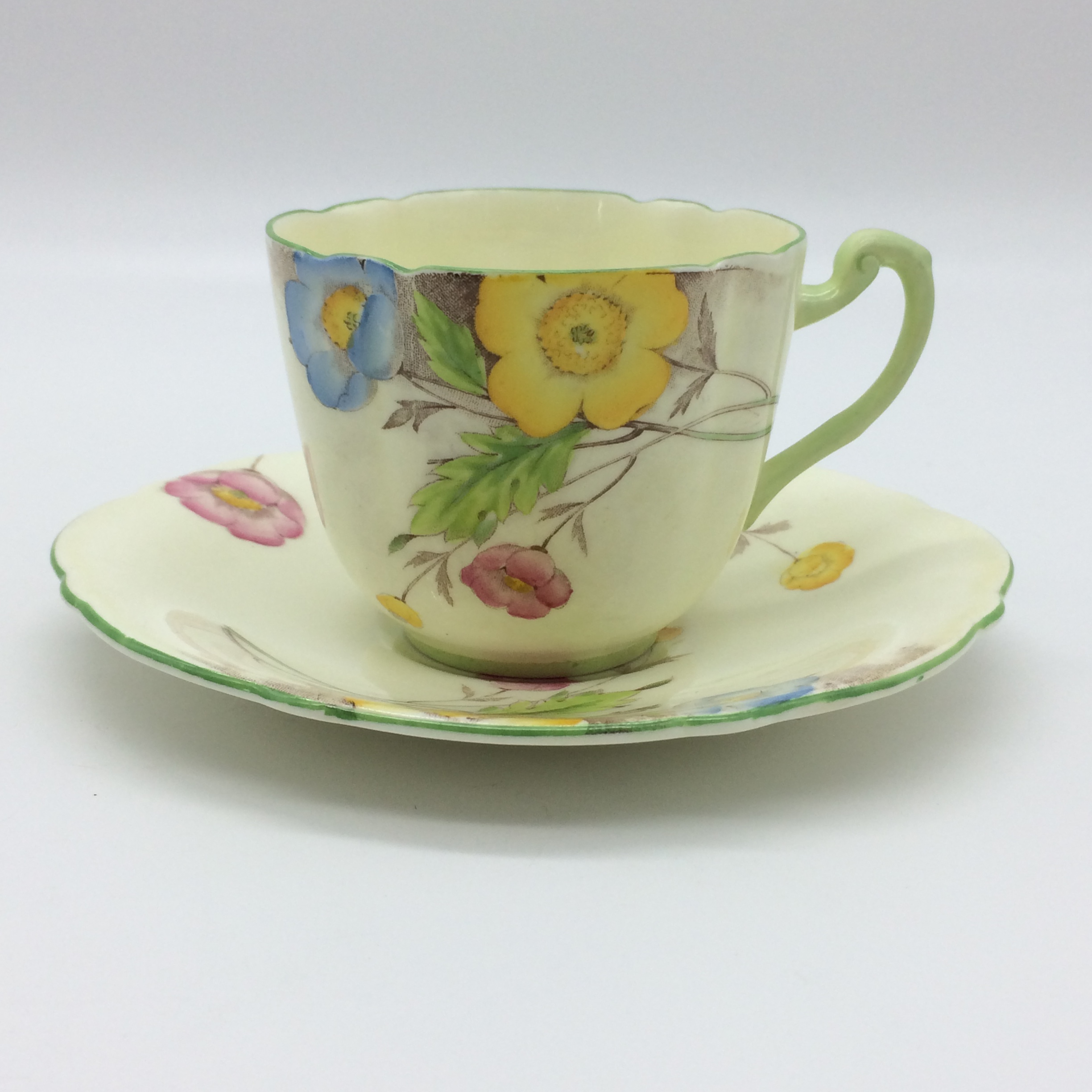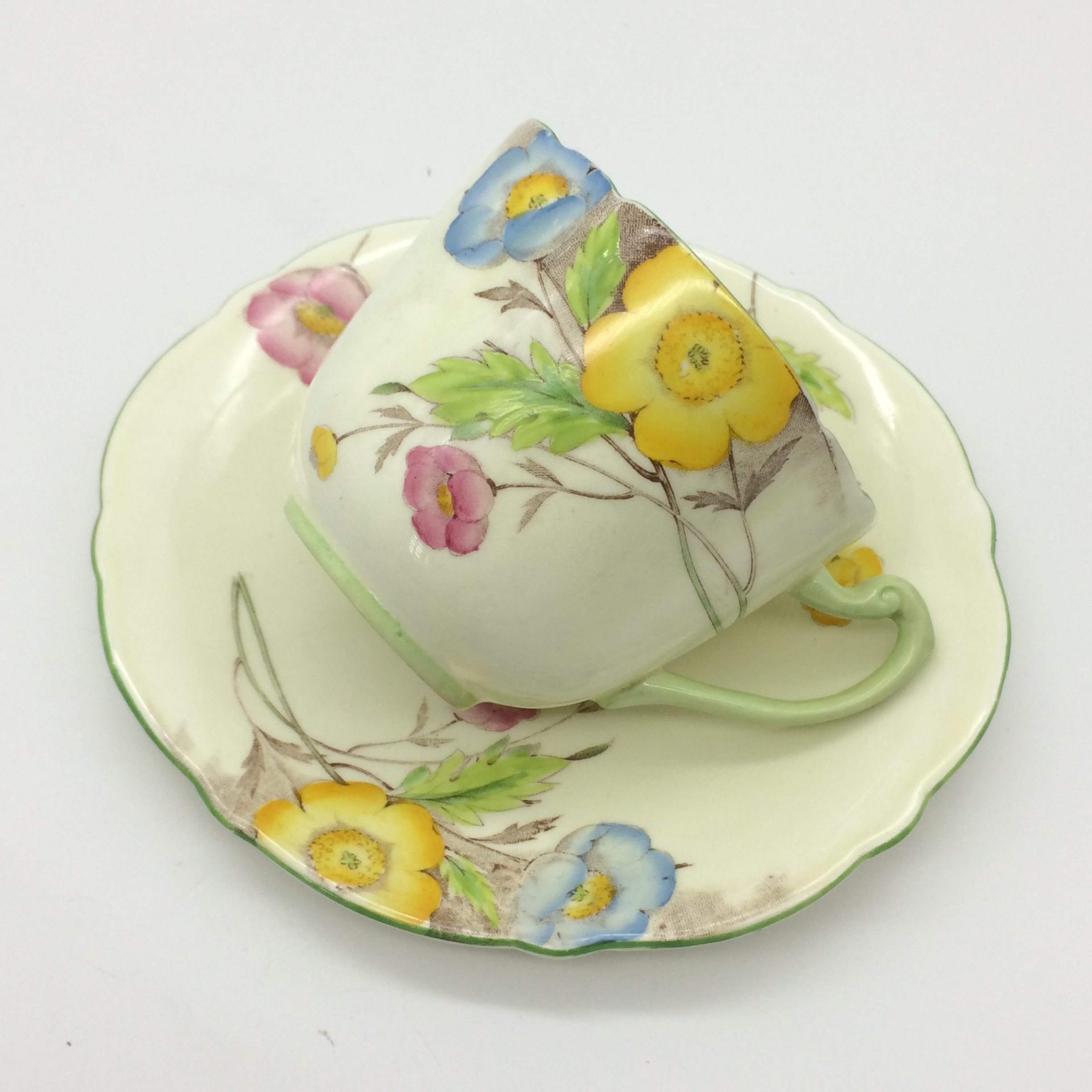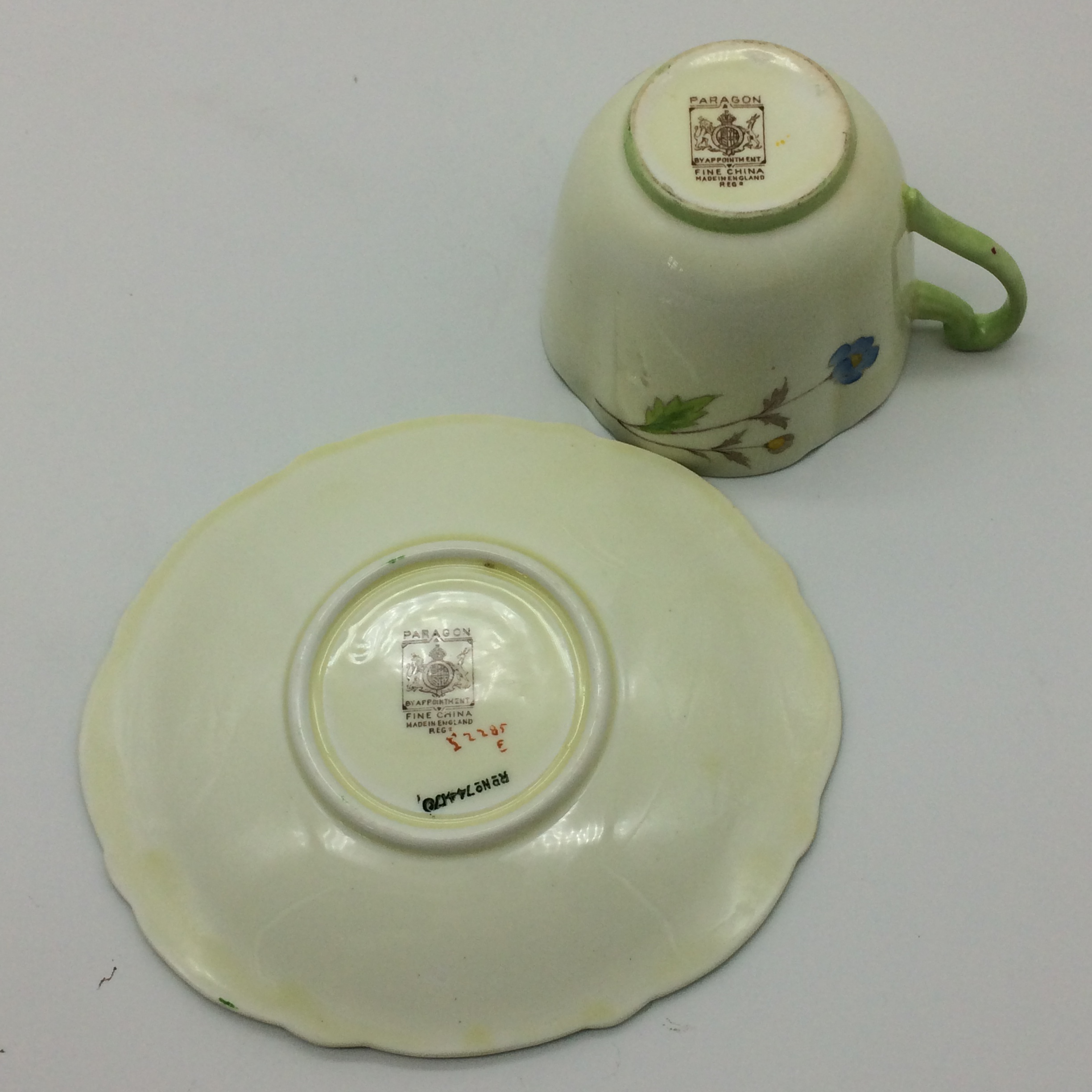 This attractive, early, oval shaped, ‘Paragon’ cup and saucer are beautifully hand-painted with blue, yellow and pink flowers against a cream background with a green trim. The pair are in excellent condition and carry the 1930’s Paragon backstamp.