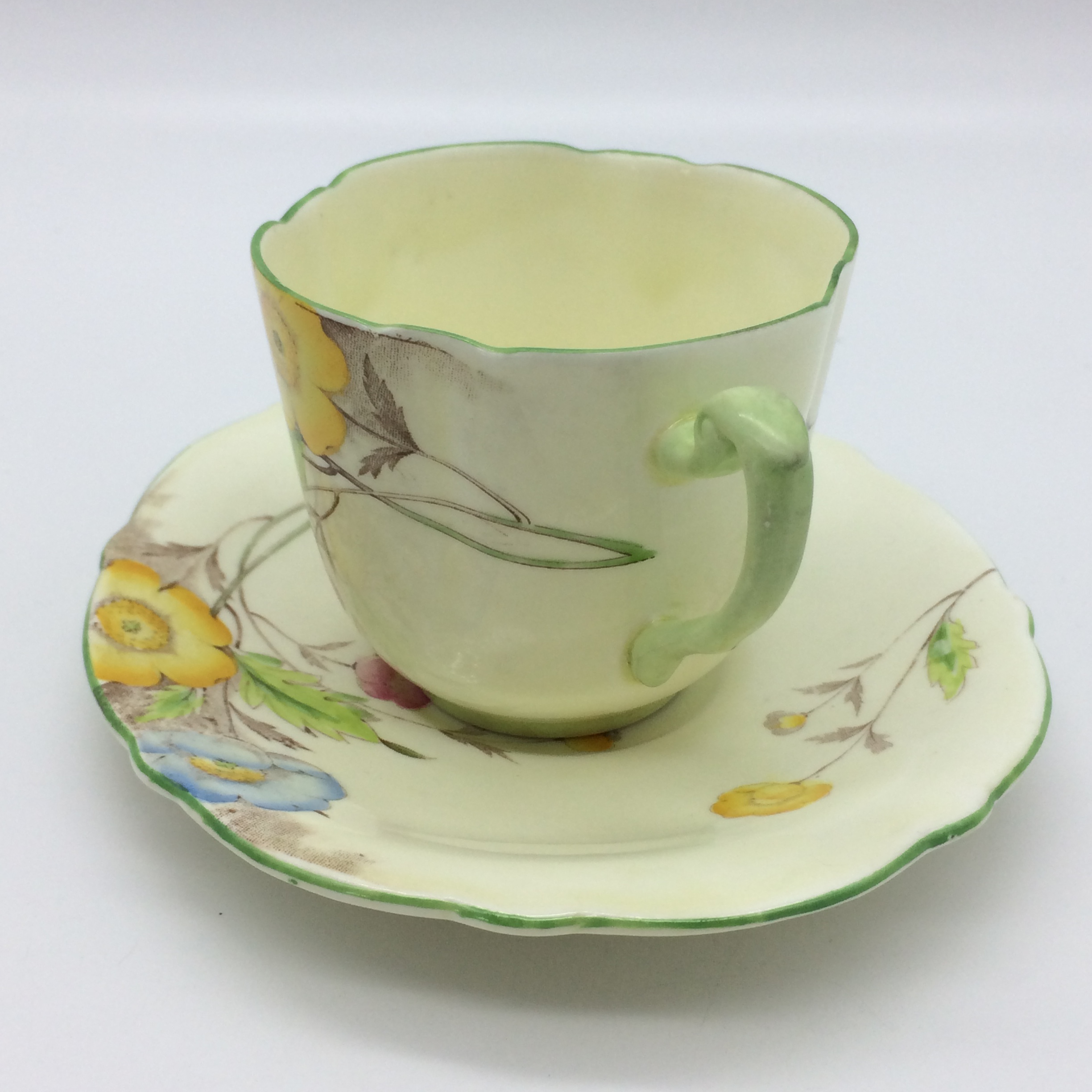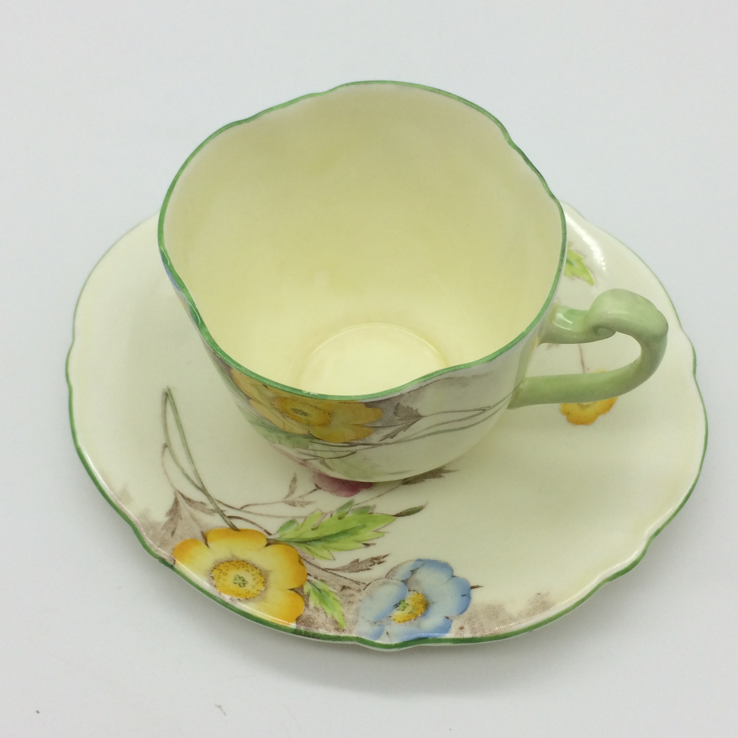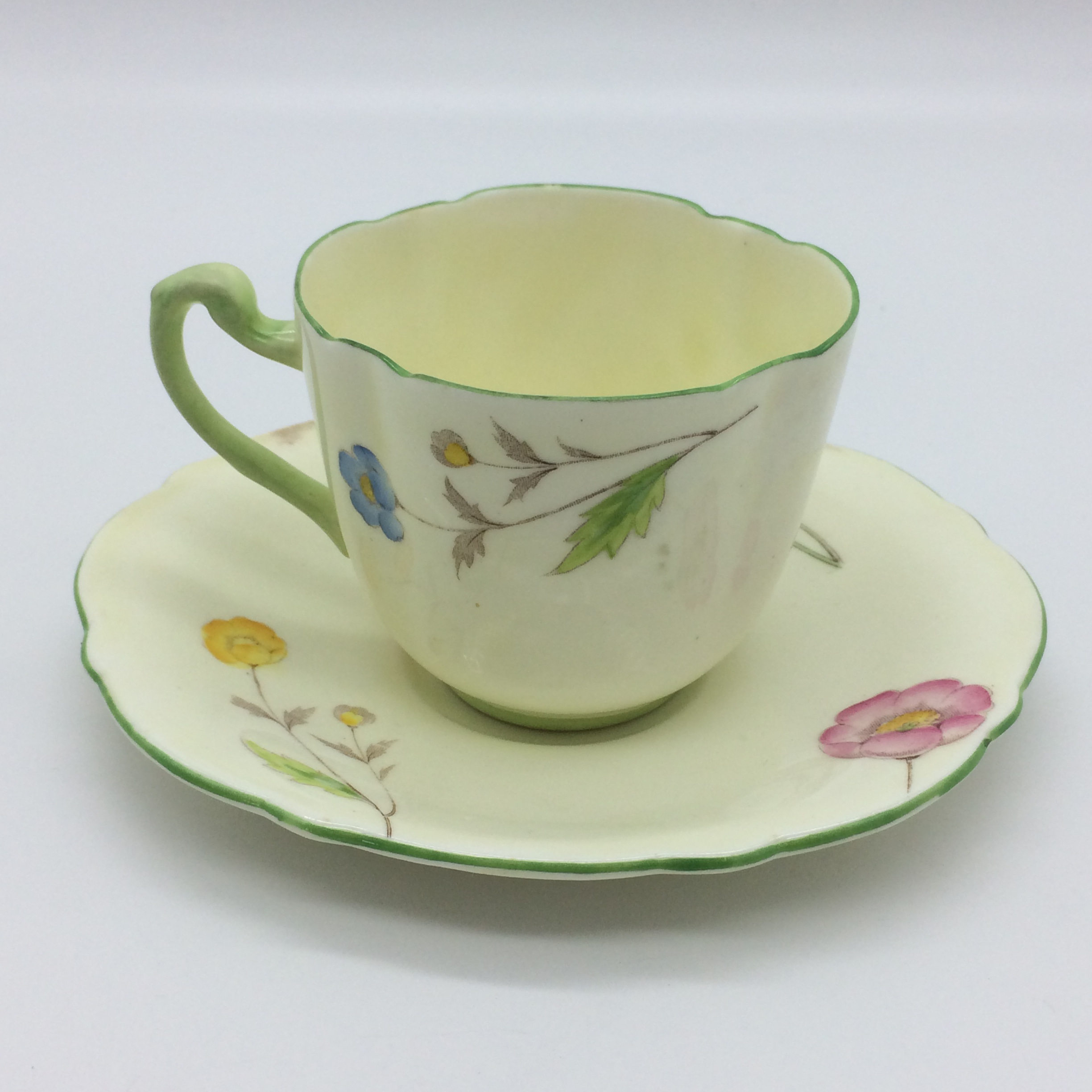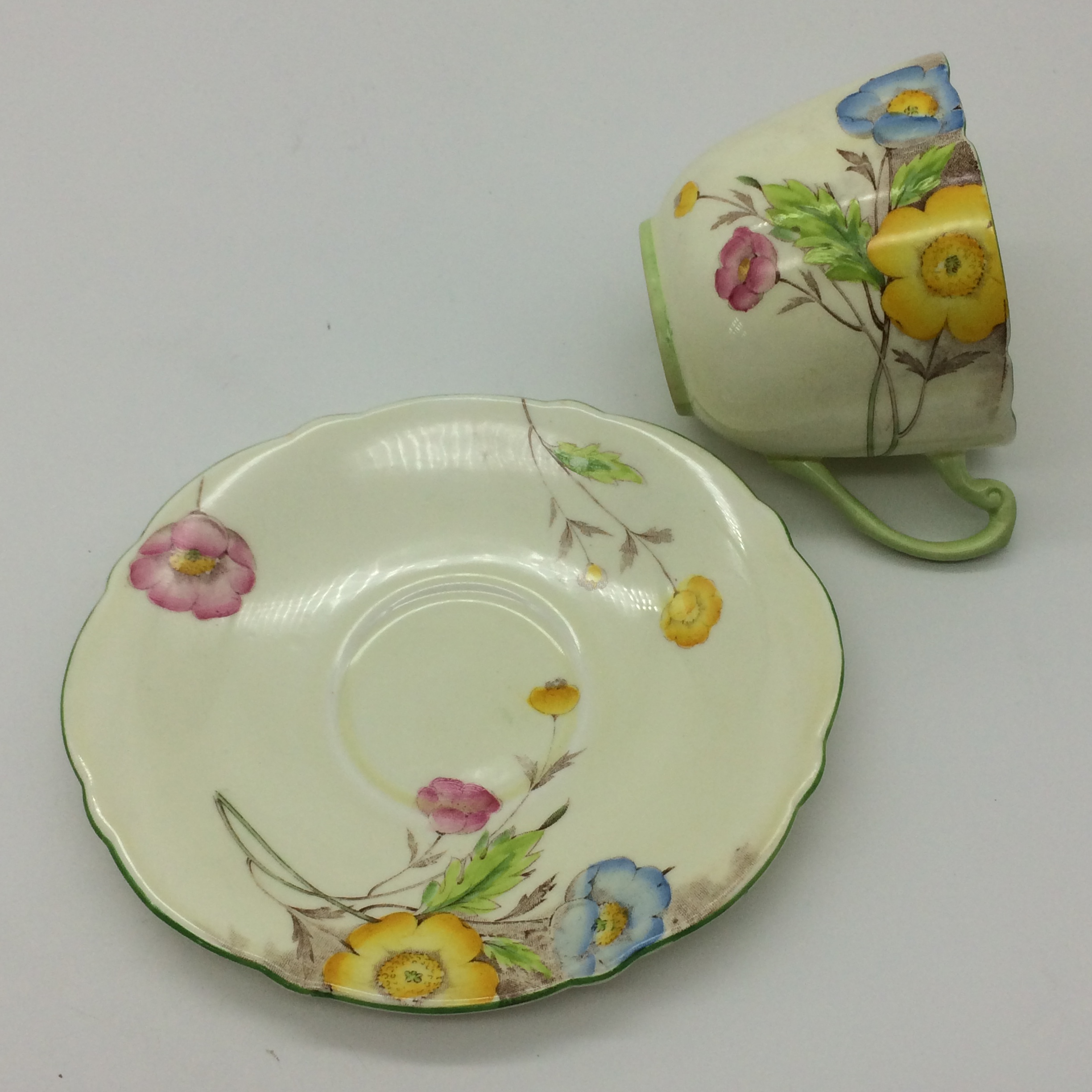 This attractive, early, oval shaped, ‘Paragon’ cup and saucer are beautifully hand-painted with blue, yellow and pink flowers against a cream background with a green trim. The pair are in excellent condition and carry the 1930’s Paragon backstamp.