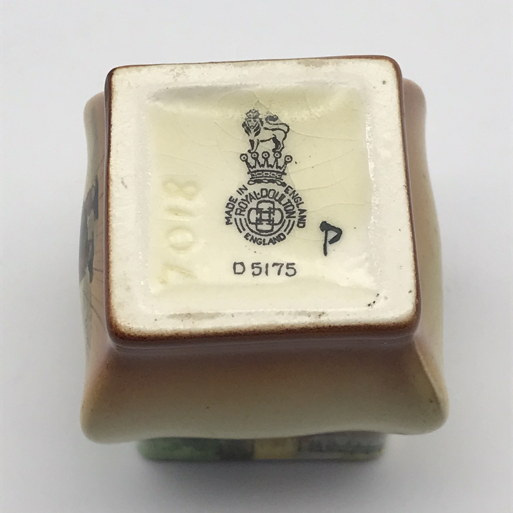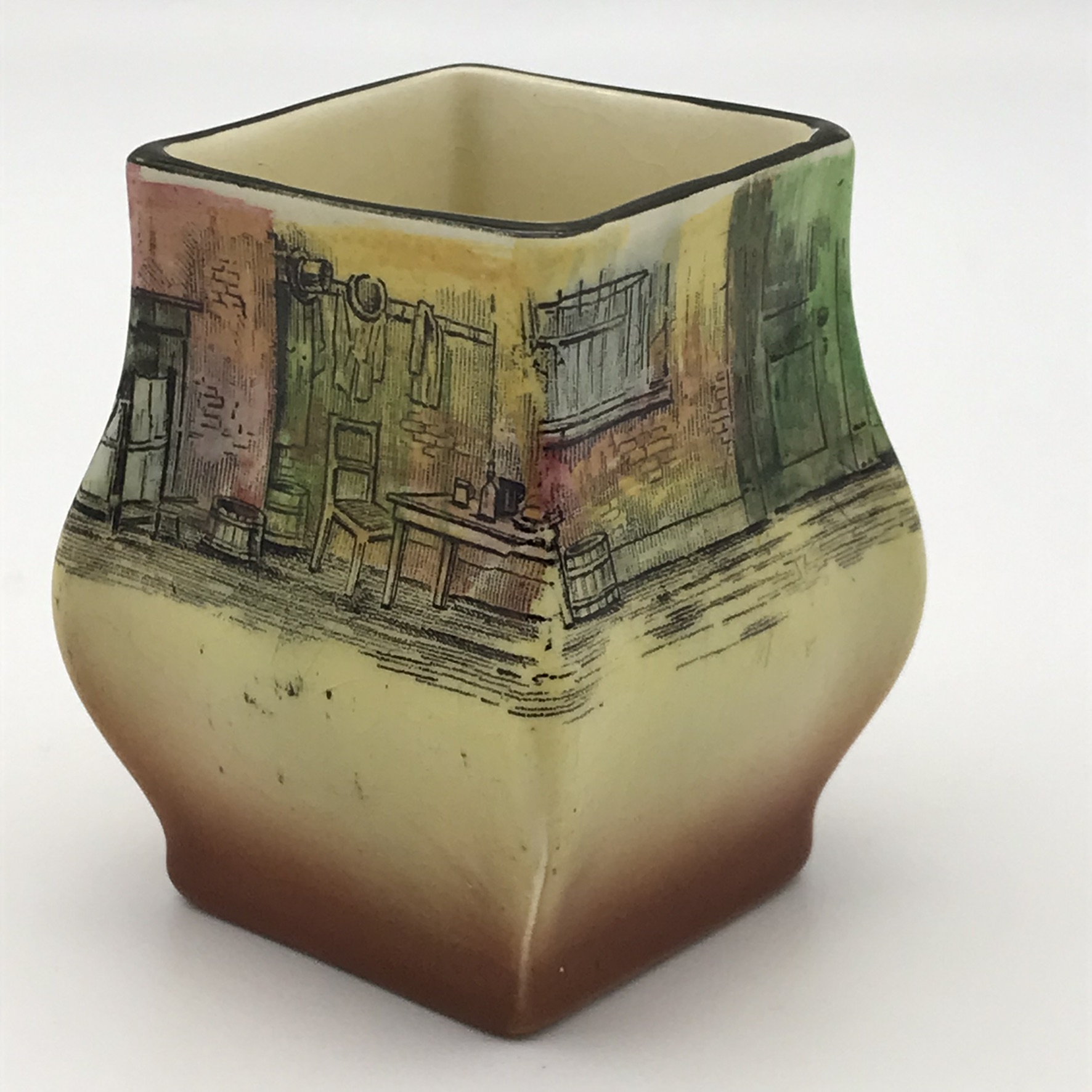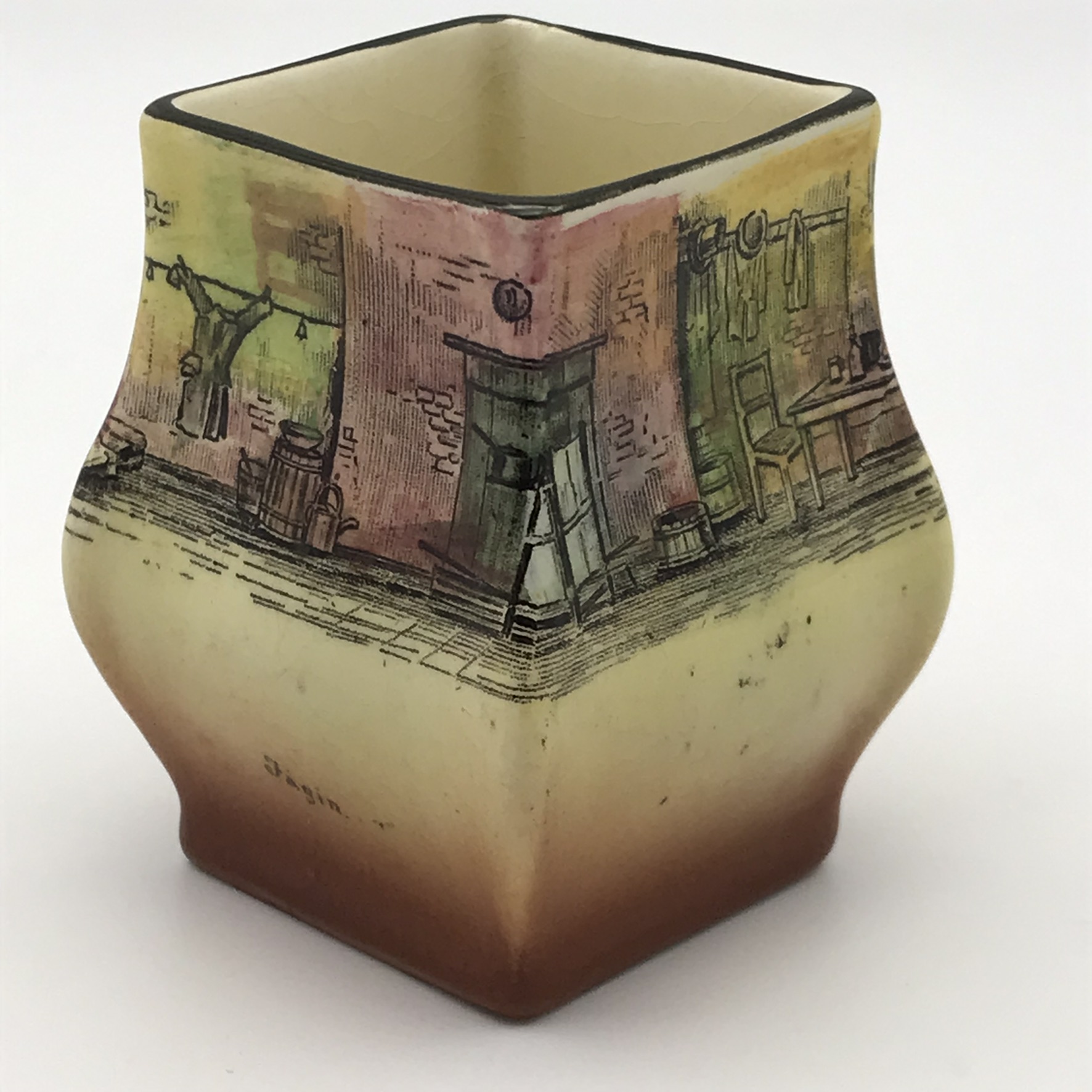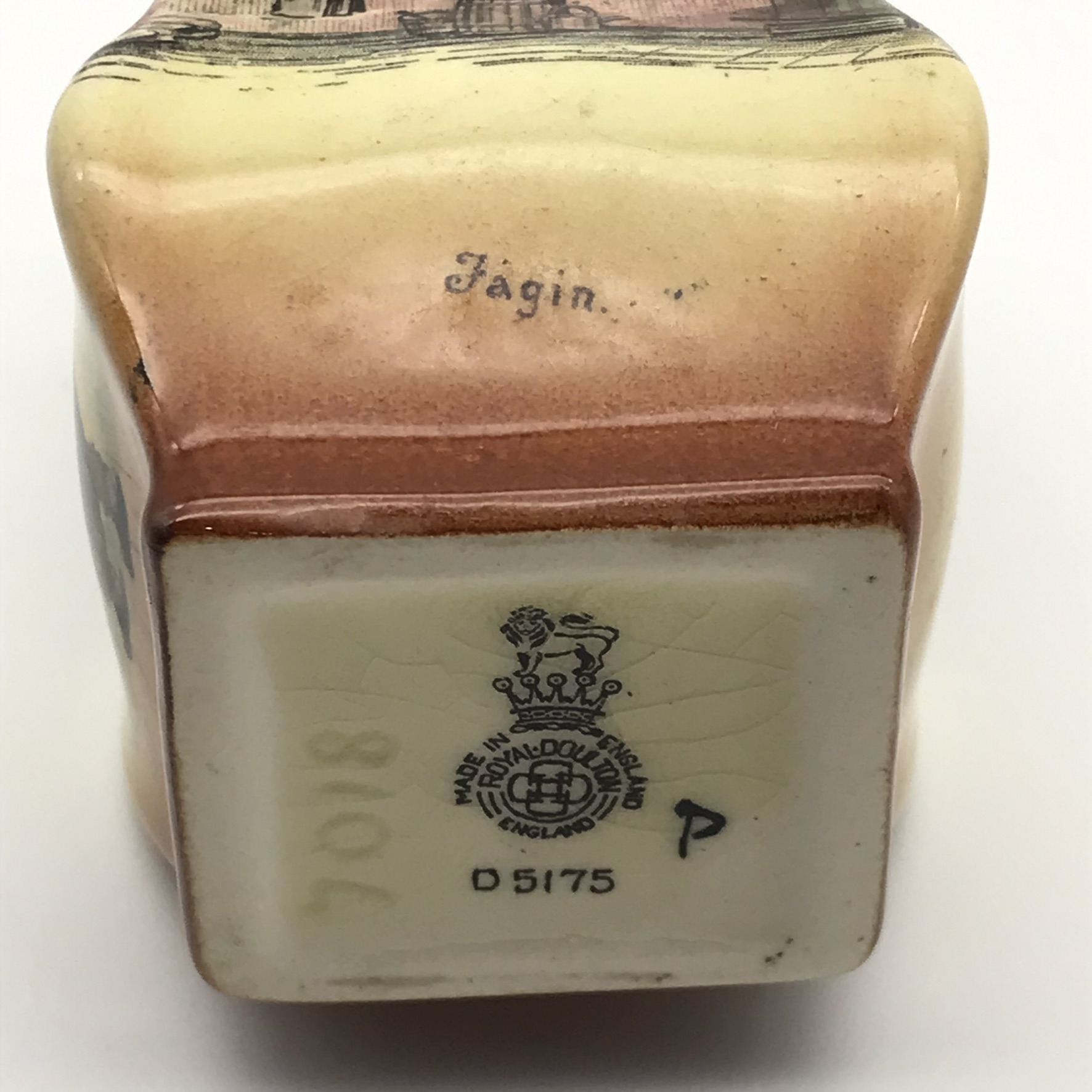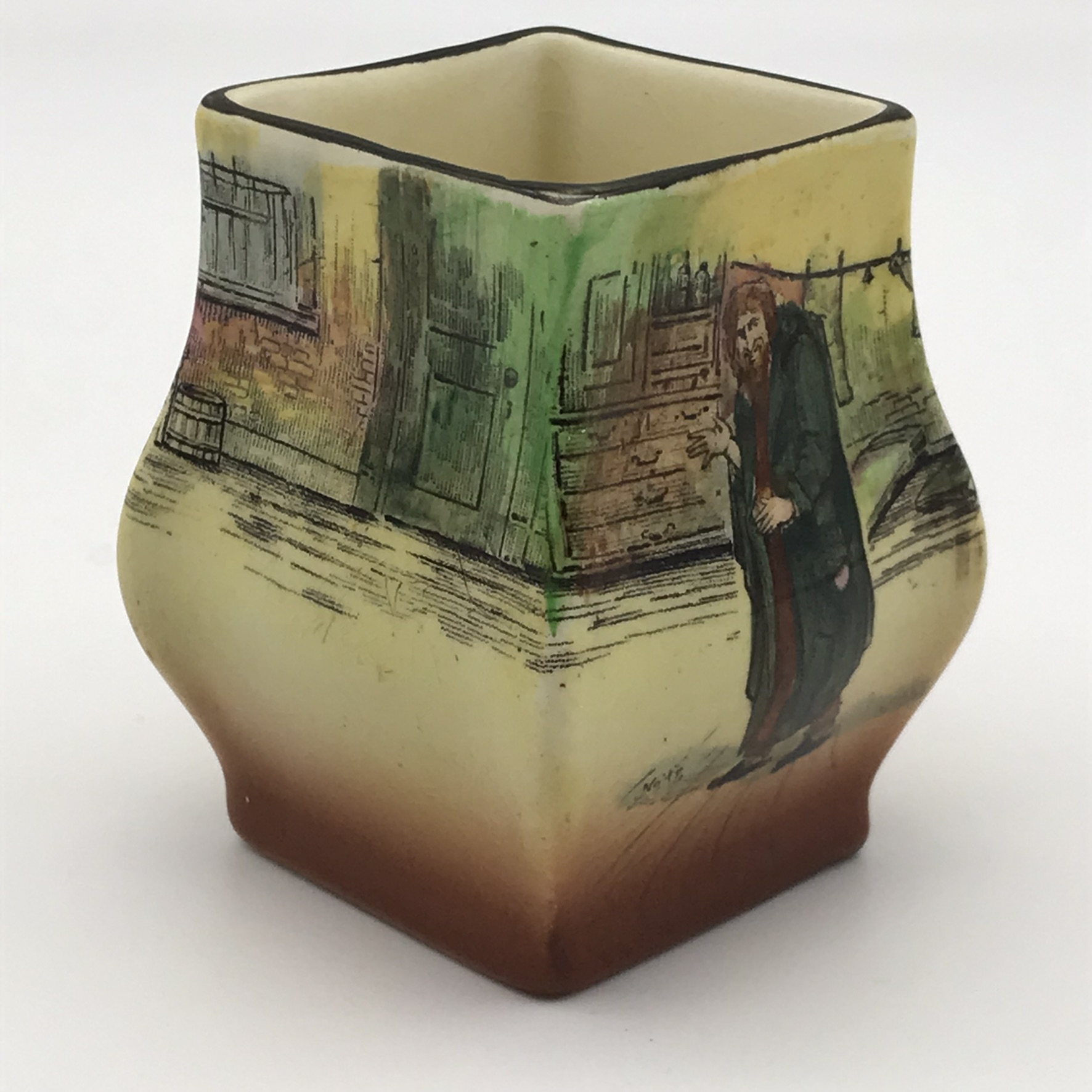 This lovely, miniature Royal Doulton vase from the Dickens ware series, designed by Charles Noke, features the character ‘Fagin’. The base is stamped with the Royal Doulton backstamp, the pattern number ‘D5175’ along with the impressed shape number ‘7018’. It is in excellent condition and stands 6cm high and measures 4,8cm x 4,8cm at its widest.
