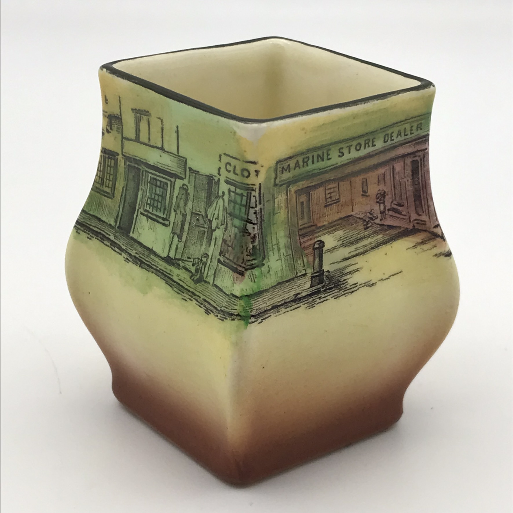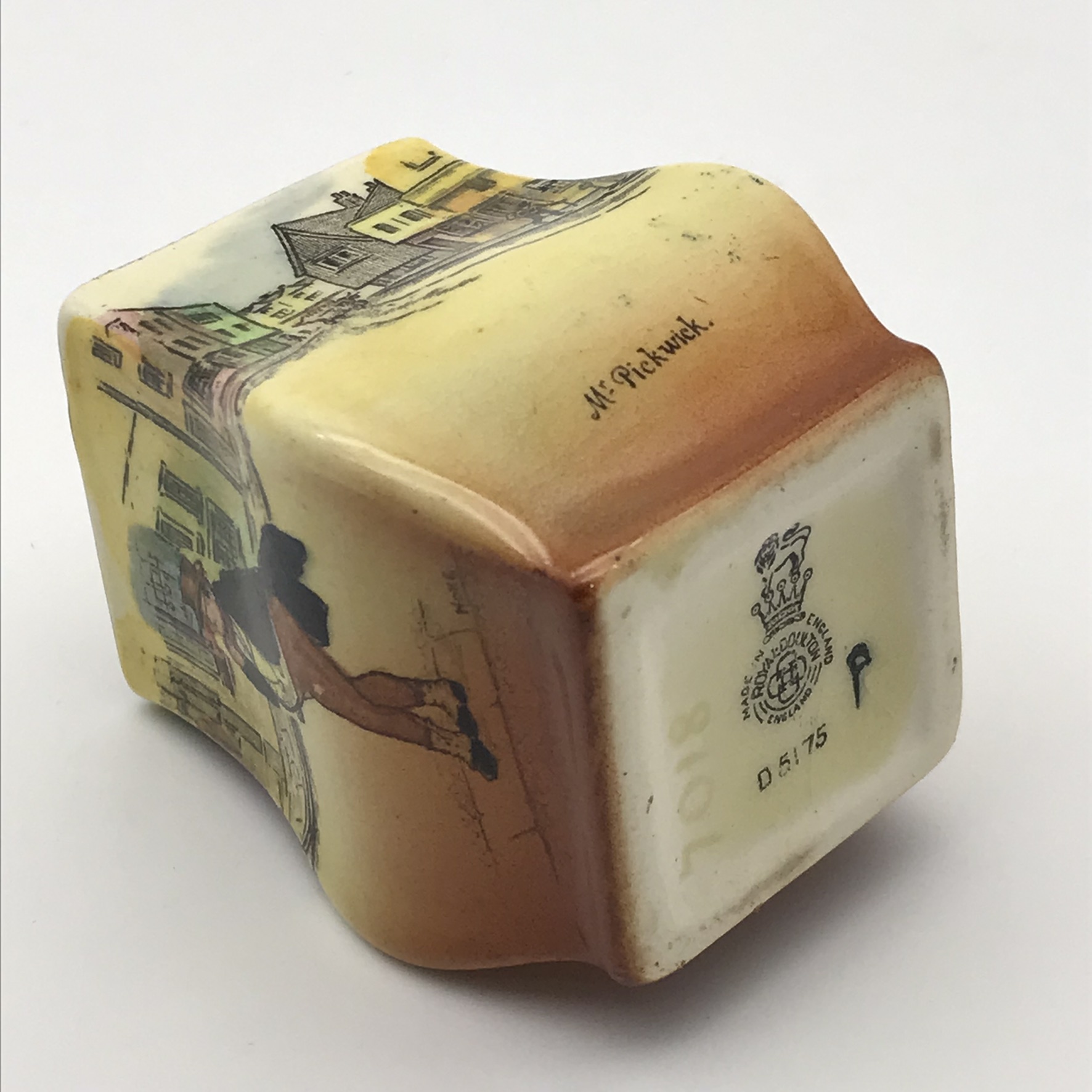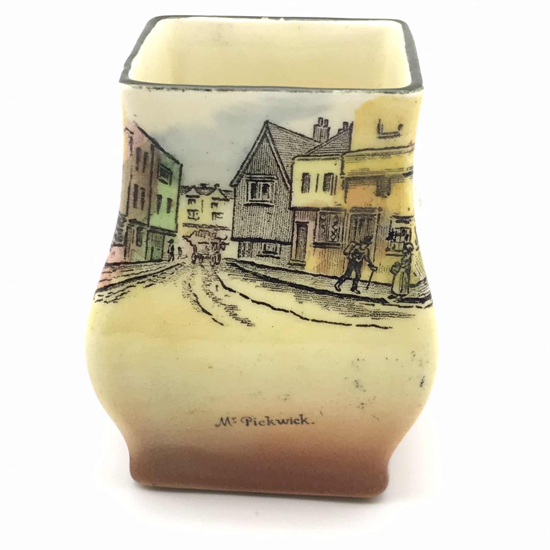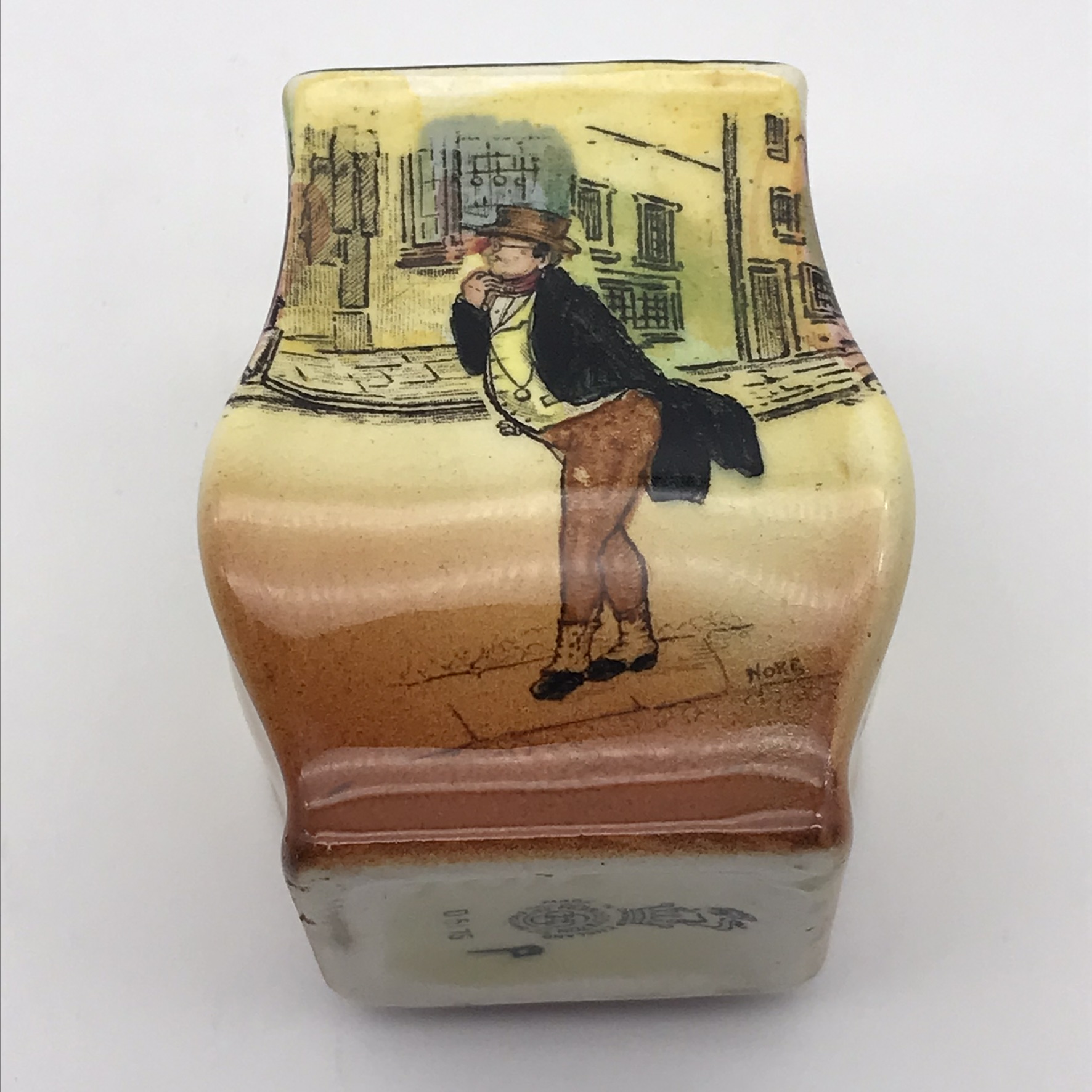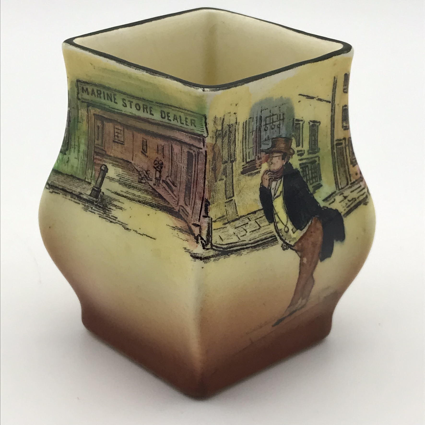 This lovely, miniature Royal Doulton vase from the Dickens ware series, designed by Charles Noke, features the character ‘Mr Pickwick’. The base is stamped with the Royal Doulton backstamp, the pattern number ‘D5175’ along with the impressed shape number ‘7018’. It is in excellent condition and stands 6cm high and measures 4,8cm x 4,8cm at its widest.