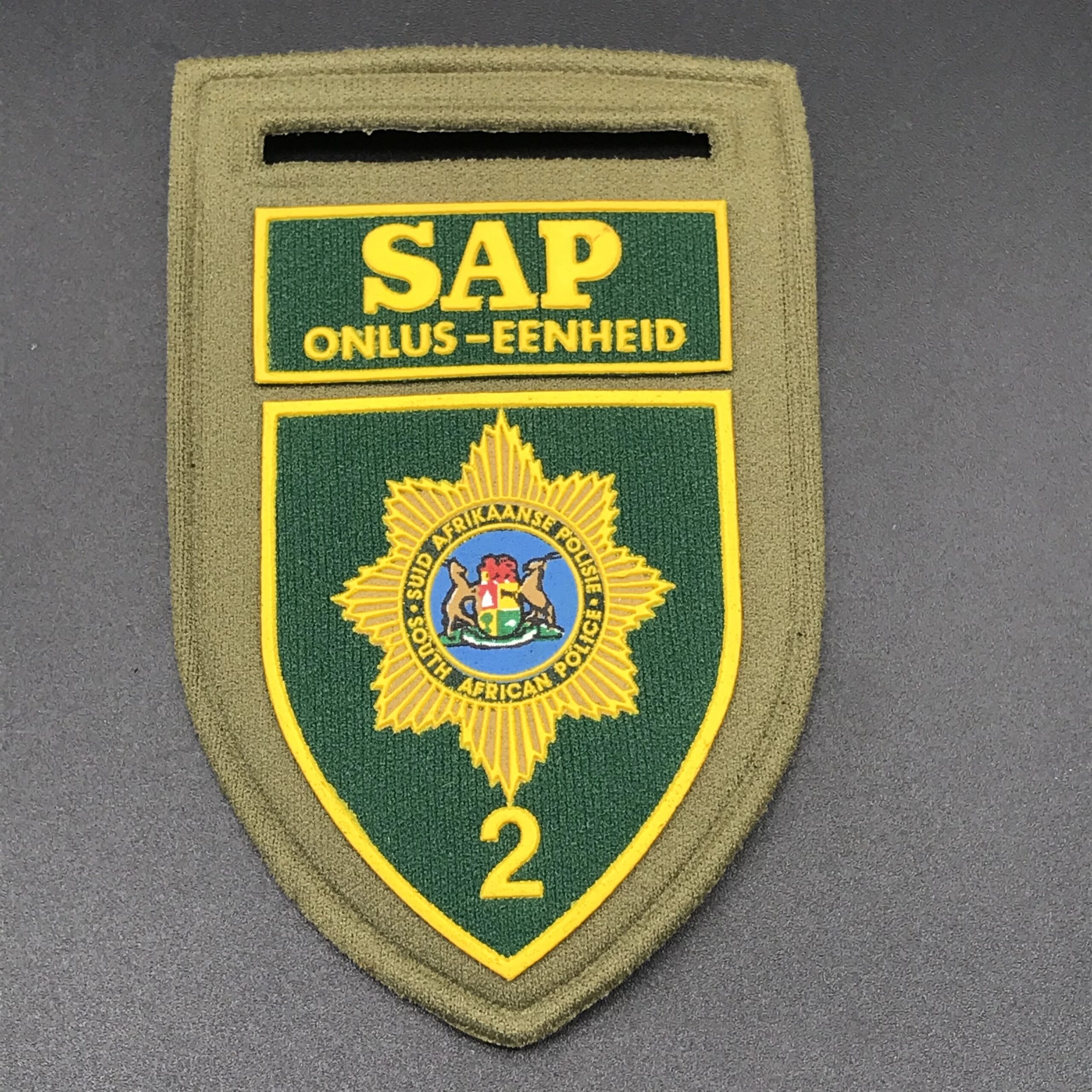 This pre-1995 yellow on green tupperware (rubberised) flash was worn on the S.A.P. camouflage uniform. Riot Unit 2 was based in Johannesburg (Diepkloof). The pin has been removed otherwise it is in excellent condition. It measures 11cm x 7cm.