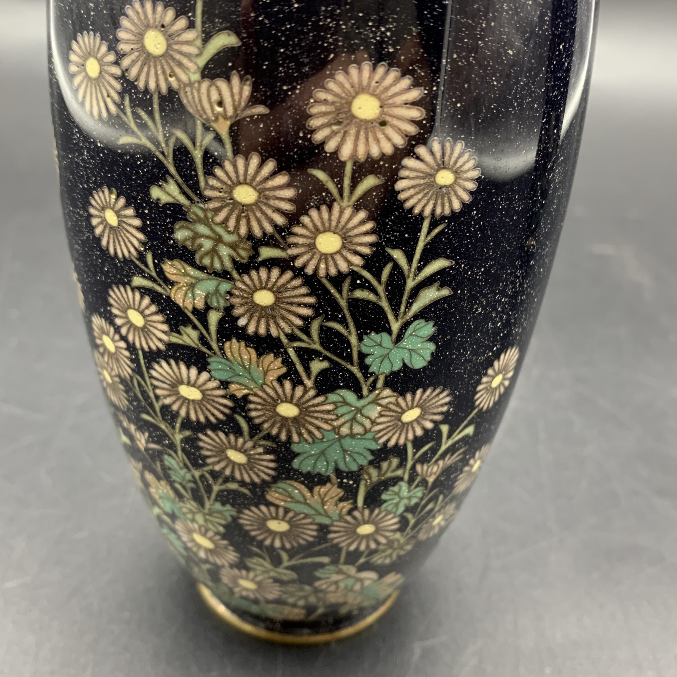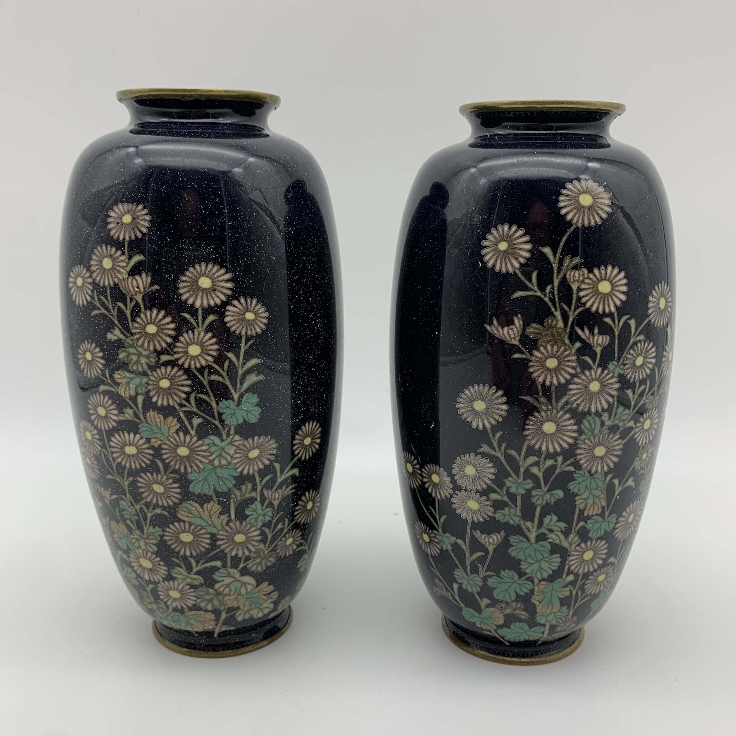 This lovely pair of antique, Japanese, cloisonne enamel vases are beautifully decorated with numerous daisy flowers, in white, cream, and turquoise colours against a dark blue background. These wonderful vases were probably made during the Meiji Period (1868-1912), and other than a tiny chip on the shoulder of one of them, they’re in excellent condition. They stand 15,5cm high with a diameter of 7,5cm and together weigh 420g.