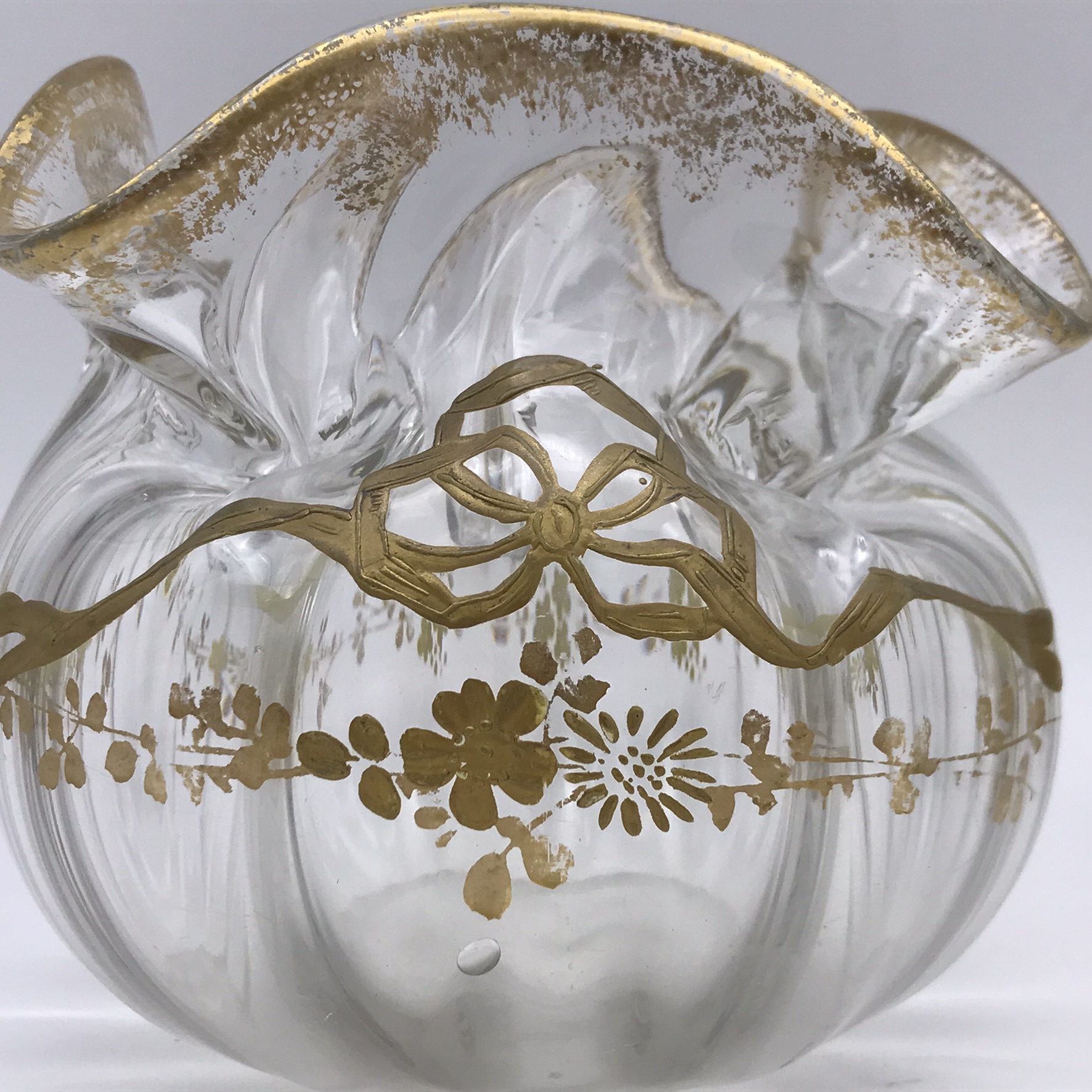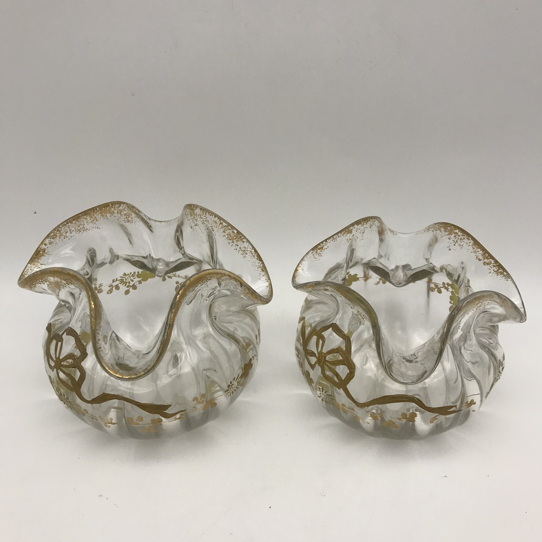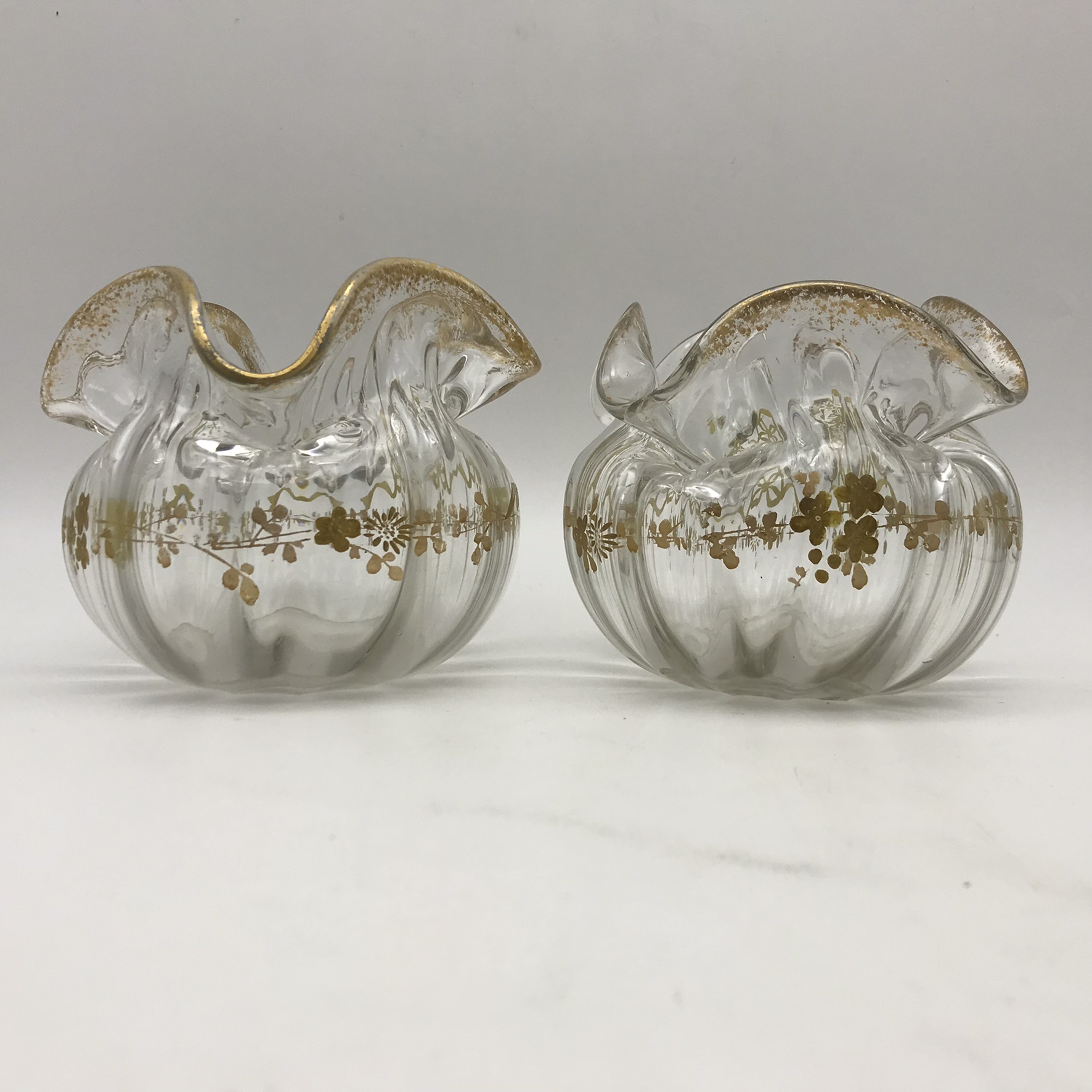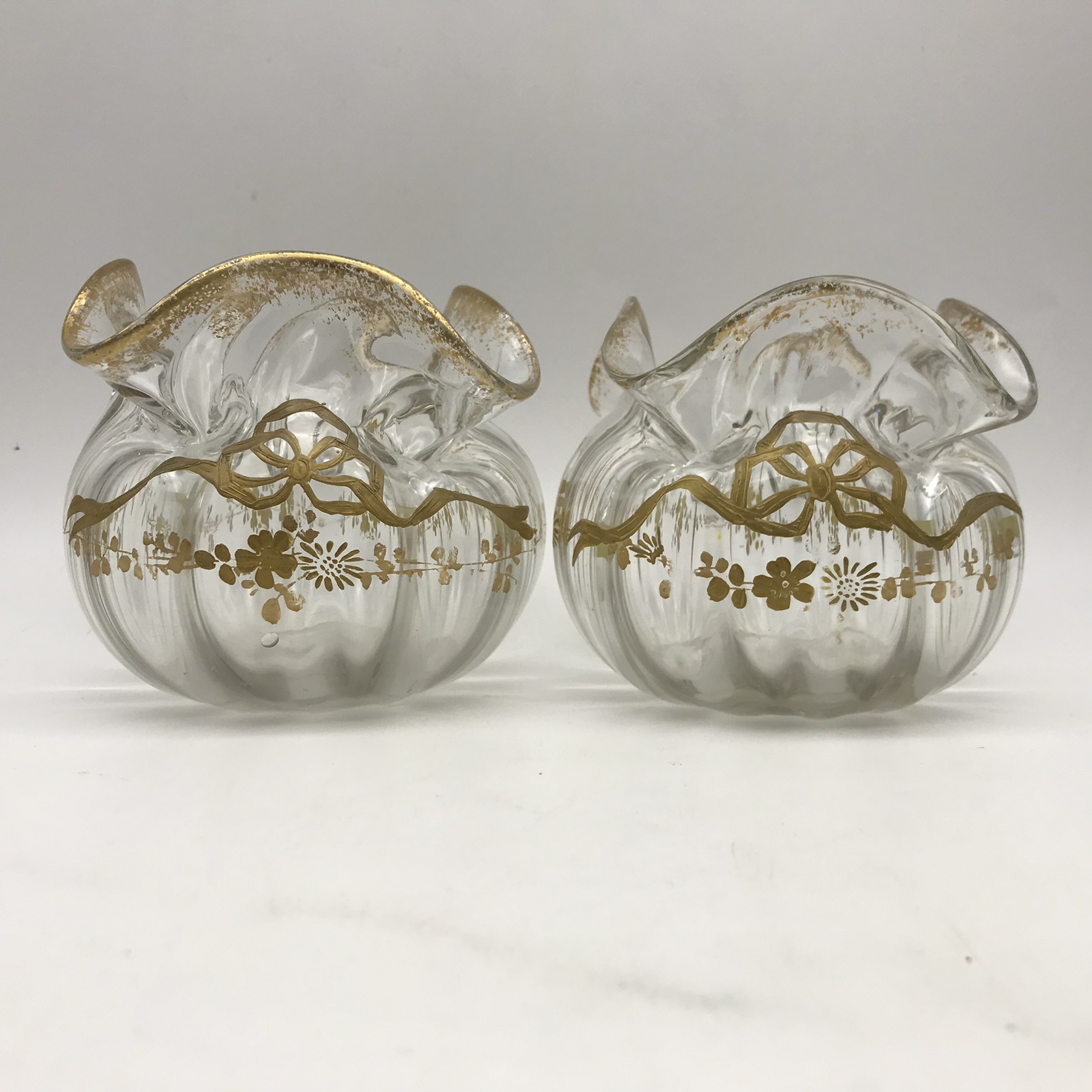 This amazing pair of antique, hand-blown ‘handkerchief’ glass vases from the late 1800’s, have a wonderful shape and are beautifully hand decorated in gold, featuring a garland of flowers and a ribbon bow, with a gold-leaf rim. They’re short, round and squat with a handkerchief ruffled shape top and scalloped rounded sides. They’re identical in shape but one is slightly bigger than the other, and other than very minor gilt loss they’re in excellent condition. One stands 10,5cm with a diameter of 13cm, and the other stands 9,5cm with a diameter of 12cm, and together they weigh 870g.