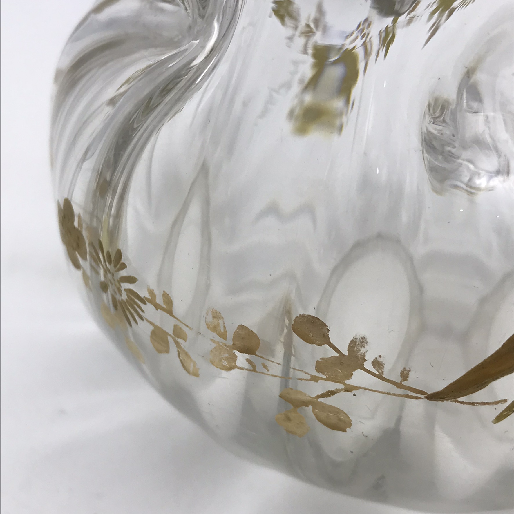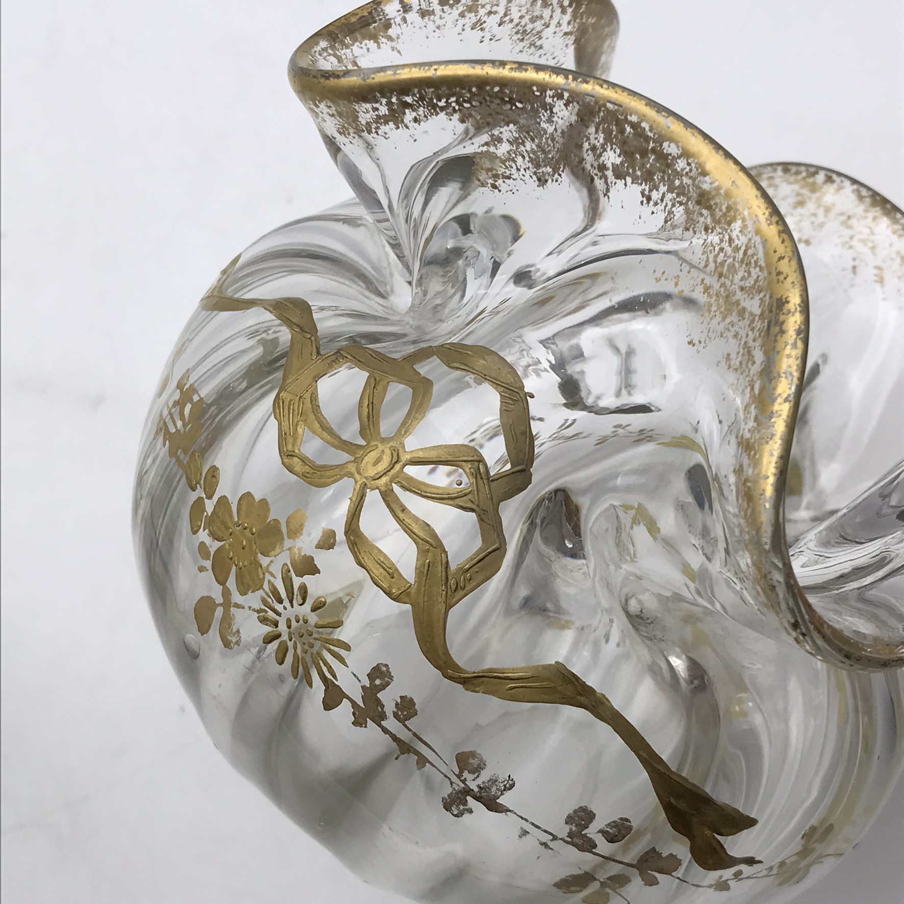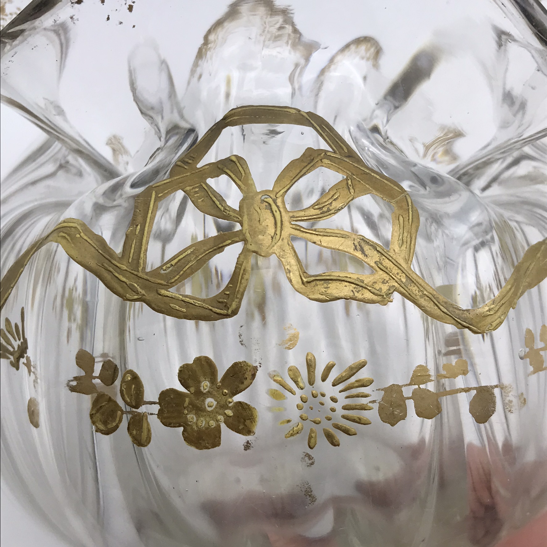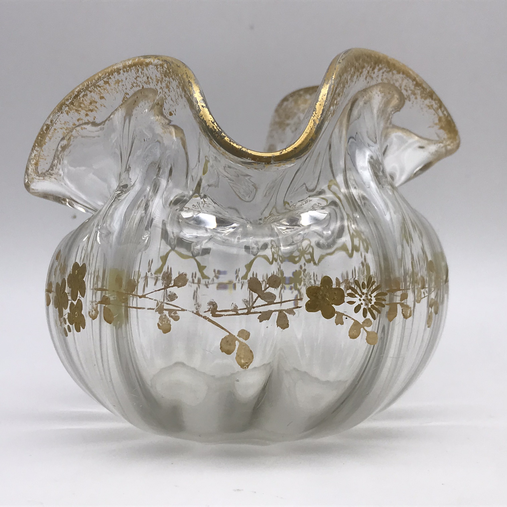 This amazing pair of antique, hand-blown ‘handkerchief’ glass vases from the late 1800’s, have a wonderful shape and are beautifully hand decorated in gold, featuring a garland of flowers and a ribbon bow, with a gold-leaf rim. They’re short, round and squat with a handkerchief ruffled shape top and scalloped rounded sides. They’re identical in shape but one is slightly bigger than the other, and other than very minor gilt loss they’re in excellent condition. One stands 10,5cm with a diameter of 13cm, and the other stands 9,5cm with a diameter of 12cm, and together they weigh 870g.