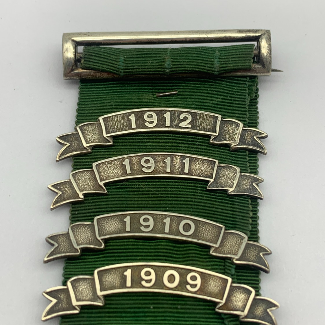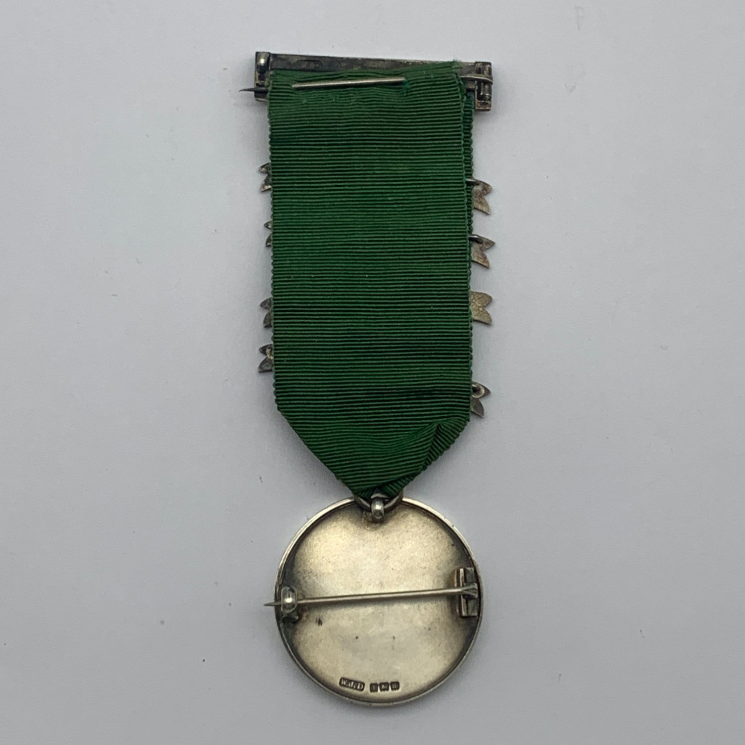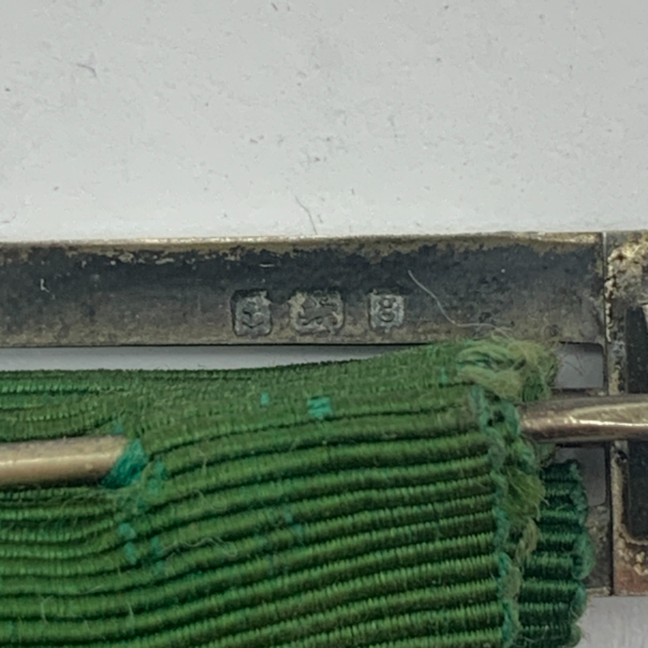 This lovely quality, heavy, pre-WW1 sterling silver ‘Border Mounted Rifles’ (BMR) ‘Marksman Badge’ or medal comes complete with four silver date clasps, 1909,10,11, & 12 attached to a green ribbon with a pin clasp at the top and one on the back of the badge. The back is stamped with English silver hallmarks, dating this to be manufactured in 1911 in Birmingham by silversmiths ‘William James Dingley’ (W.J.D). This medal/badge is in excellent condition with secure pins and original ribbon. It measures 12cm x 4,5cm and weighs 47,8g.