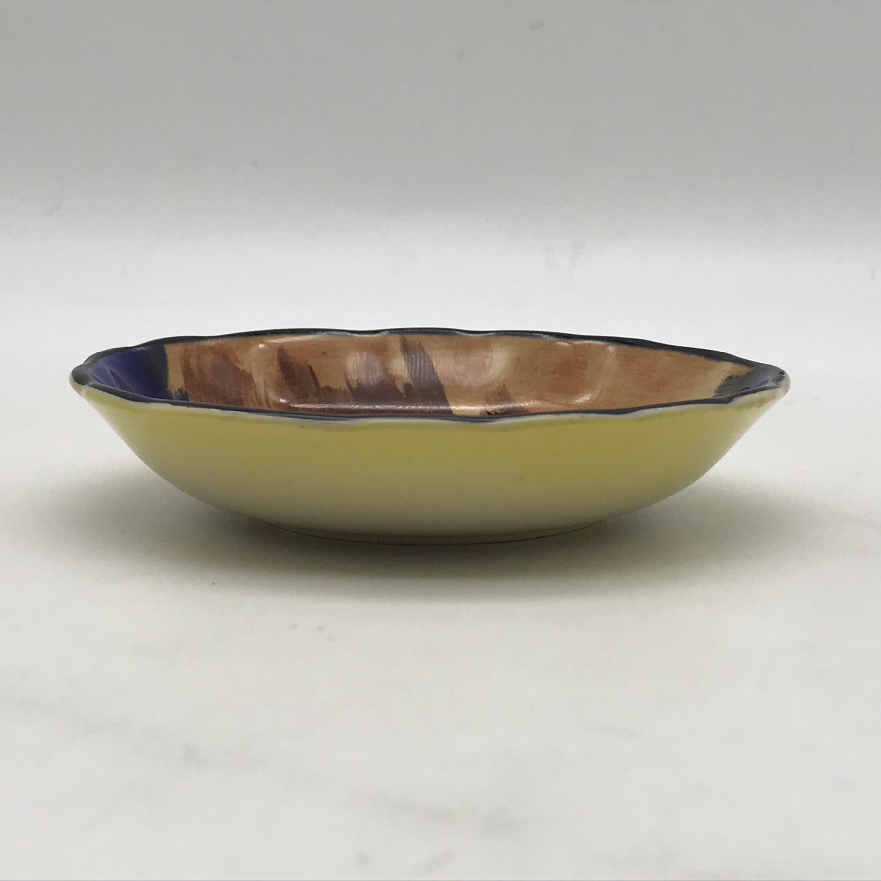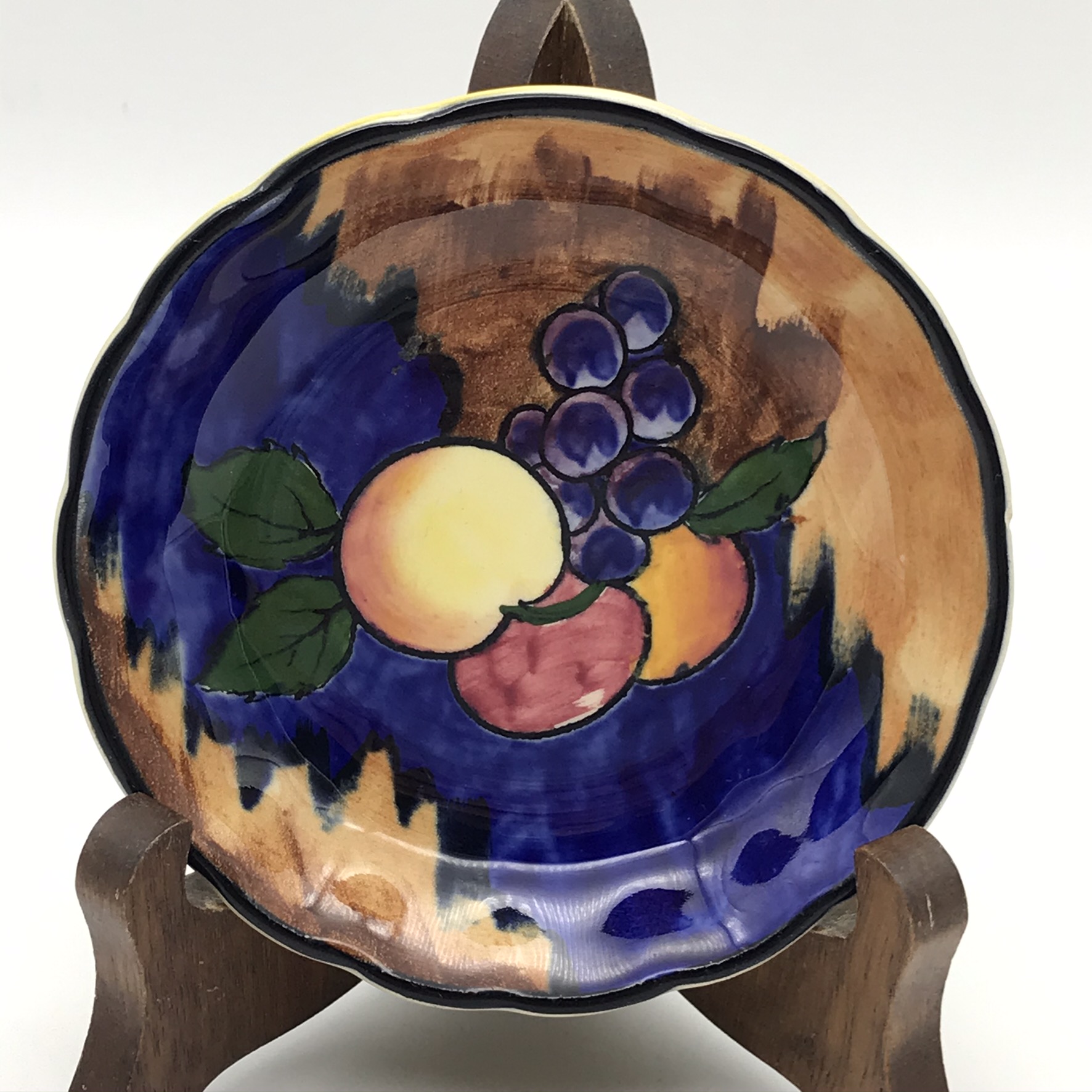 This very pretty, small, vintage, ‘Tunstall’ trinket dish from the 1940/50’s is beautifully hand painted in the colourful ‘Autumn’ pattern. It was produced by ‘Hollinshead & Kirkham’ (H&K) in Tunstall, England and designed by ‘Harold Growcott’. Other than a tiny nick to the rim it’s in excellent condition and would make an ideal ring tray on the dressing table. It has a diameter of 10,2cm with a depth of 2cm.