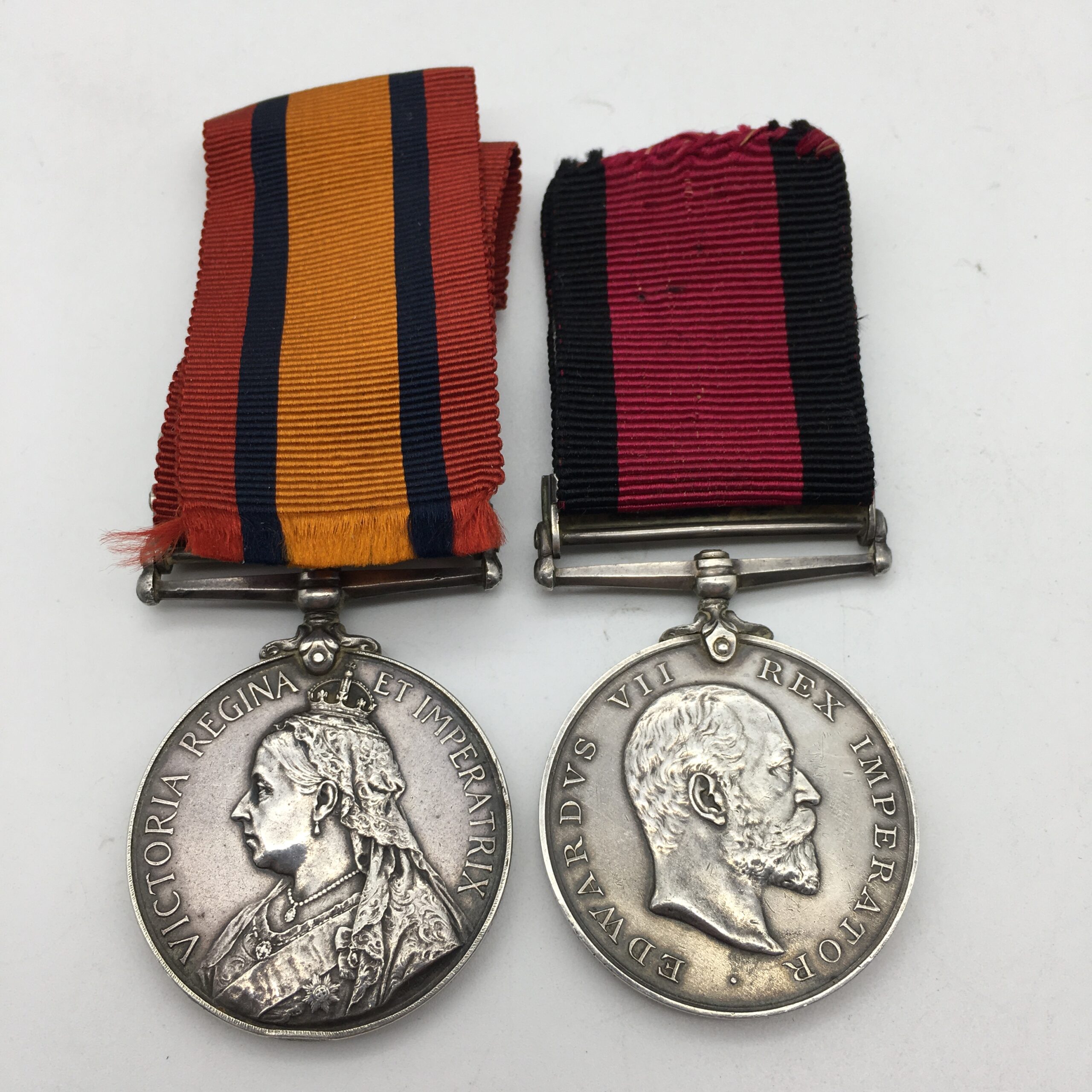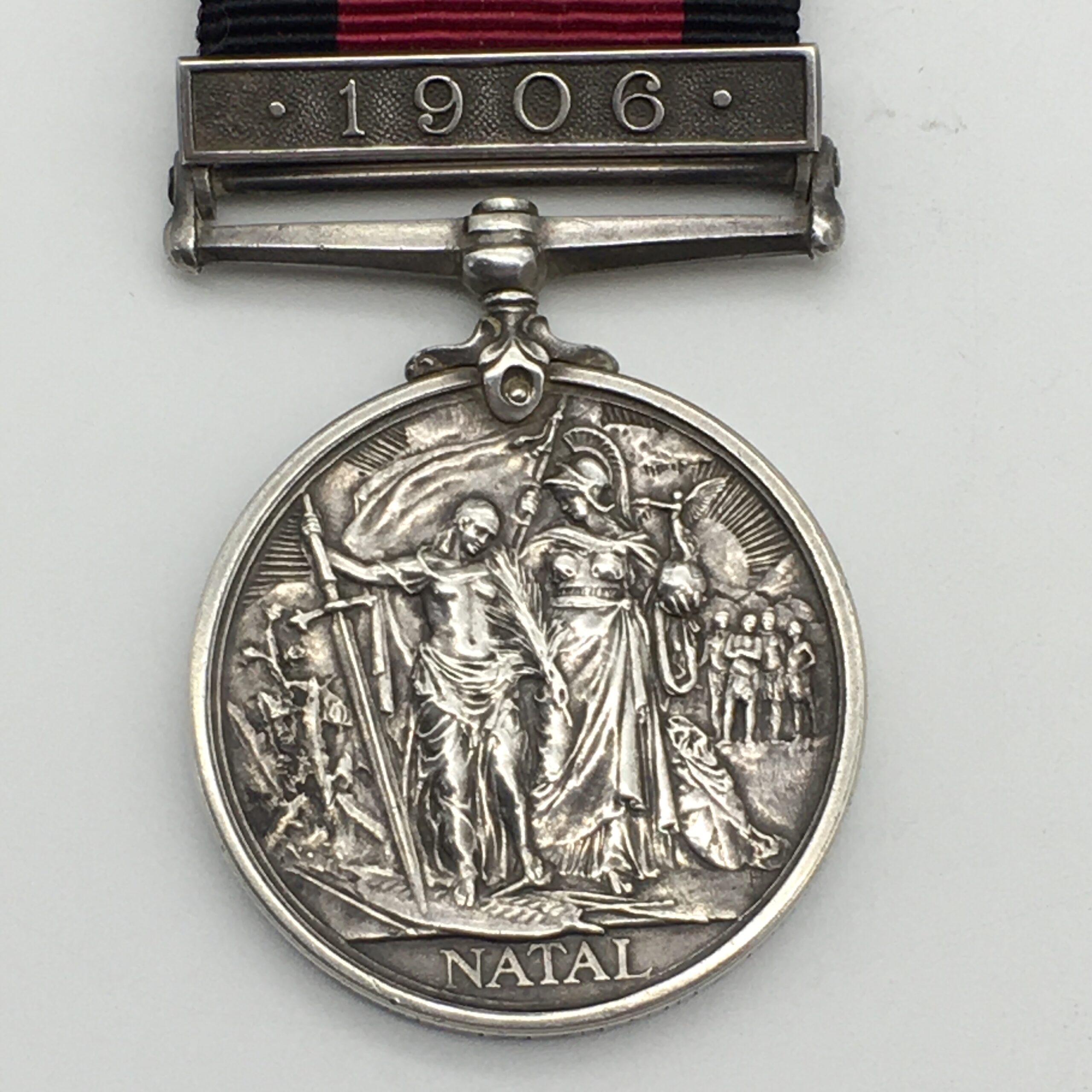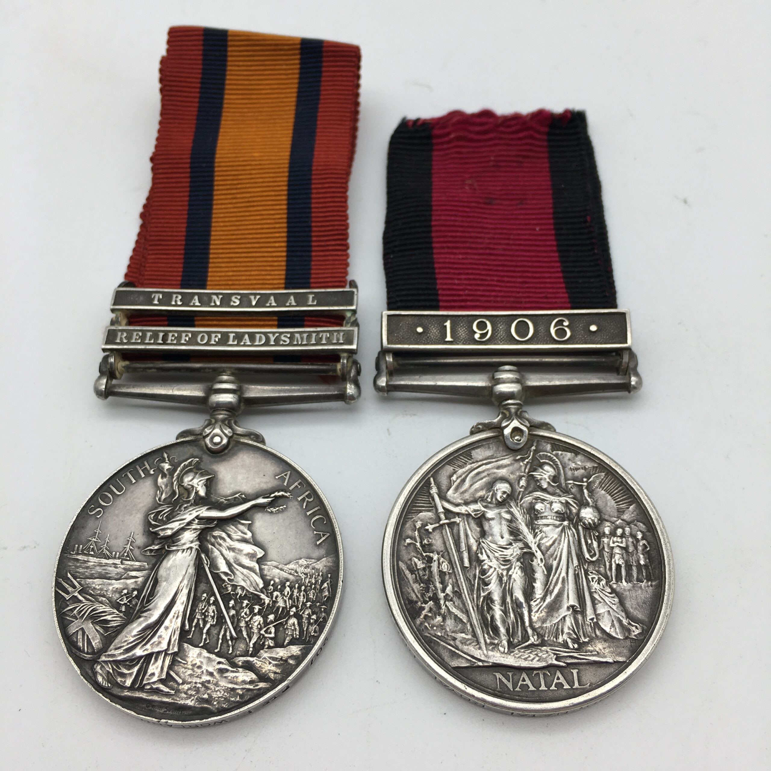 This original, scarce pair of full-size silver medals were issued to ‘F. Worland’, who first served in the Boer War as a private, in the ‘Natal Royal Rifles’ (a small unit of 150 men), where he earned the two bars, the ‘Relief of Ladysmith’ and ‘Transvaal’. He then took part in the ‘Natal Bambatha Rebellion’ in 1906, serving with the ‘Natal Royal Regiment’ (a small unit of 258 men), as a Drummer, earning the ‘1906 clasp’. Both medals have been confirmed on the medal rolls but have otherwise been un-researched. They are nicely tarnished, with their original ribbons, and in excellent condition (1906 ribbon is shorter).