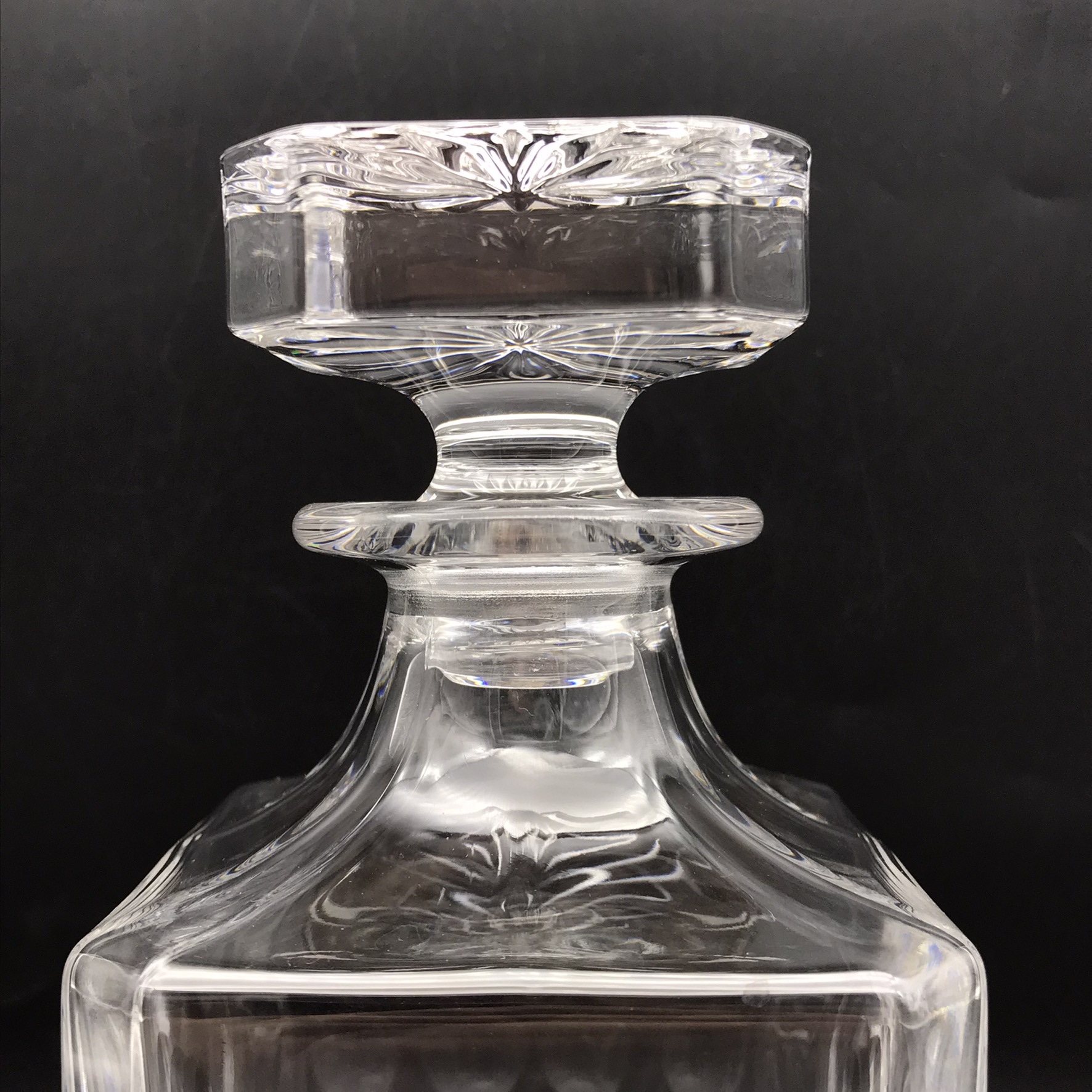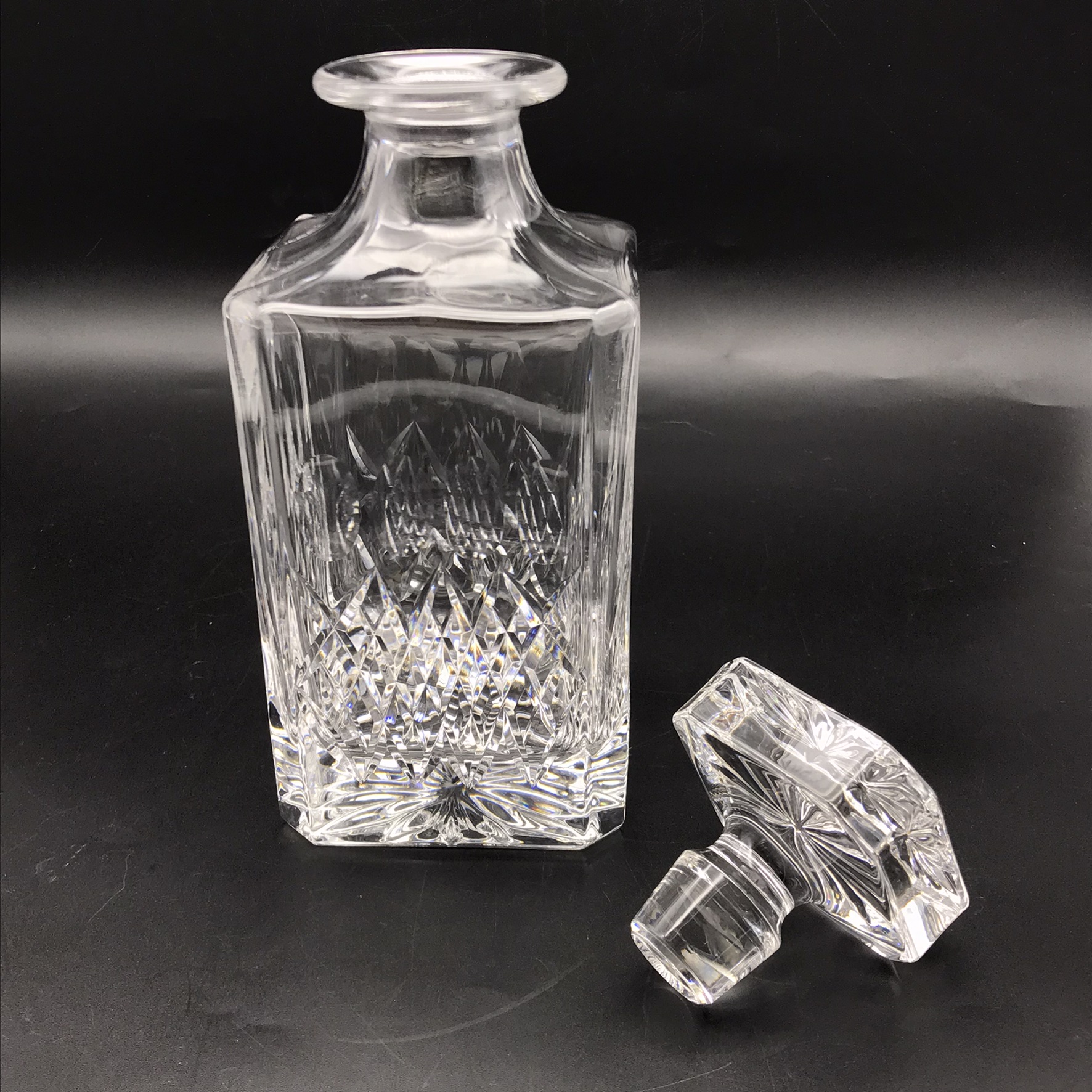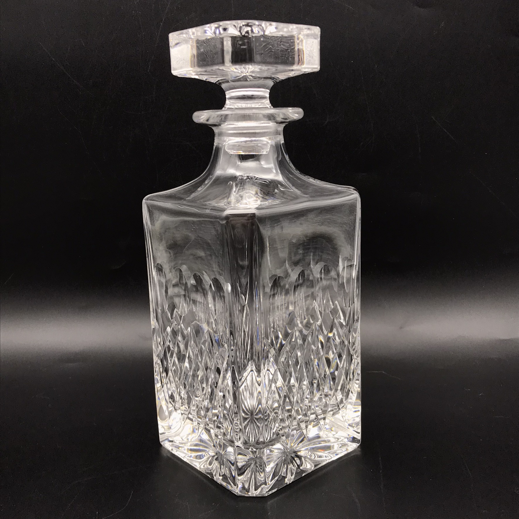 This vintage, super quality ‘Somerset’ Crystal decanter is in excellent condition and comes with its original, very well made, solid wood, velvet lined presentation case. The crystal decanter has a lovely weight and is beautifully hand-cut in a simple but attractive pattern, with a star-cut base, and stands 22cm high (18,3cm without stopper), has a base measurement of 9cm x 9cm and weighs 1,5kg. The case measures 27cm x 13,8cm x 11,2cm and together with the decanter weighs 2kg.
