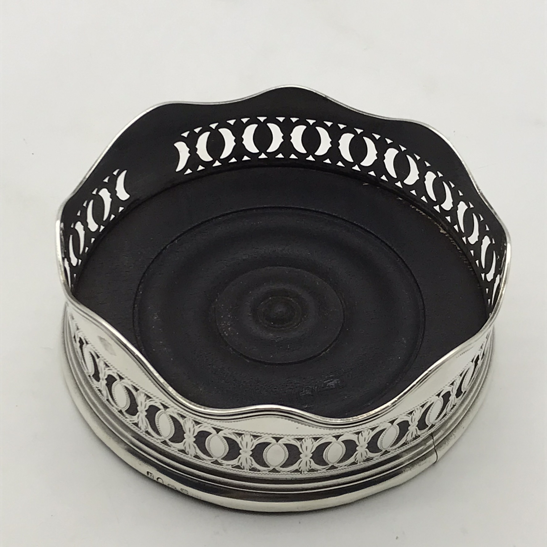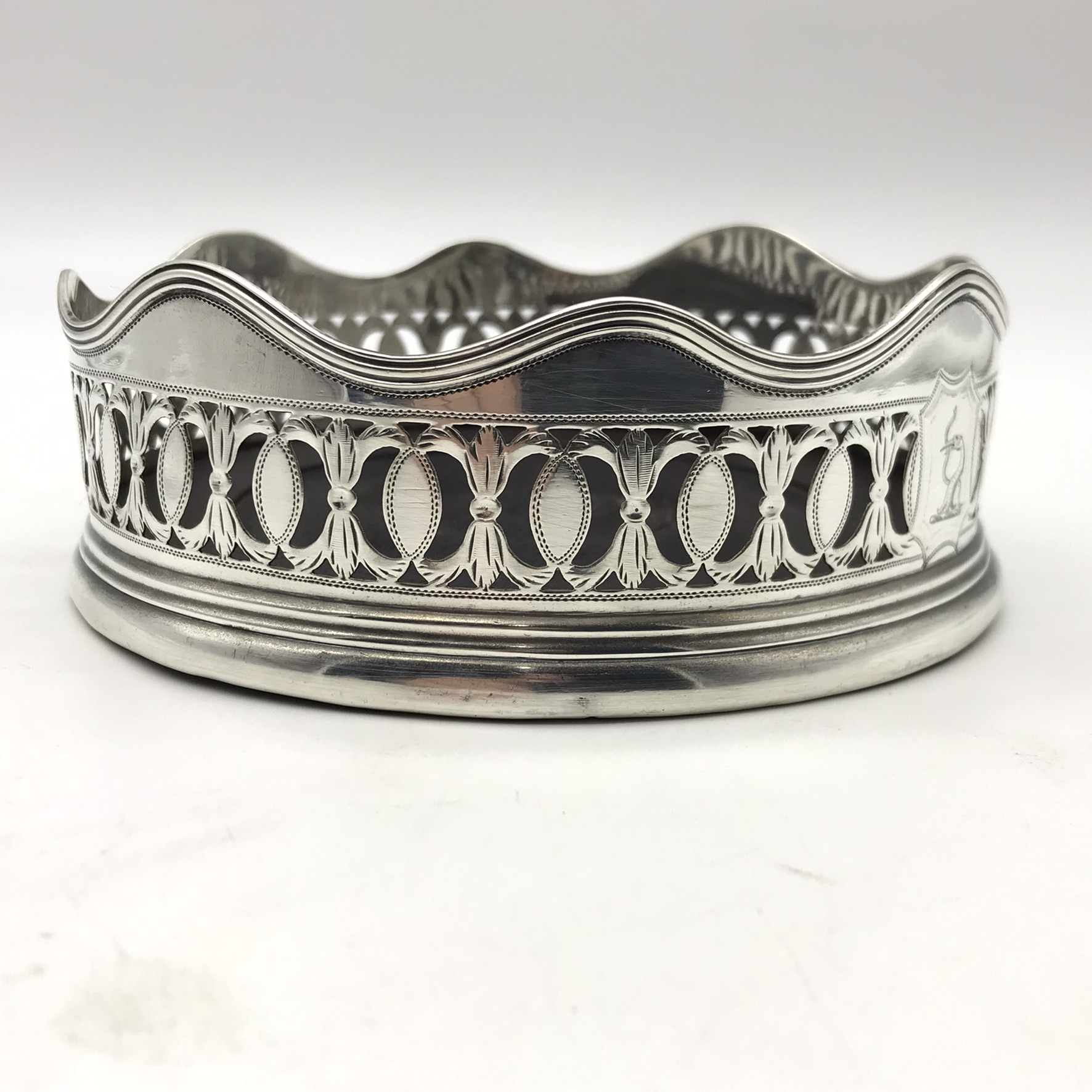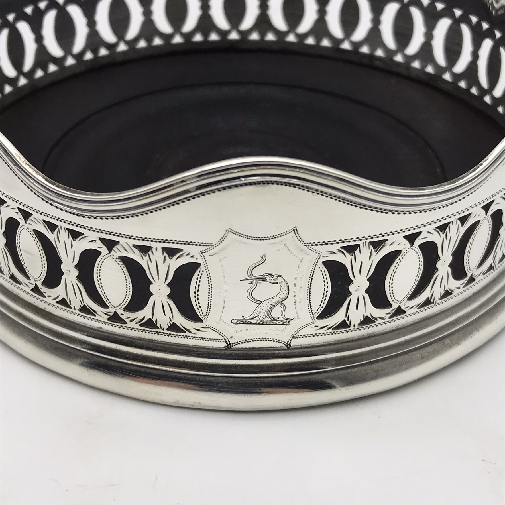 This rare, fine, late 1700’s ‘George III’ solid silver wine coaster has a beautifully hand pierced and engraved gallery in a lovely neoclassical design with a scalloped rim and a turned hardwood base. It has nice clear English hallmarks, indicating it was made in Birmingham in 1792 by ‘Henry Chawner’ (HC), and the armorial engraved in the cartouche is of a ‘heron with a snake in its beak’ (supposedly the ‘Kinder’ family crest). Other than a very minor tear to the silver on the base of the seam, and a chip to the underside of the wooden base, it’s in excellent condition. The coaster measures 12,5cm in diameter with a height of 4,3cm and weighs 180g.