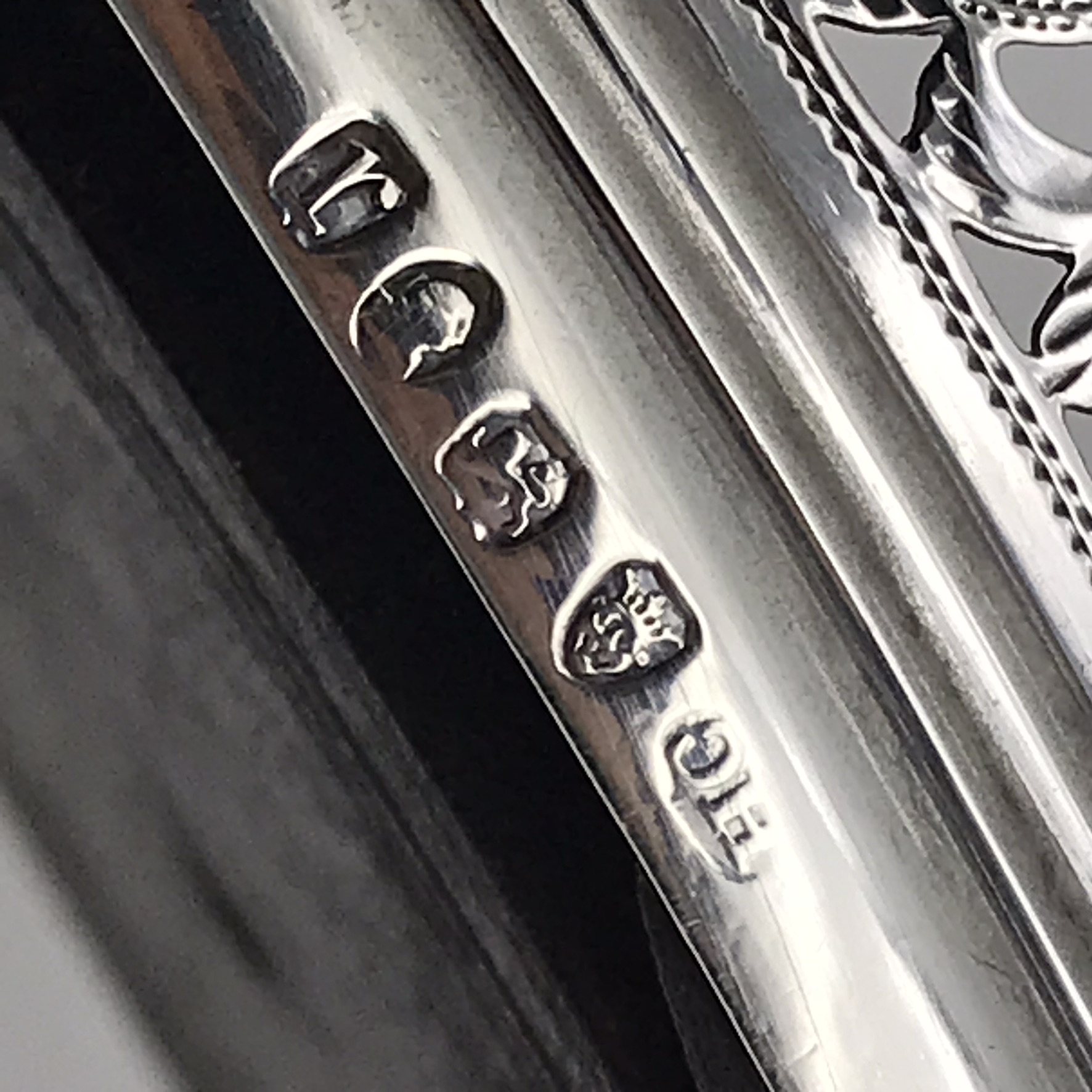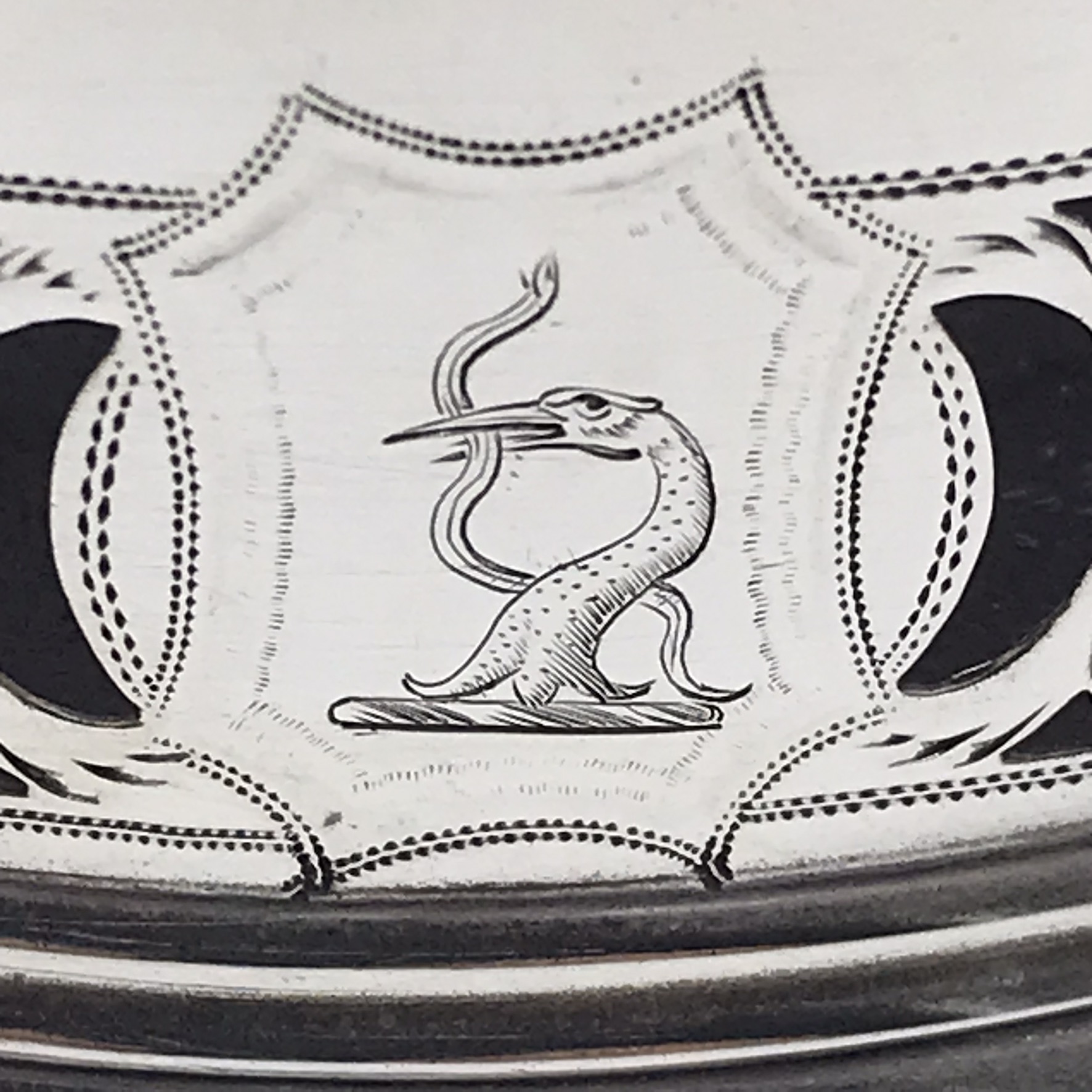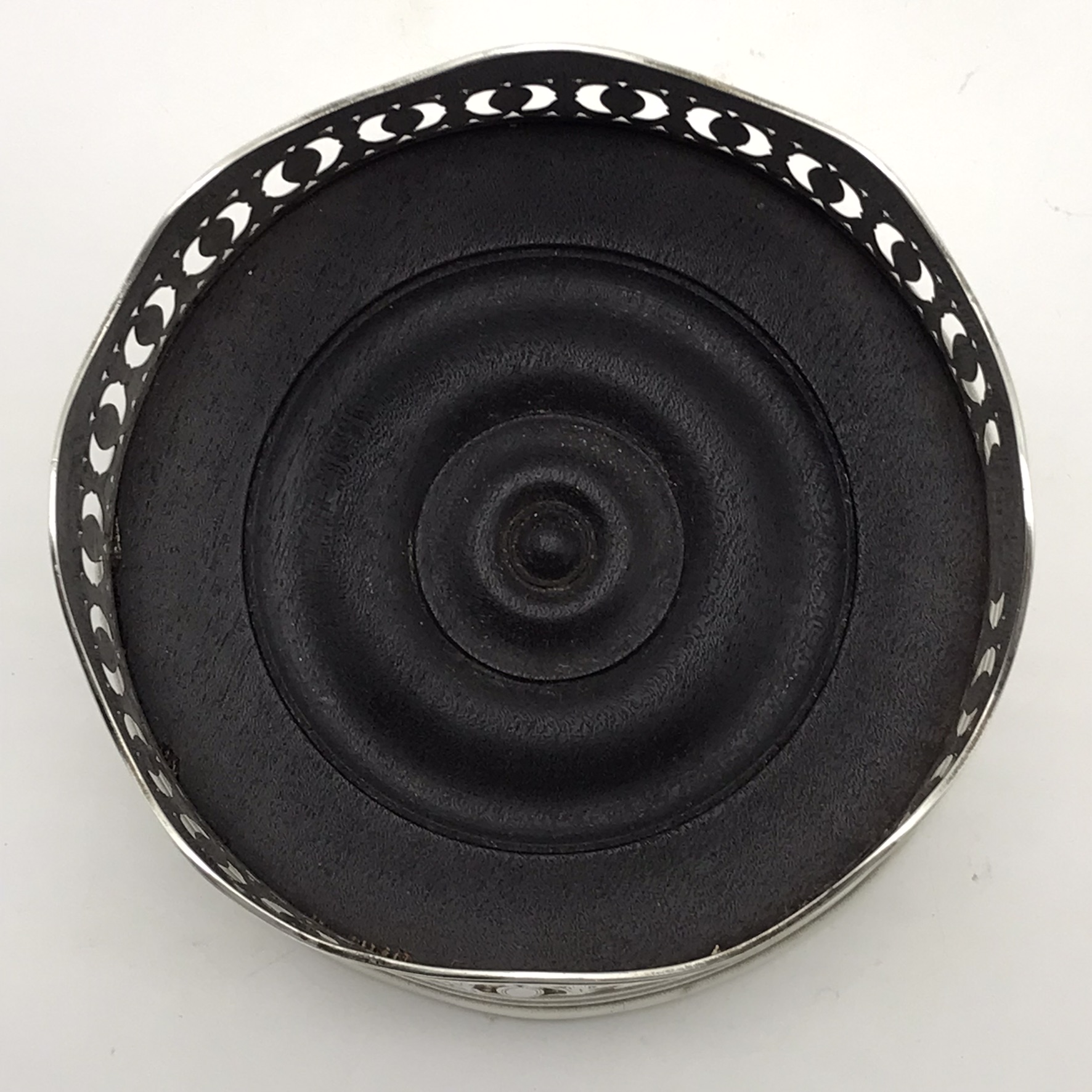 This rare, fine, late 1700’s ‘George III’ solid silver wine coaster has a beautifully hand pierced and engraved gallery in a lovely neoclassical design with a scalloped rim and a turned hardwood base. It has nice clear English hallmarks, indicating it was made in Birmingham in 1792 by ‘Henry Chawner’ (HC), and the armorial engraved in the cartouche is of a ‘heron with a snake in its beak’ (supposedly the ‘Kinder’ family crest). Other than a very minor tear to the silver on the base of the seam, and a chip to the underside of the wooden base, it’s in excellent condition. The coaster measures 12,5cm in diameter with a height of 4,3cm and weighs 180g.