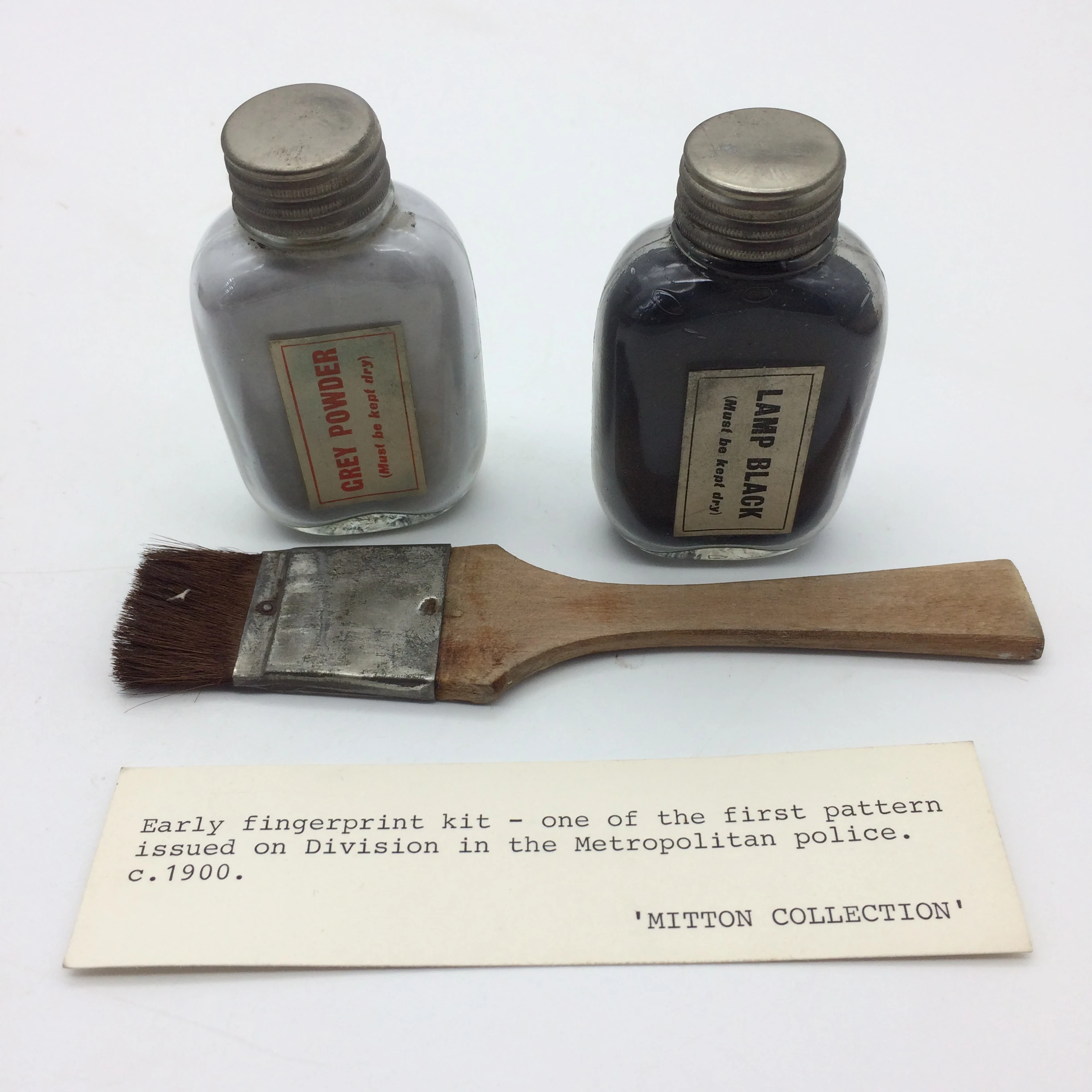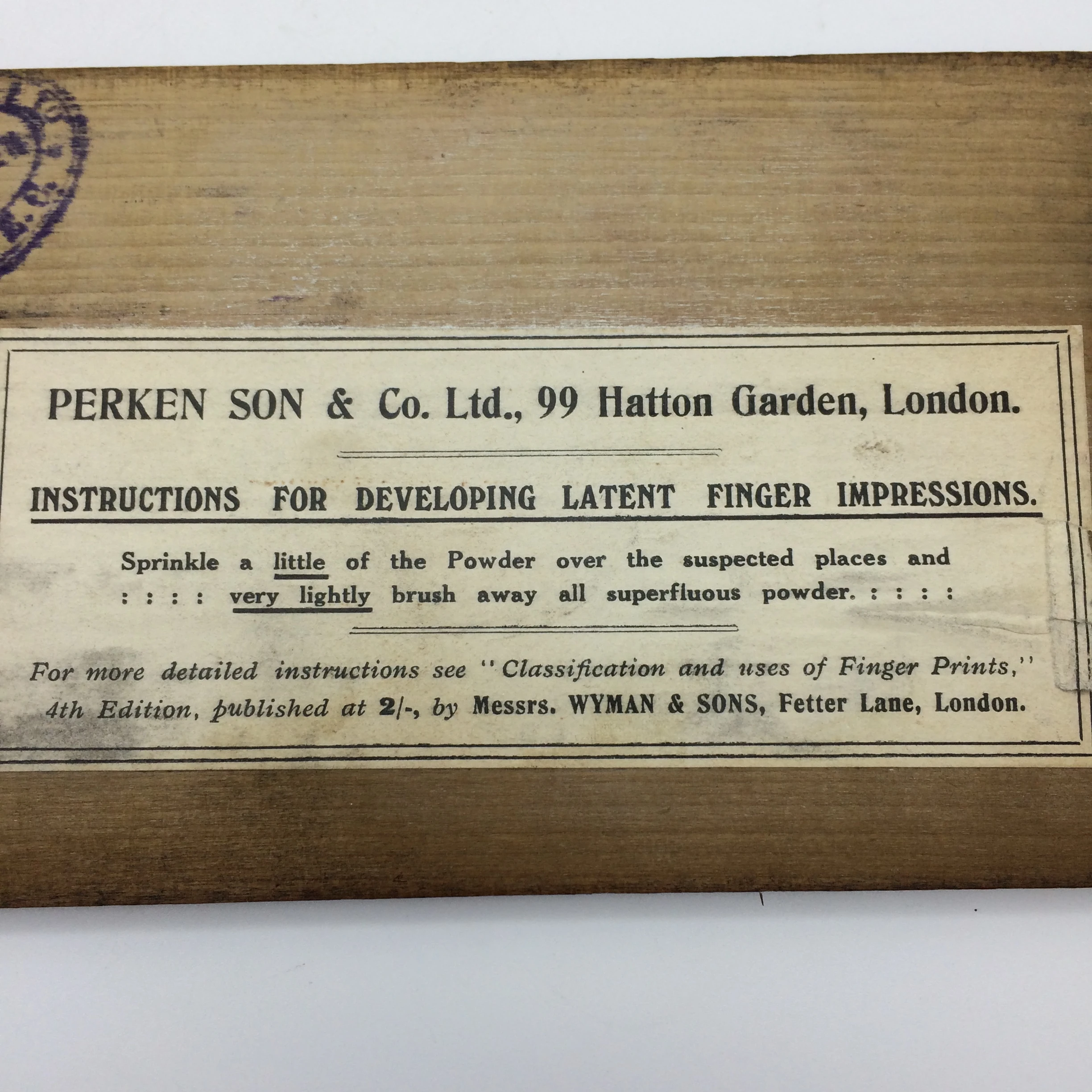This amazing, early 1900’s police fingerprint lifting kit, appears not to have been used and is in excellent condition. The boxed kit was previously owned by the late ‘Mervyn Mitton’, author of the book ‘The Policeman’s Lot’ (a book on antique British police equipment). The wooden box is well made with a slide out lid, revealing two bottles of powder, a small brush with very fine bristles (hair), and a later typed note with a brief description ‘Early Fingerprint Kit – one of the first pattern issued on Division in the Metropolitan Police. MITTON COLLECTION’. The inside of the lid has an old label stating who made it and instructions on how to use it. The kit was made by ‘PERKIN SON & Co. Ltd. LONDON’. I think this must be a rare item, as I’ve never come across one, let alone in this condition. The box measures 18cm x 10,5cm x 3,5cm and weighs 335g.