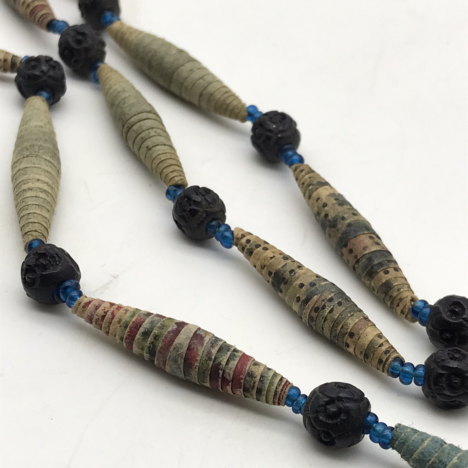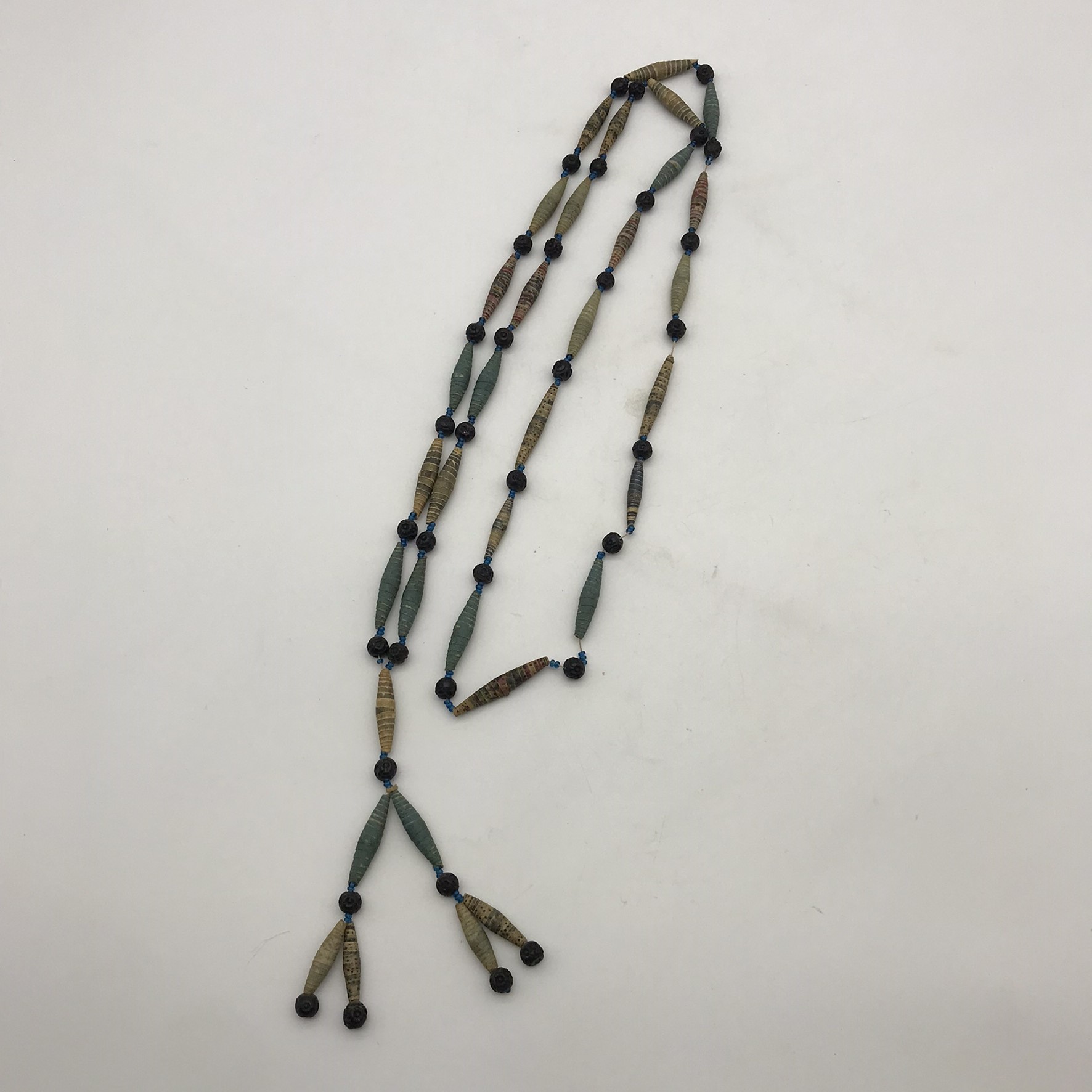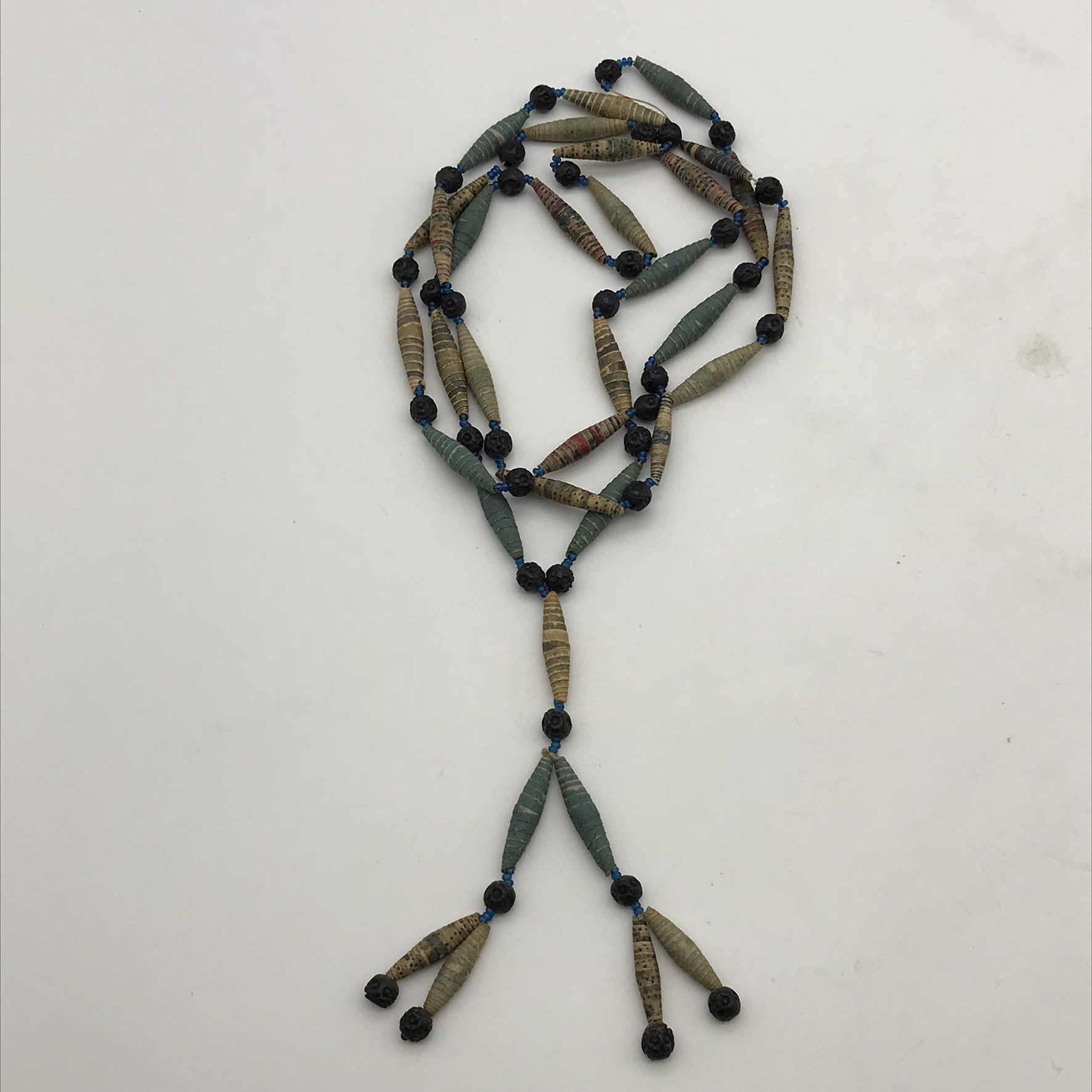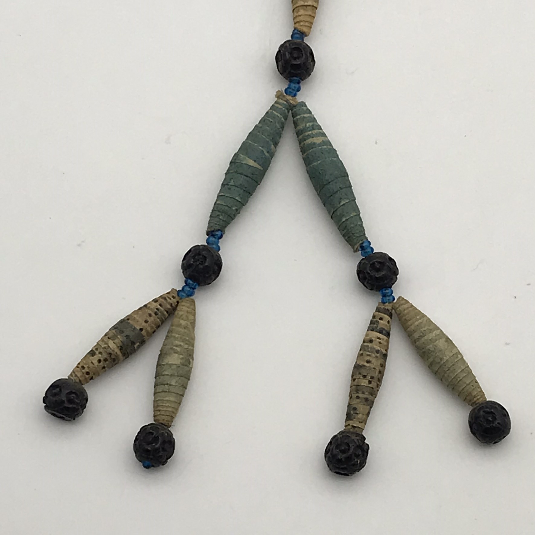This amazing, super rare, antique ‘Prisoner of War’ sweetheart necklace from the Boer War is in exceptional condition, considering that it’s over a hundred and twenty years old. It’s a long necklace with a double tassel-like pendant, which consists of thirty-four, finely rolled-up, long paper beads, with hand-carved small round black beads in-between, with tiny blue beads on either side. I acquired this amazing piece, roughly forty years ago, directly from a descendant who had looked after it. The necklace part measures 110cm in length, with the tassel part measuring 11cm.