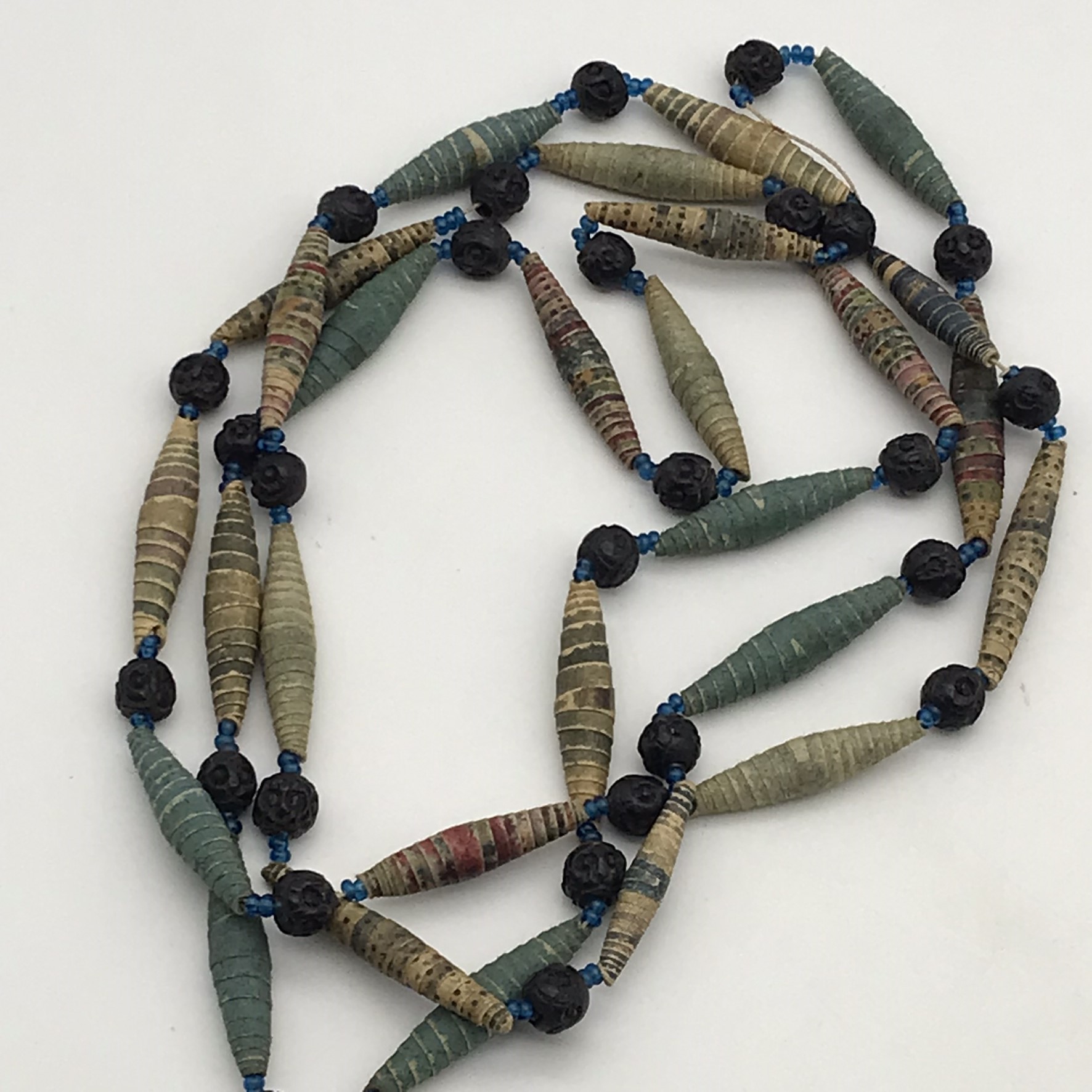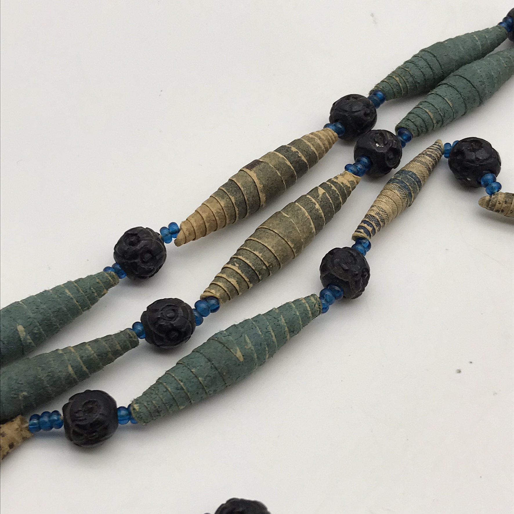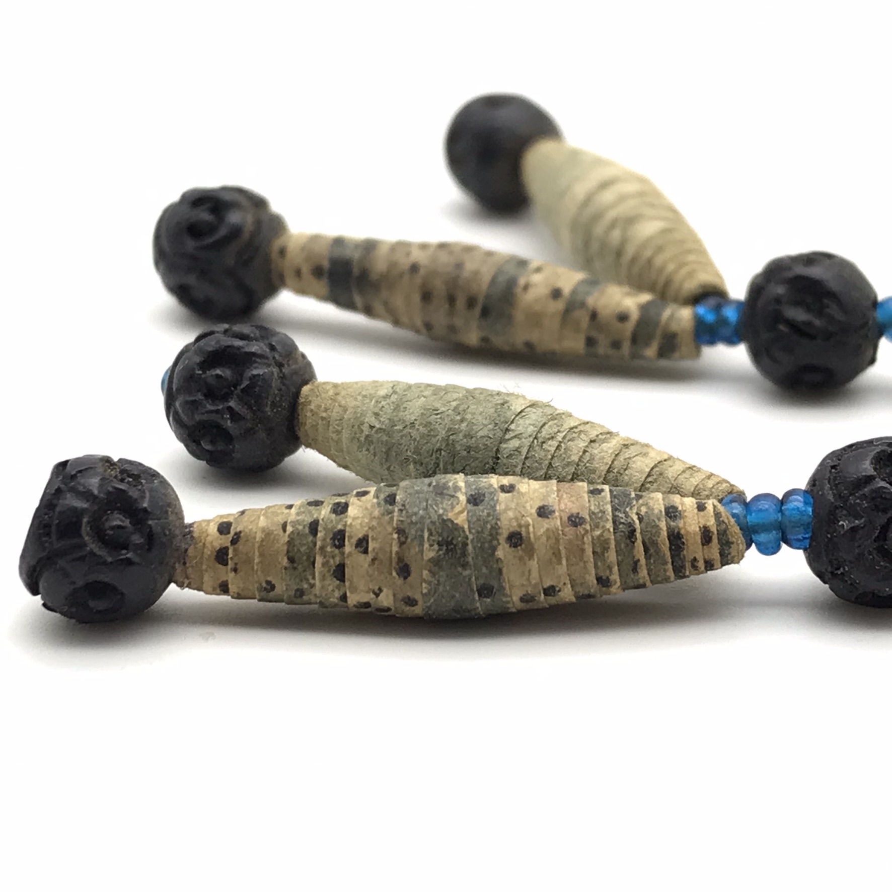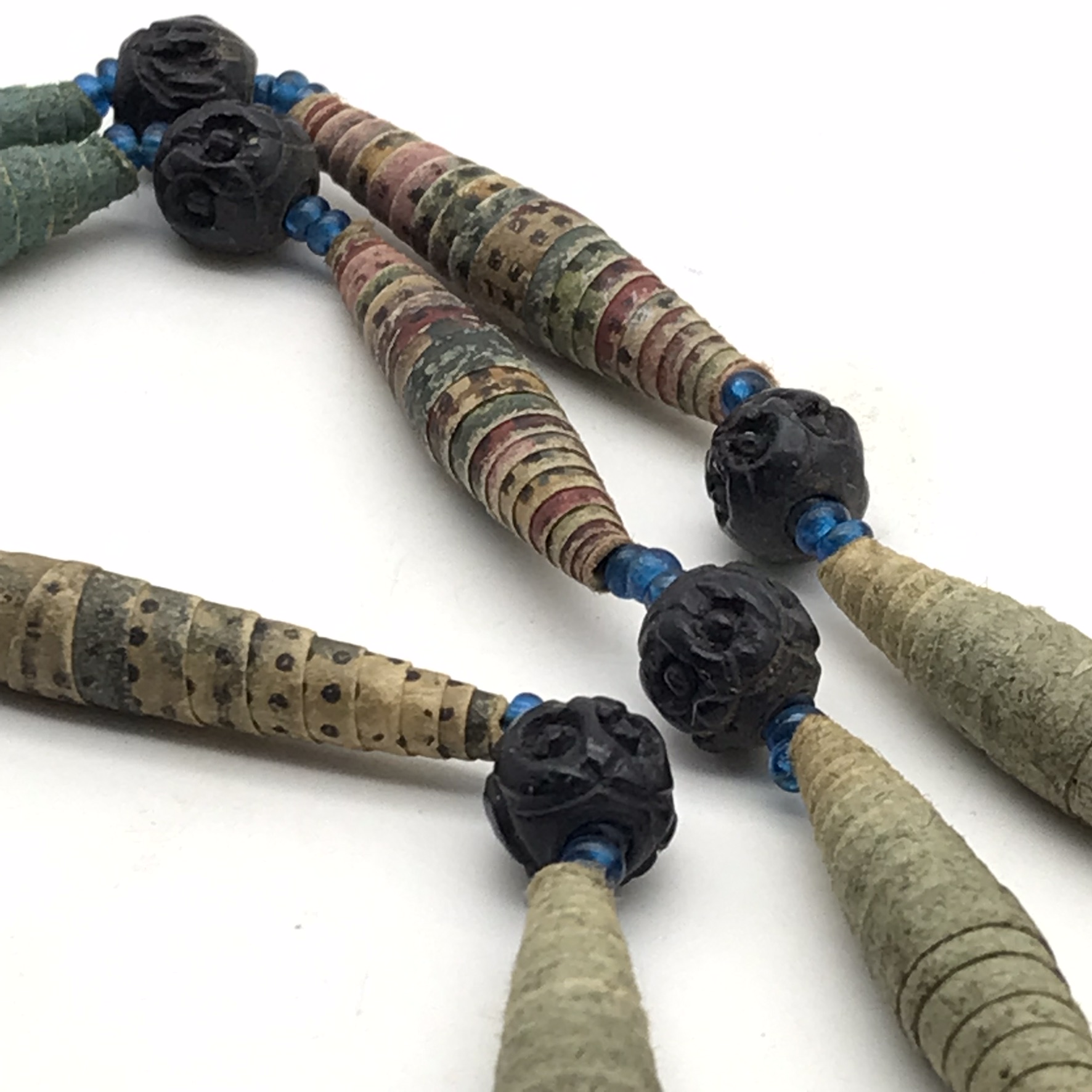 This amazing, super rare, antique ‘Prisoner of War’ sweetheart necklace from the Boer War is in exceptional condition, considering that it’s over a hundred and twenty years old. It’s a long necklace with a double tassel-like pendant, which consists of thirty-four, finely rolled-up, long paper beads, with hand-carved small round black beads in-between, with tiny blue beads on either side. I acquired this amazing piece, roughly forty years ago, directly from a descendant who had looked after it. The necklace part measures 110cm in length, with the tassel part measuring 11cm.