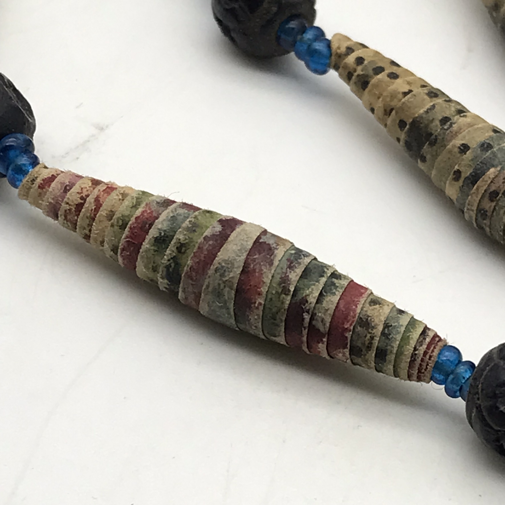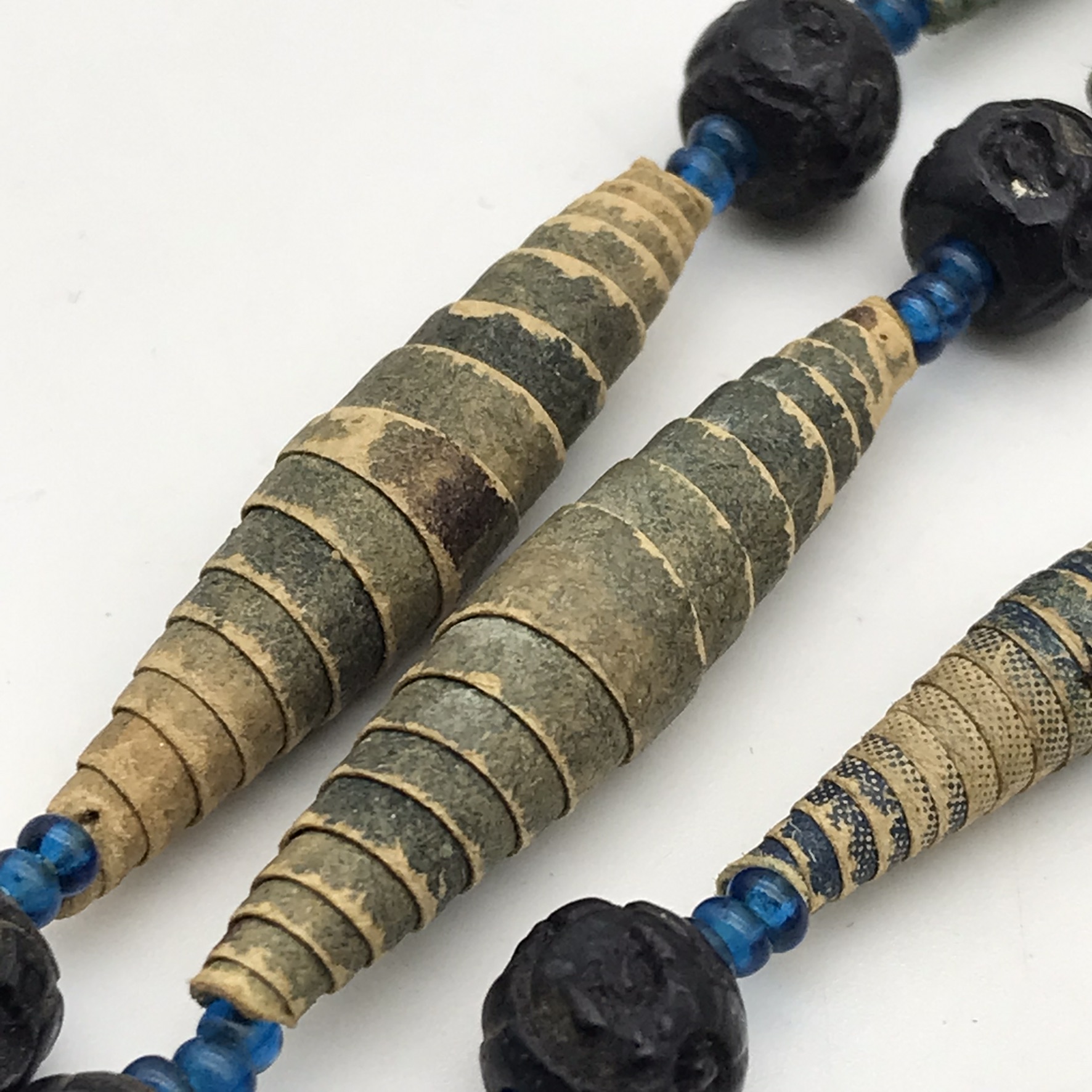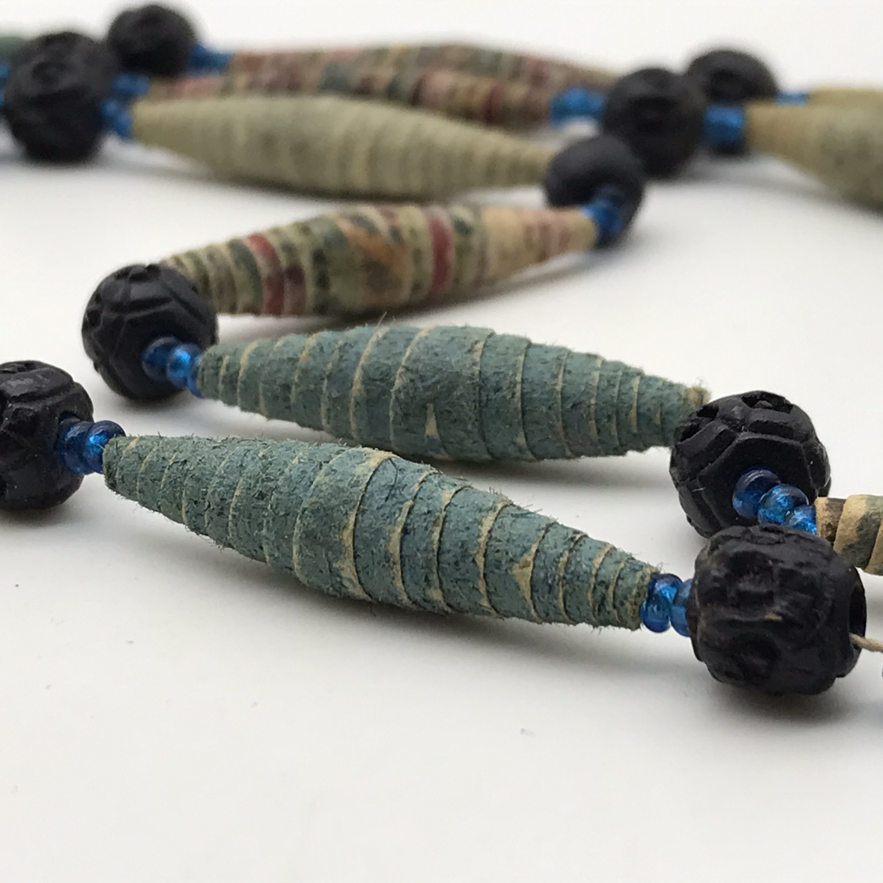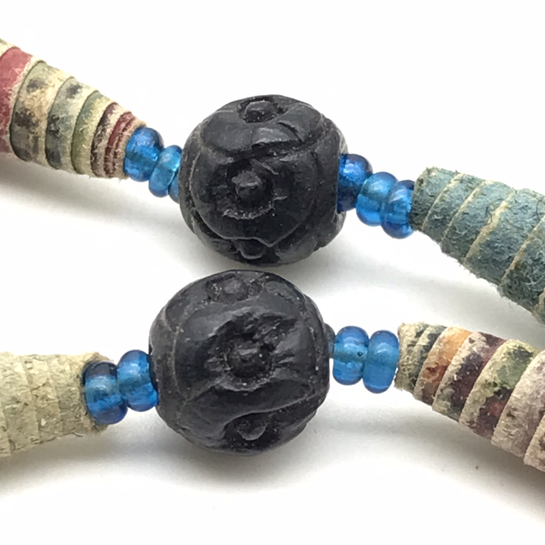 This amazing, super rare, antique ‘Prisoner of War’ sweetheart necklace from the Boer War is in exceptional condition, considering that it’s over a hundred and twenty years old. It’s a long necklace with a double tassel-like pendant, which consists of thirty-four, finely rolled-up, long paper beads, with hand-carved small round black beads in-between, with tiny blue beads on either side. I acquired this amazing piece, roughly forty years ago, directly from a descendant who had looked after it. The necklace part measures 110cm in length, with the tassel part measuring 11cm.