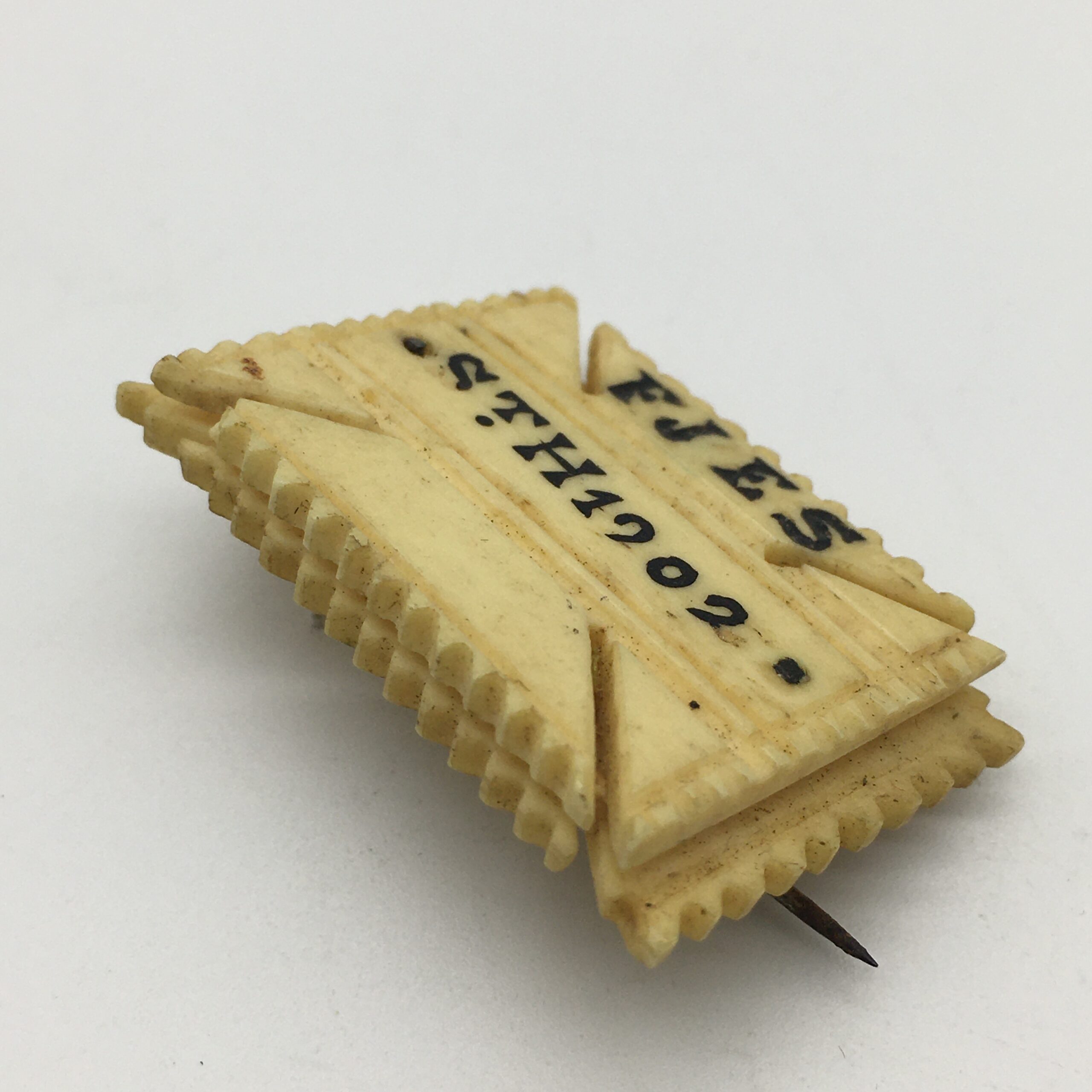 This rare Prisoner of War sweetheart brooch has been beautifully hand carved out of bone and is inscribed on the front ‘FJES’ and ‘ST. H 1902’. Other than a tiny nick to the corner, it’s in great condition, and measures 3,6cm x 2,5cm.